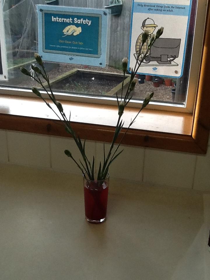 Today the children carried out an experiment using carnations, food colouring and water. They had to predict what would happen to the flowers, thinking about previous knowledge being taught when looking at plants and what they need to grow.