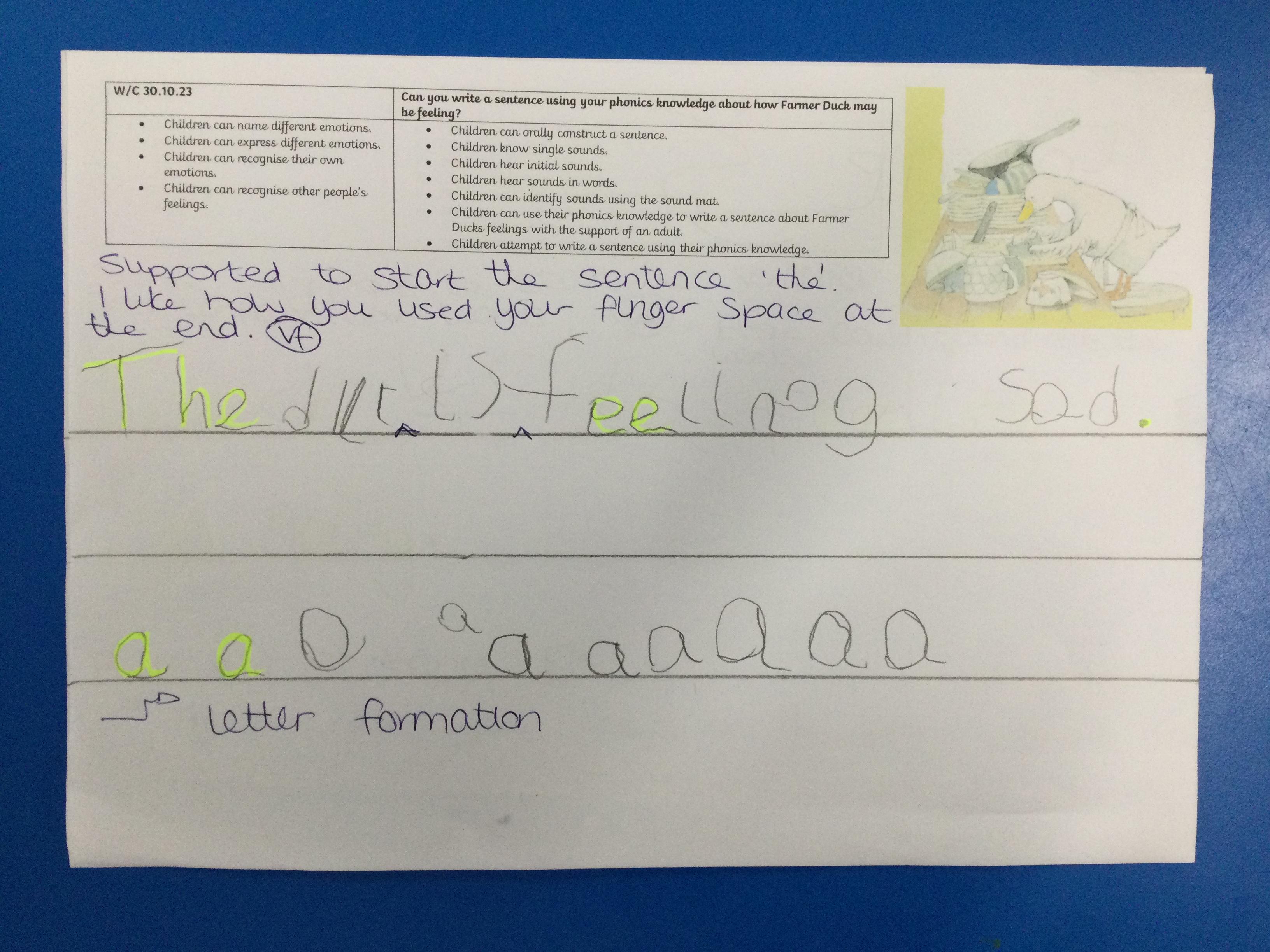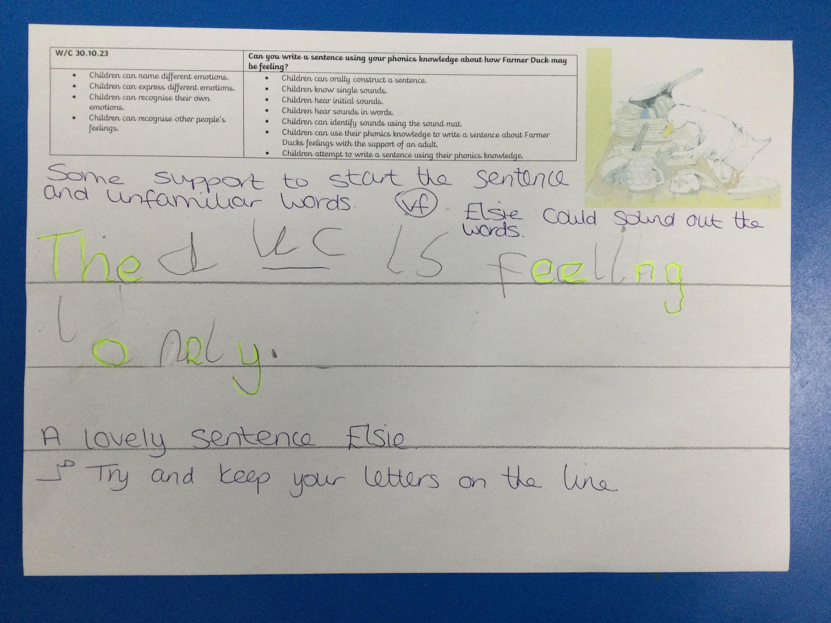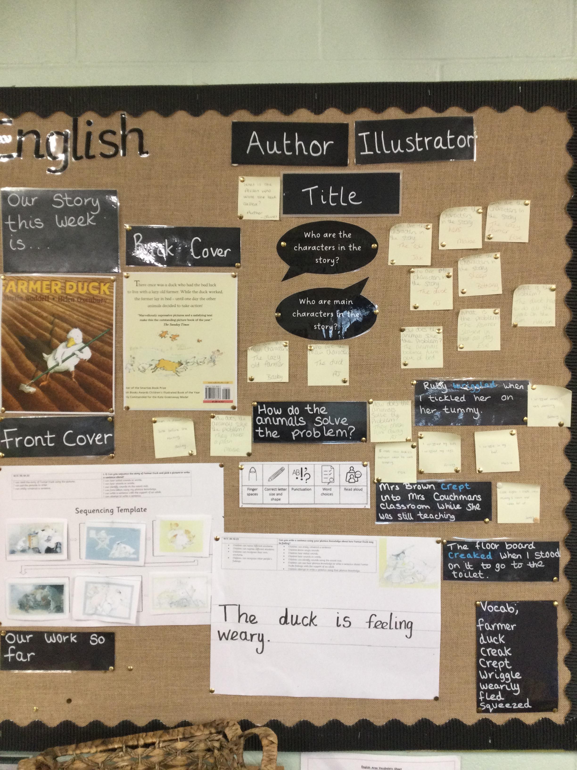 For the first 2 weeks the children are looking at the story 'Farmer Duck' by Martin Waddell. They have sequenced the story, looked at new vocabulary such as creaked, weary and crept and finally written a sentence to explain how the duck maybe feeling.