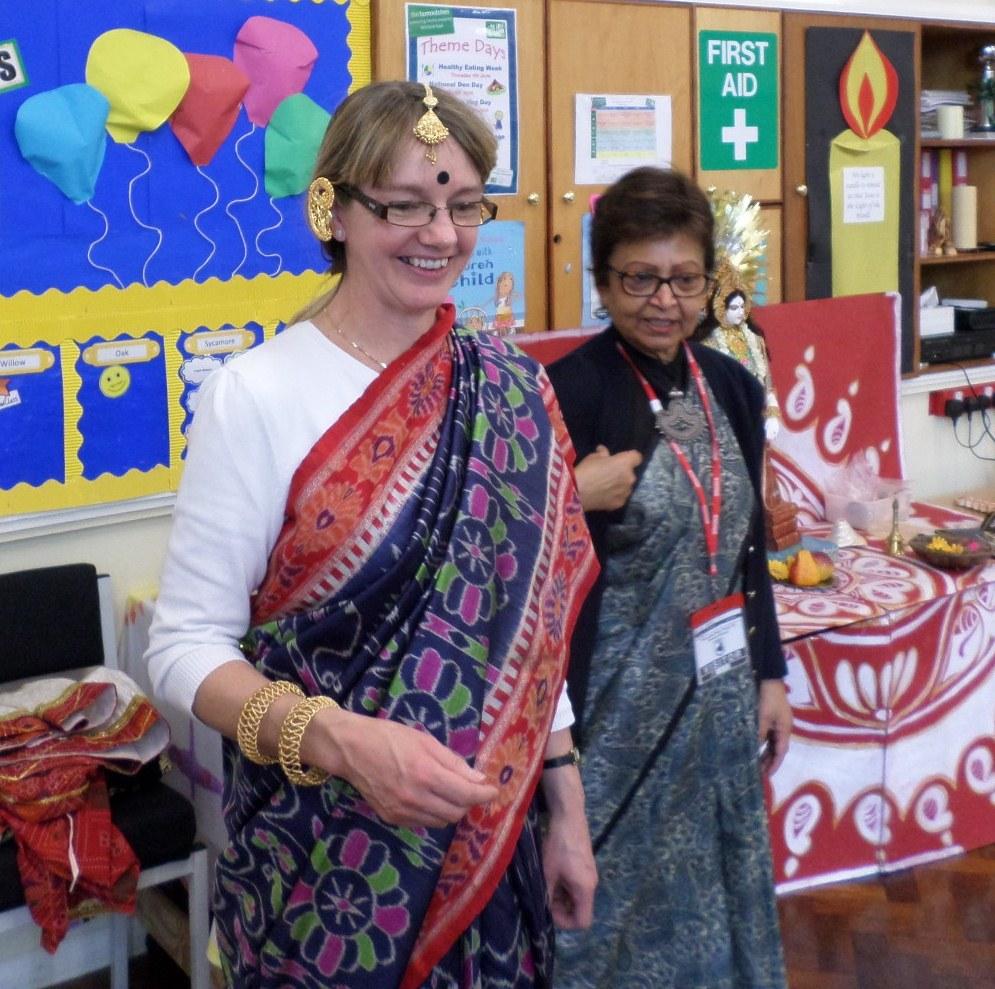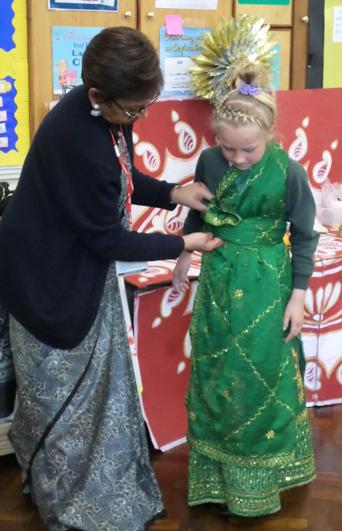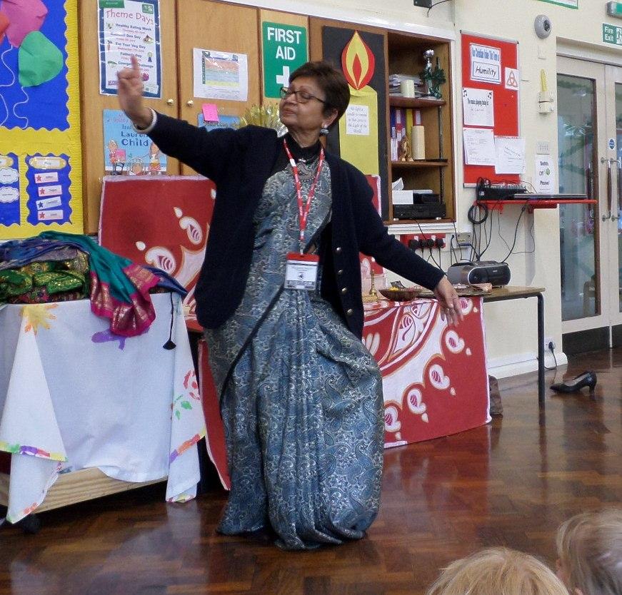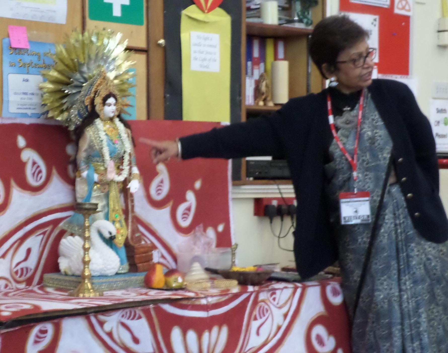 Today we had a fantastic visit by Mrs Basu who taught us all about the Hindu faith and how it compares to the Christian faith.  She explained how they pray and all the different parts of the shrine.  The shrine we saw was for the God of Education and Learning.  We also learned how to tell a story through dance.  Mrs Basu was really elegant when  she moved.  We  had a go at the different movements for different animals.  Then we tried on traditional Hindu clothes.  Mrs Addison wore a sari that was six metres long!  A big thank you to Mrs Basu for giving her time to share her faith.