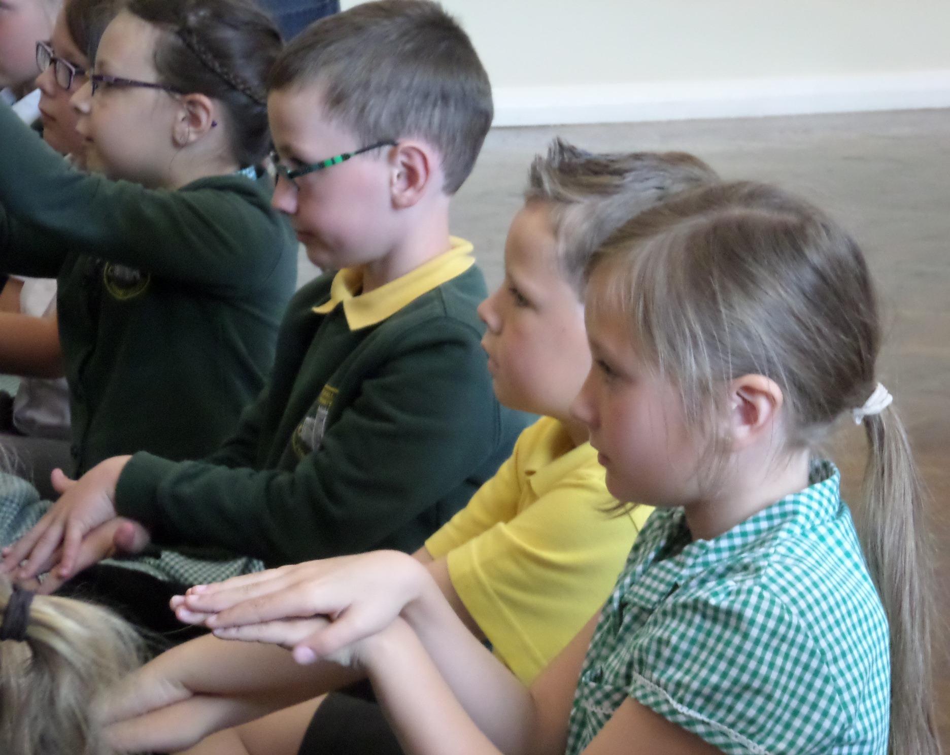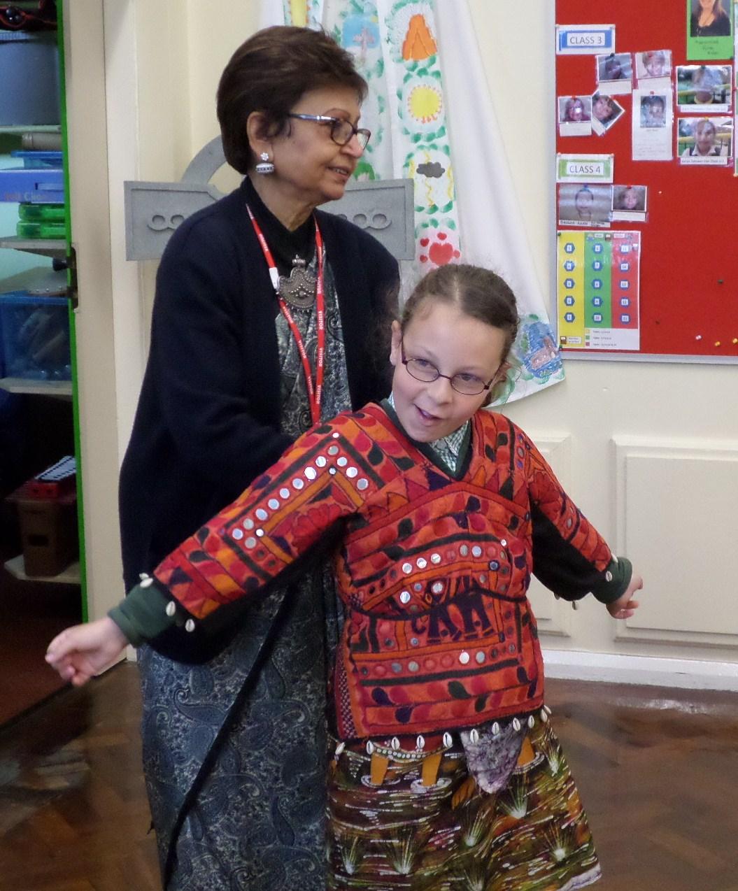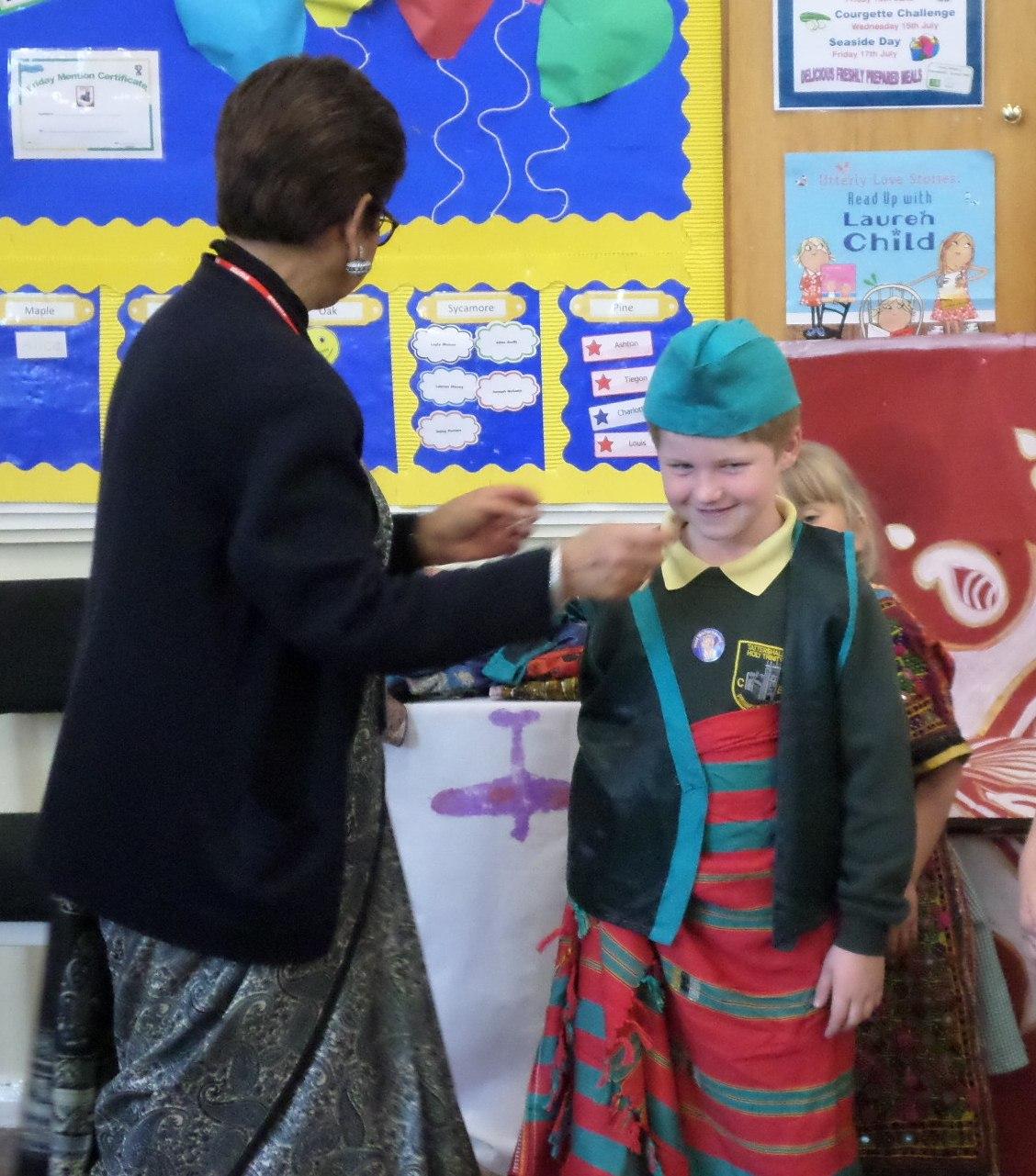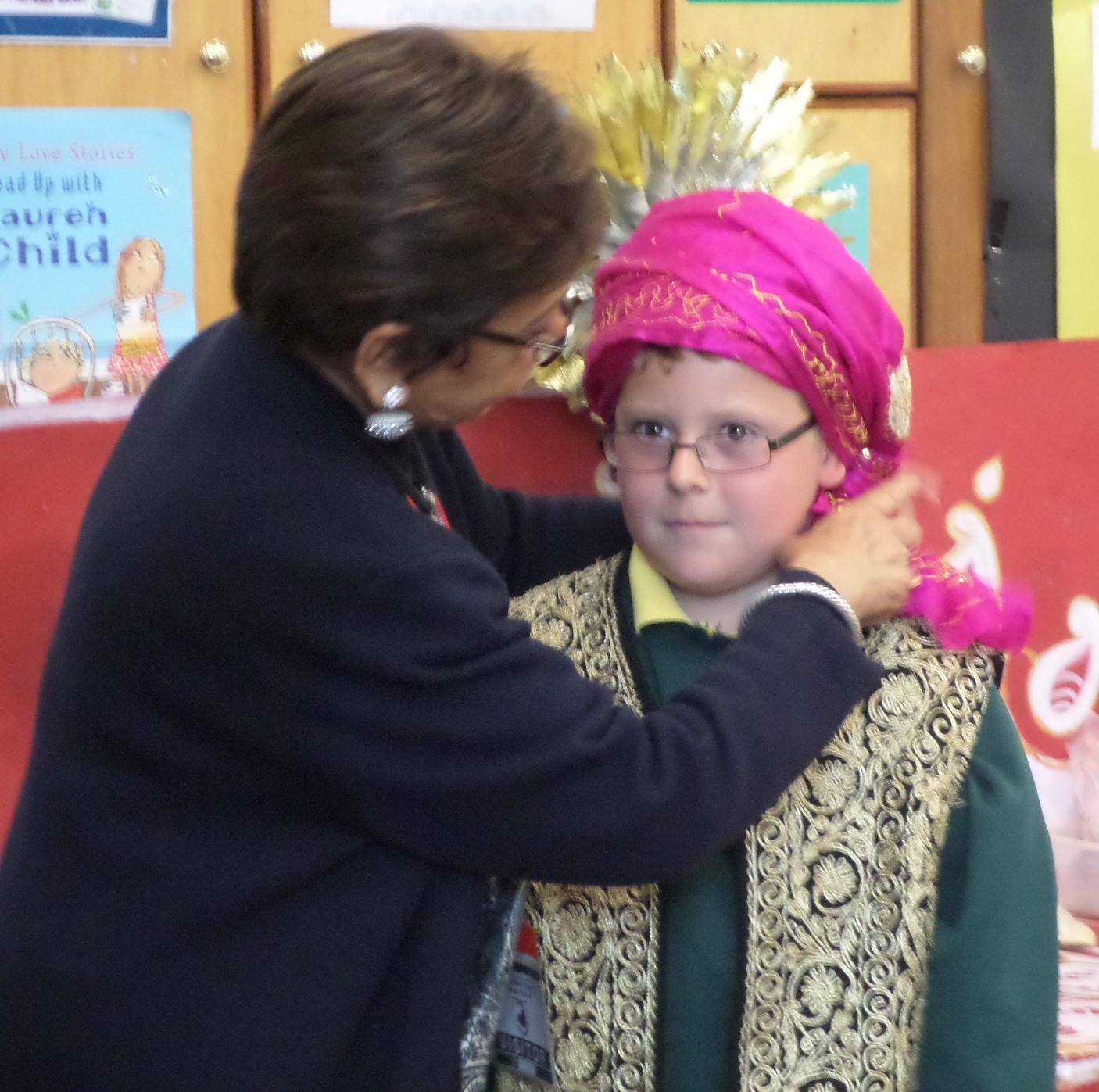 Today we had a fantastic visit by Mrs Basu who taught us all about the Hindu faith and how it compares to the Christian faith.  She explained how they pray and all the different parts of the shrine.  The shrine we saw was for the God of Education and Learning.  We also learned how to tell a story through dance.  Mrs Basu was really elegant when  she moved.  We  had a go at the different movements for different animals.  Then we tried on traditional Hindu clothes.  Mrs Addison wore a sari that was six metres long!  A big thank you to Mrs Basu for giving her time to share her faith.