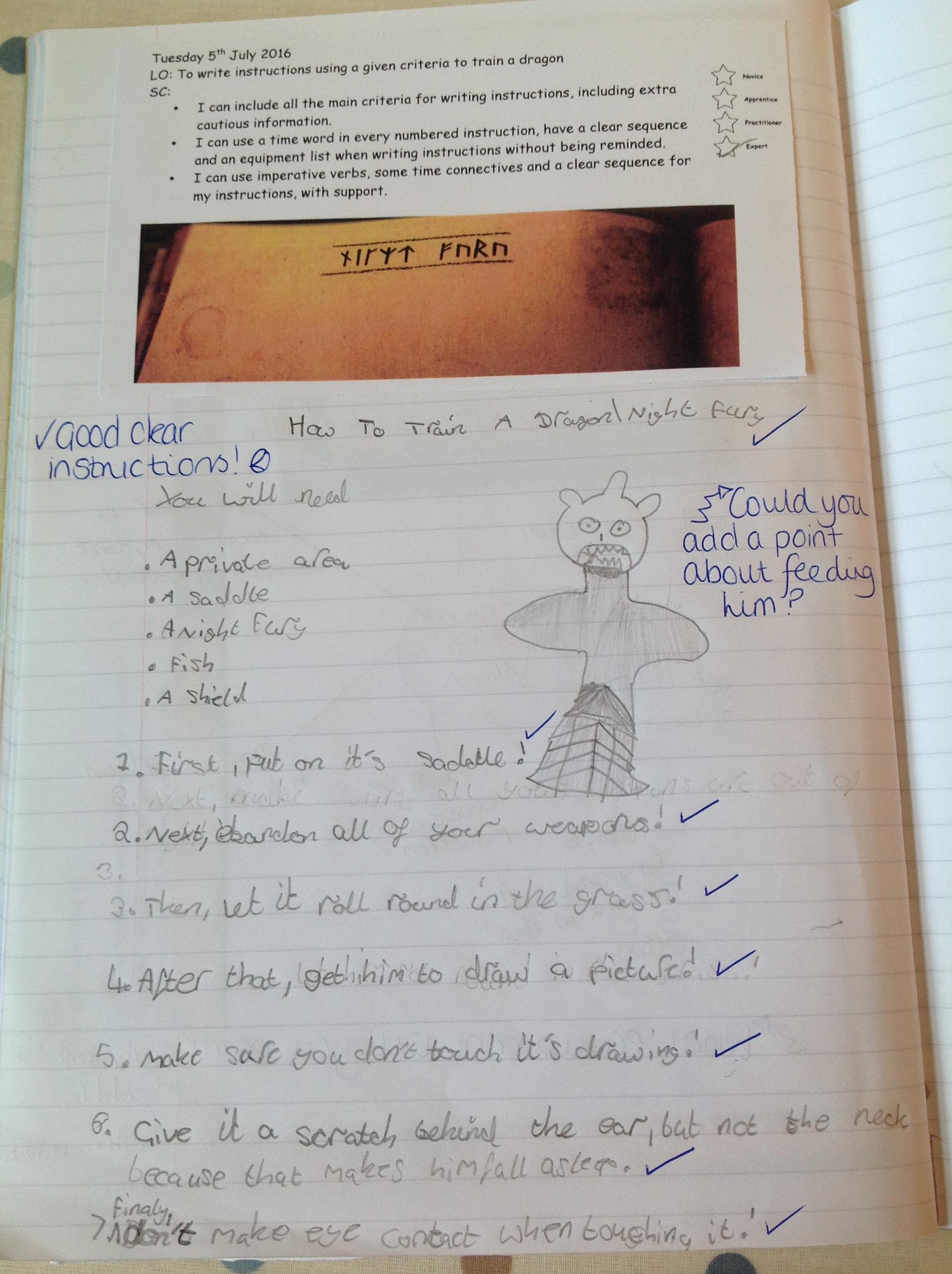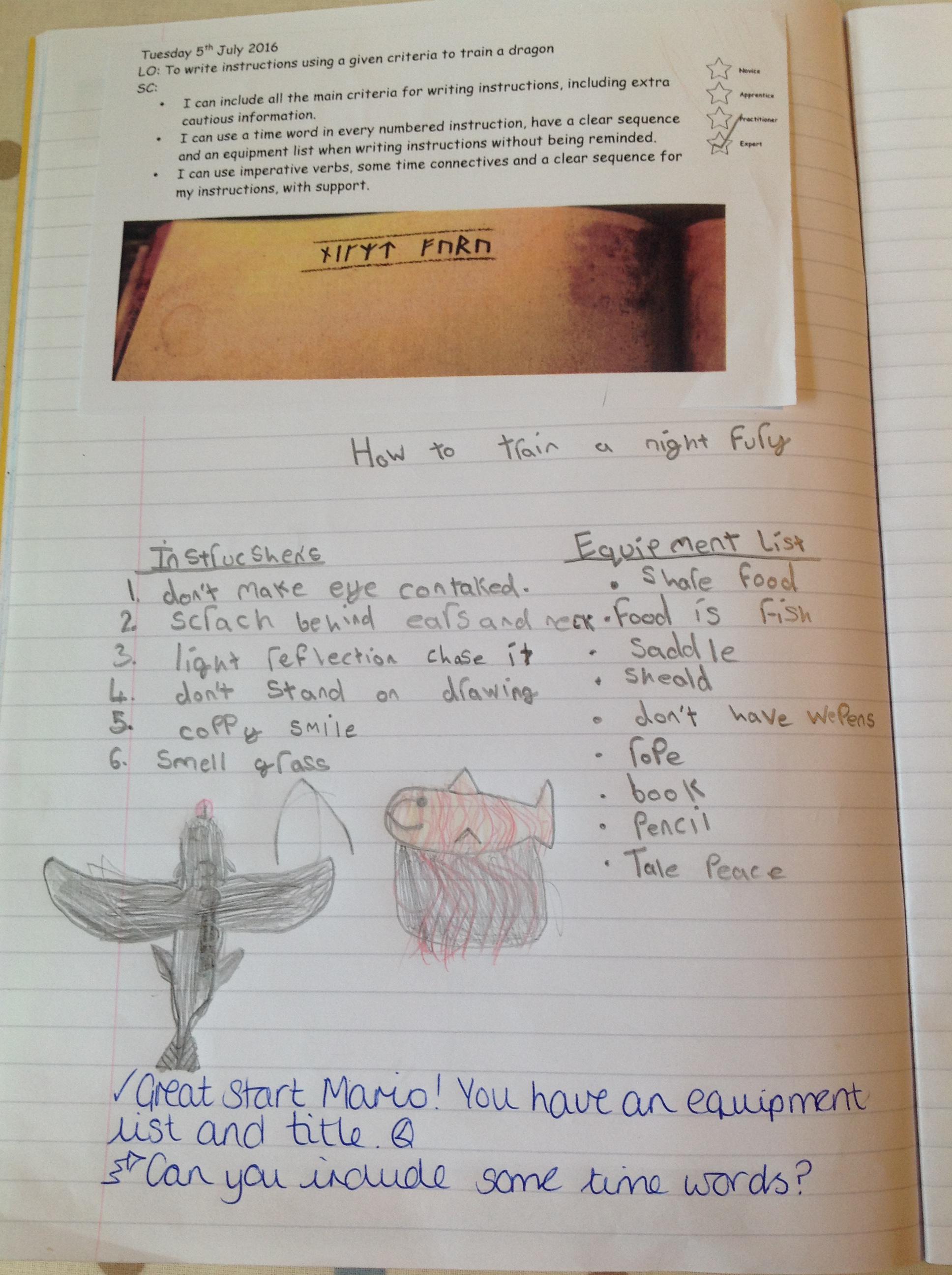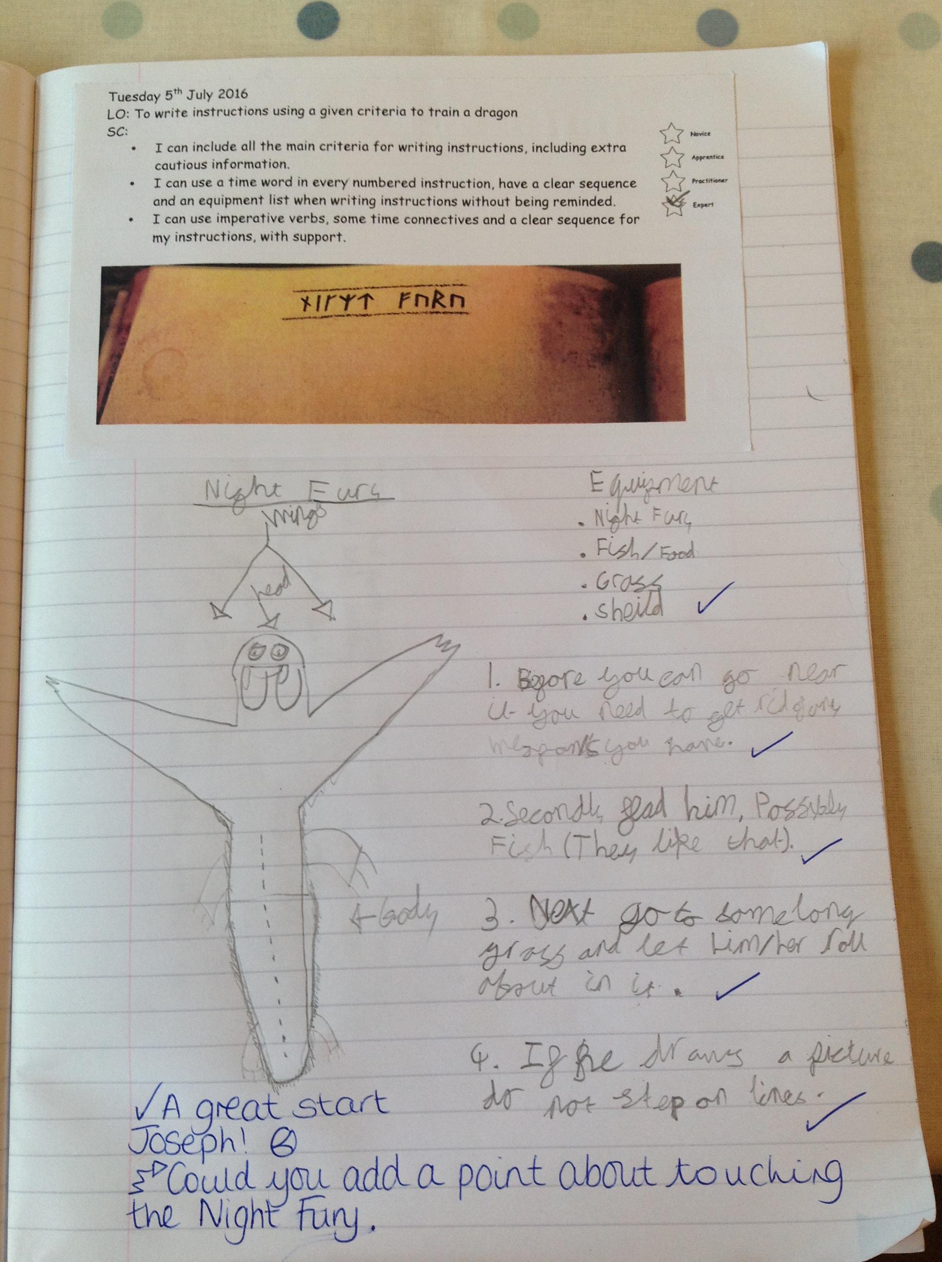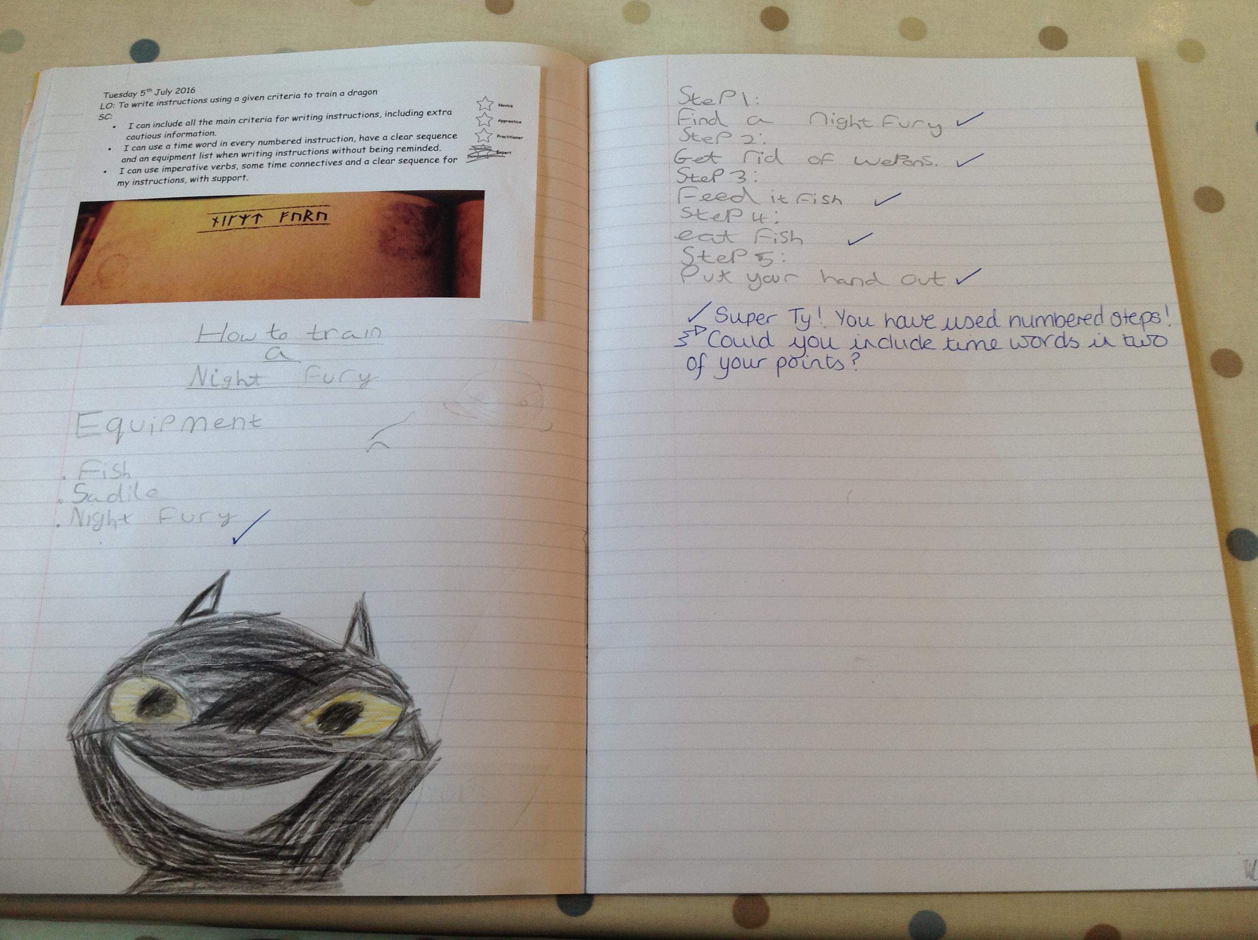 Today we wrote instructions on how to train a Night Fury! Tomorrow, we will design our own dragons and write instructions on how to train them!