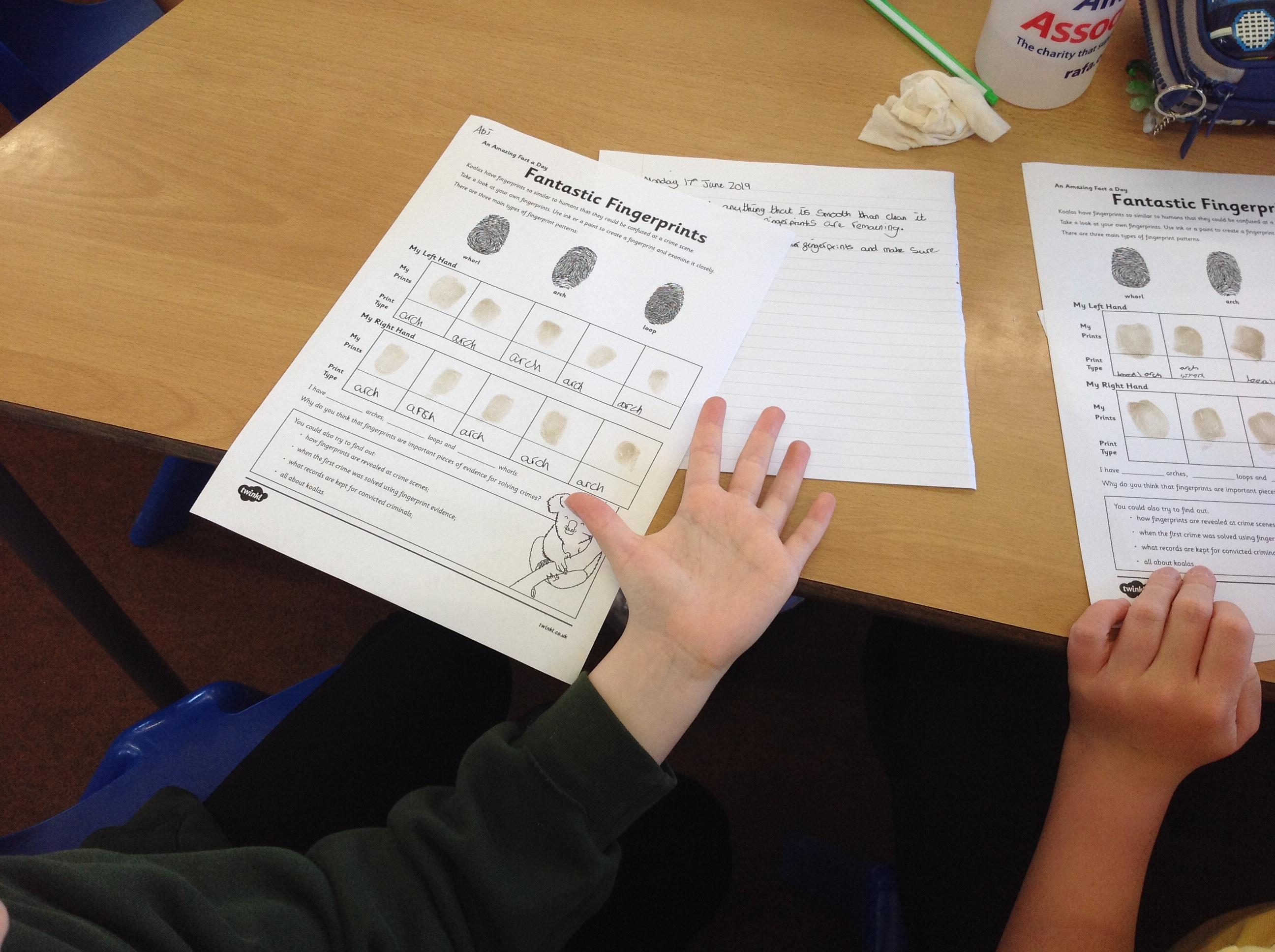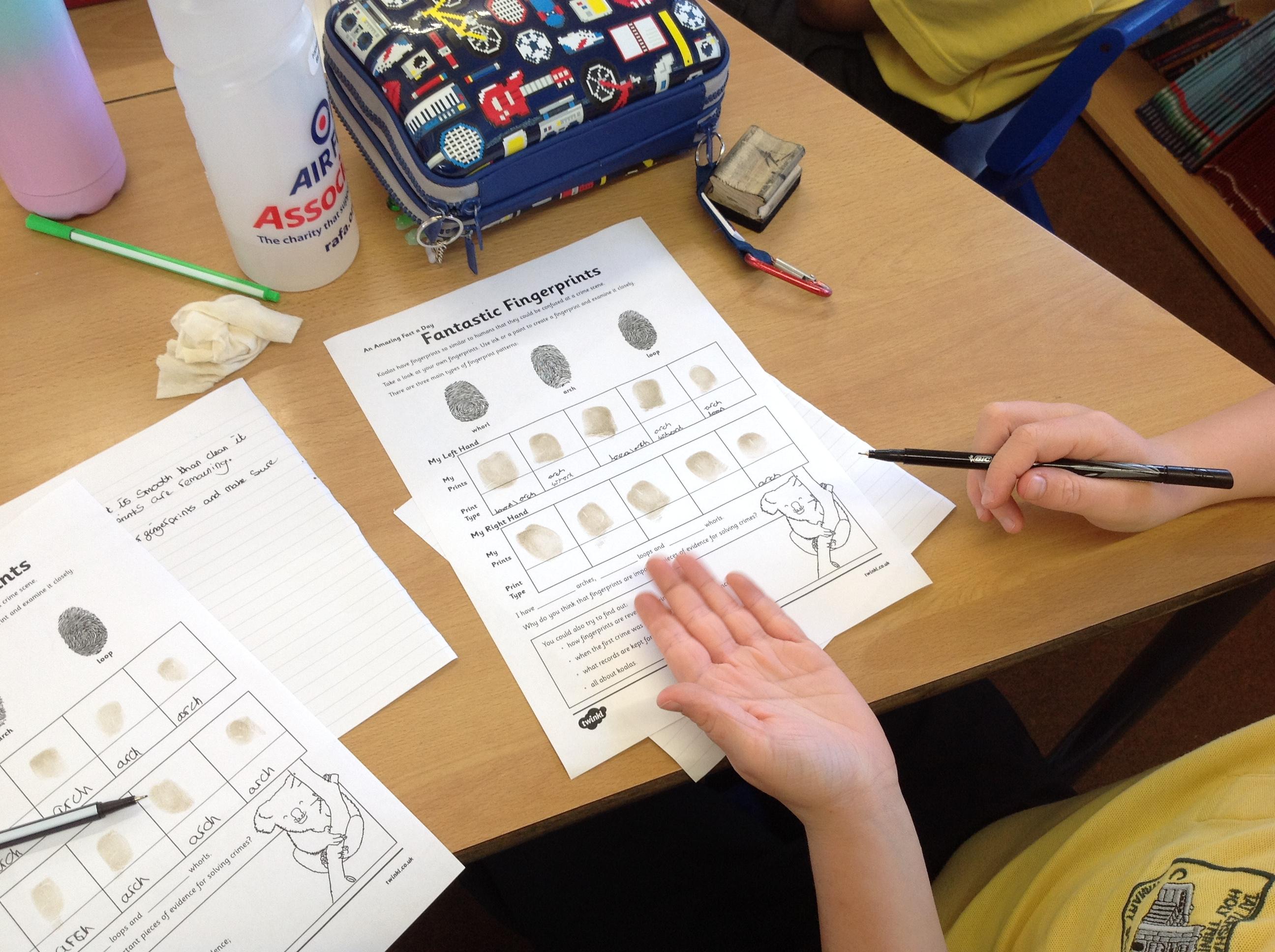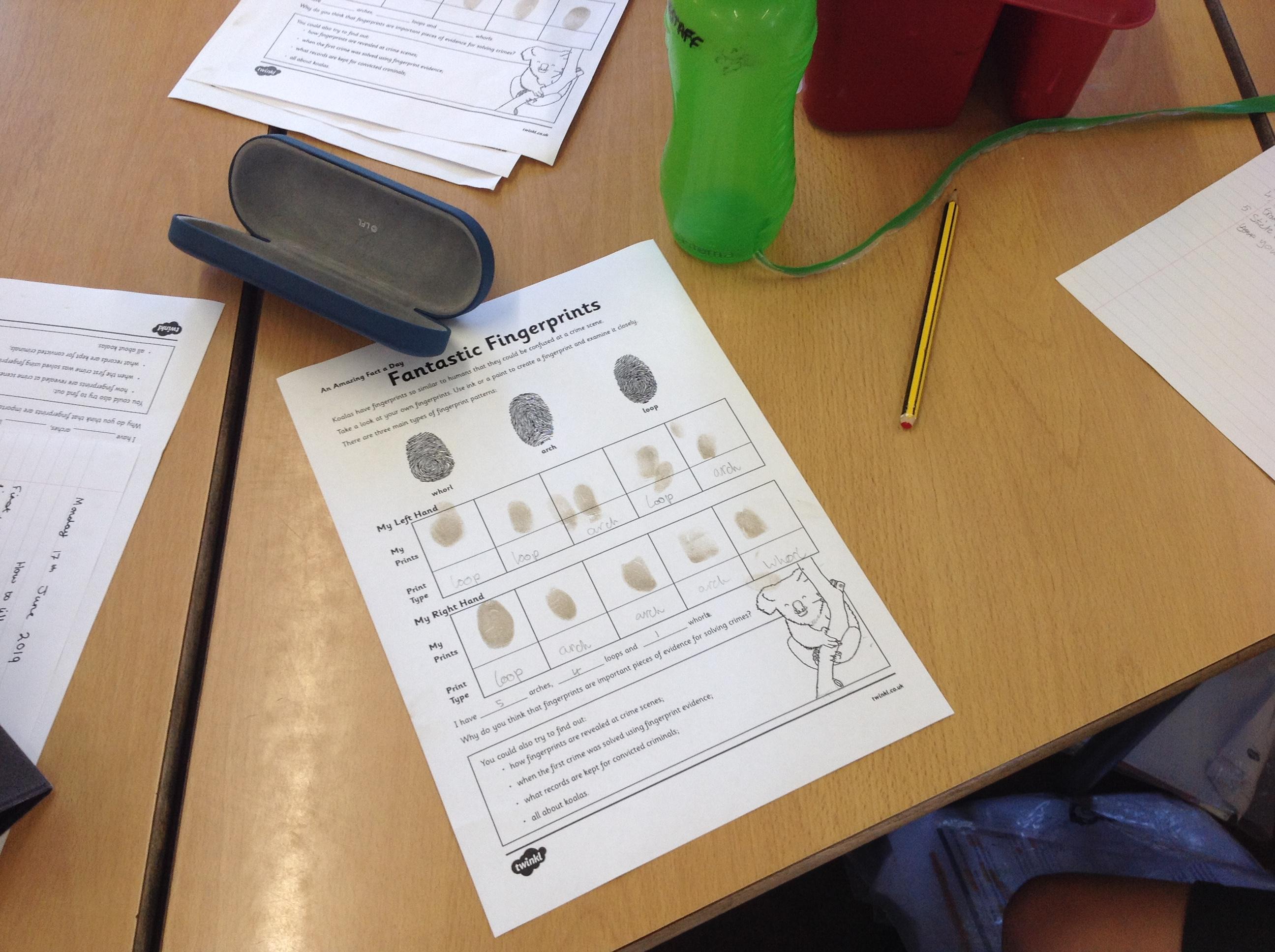 Today we read about fingerprints in Guided Reading, then learned how the police take fingerprints using ink and lift prints from crime scenes.