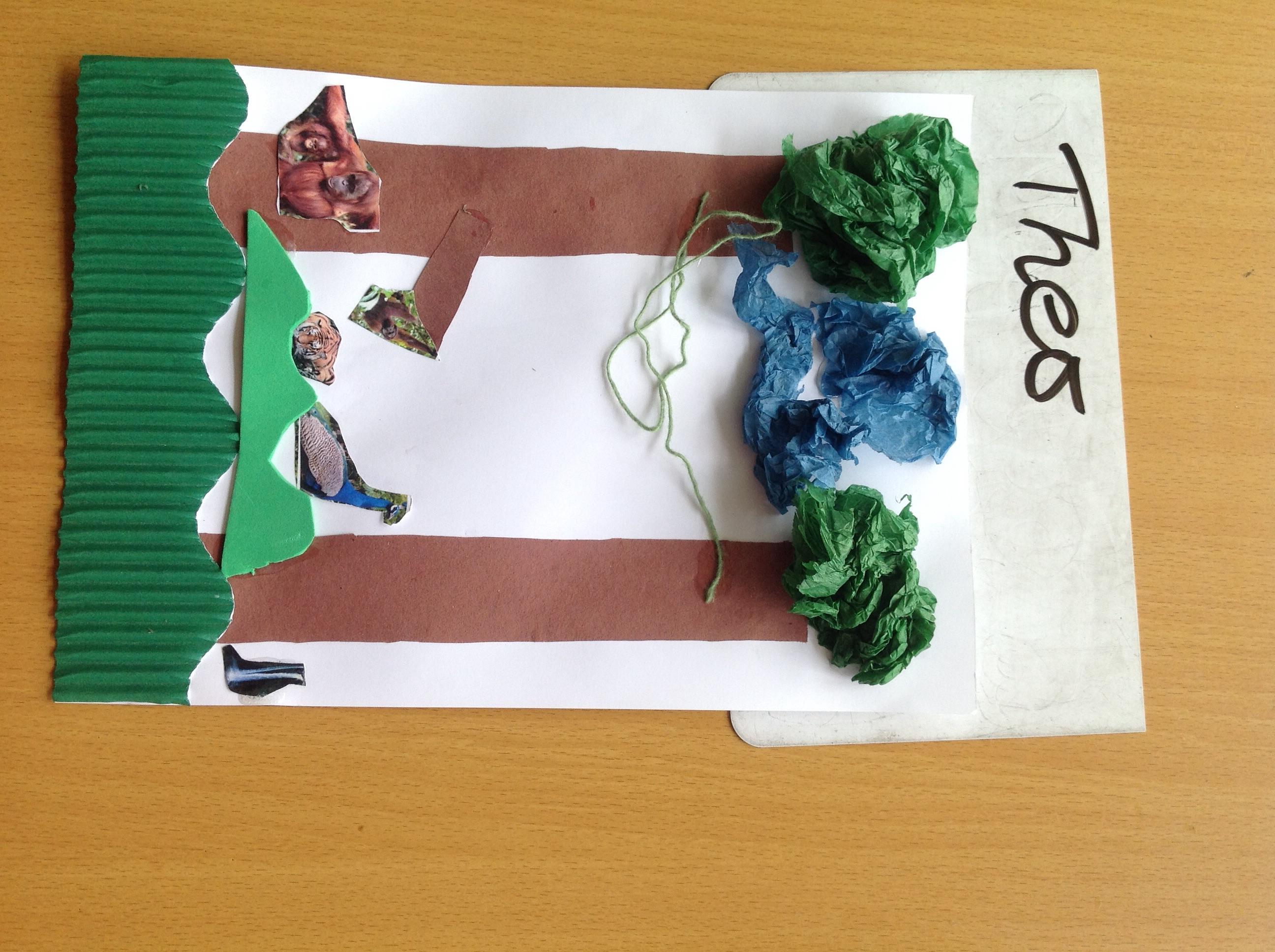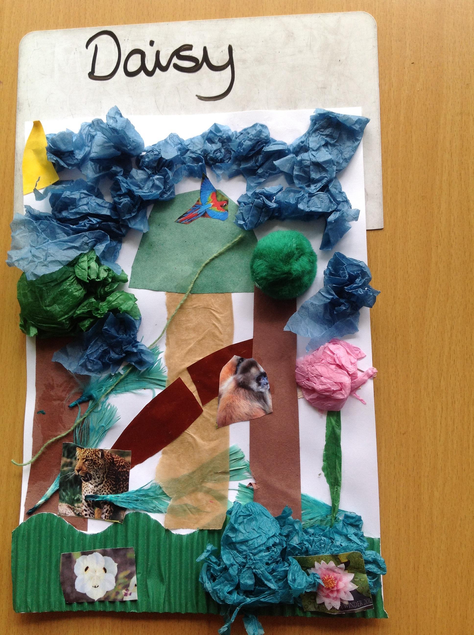 To to fit with our topic of the Rainforest, we took a closer look at Henri Rousseau's 'The Jungle.' We then used collage materials to design our own rainforest. We chose photos from the Internet and added them to our artwork to add digital media.