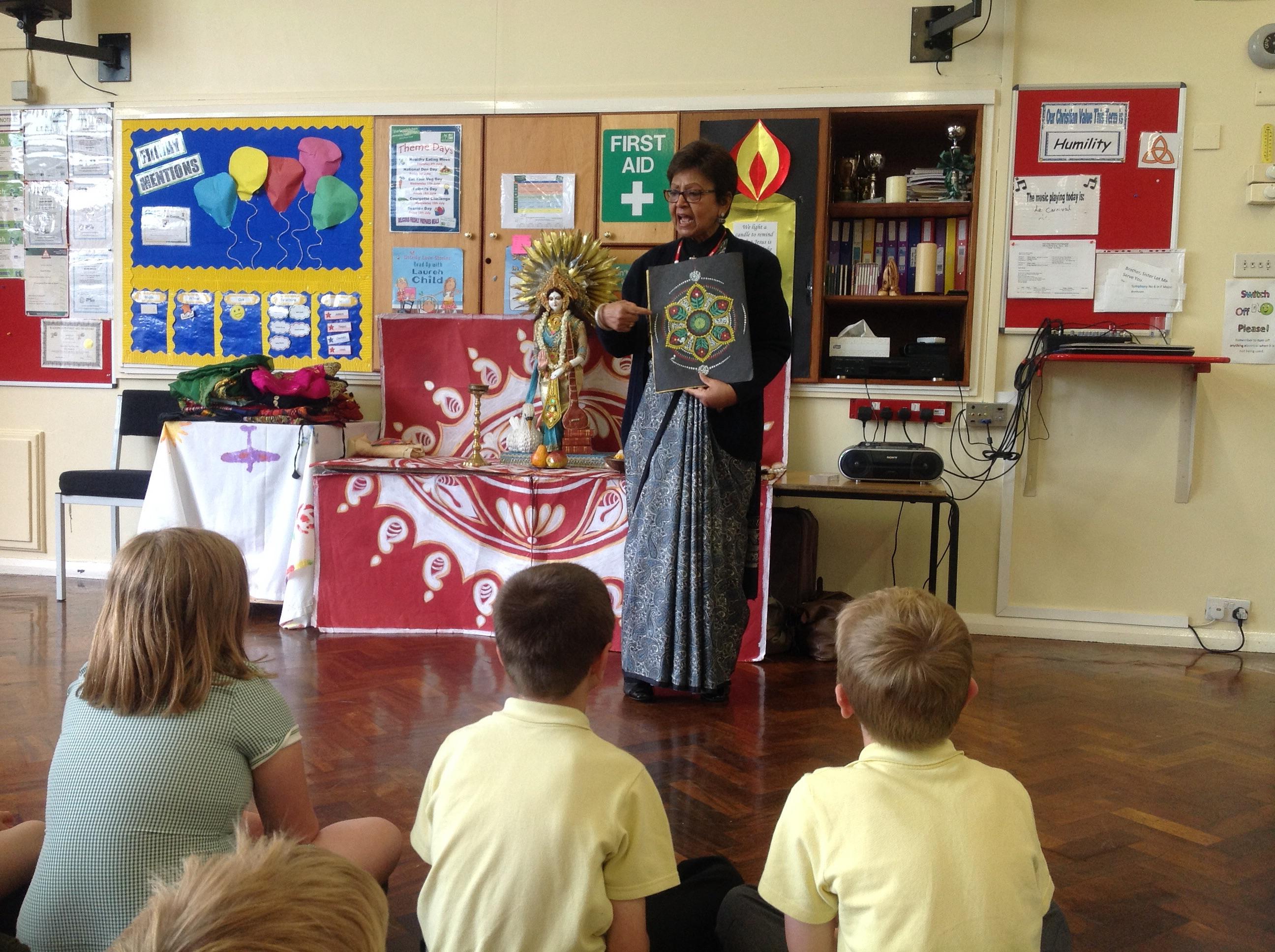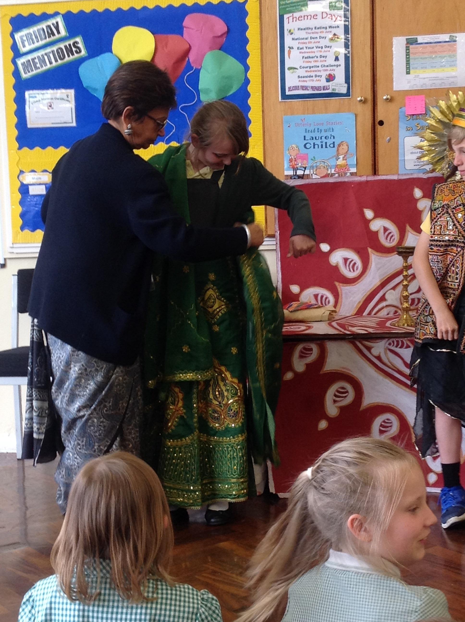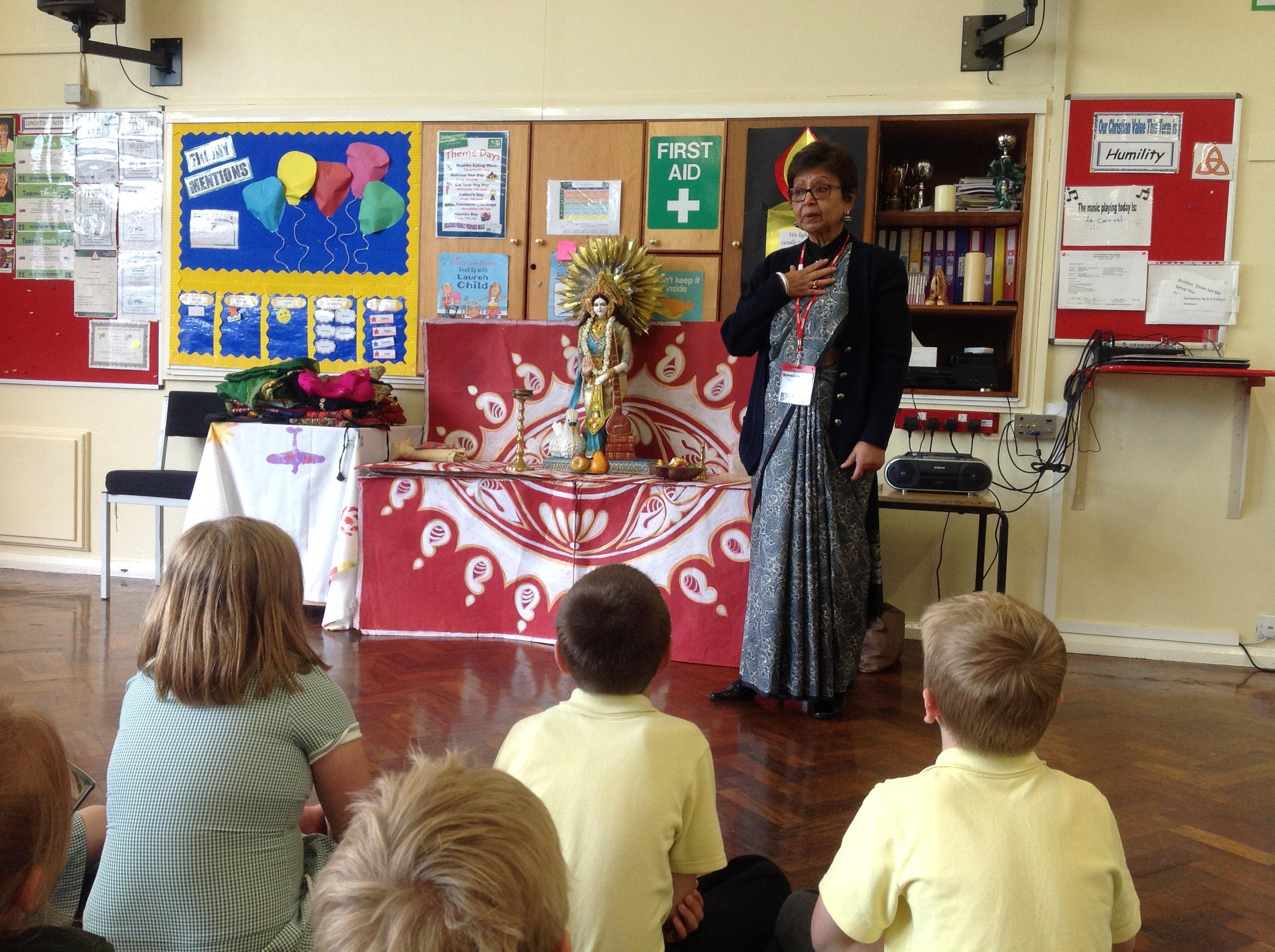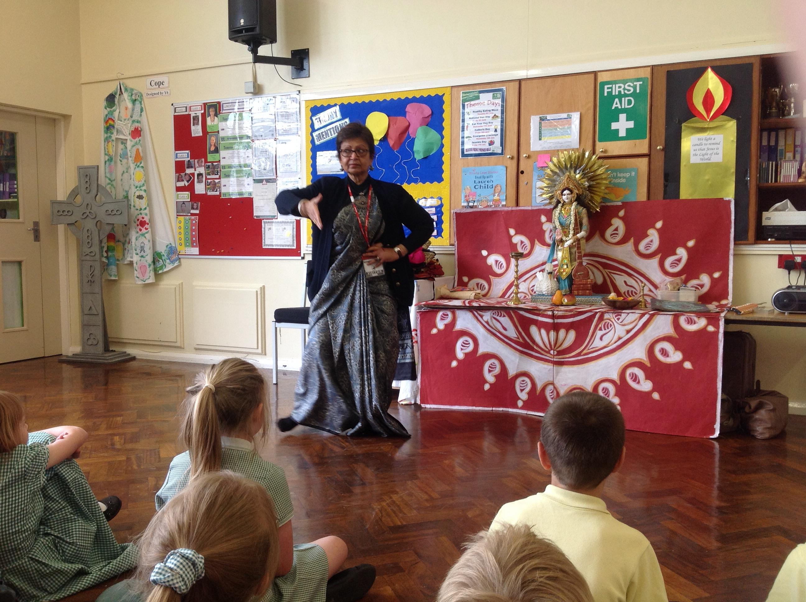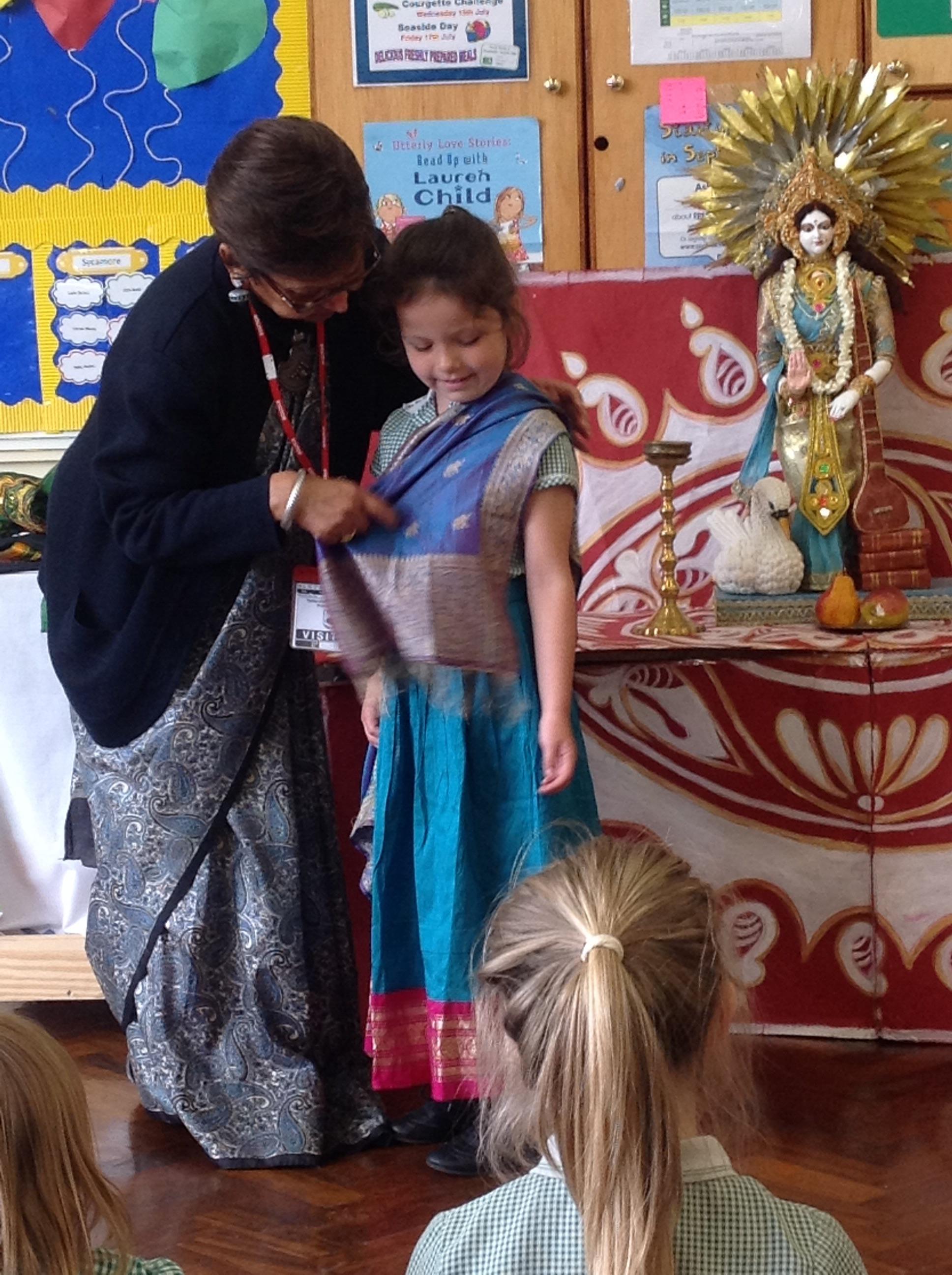 Mrs Basu came to visit the school today to talk to us about the religion of Hinduism. She talked to us about the Gods, how import their worship is to them and even told us a story through dance! Then she dressed some of us up in a sari!