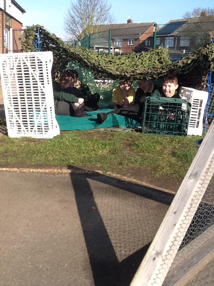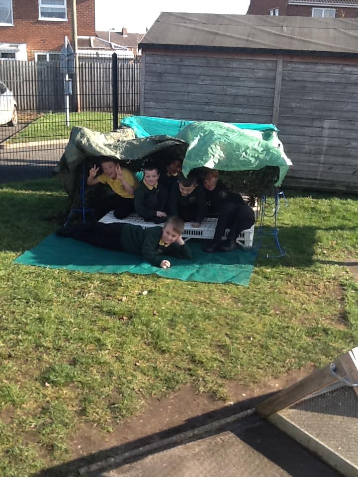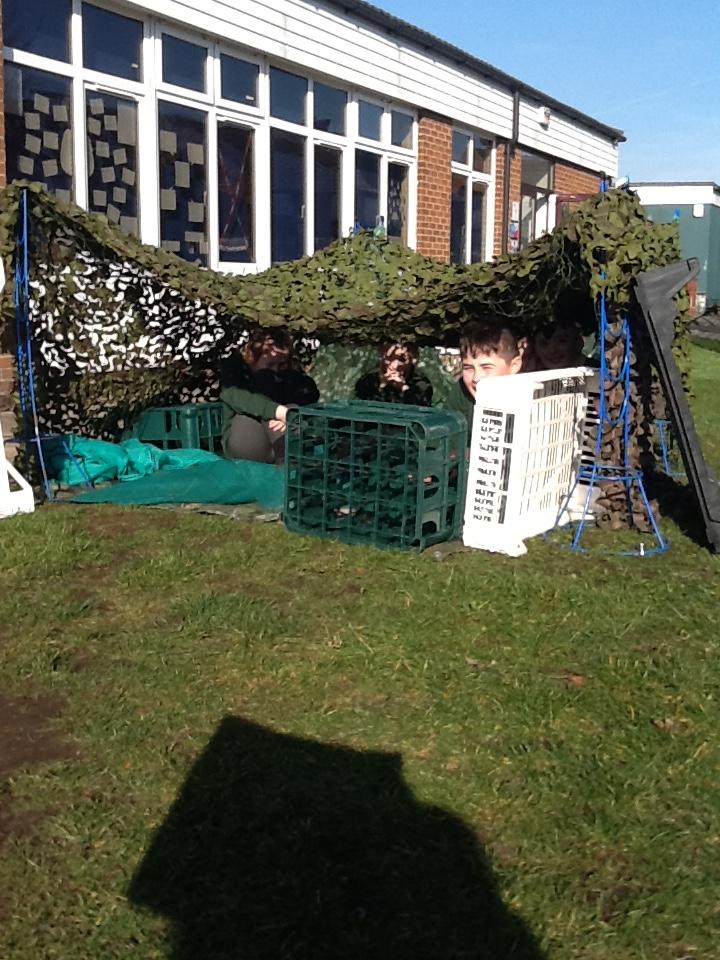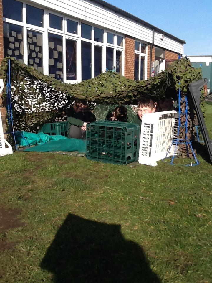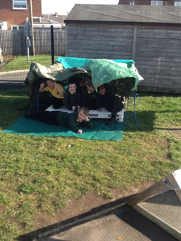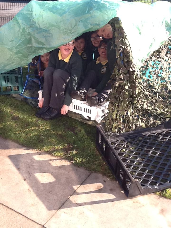 We have built shelters this week in preparation for a natural disaster! We thought about staying dry and warm, and had to make sure that we could fit our whole team inside!