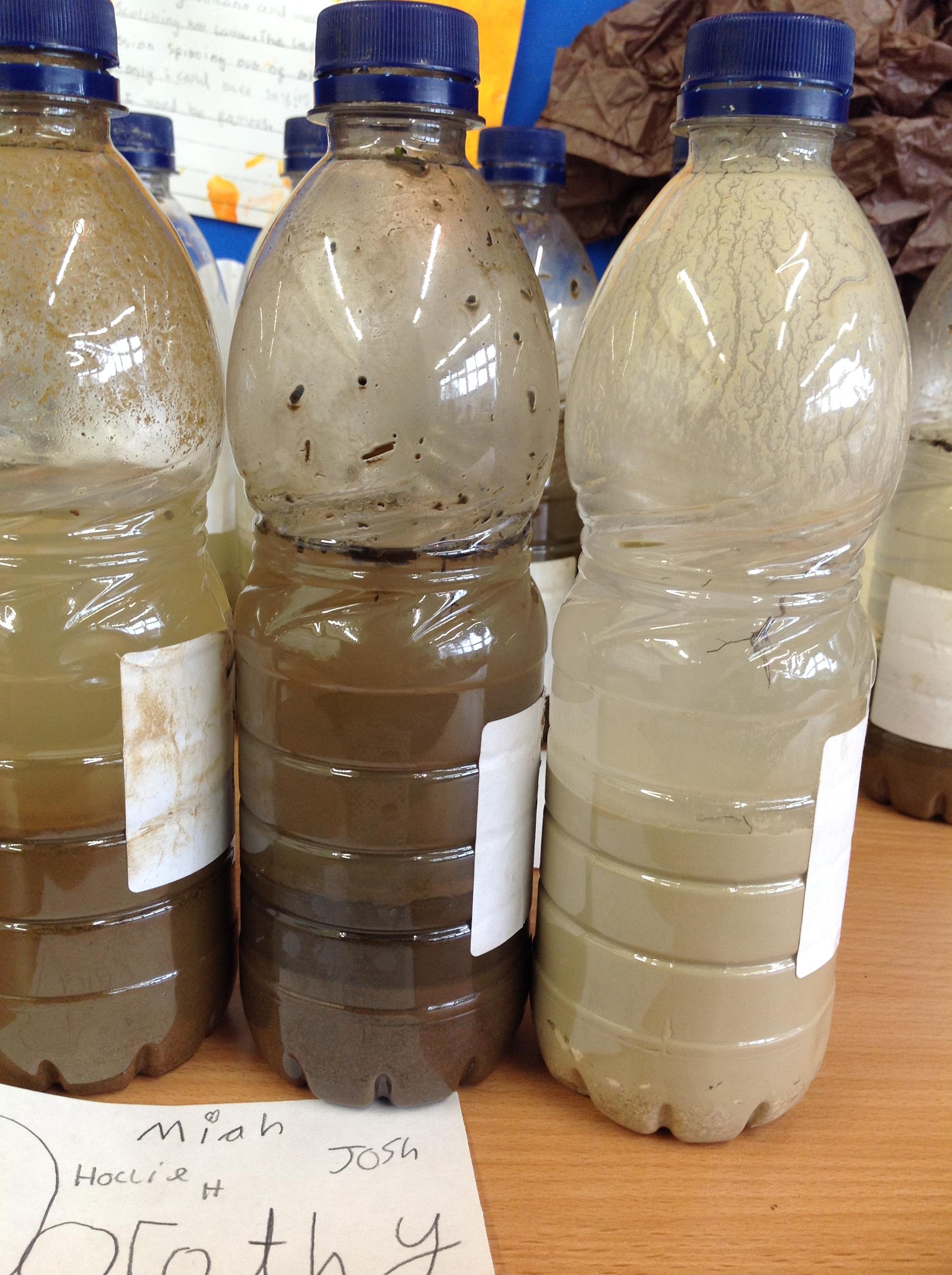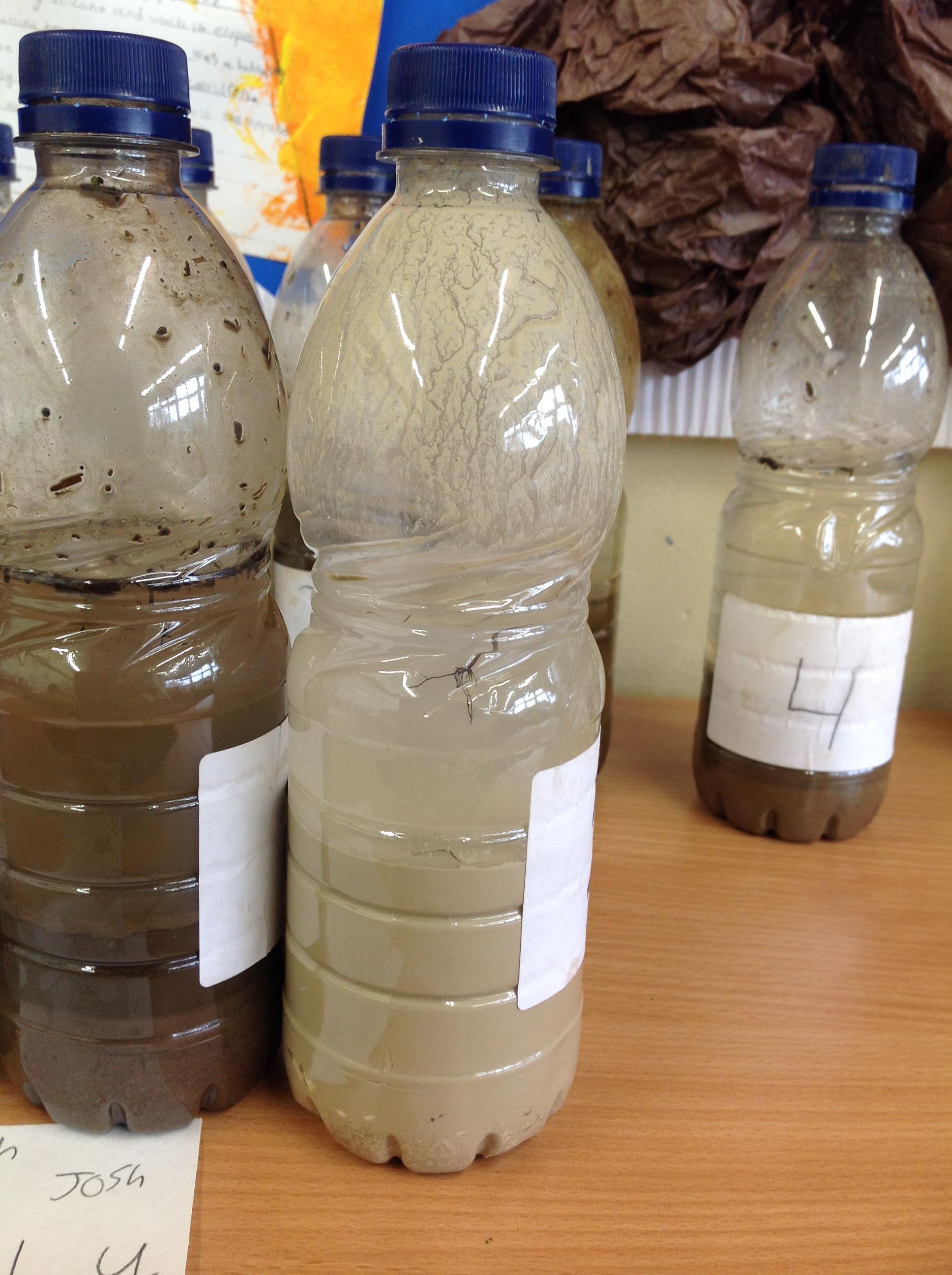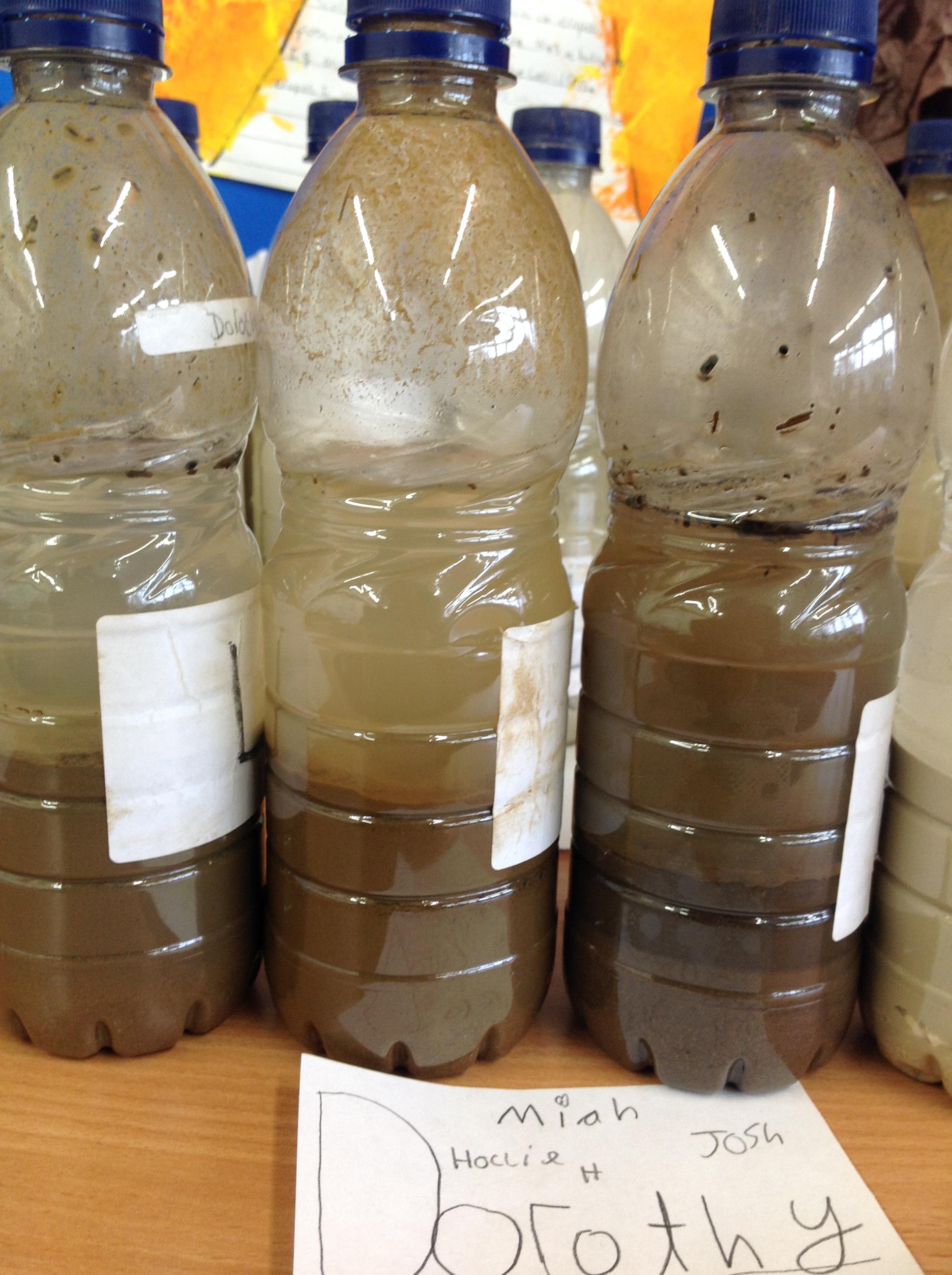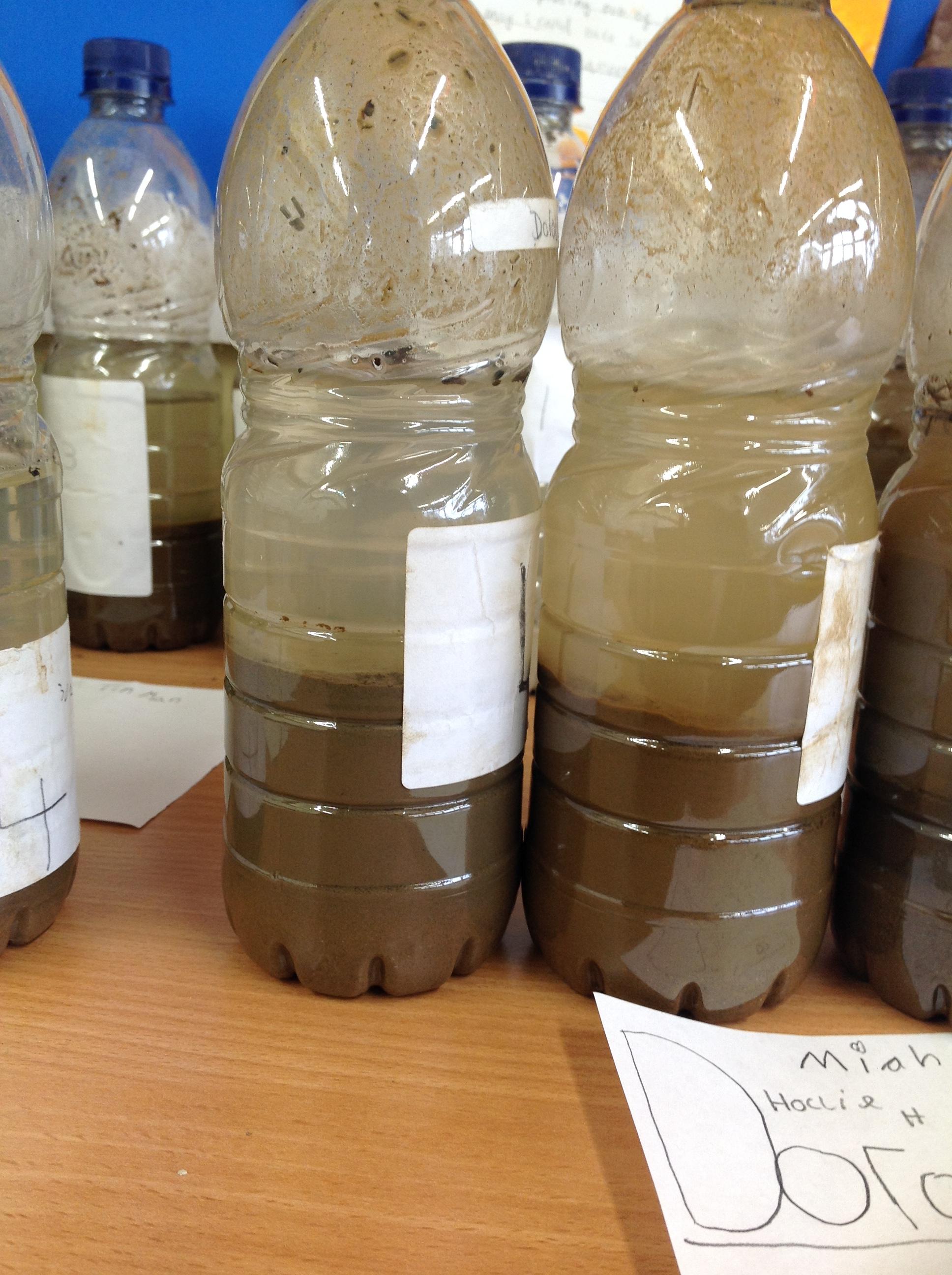 We tested different soils today to see what soil is made up of. We had 4 different soils and we had to make it a fair test. We placed the soils in different bottles and then mixed them with water. We left them overnight and we could clearly see the different layers of sediment and other materials floating in the water!
