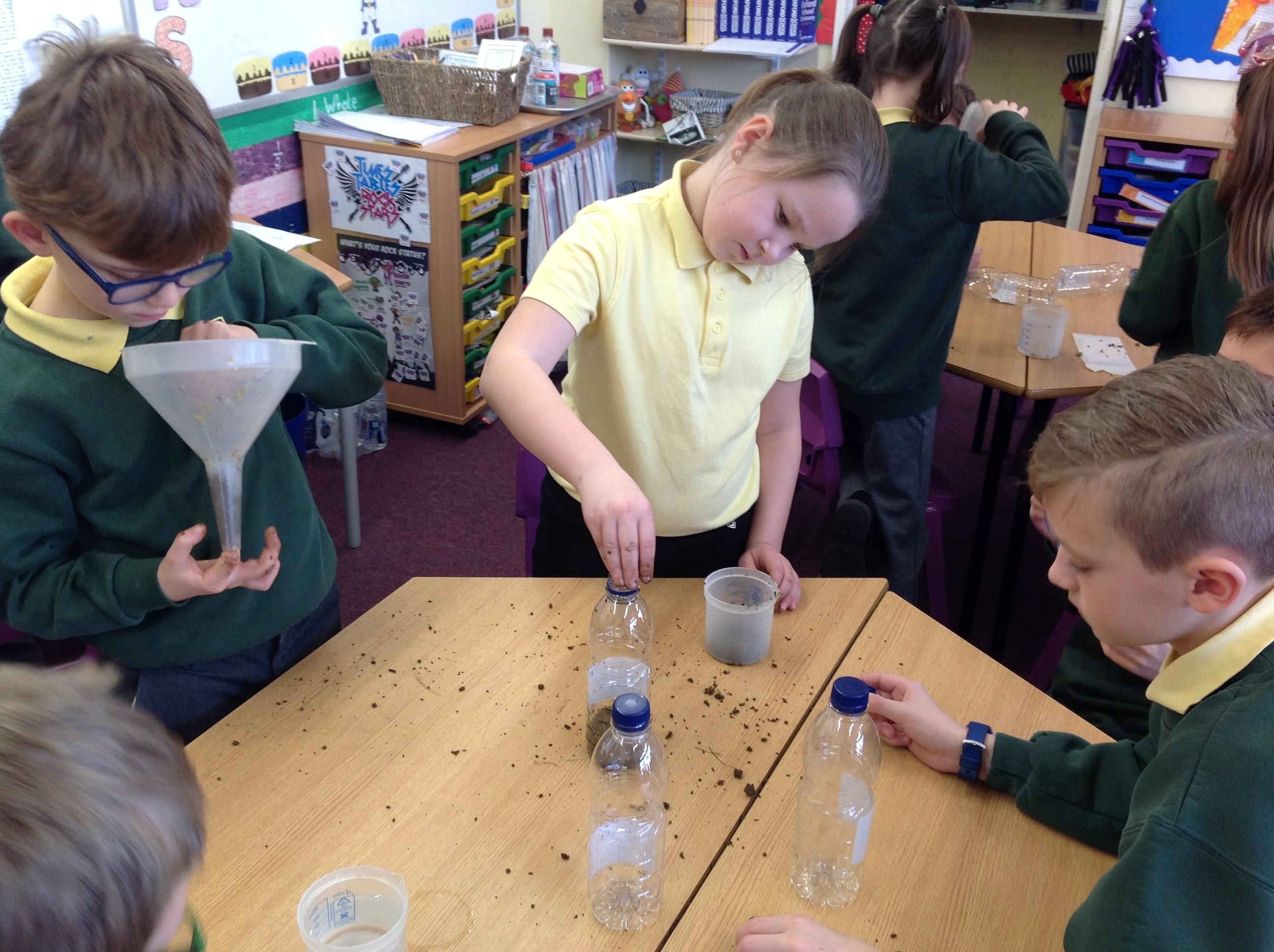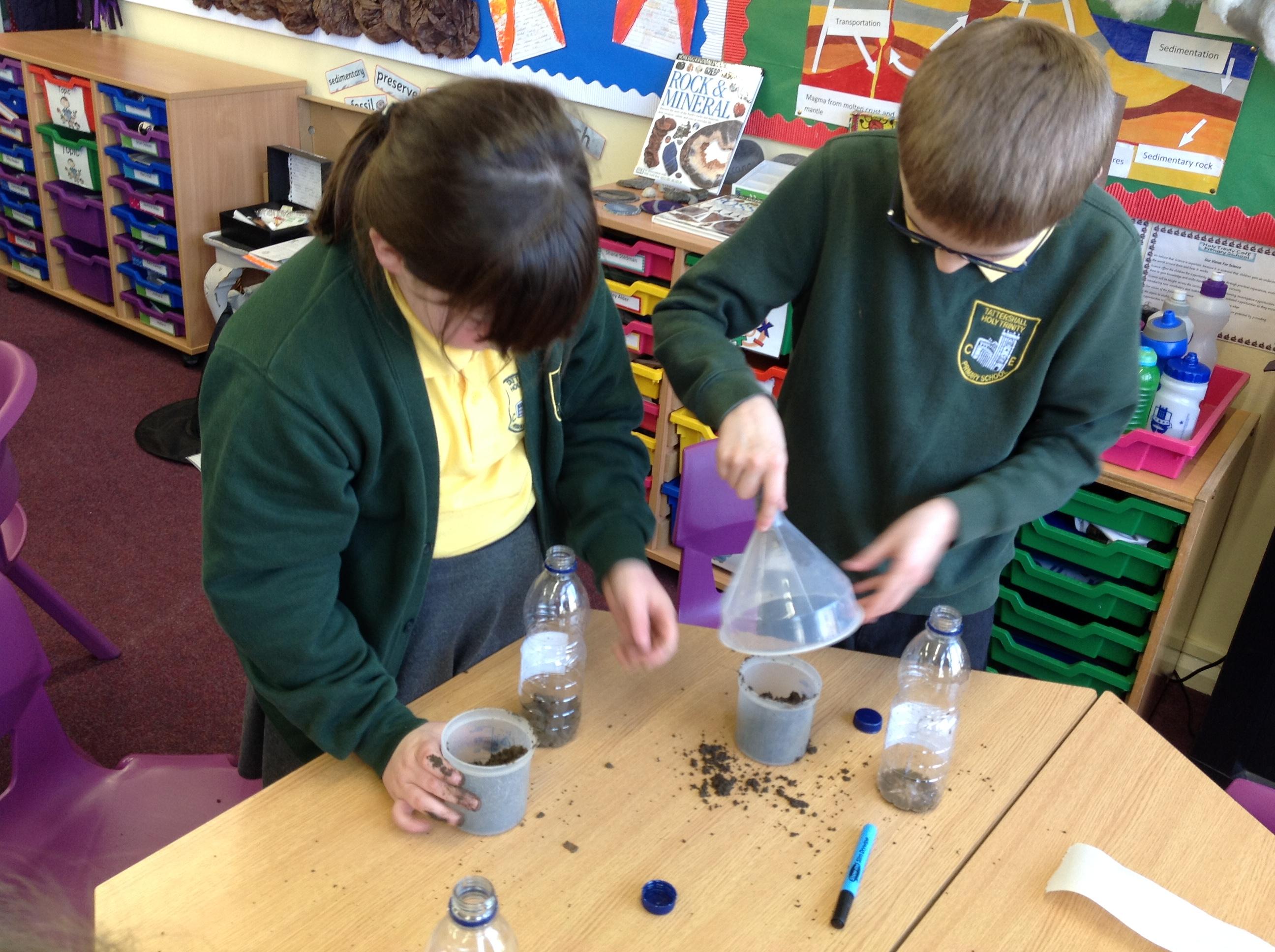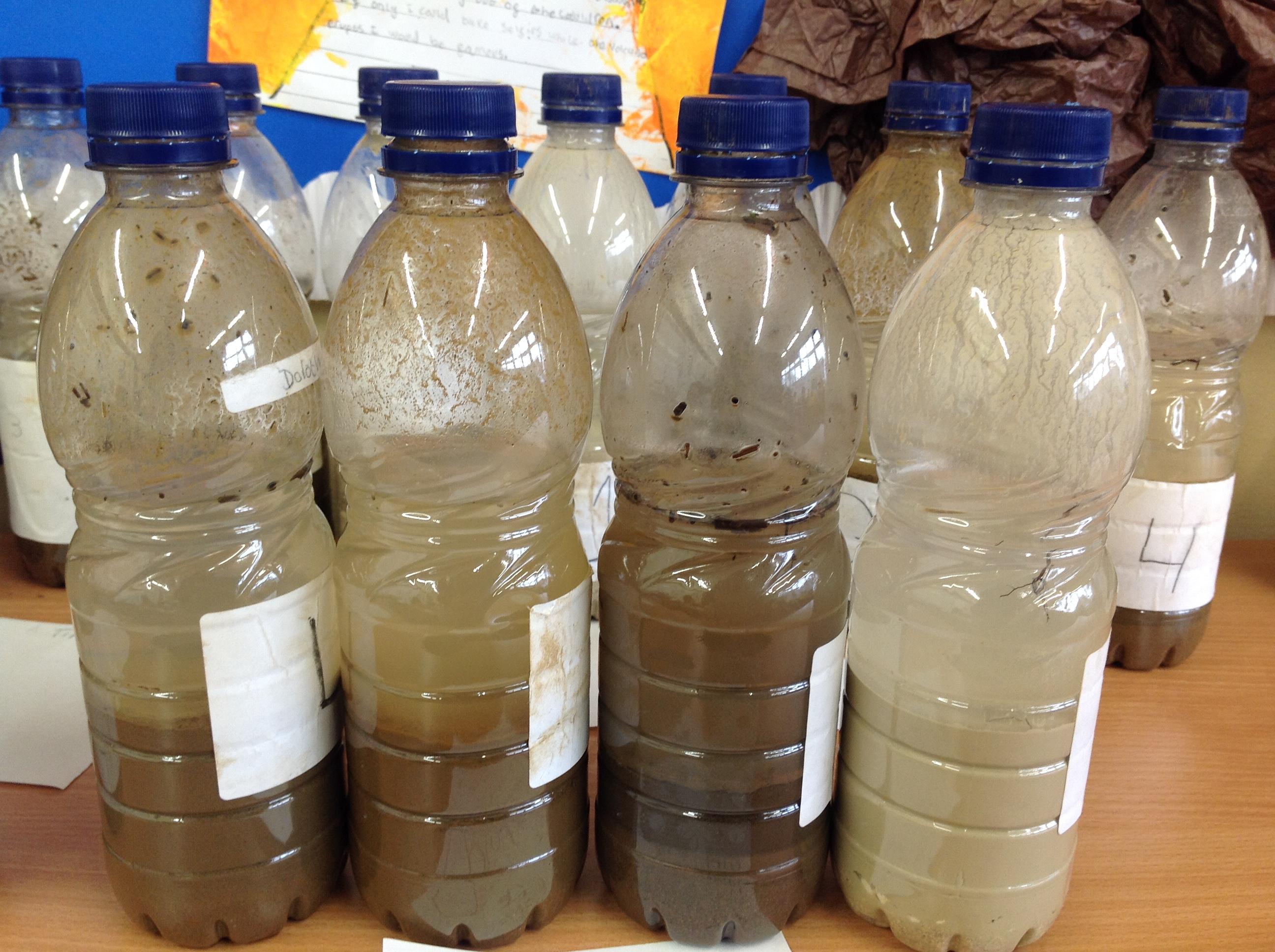 We tested different soils today to see what soil is made up of. We had 4 different soils and we had to make it a fair test. We placed the soils in different bottles and then mixed them with water. We left them overnight and we could clearly see the different layers of sediment and other materials floating in the water!