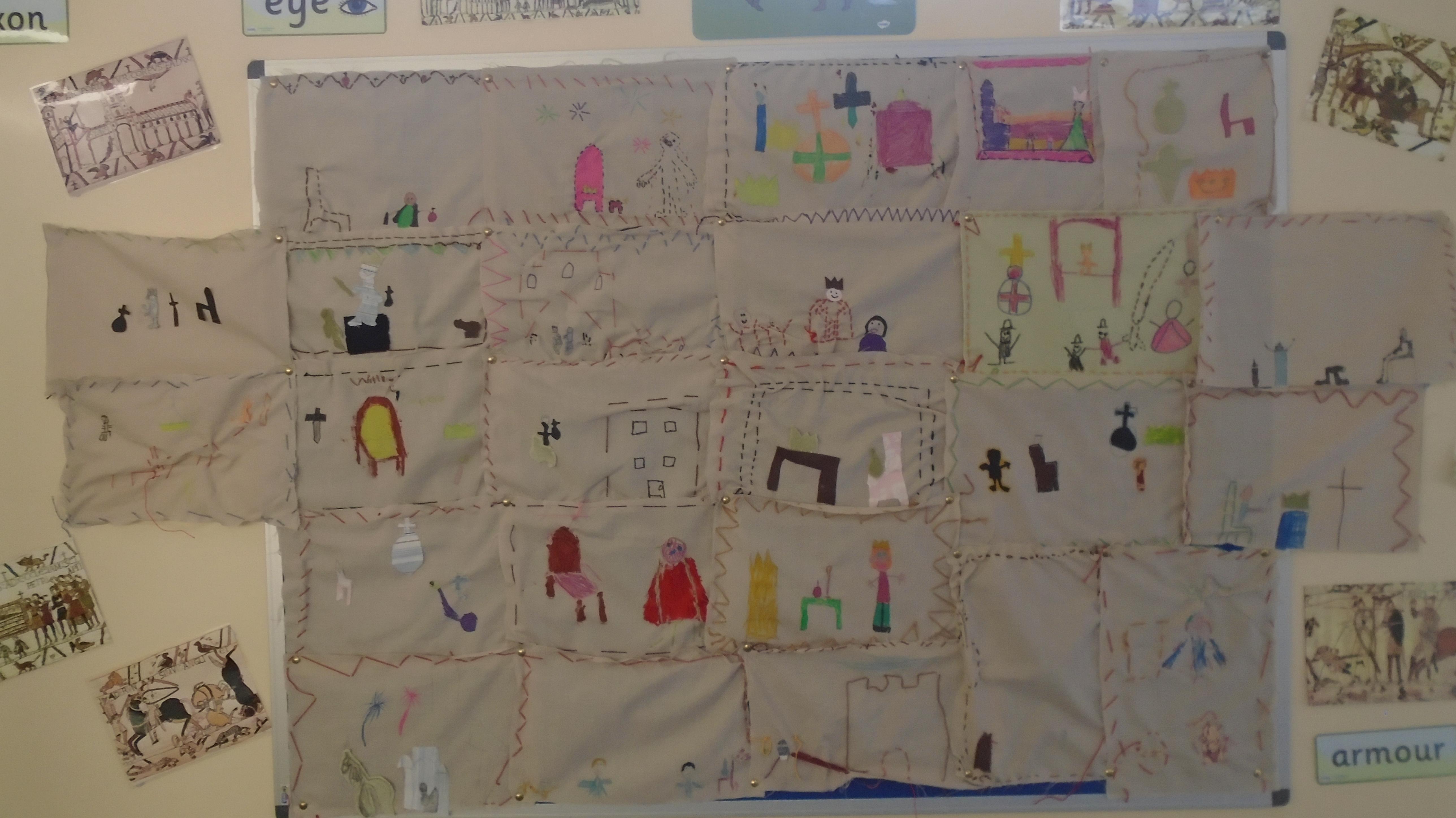 We have been looking at the Norman Conquest in Topic this term and have designed and created a new piece for the Bayeux Tapestry! The Coronation of William! We stitched the main parts of our piece and then used fabric pens to finish off the detailed designs!