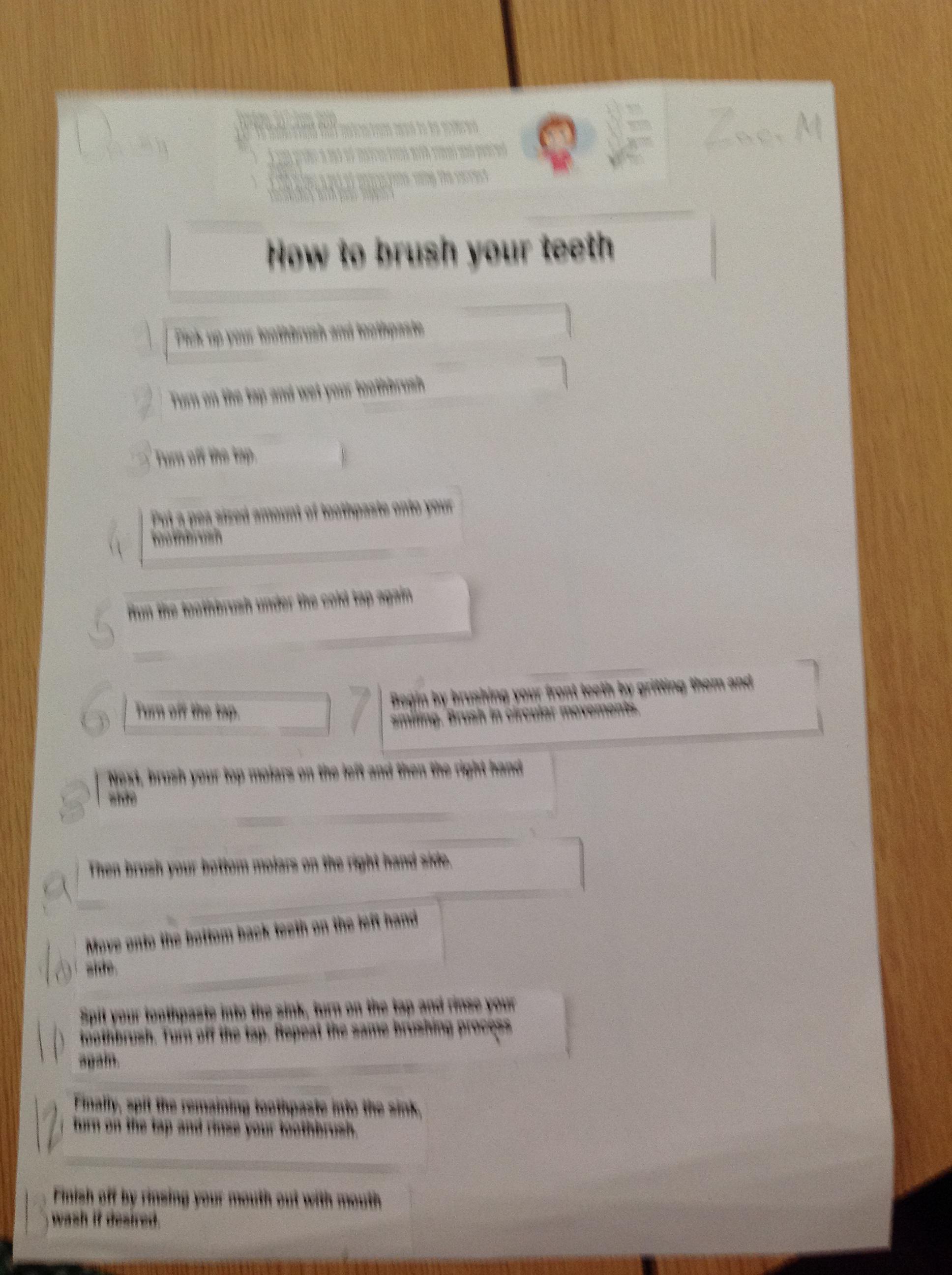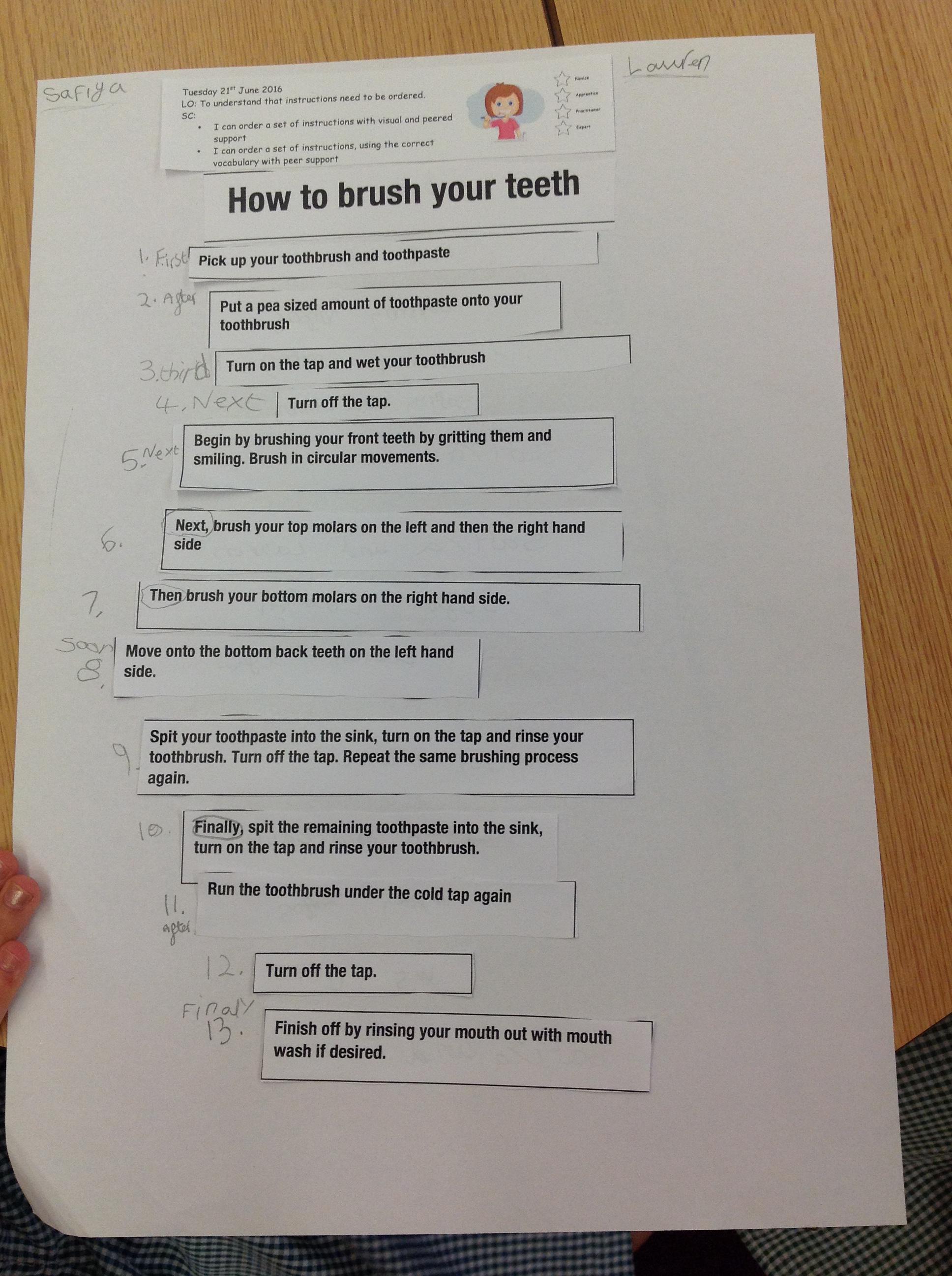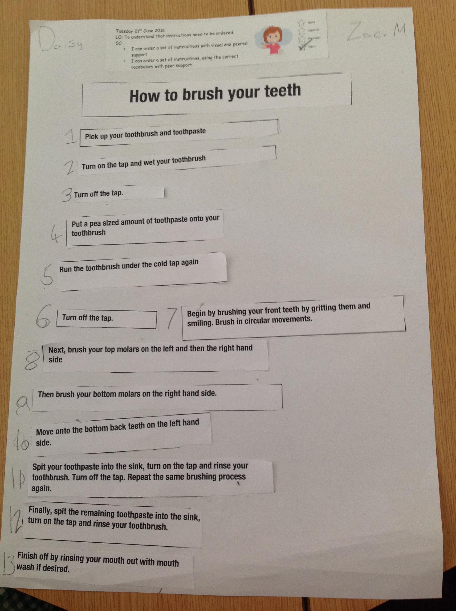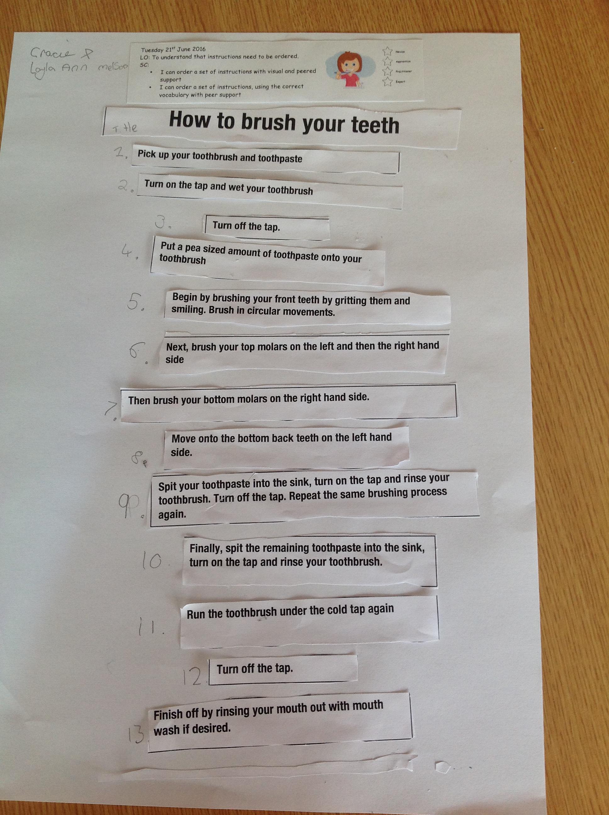 We have been learning about writing instructions in preparation for writing our own Dragon Training instructions! We learnt how instructions must be in order so they can be understood and followed. We worked in pairs to order instructions for brushing our teeth!