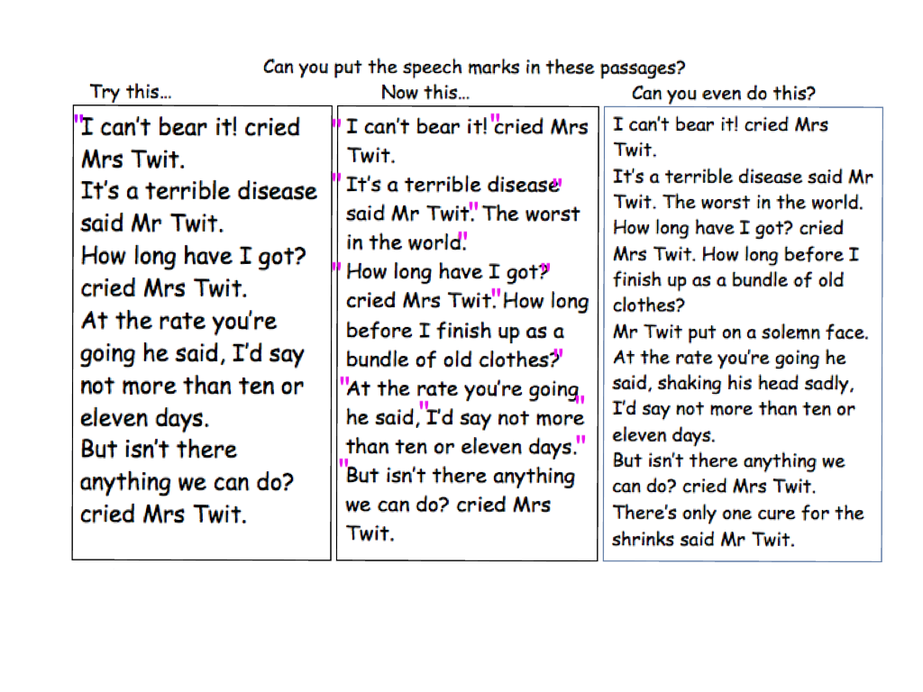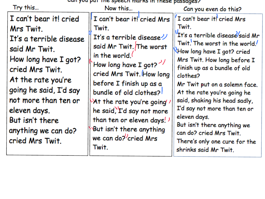 To start our topic of play scripts, we've started by looking at dialogue and speech punctuation. We have been looking at some of the conversations Mr and Mrs Twit have and making sure we put the speech marks in the right place. Miss Read made us a video to help us to remember!