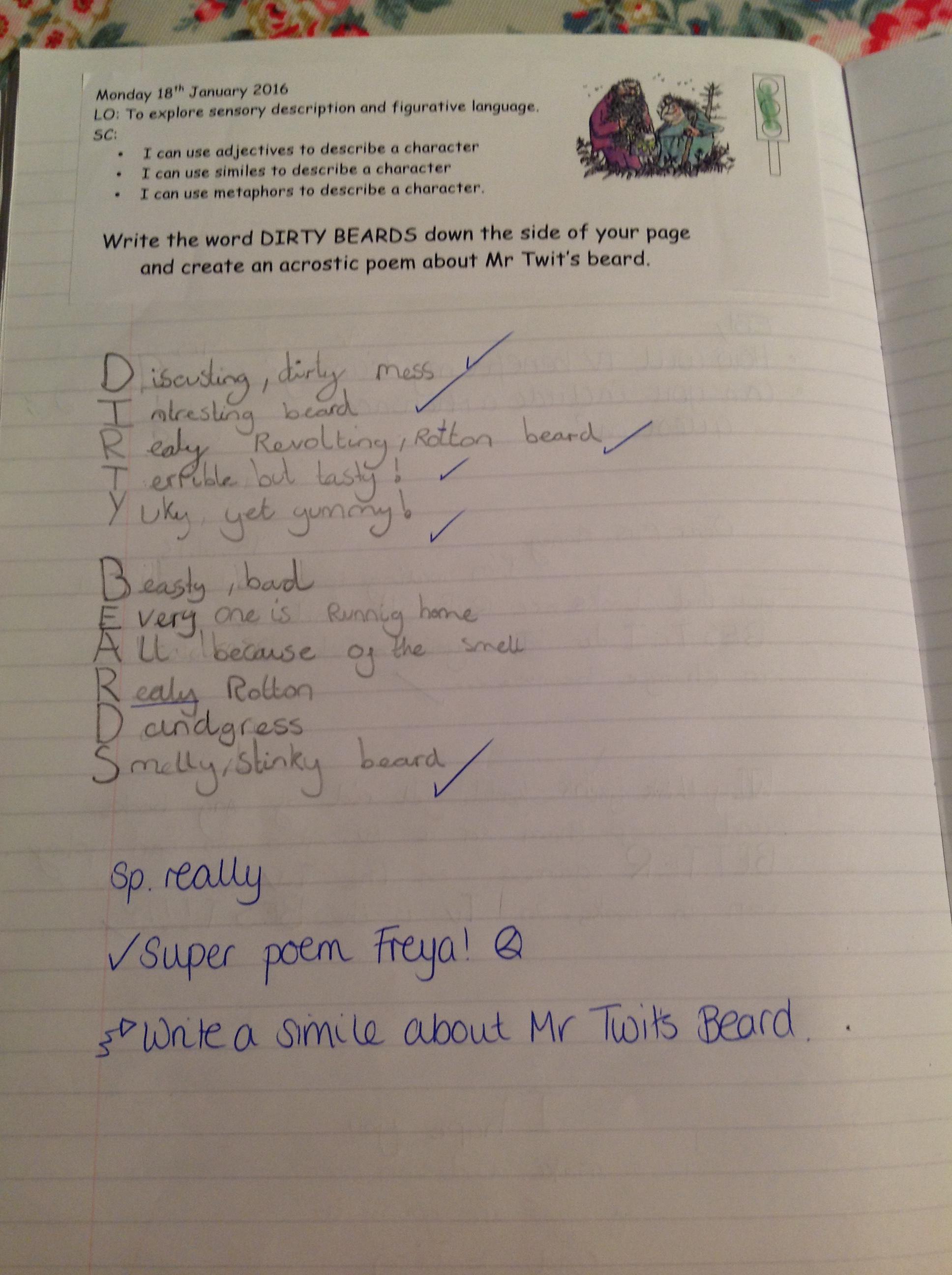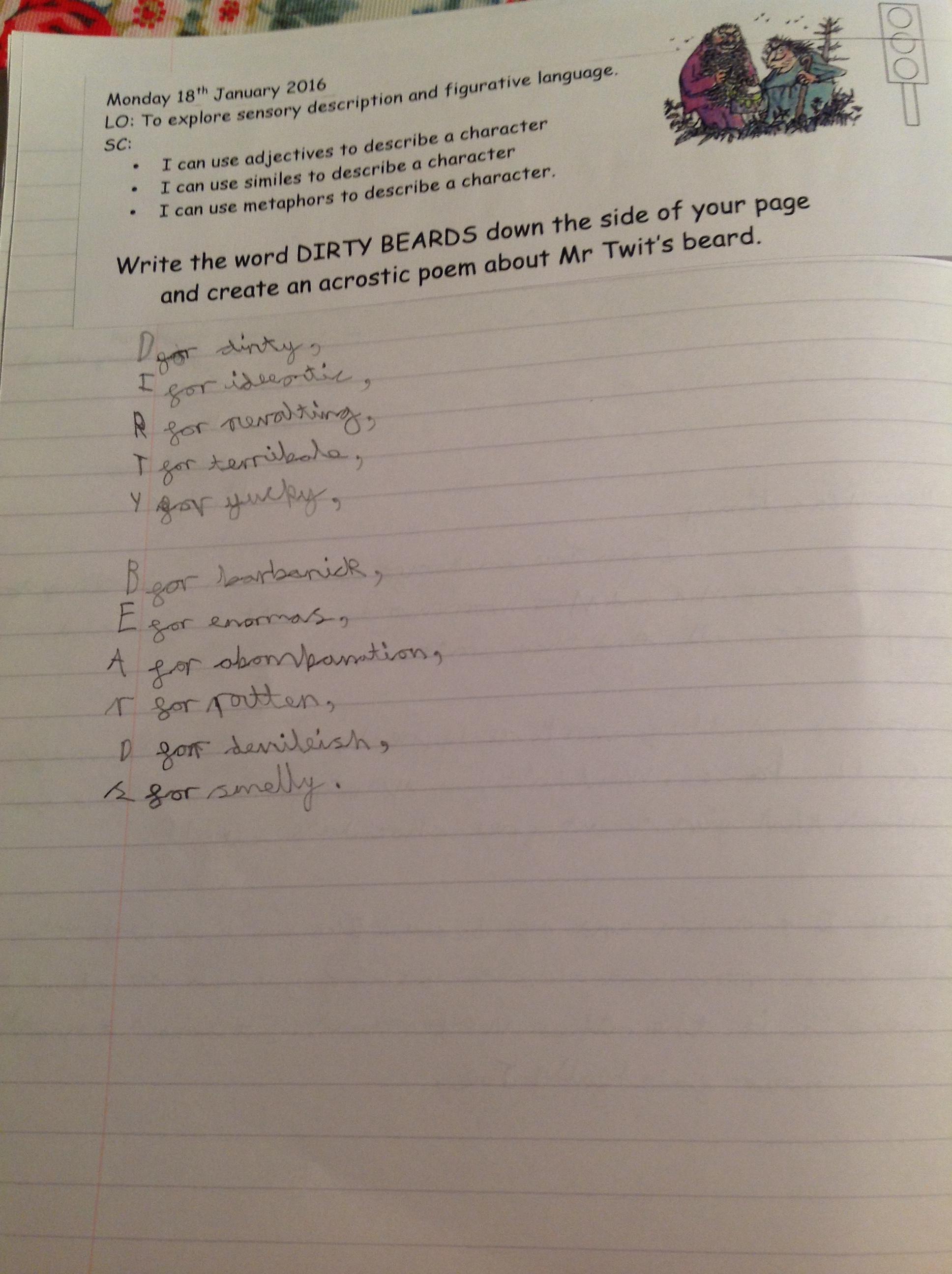 Today, we read the chapter of The Twits about Mrs Twit. We found out how she became an ugly lady through having ugly thoughts. We created our own Good Thoughts Poems to make us have happy thoughts!
