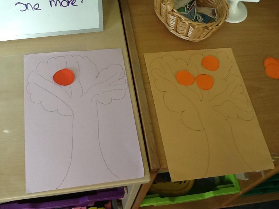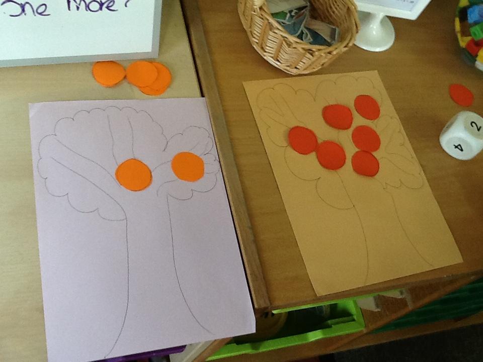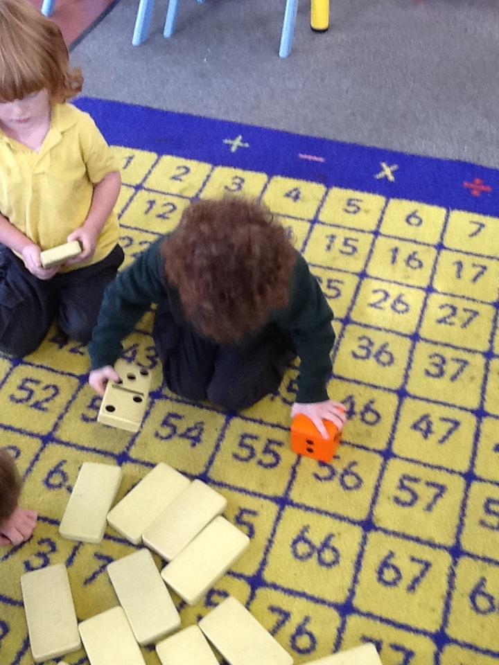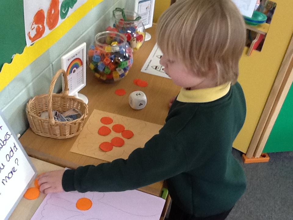 This week the children have been looking at 'More' and 'Less'. They have played games where they have had to roll the dice and put that amount of oranges on the tree. They had to roll it again and add that amount of apples to the tree. The children then decided which tree had more fruit and which tree had less fruit. In addition to this, the children had to place dominos face down on the floor. The children took it in turns to roll the die. They had to choose a domino, count the spots and decide weather the domino or the die had the most spots. The children really got to grips with 'More' and 'Less' this week!