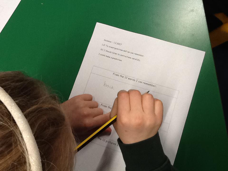 We did another great investigation this week looking at how well we can remember. We did three activities one with words one with numbers and one with pictures. We had to look at them for one minute and then write down as many as we could. It was great fun but also very tricky.