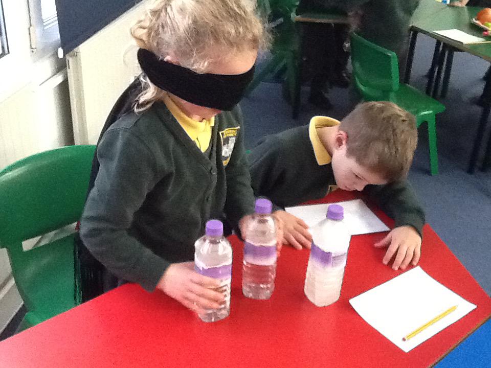 This week we did an investigation into what our hands can do. We thought about our different senses and how our bodies can do incredible things. We had four activities that we needed to complete which were ordering water bottles which contained water of different temperatures, feeling an object on a tray and working out what it might be, feeling an object to see if we could work out what colour it was and ordering different lengths of straws. The only problem was we had to wear a blindfold! We all helped each other and talked about how we needed to trust our friends to help us and keep us safe. We had great fun carrying out this investigation and realised just how important our sense of touch is! We did discover that touch alone cannot tell us what colour something is we need to use other parts of our body too.