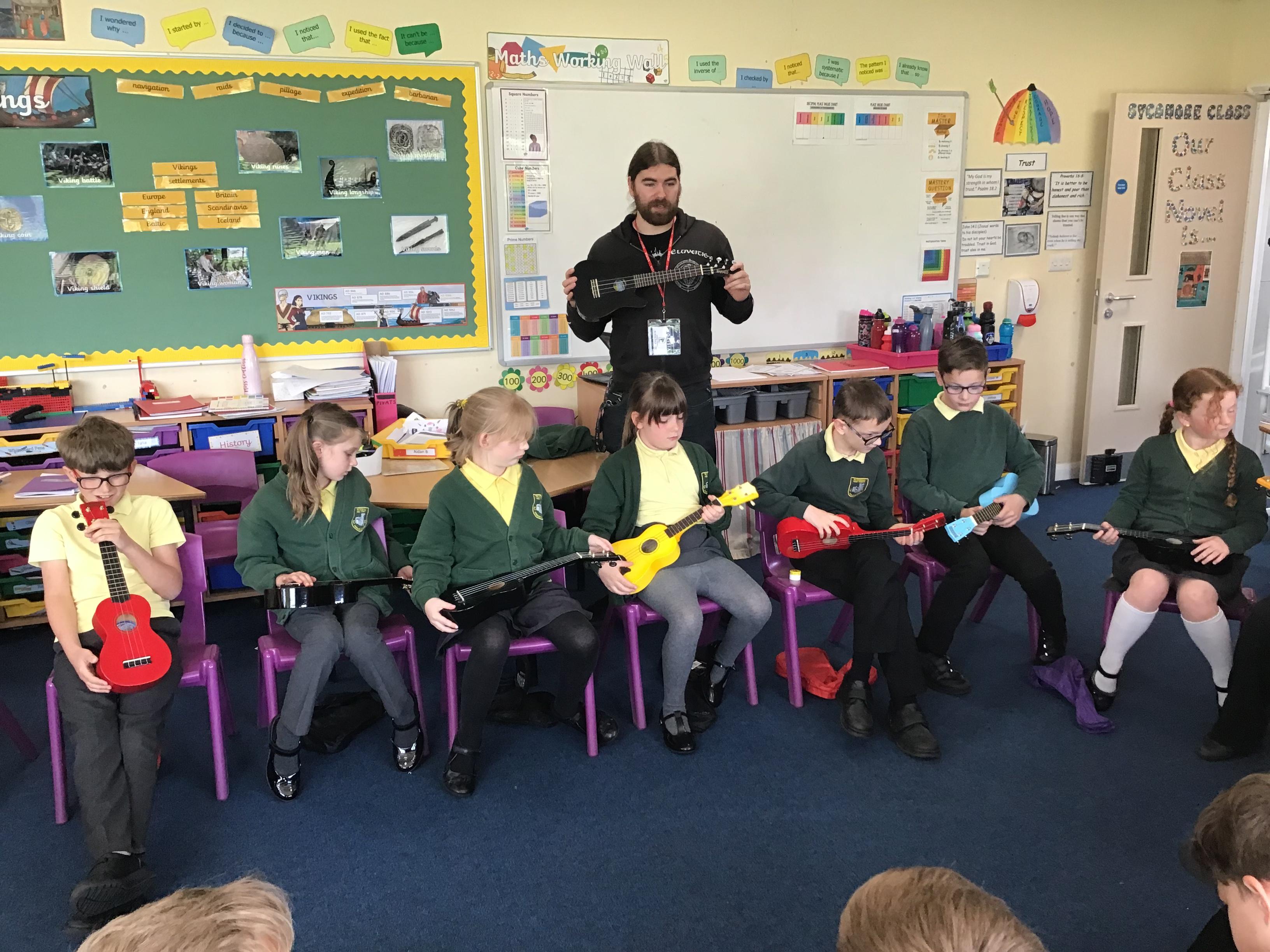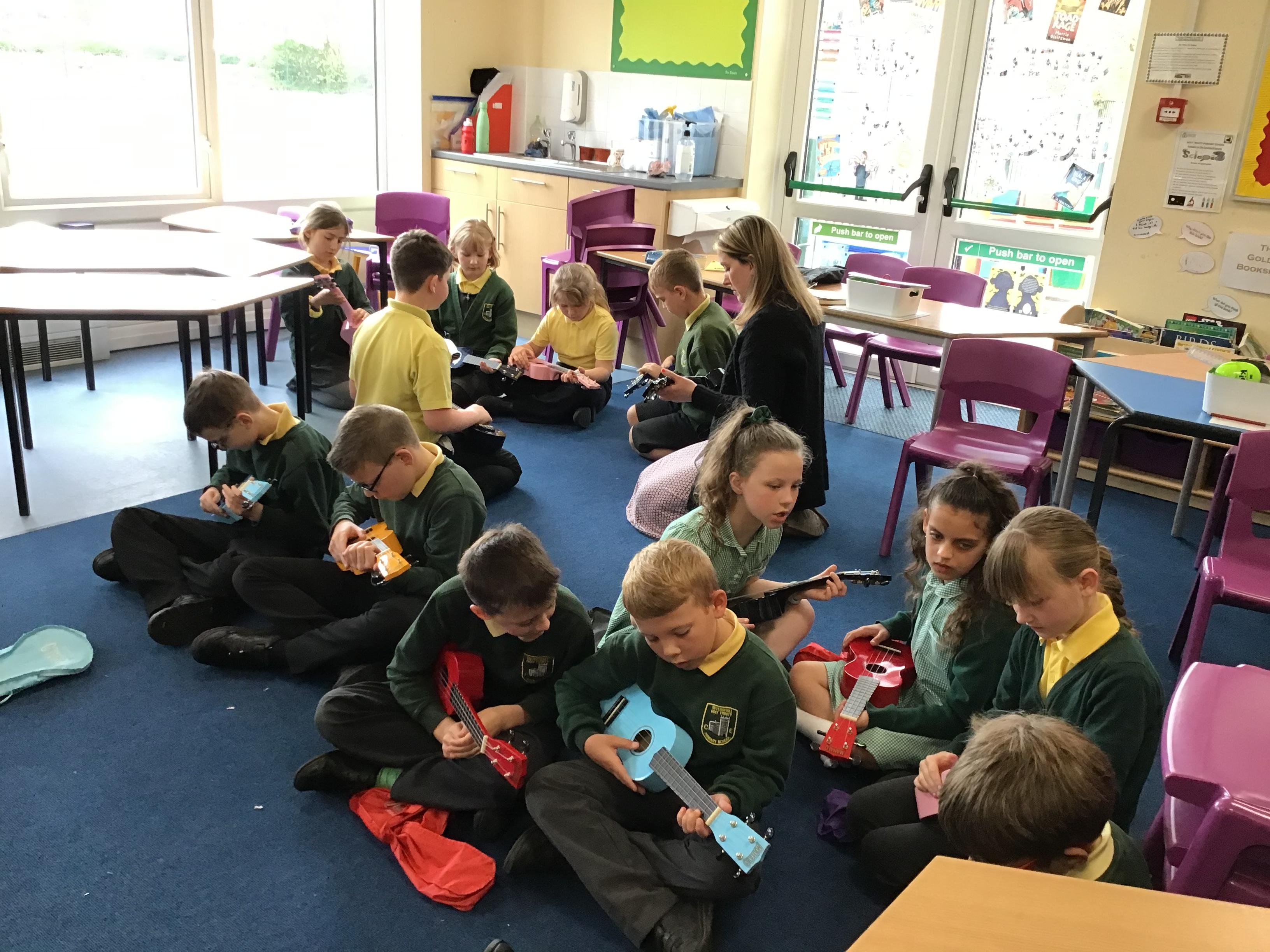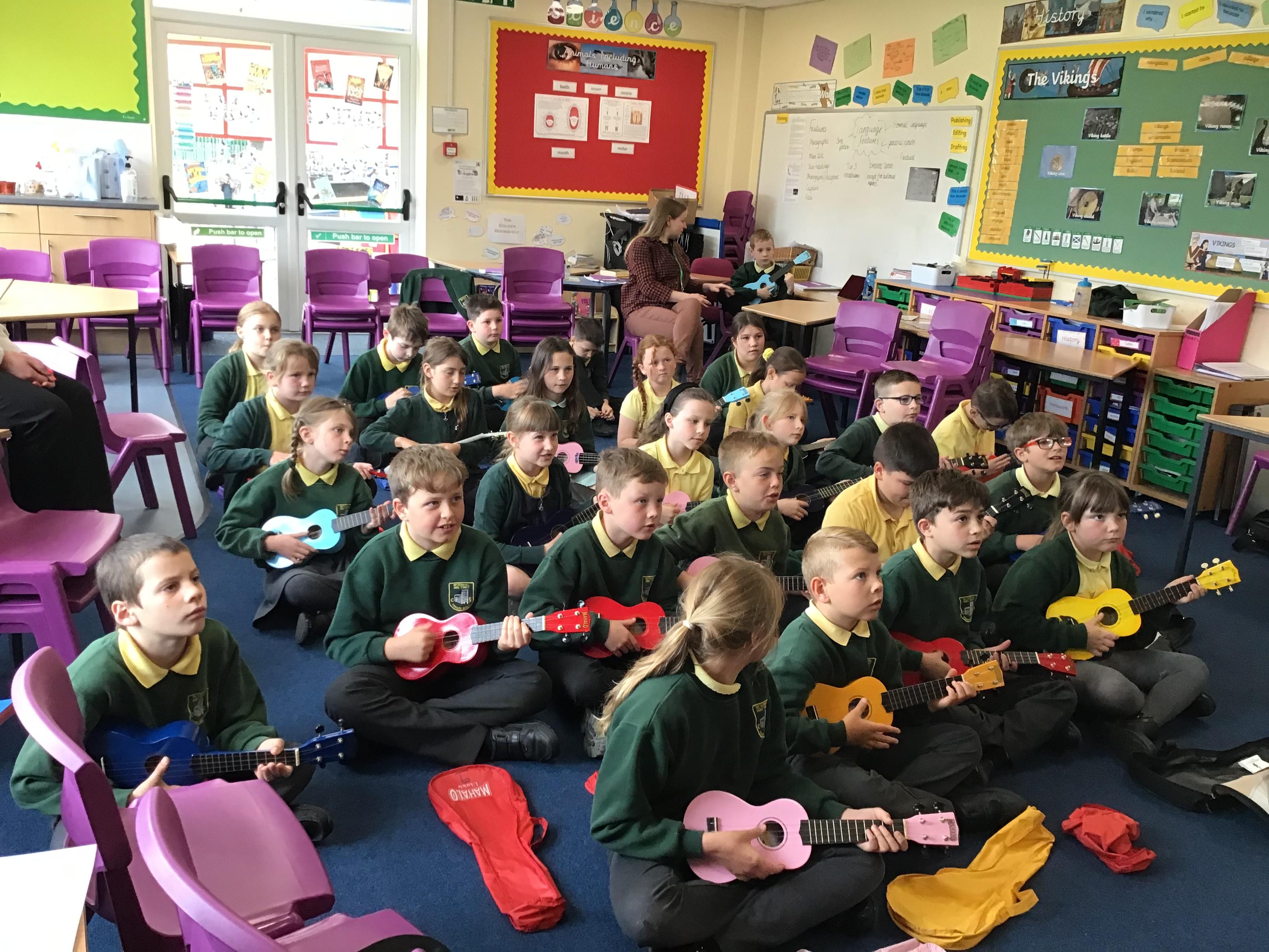 This term we are lucky to have Mr Wilson from Lincolnshire Music Service teaching us how to play a ukulele. In our first. Lesson we learnt about beats and rhythms. We then learnt how to hold our ukulele and we had a go at playing some chords. We were really good even though most of us had never played one before.