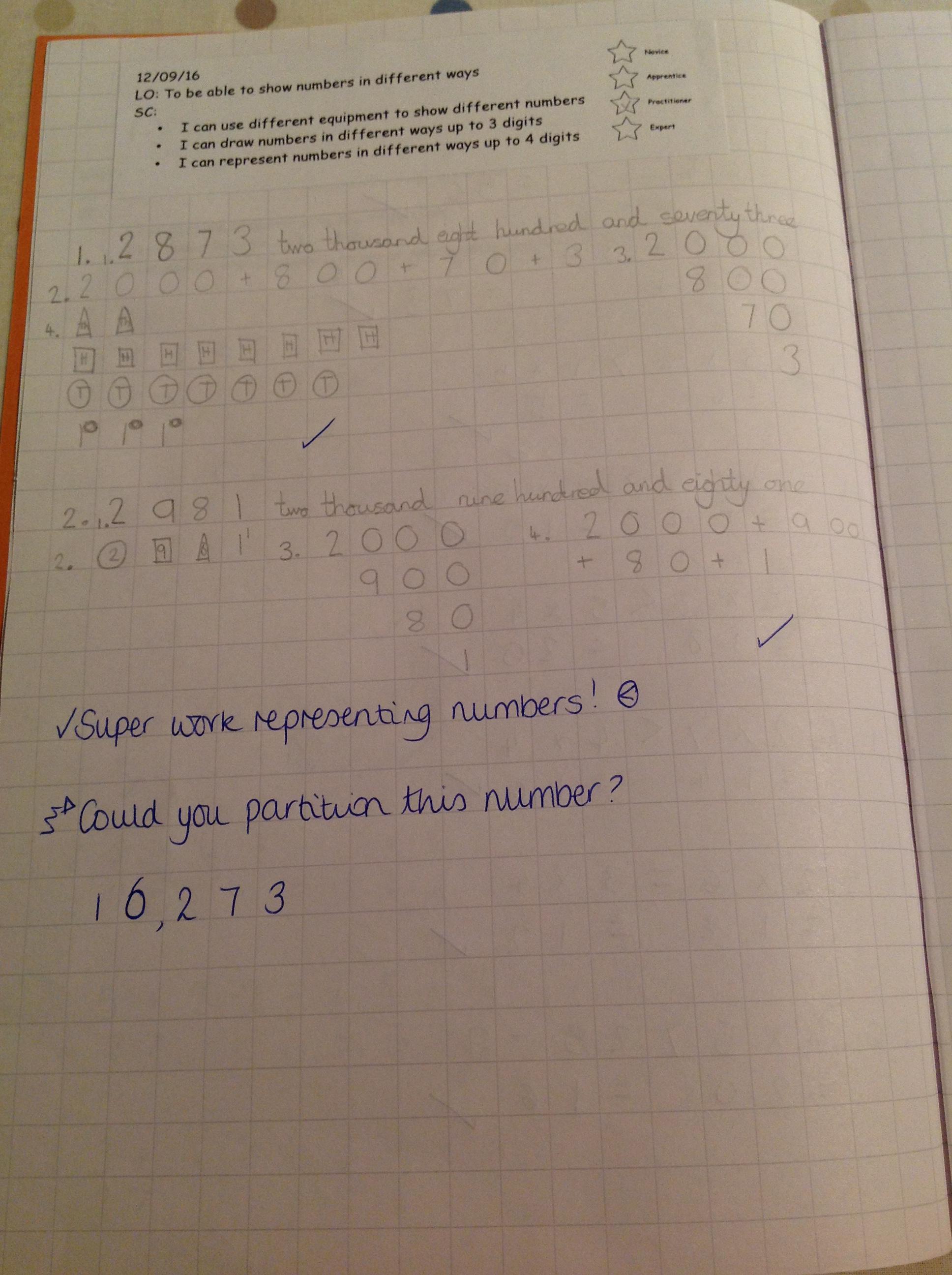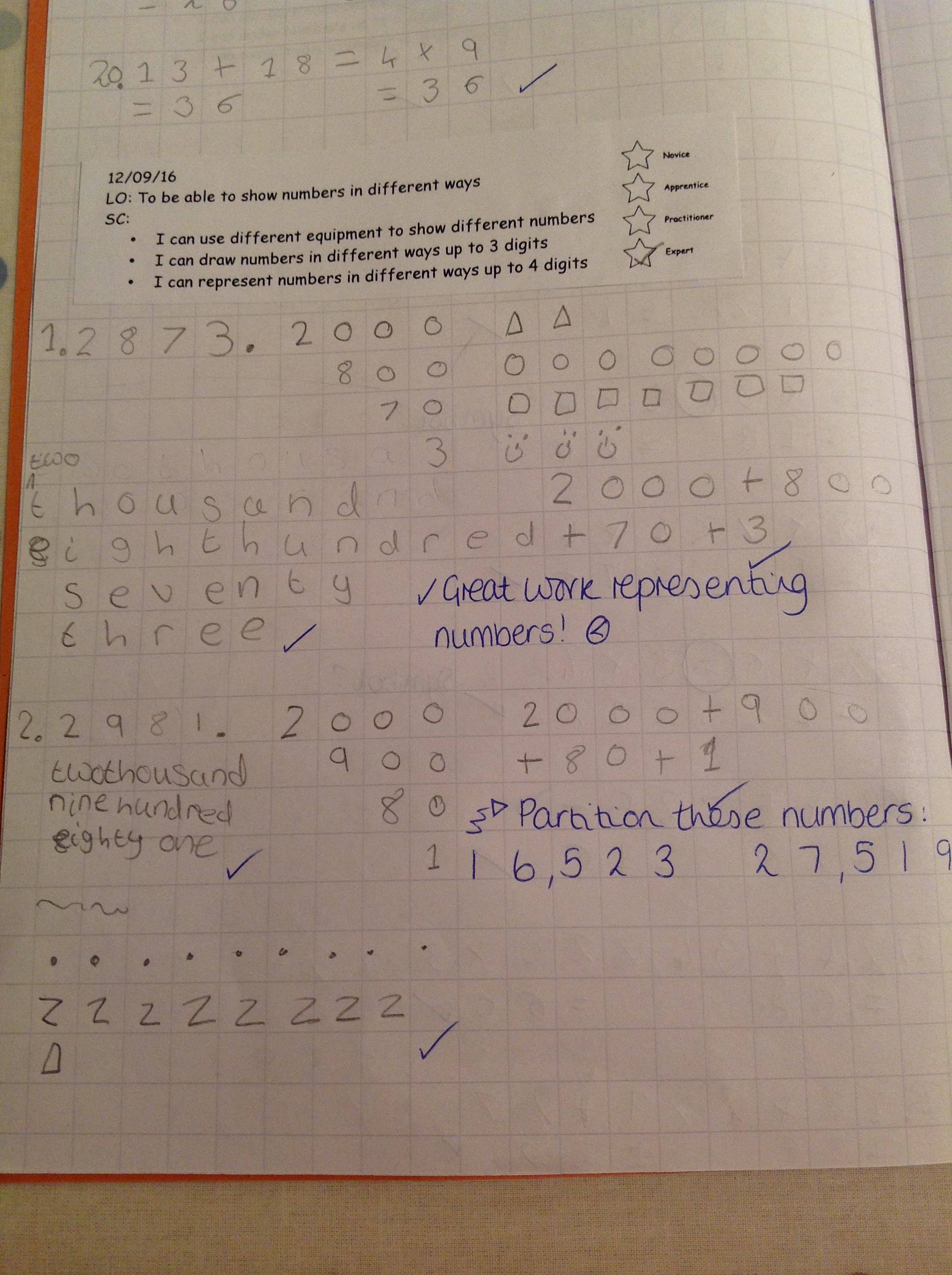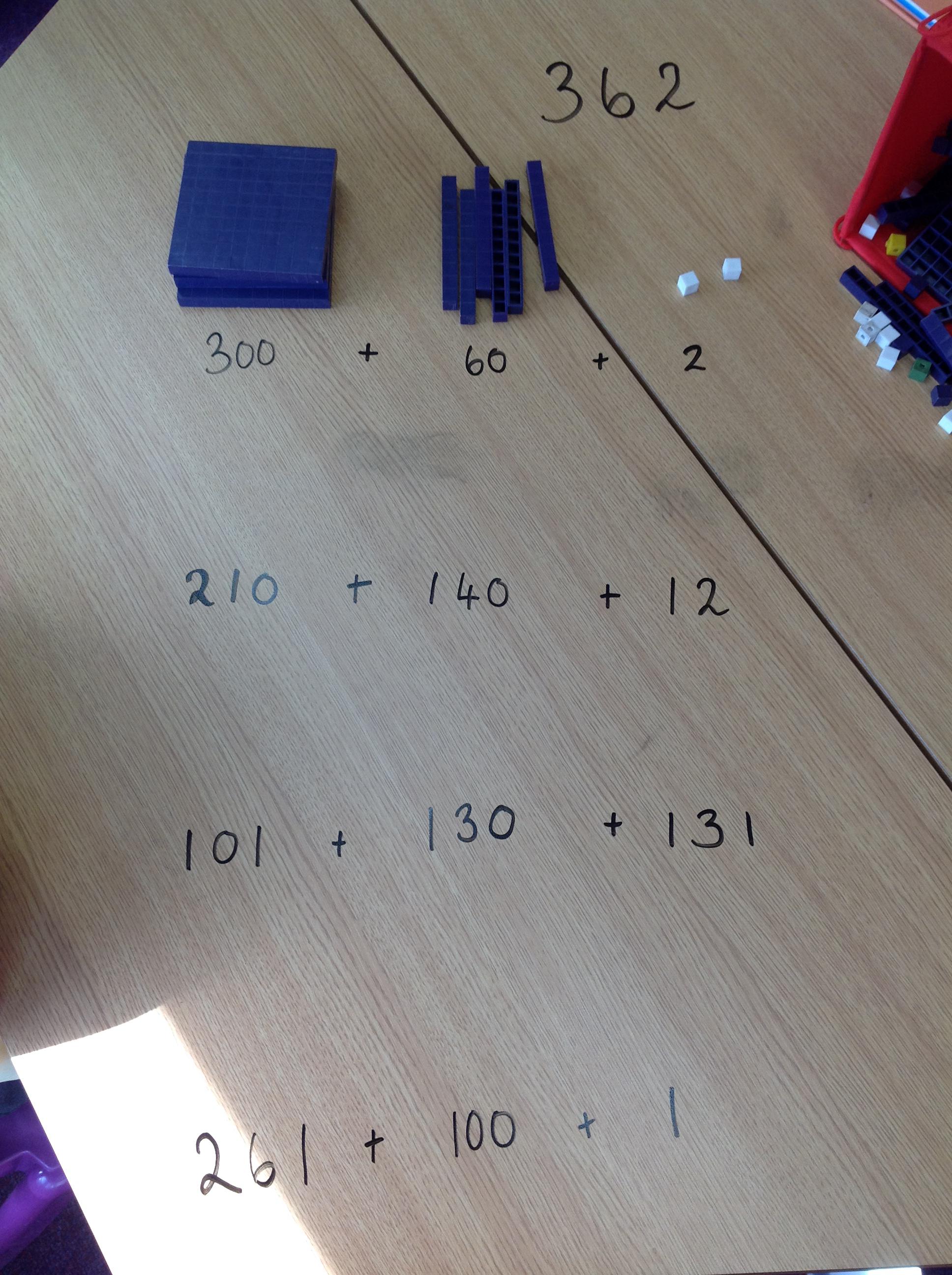 We've been partitioning numbers and thinking of different ways to partition 3 and 4 digit numbers. We tried more complex ways to partition numbers using base 10 resources to help us!
