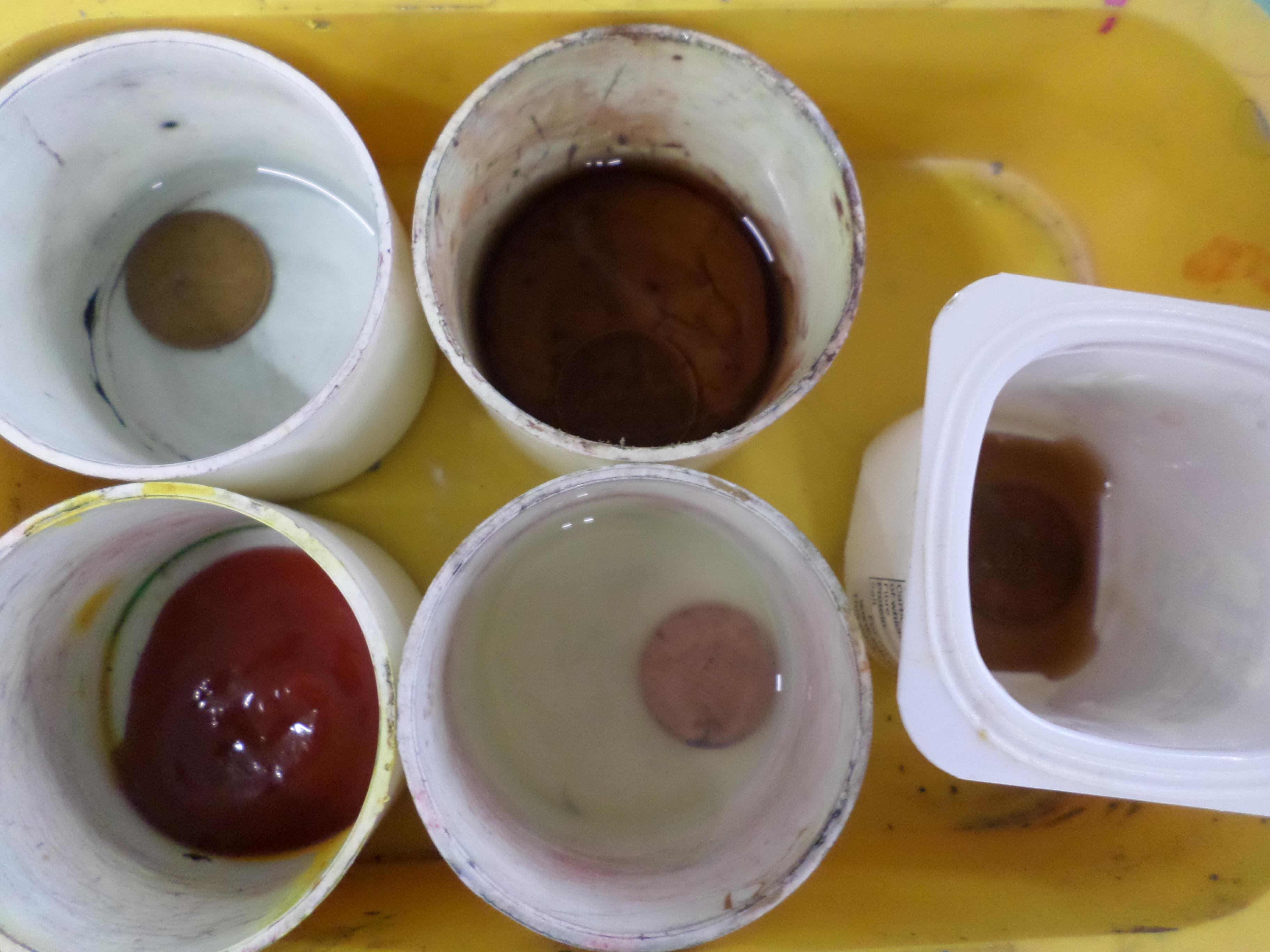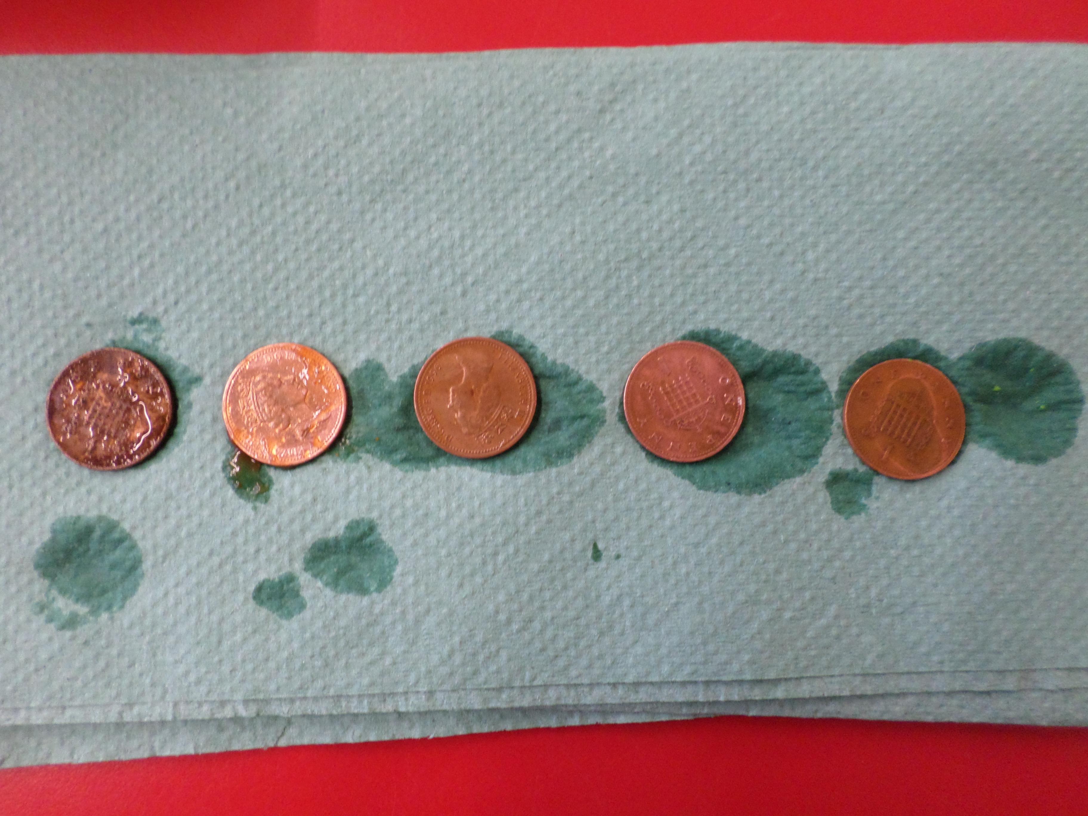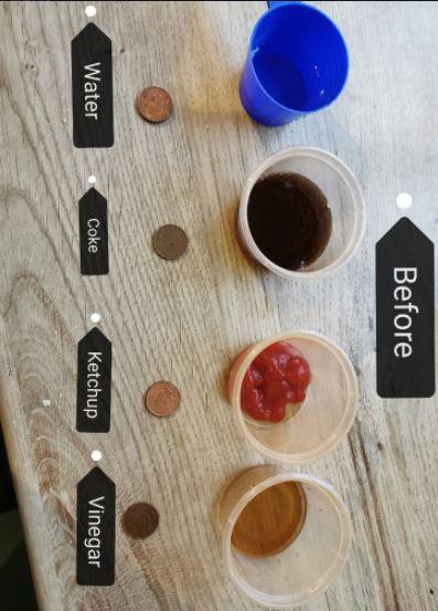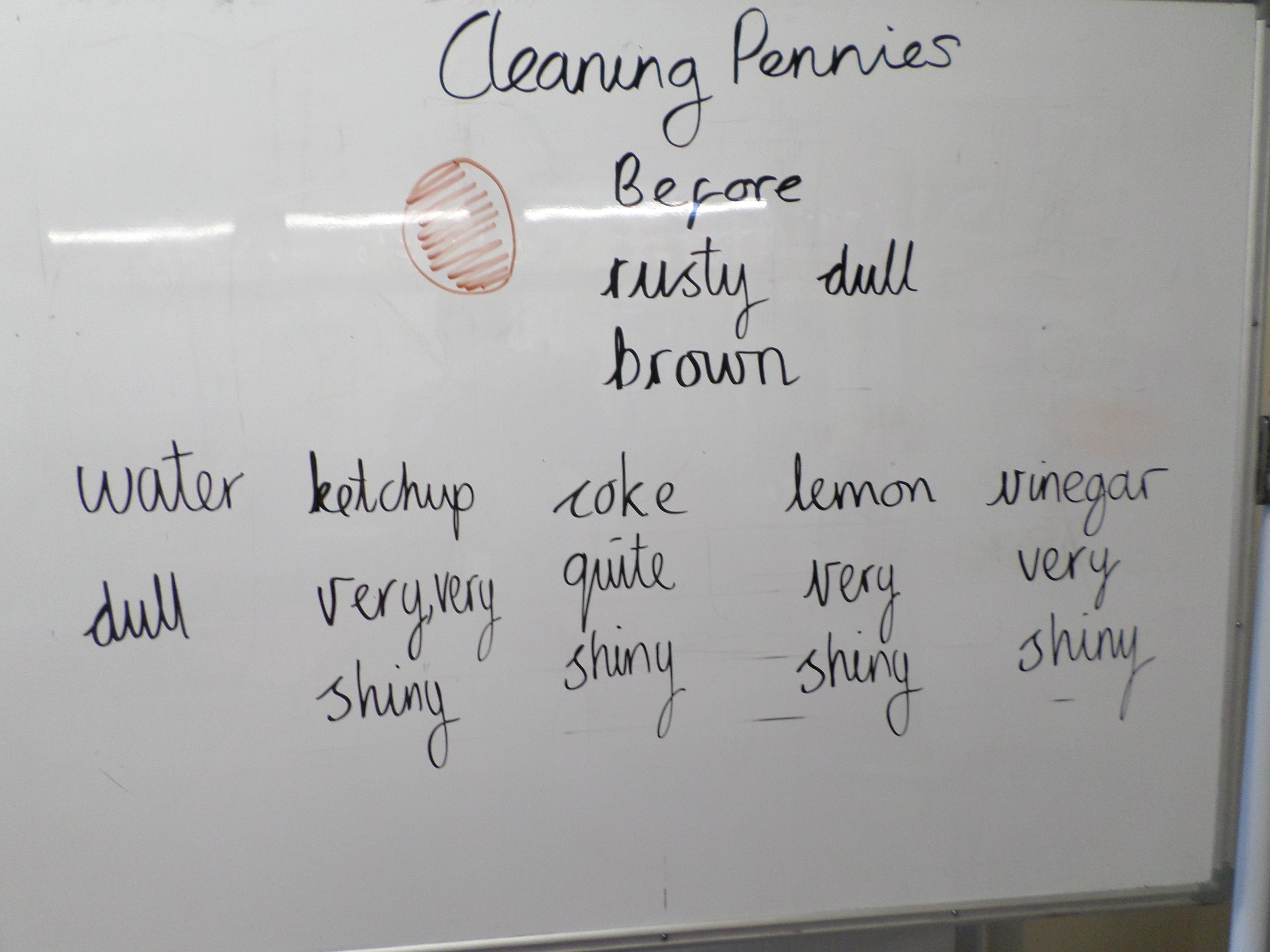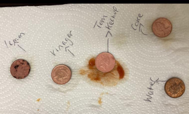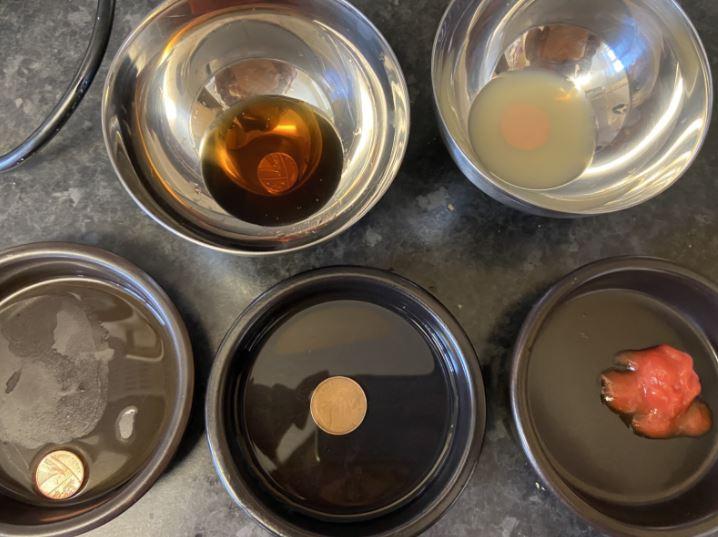 Dull, dirty pennies were soaked in water, ketchup, lemon juice, vinegar and coke. When they were removed, the results were quite surprising. No one had expected the ketchup to clean so well!