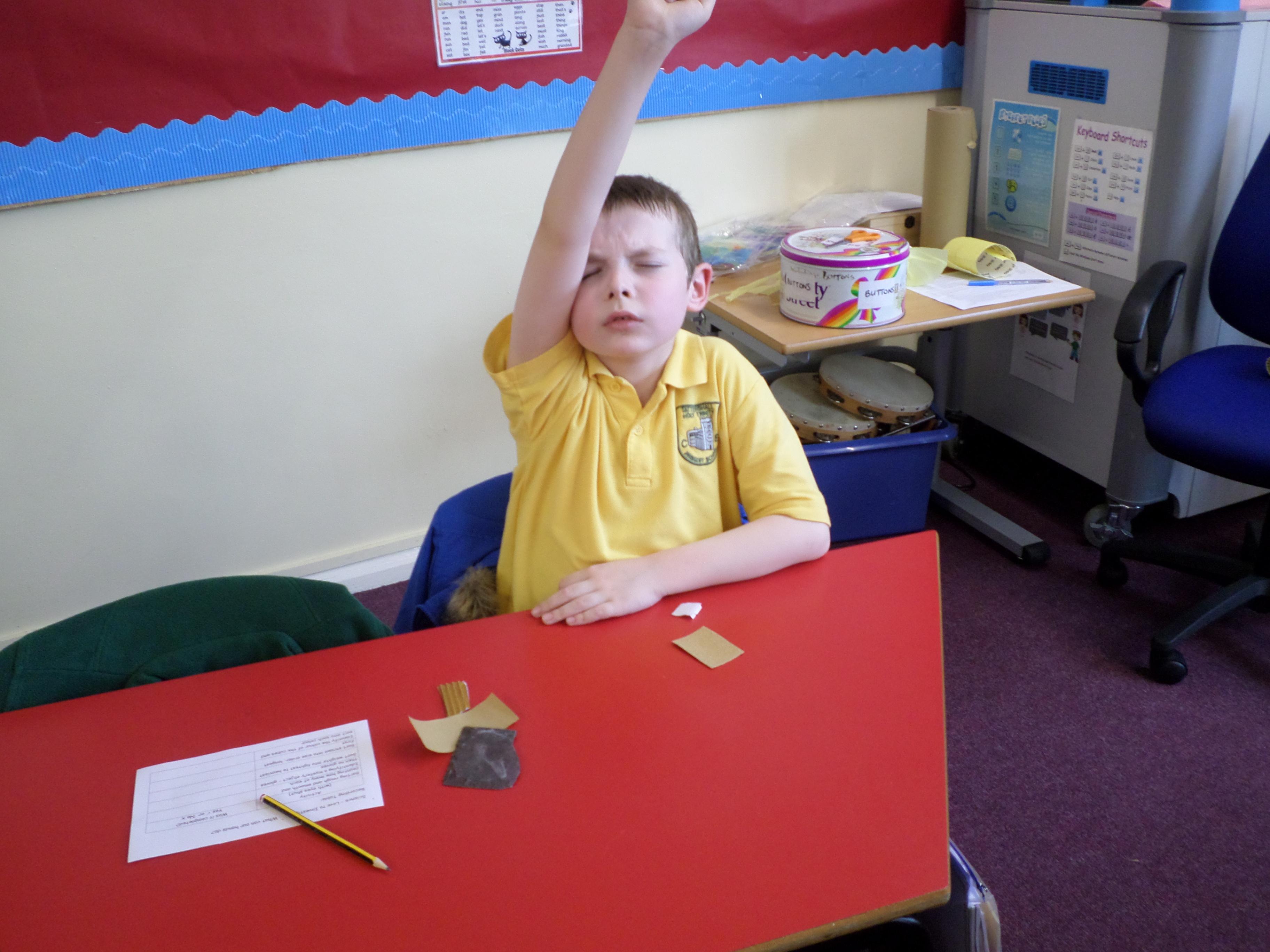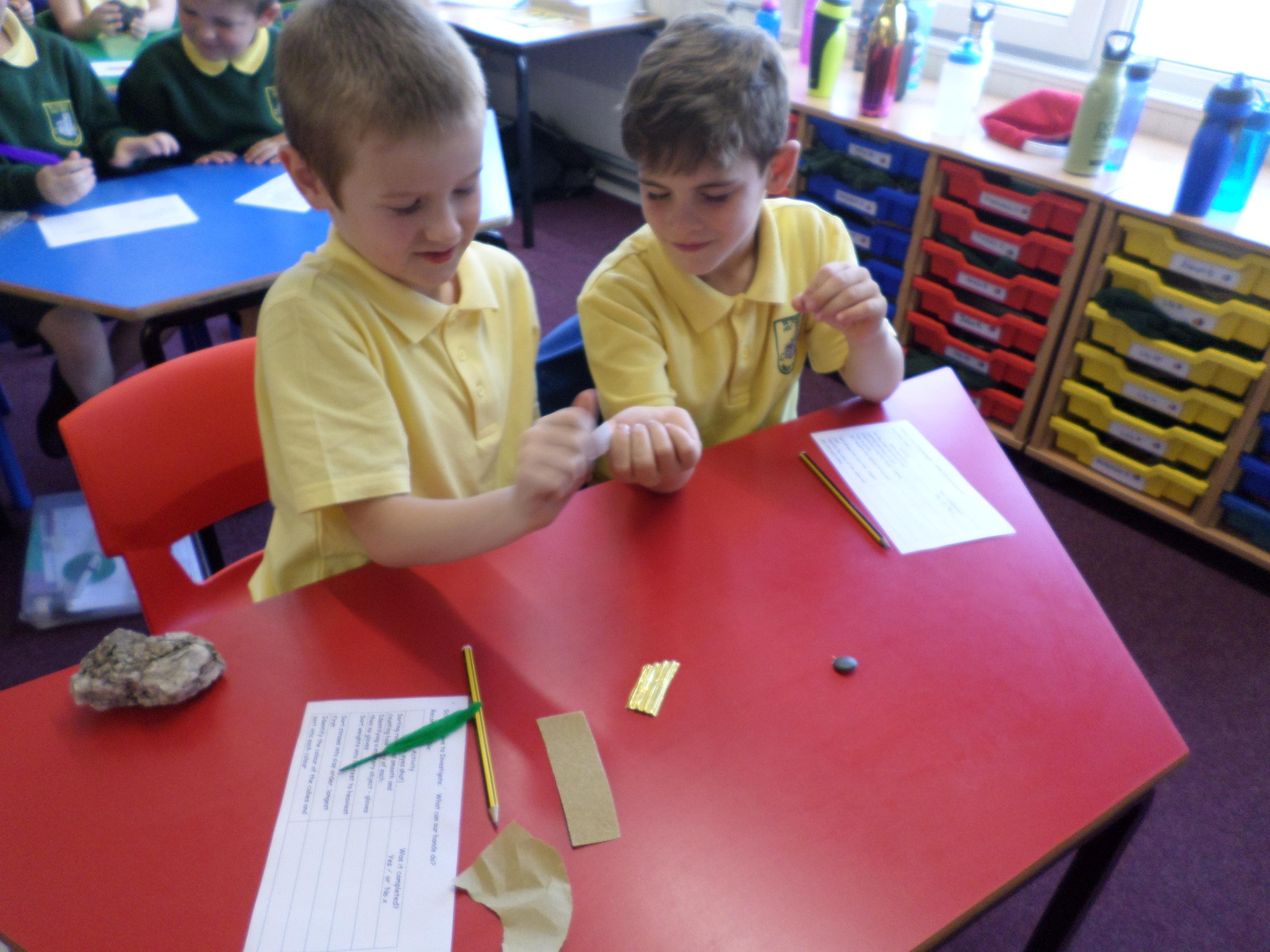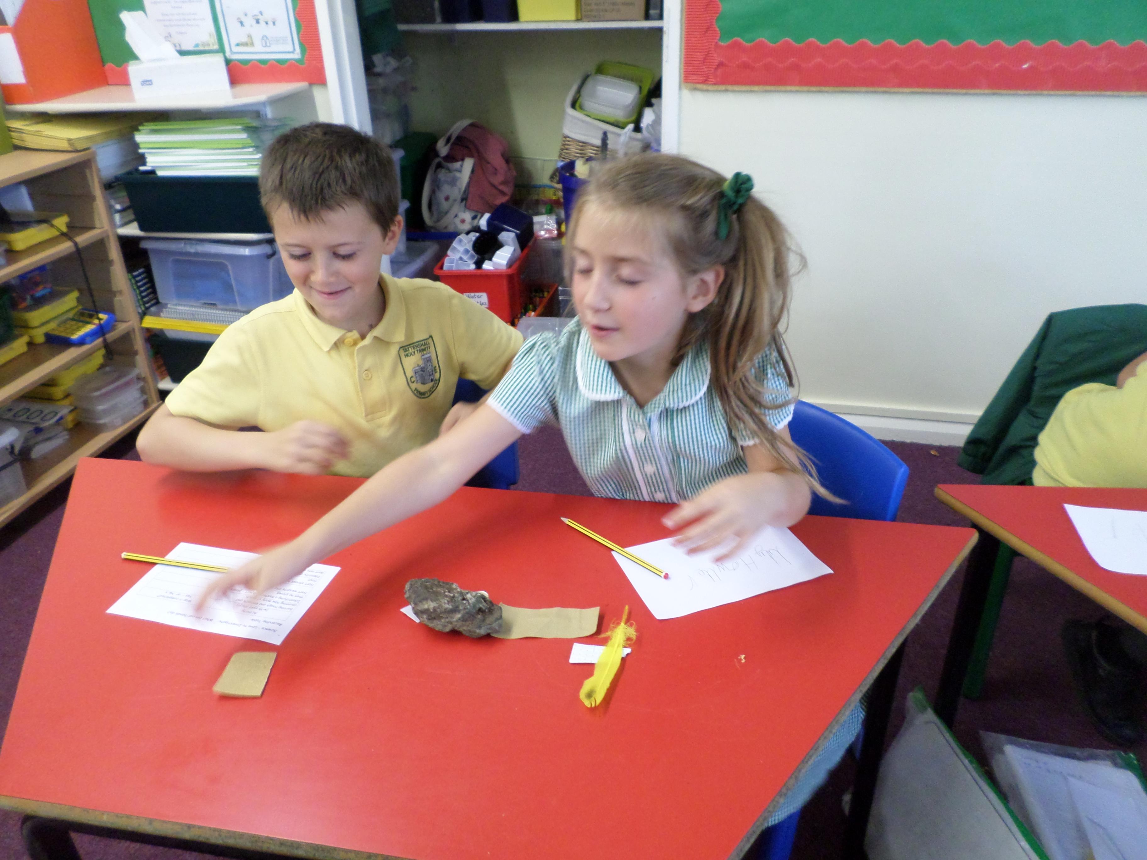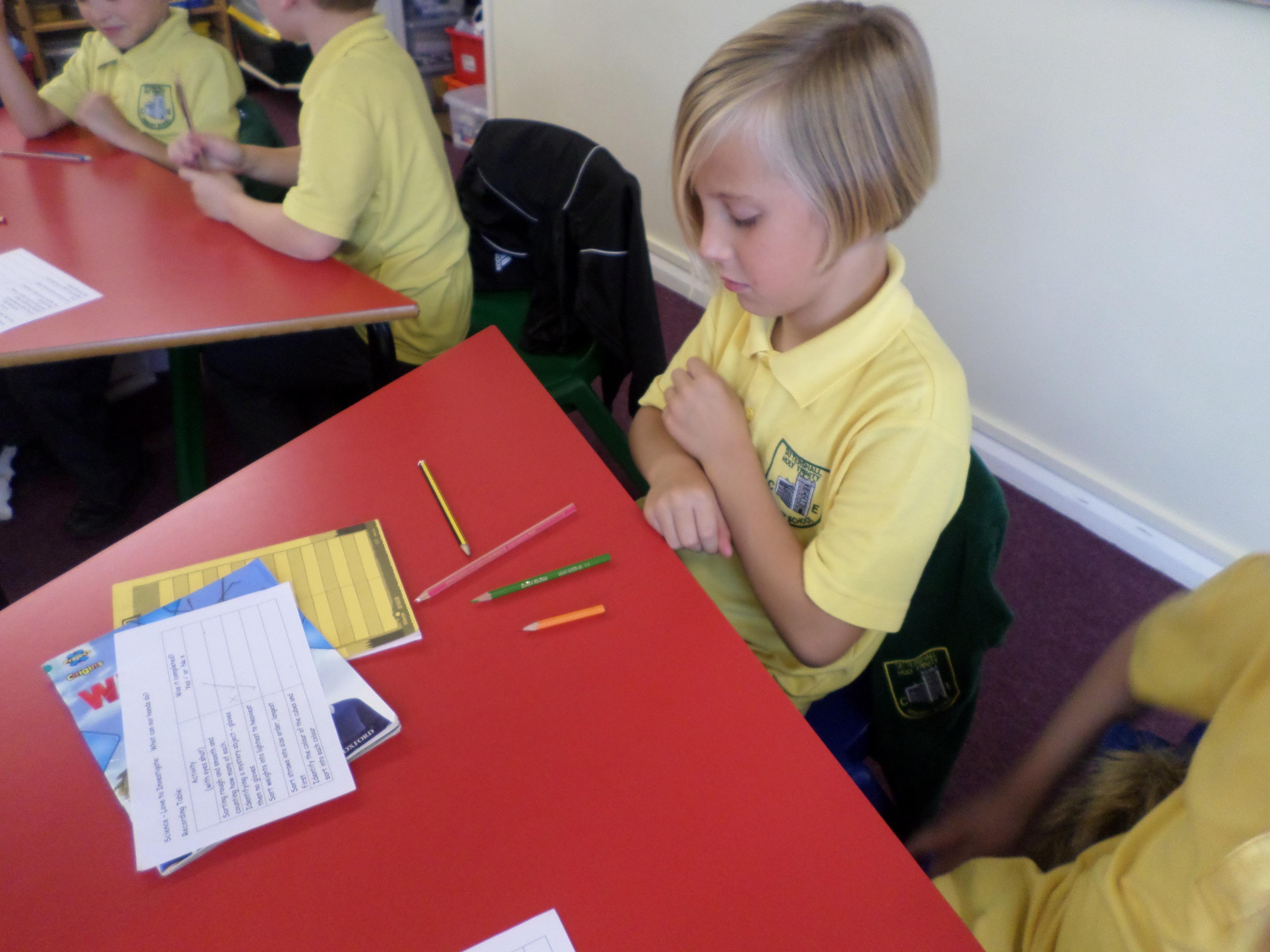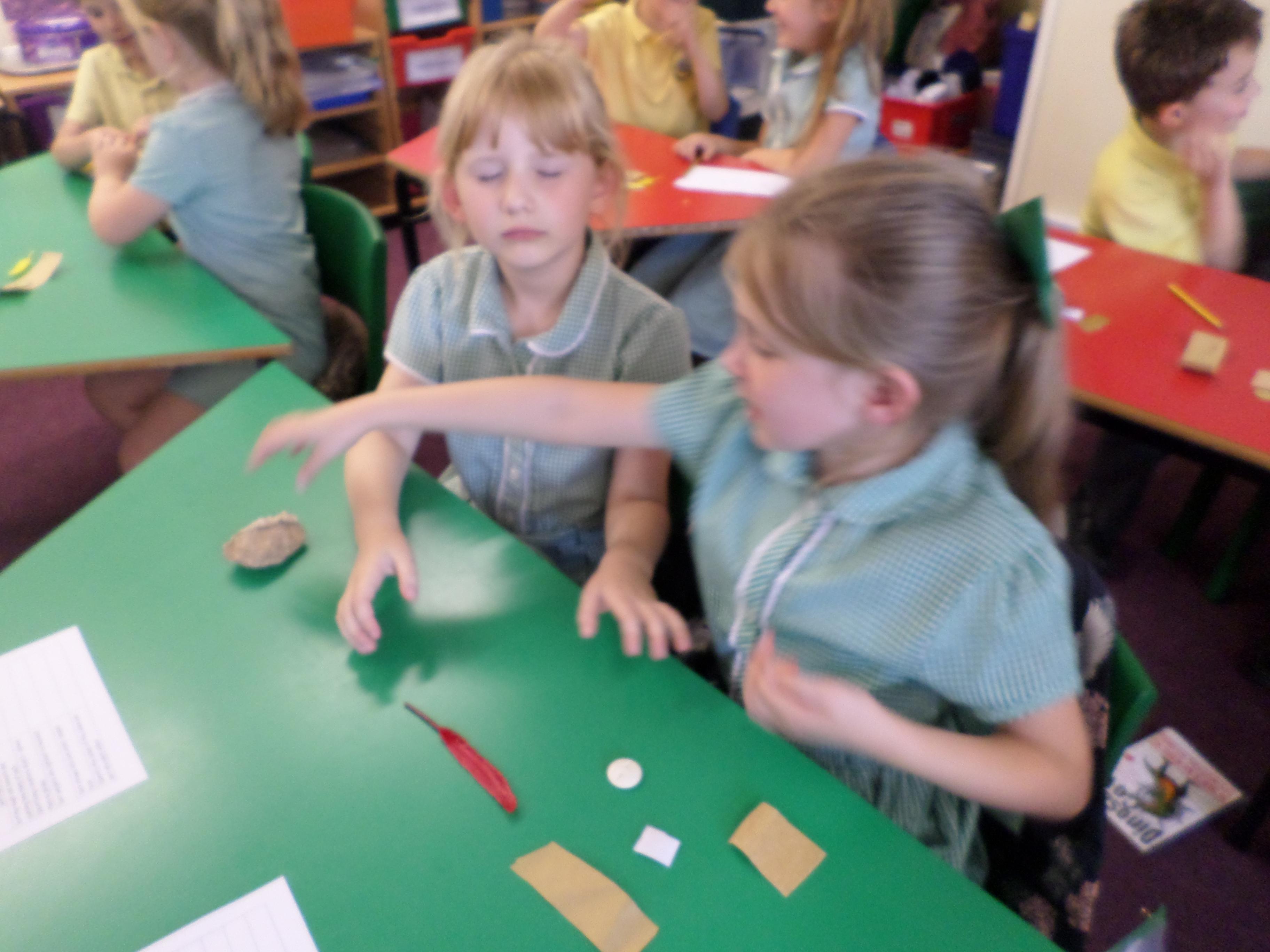 Oak Class pupils investigated what their hands could do by using their sense of touch, without their sense of sight. They found they could sort rough and smooth, count a number of objects, order things by weight or length but they could not identify the colour of an object. Although some were able to guess a colour correctly!!