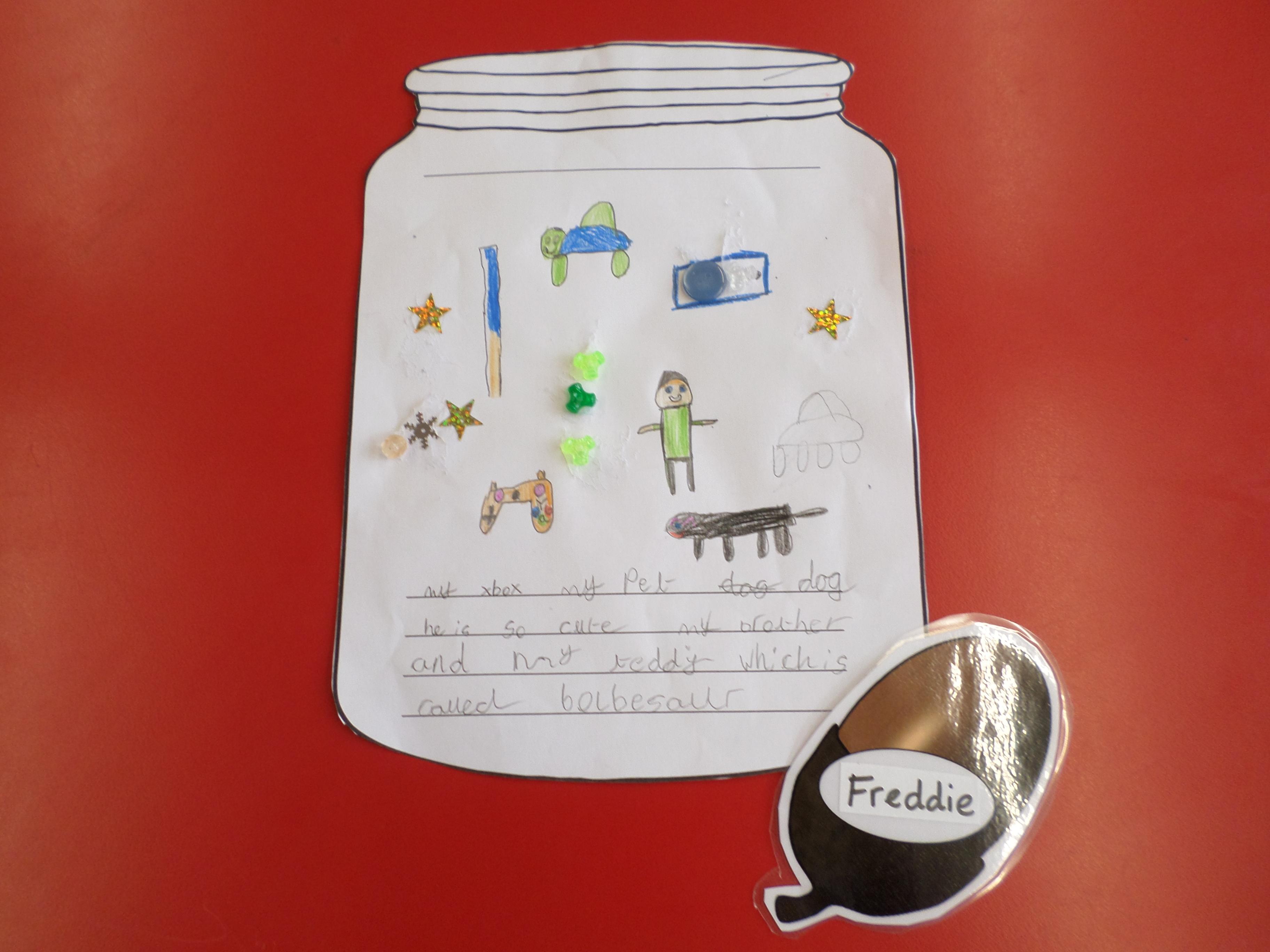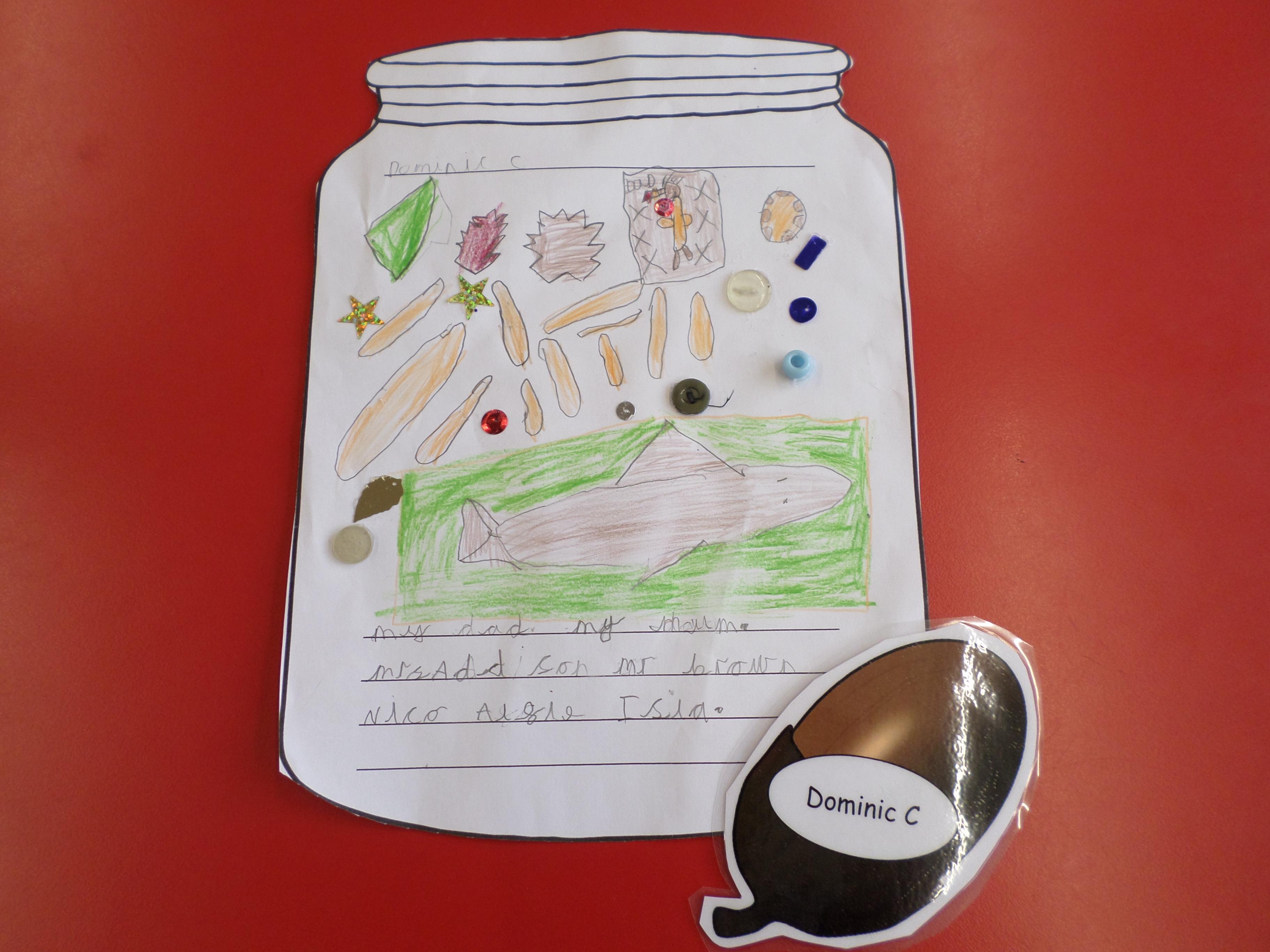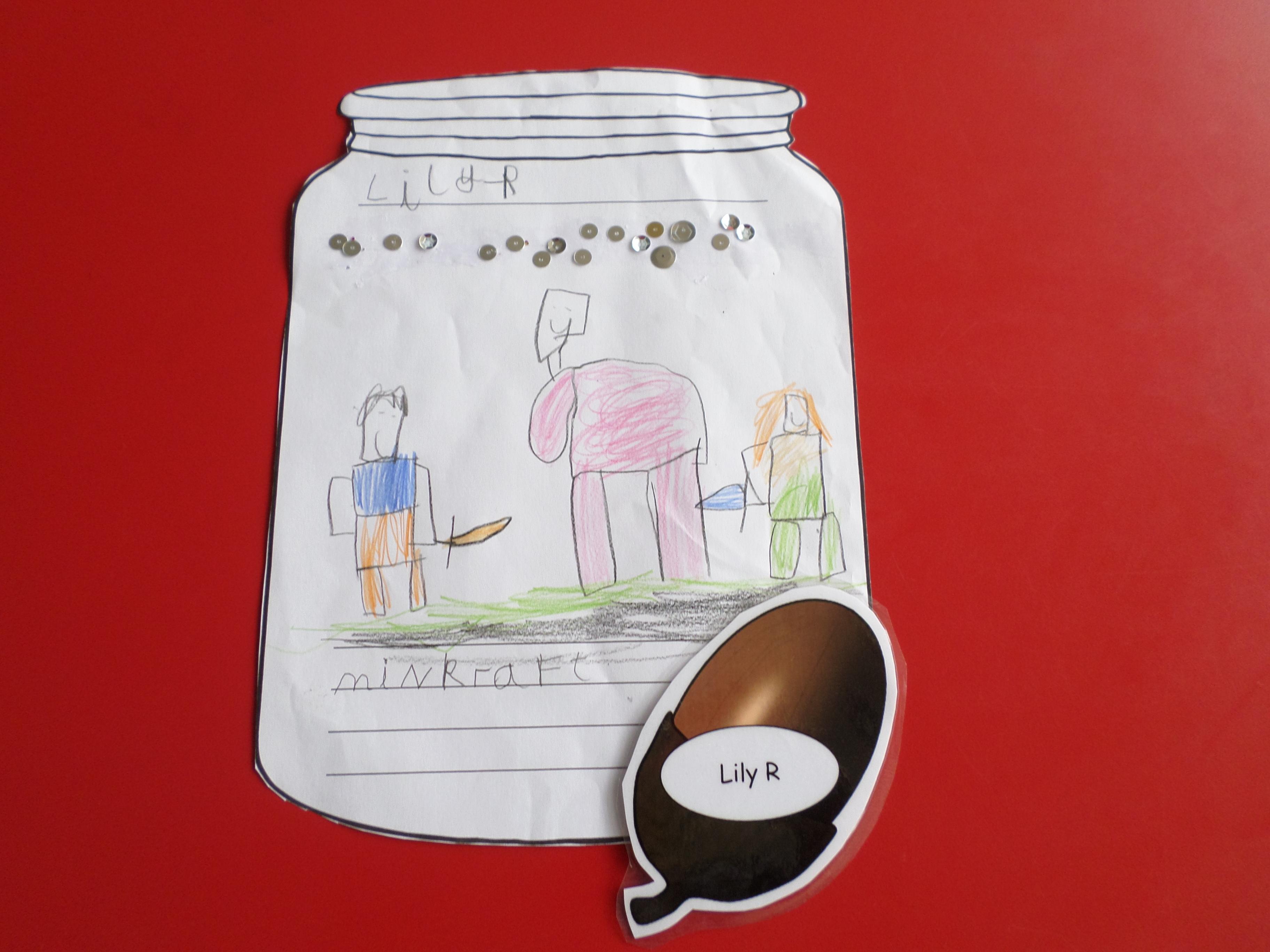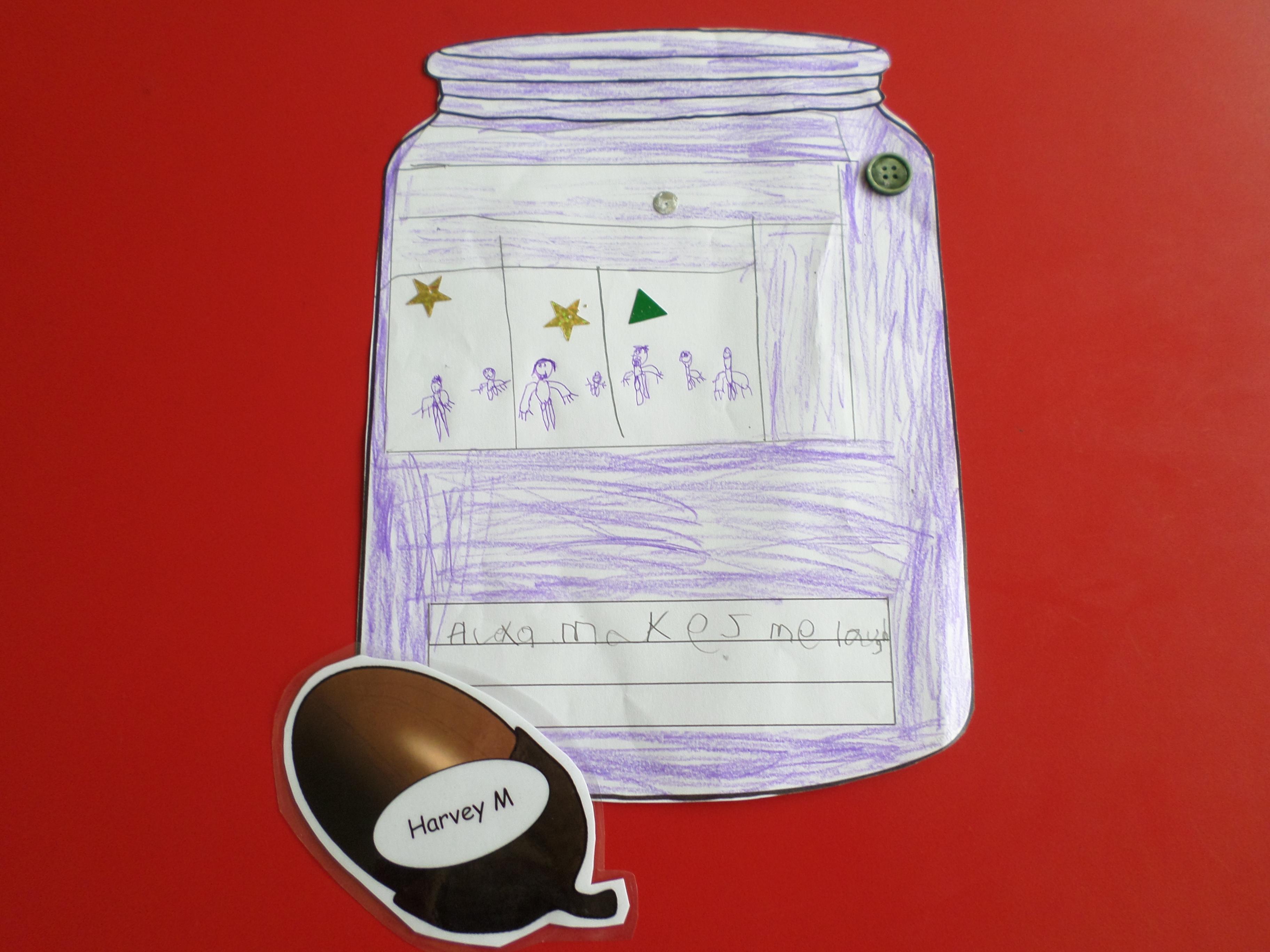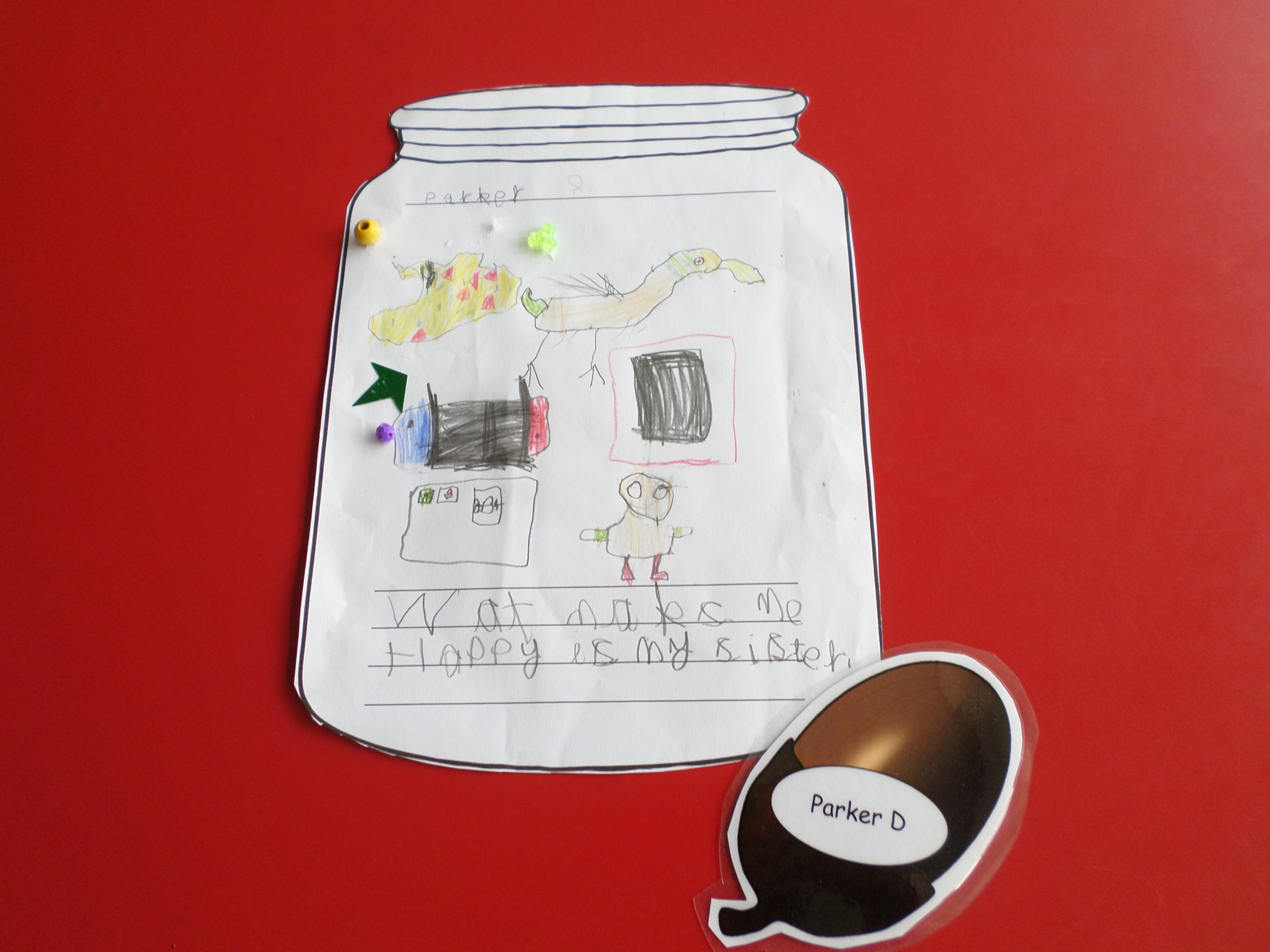 We thought of things that make us happy. Instead of putting them in an actual jar, we drew them in a jar. Please see the pictures below. What a lot of different things make us happy!