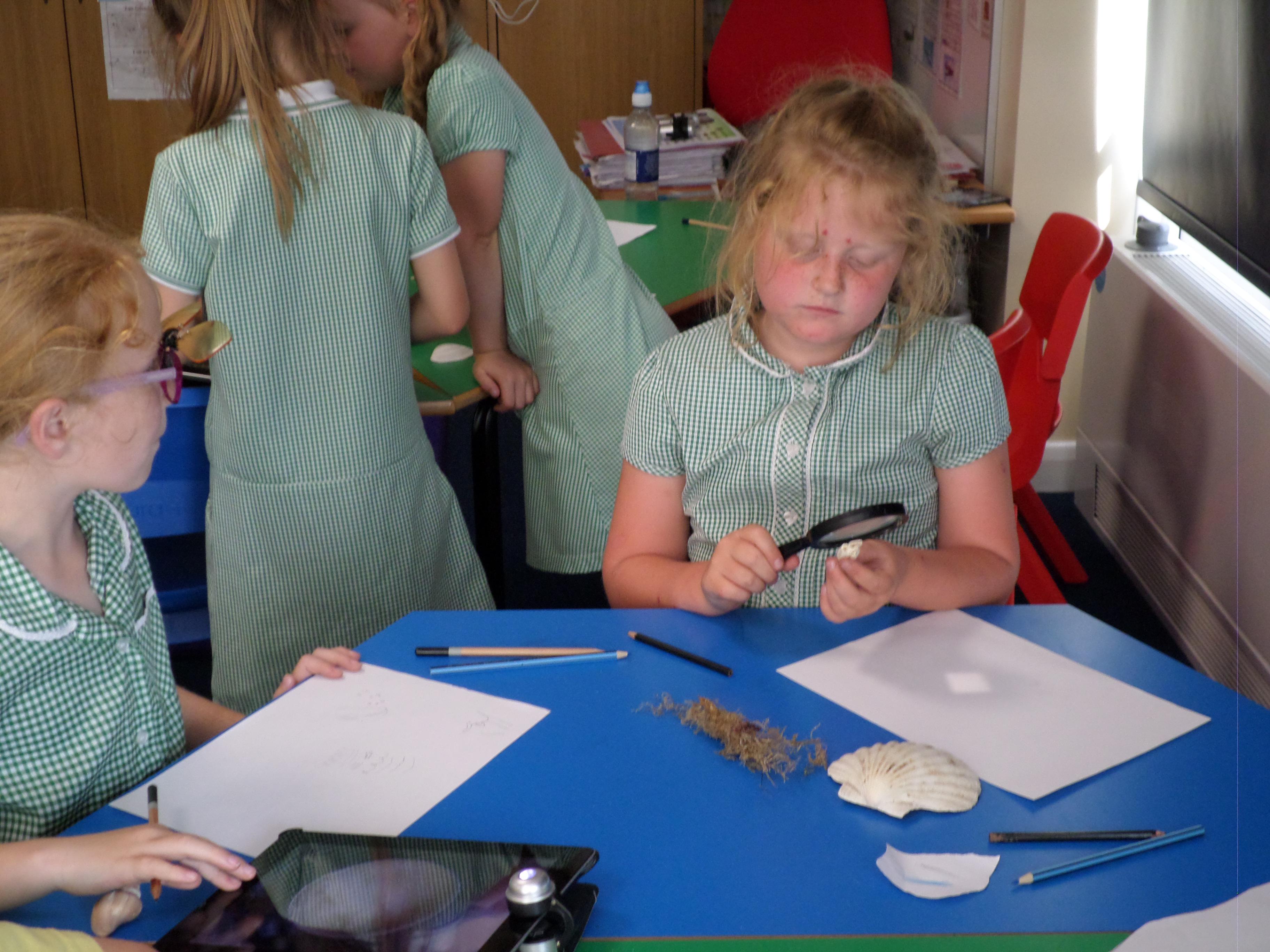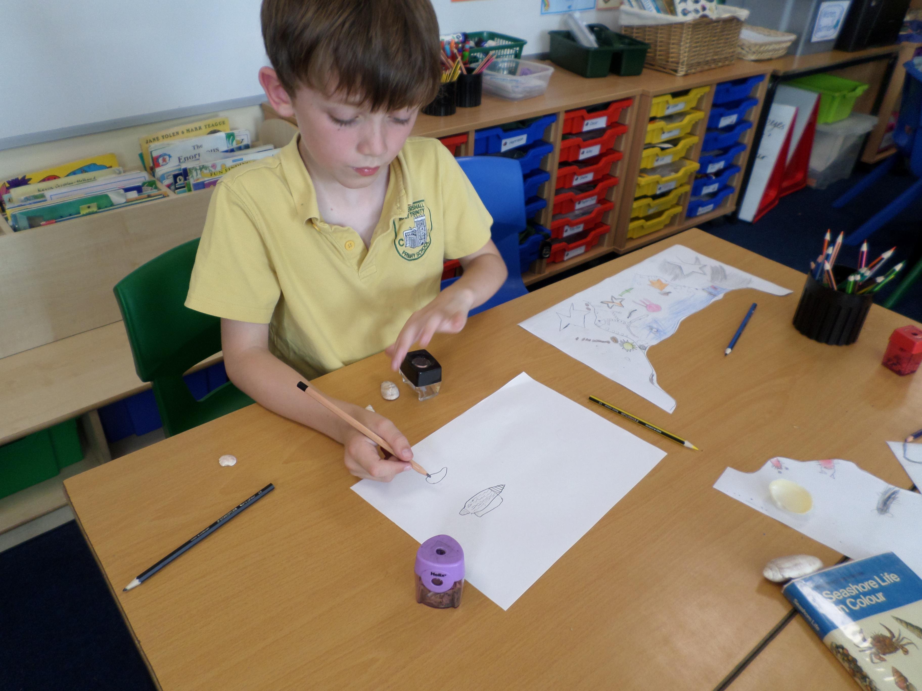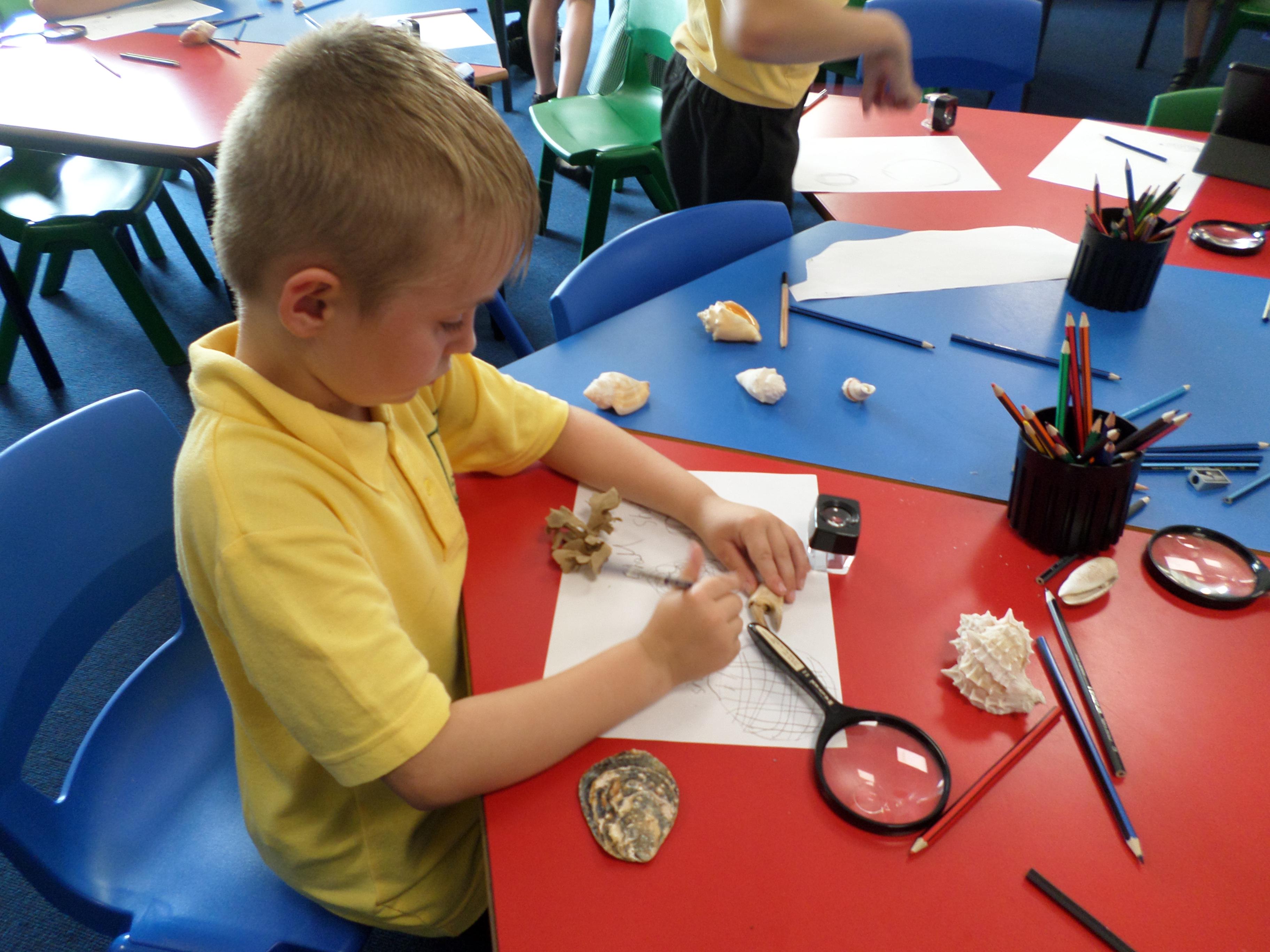 Oak Class have been studying the rock pool habitat and the creatures that live in it. We have been learning how the different types of animal have adapted to life in this harsh environment. We drew our own cross section of a rock pool to show the variety of plant and animal life. Then we sketched close ups of different shells, seaweeds, starfish and other samples of beach combing using the magnifiers to show the range of textures and close up detail.
