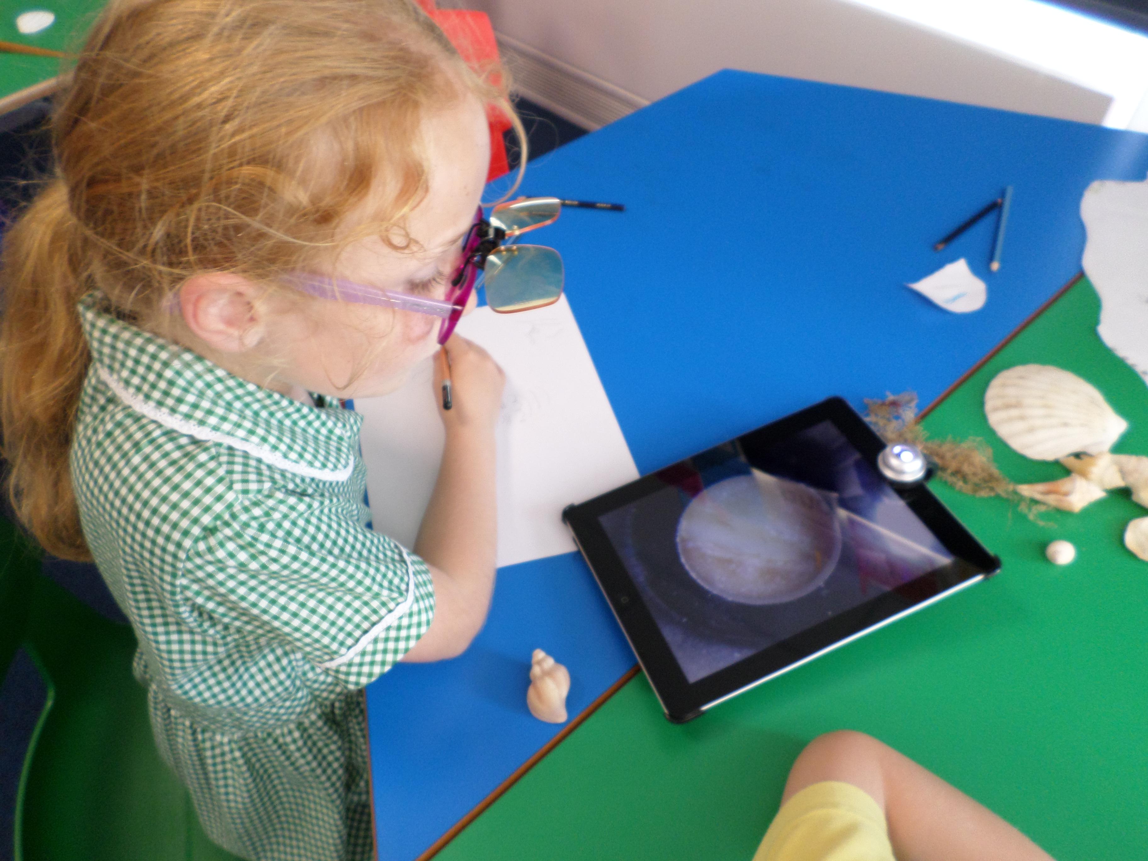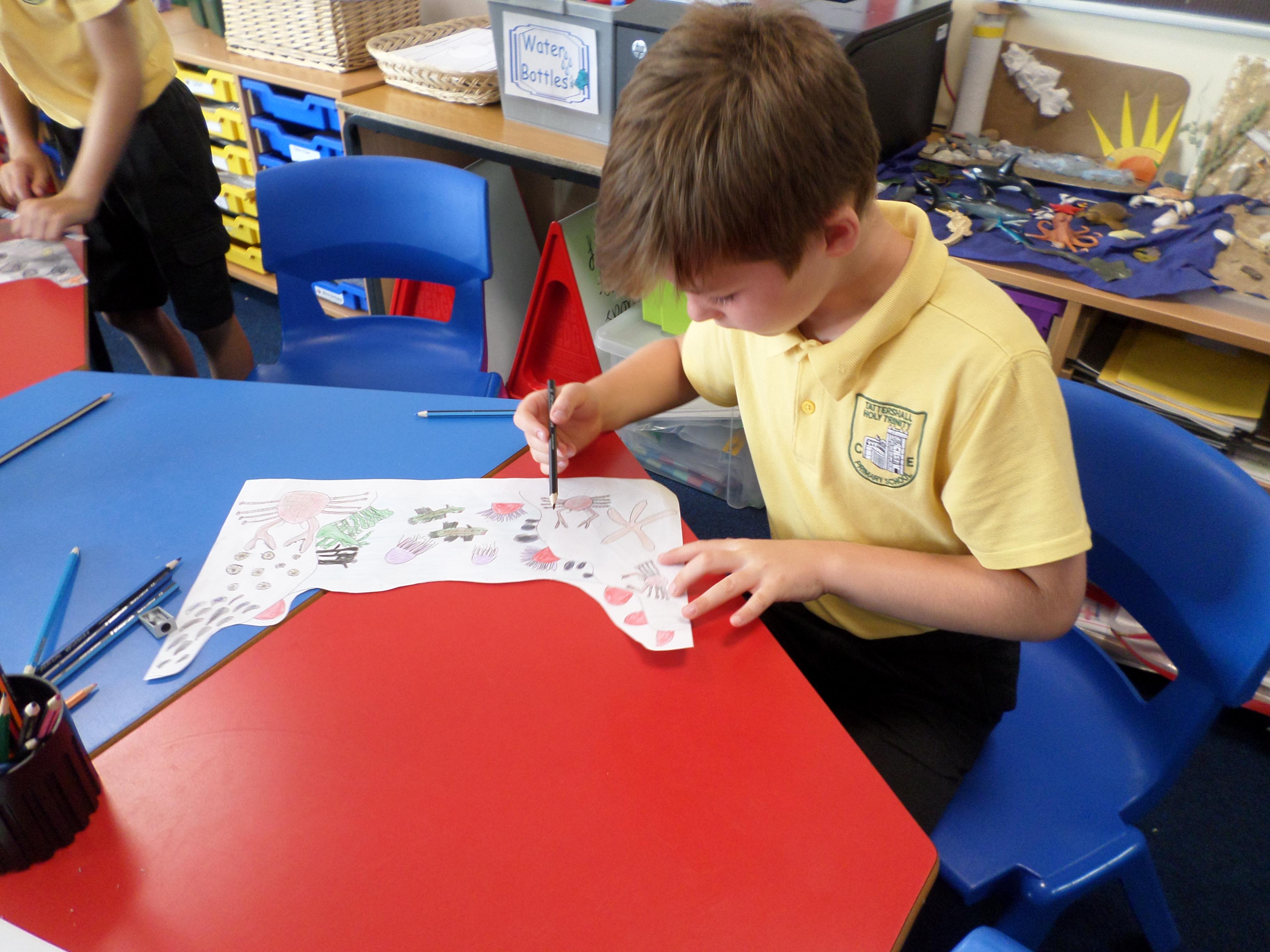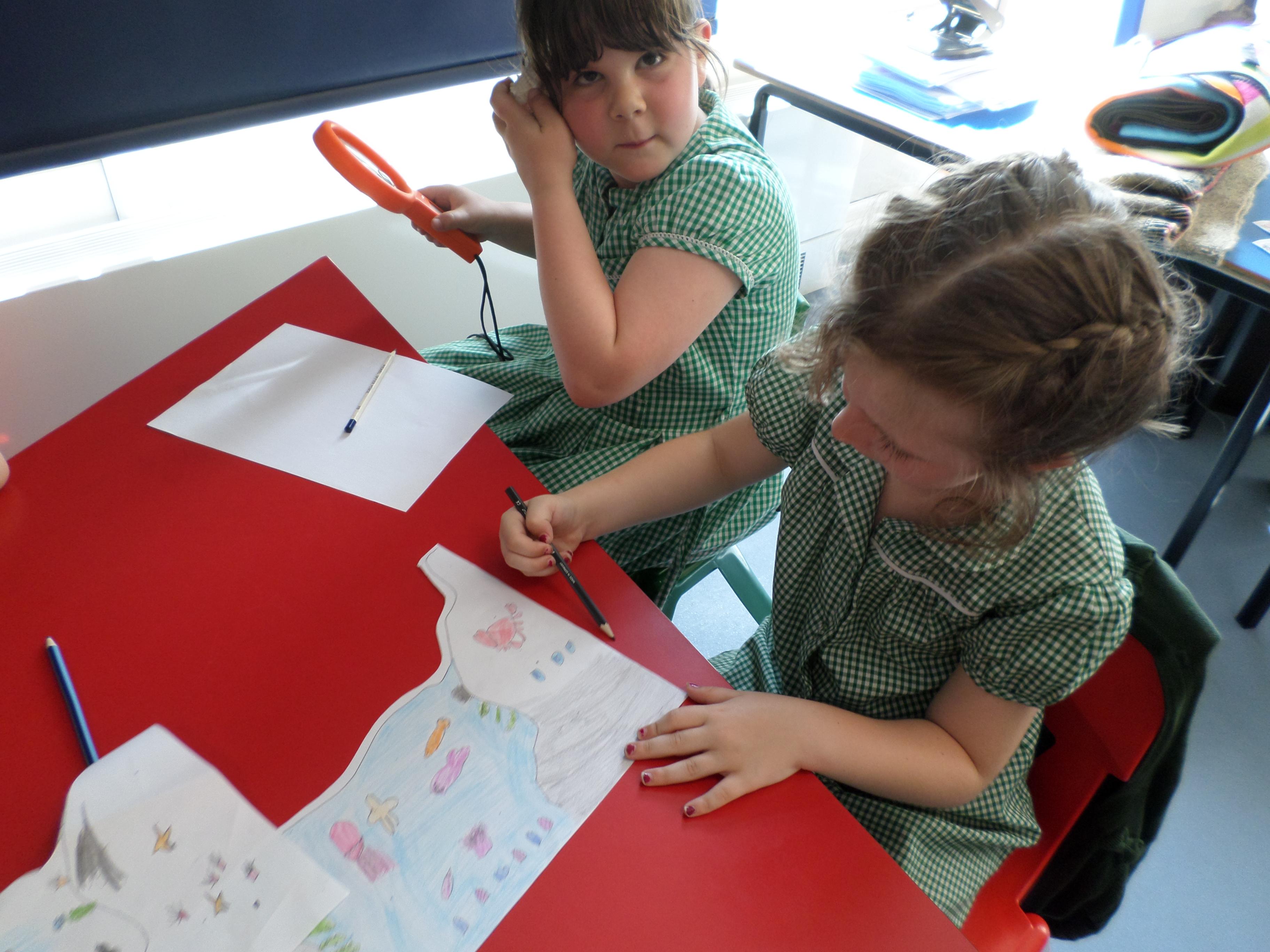 Oak Class have been studying the rock pool habitat and the creatures that live in it. We have been learning how the different types of animal have adapted to life in this harsh environment. We drew our own cross section of a rock pool to show the variety of plant and animal life. Then we sketched close ups of different shells, seaweeds, starfish and other samples of beach combing using the magnifiers to show the range of textures and close up detail.