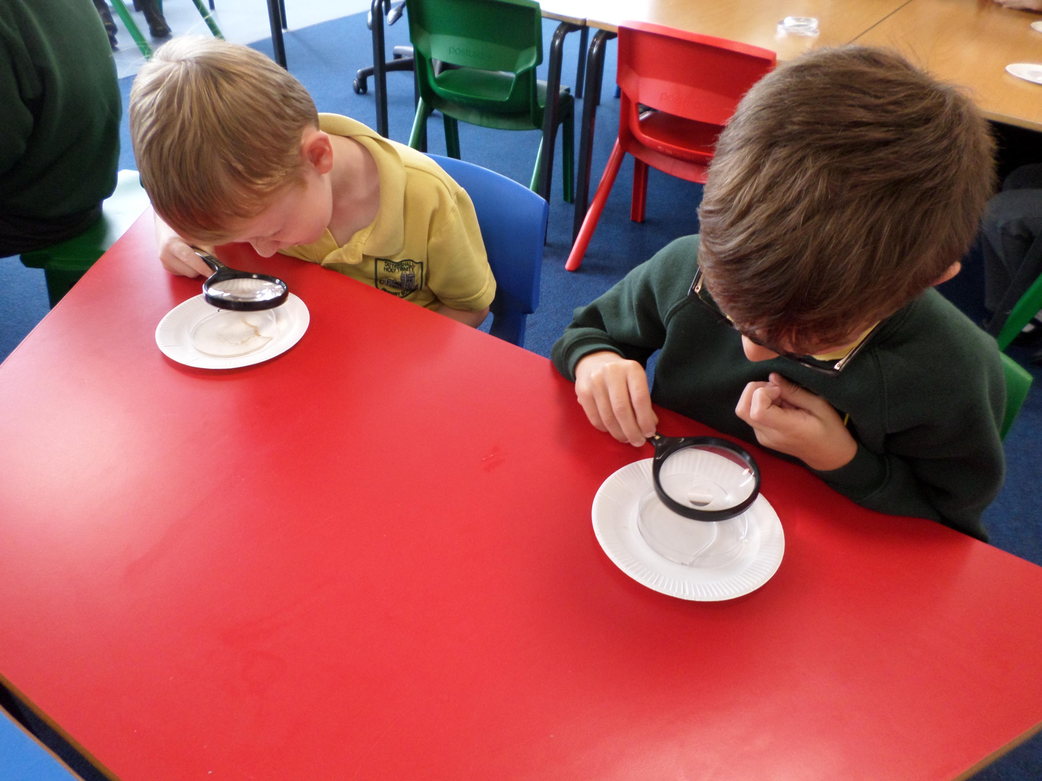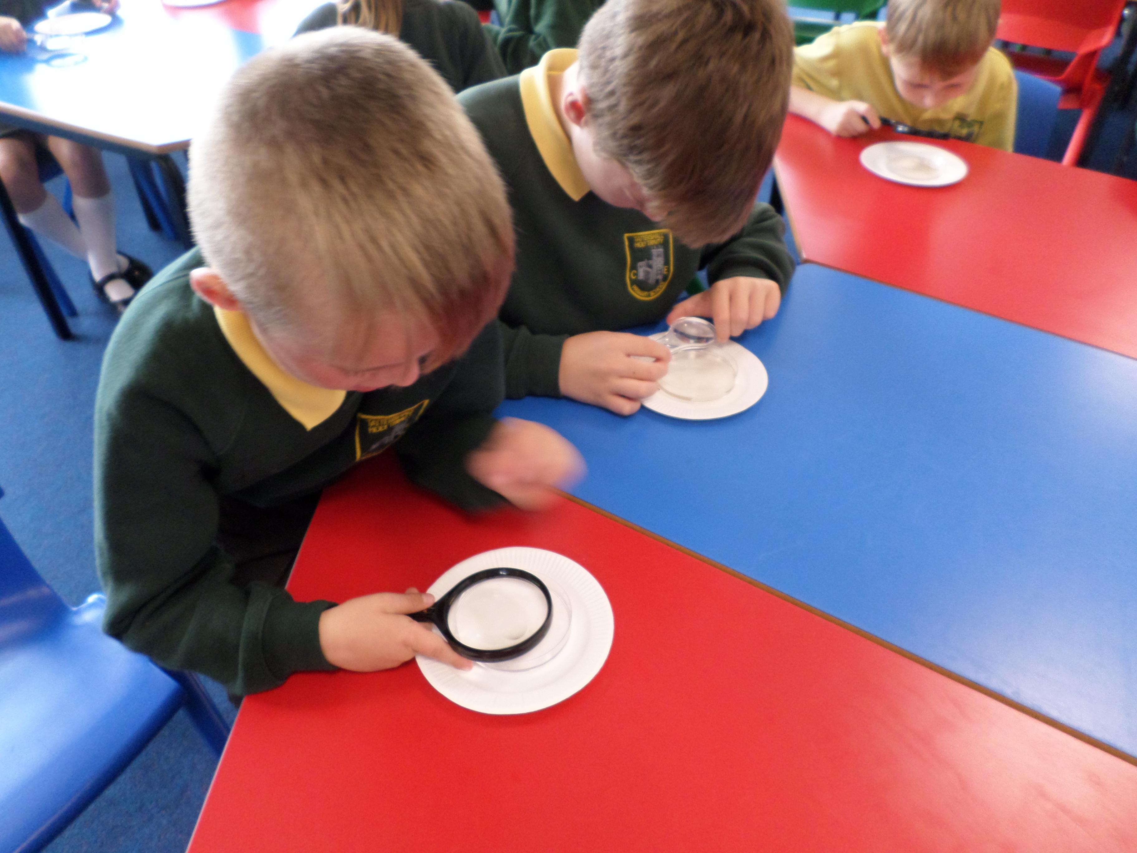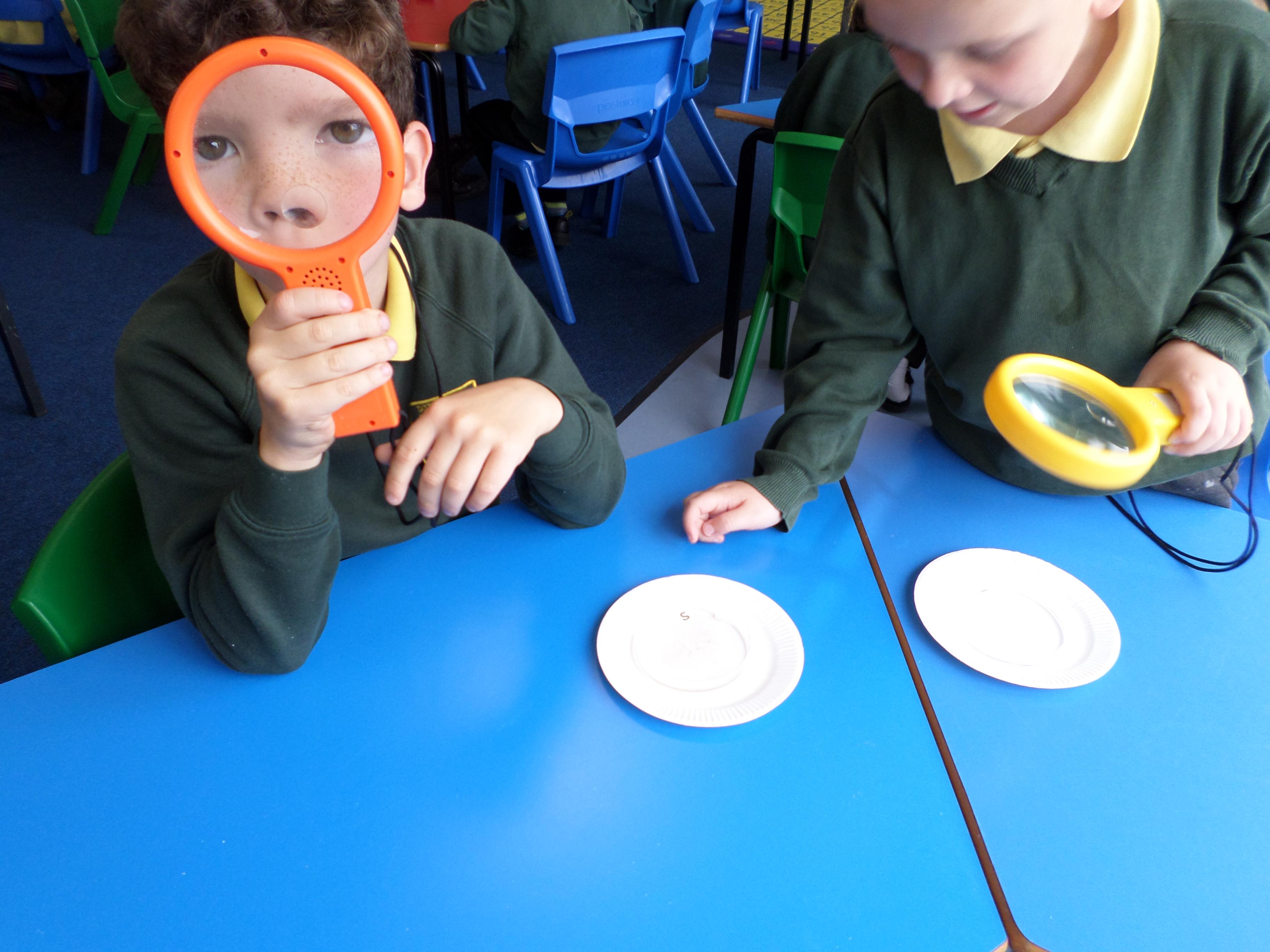Following our trip to Skegness we looked at the seawater that Mrs Addison braved the elements to collect. We compared it to tap water using magnifying glasses to look closely at samples of each in petri dishes. We also placed different types of material in jars of sea water which we will investigate over time to see the affect it has. We will shake the jars to simulate the objects being washed by the waves to see which material will degrade the most.
