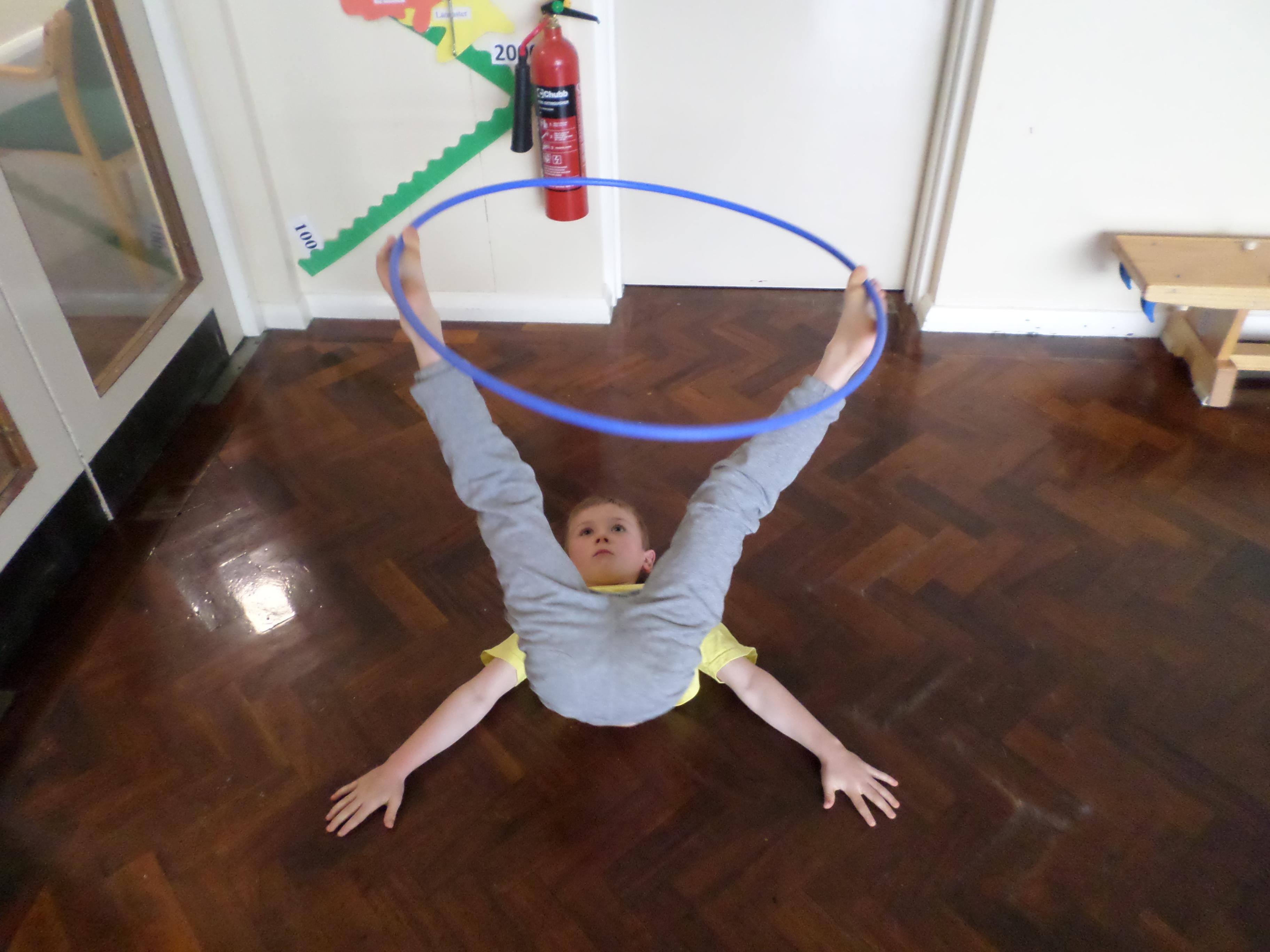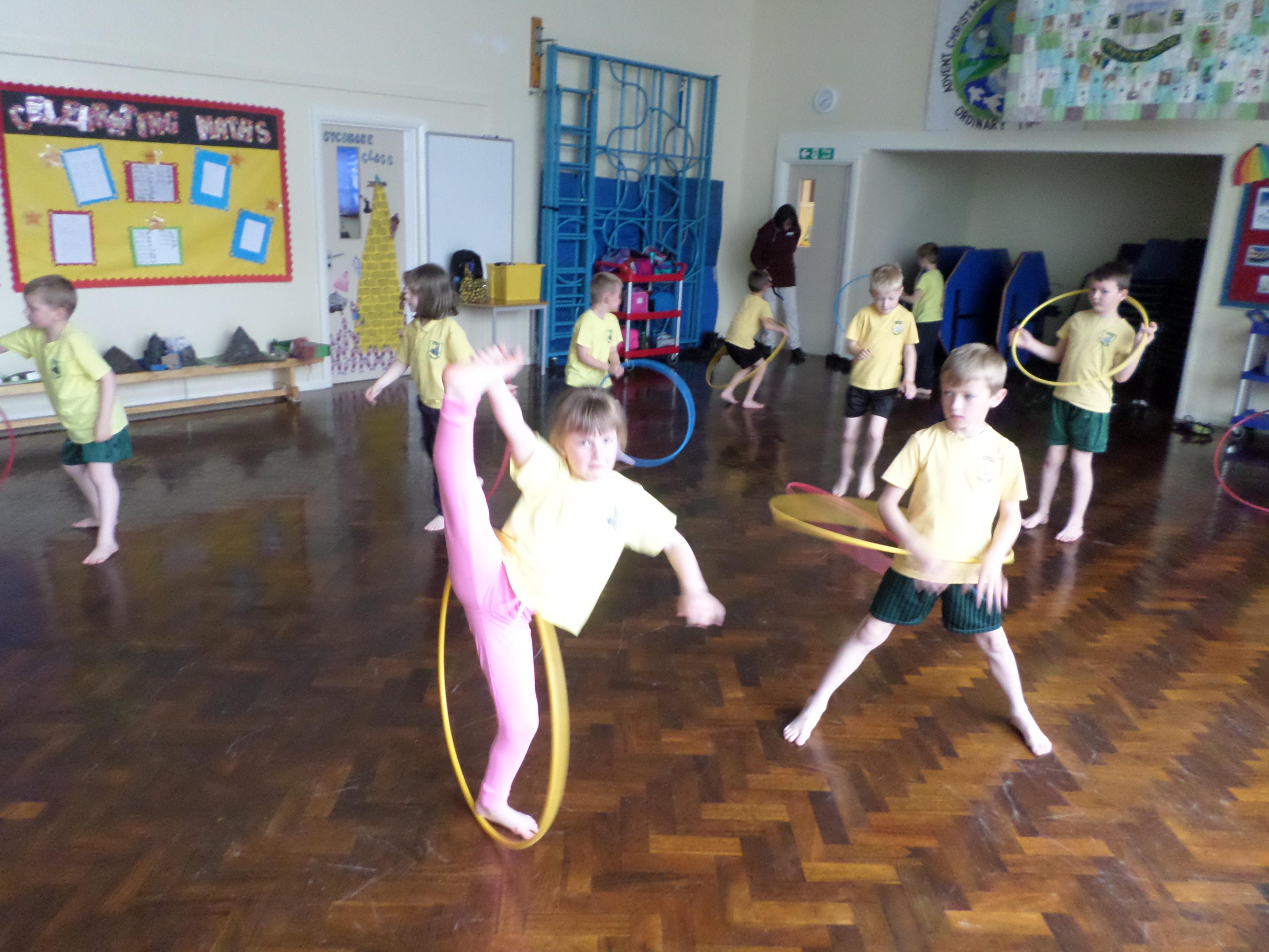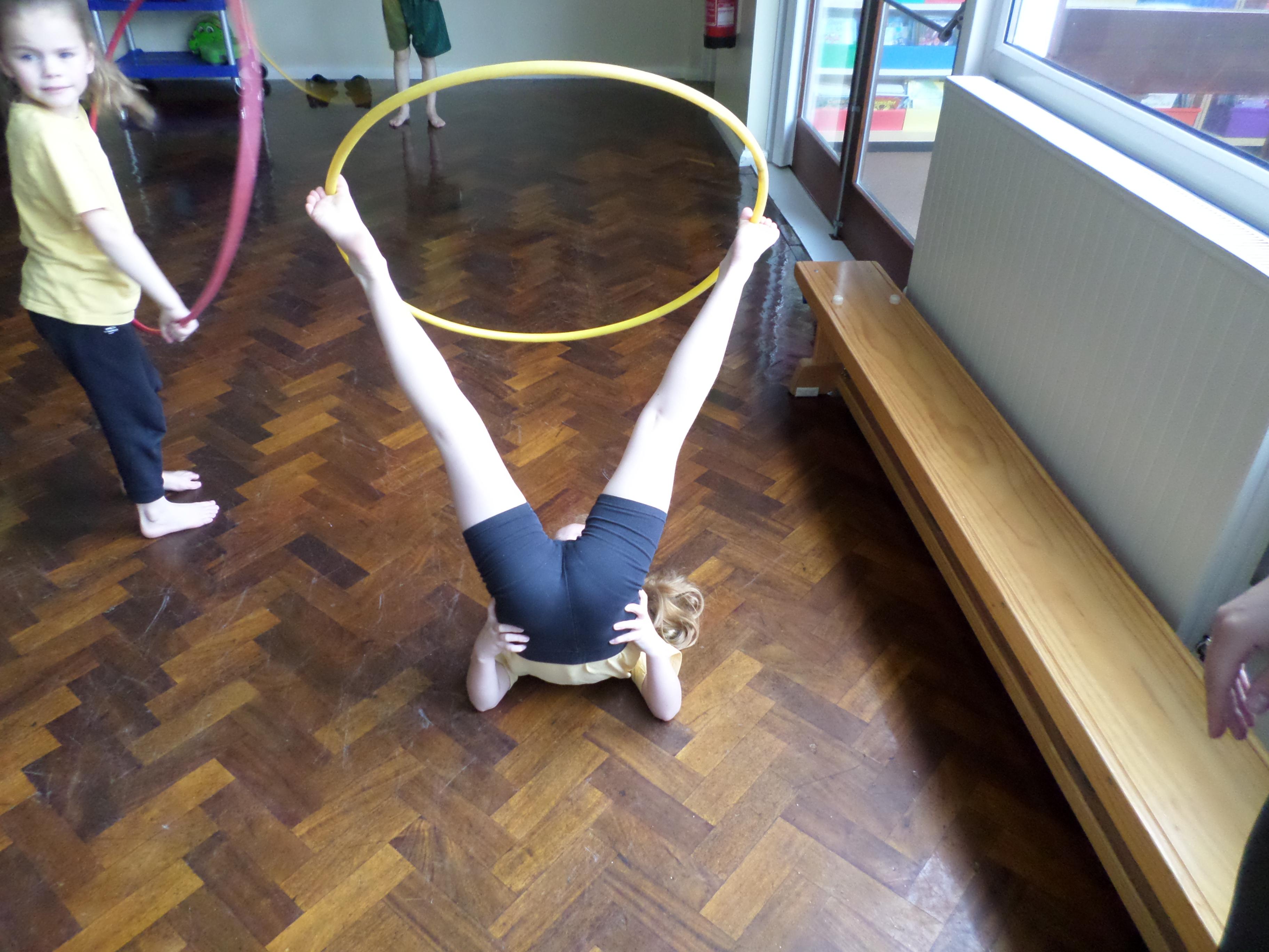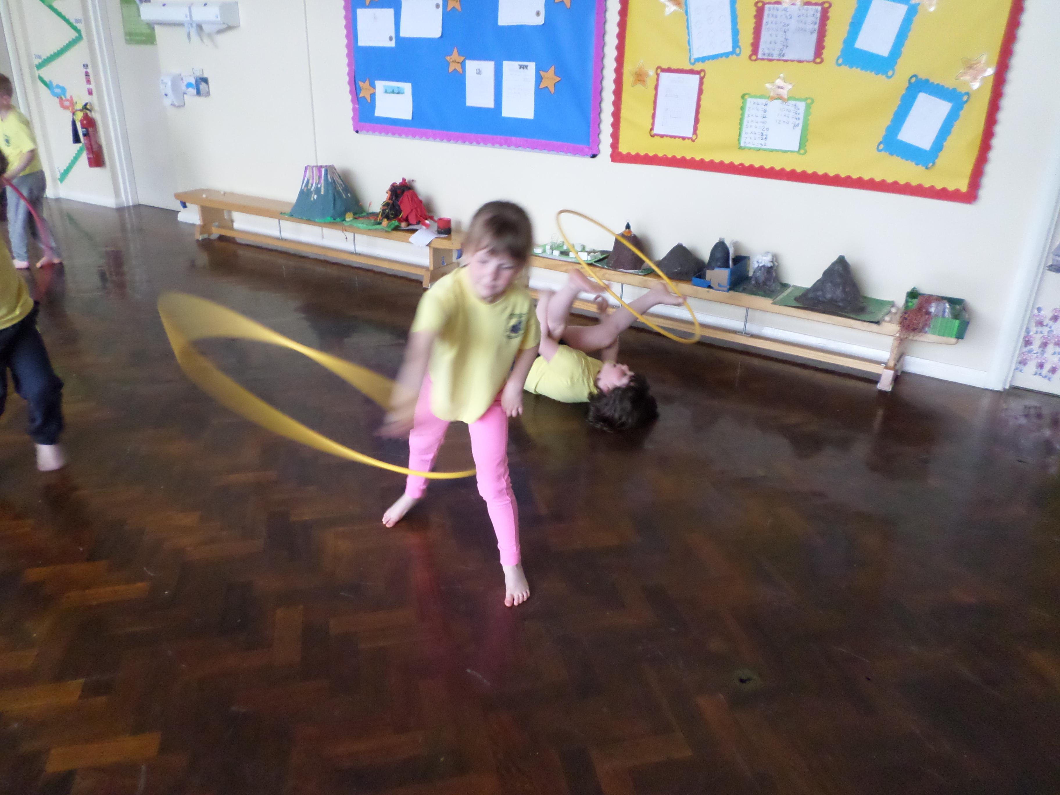 First we watched video clips of gymnasts from around the world and we were amazed at what they could do with a ball or a hoop. They were so flexible and very accurate with their throwing and catching. Then we tried it ourselves. The balls were very tricky to control but we had greater success with the hoops.