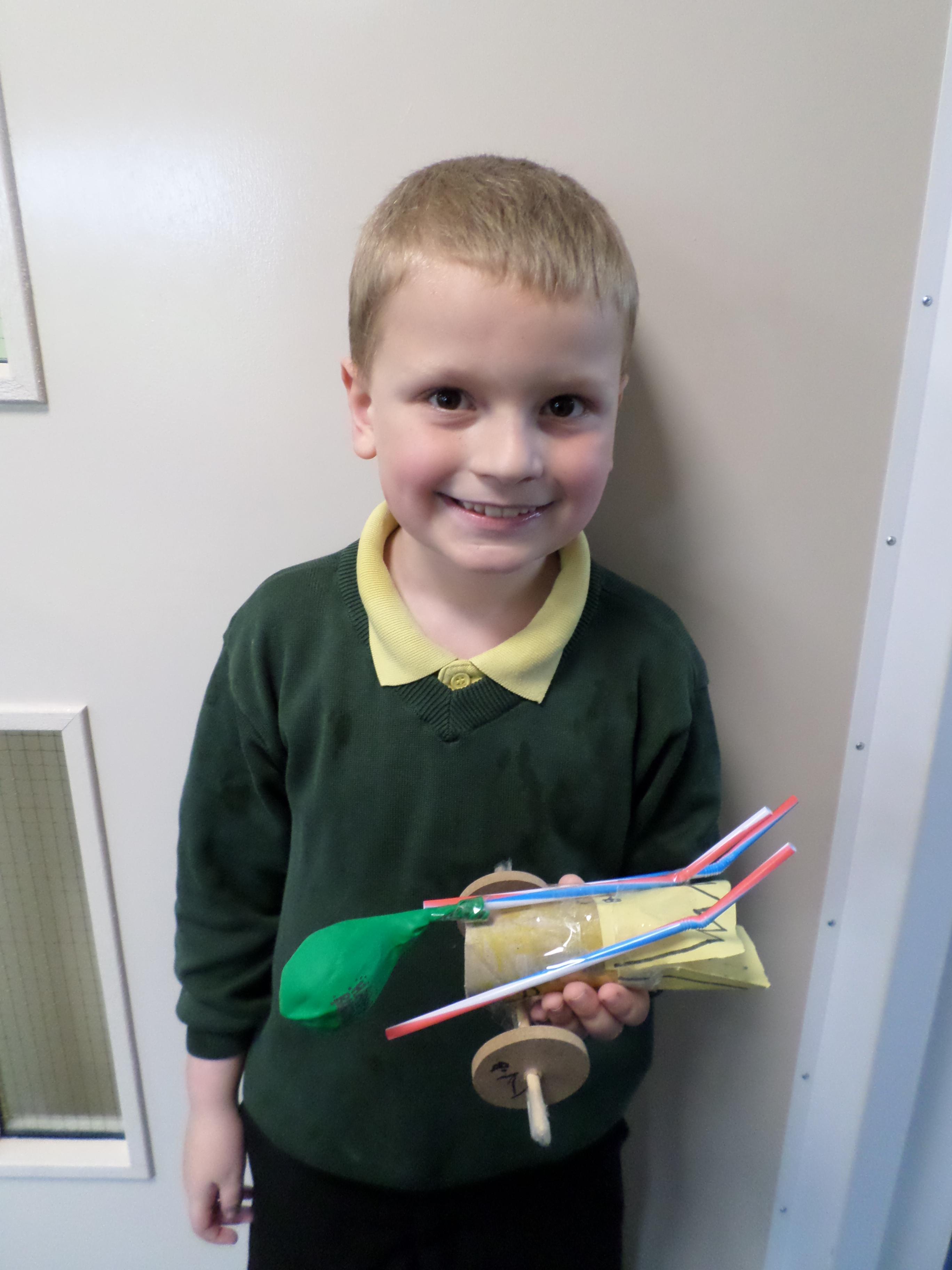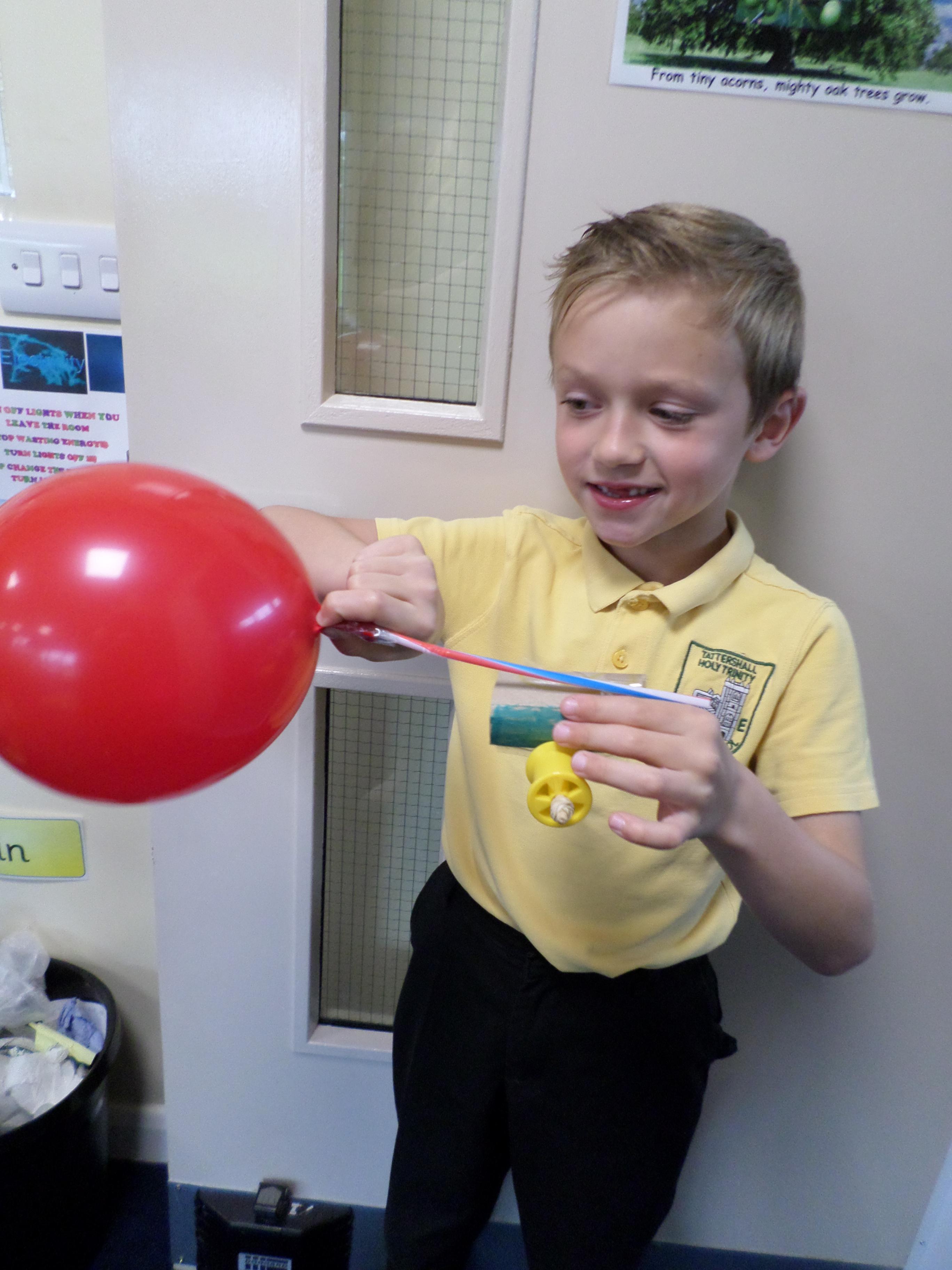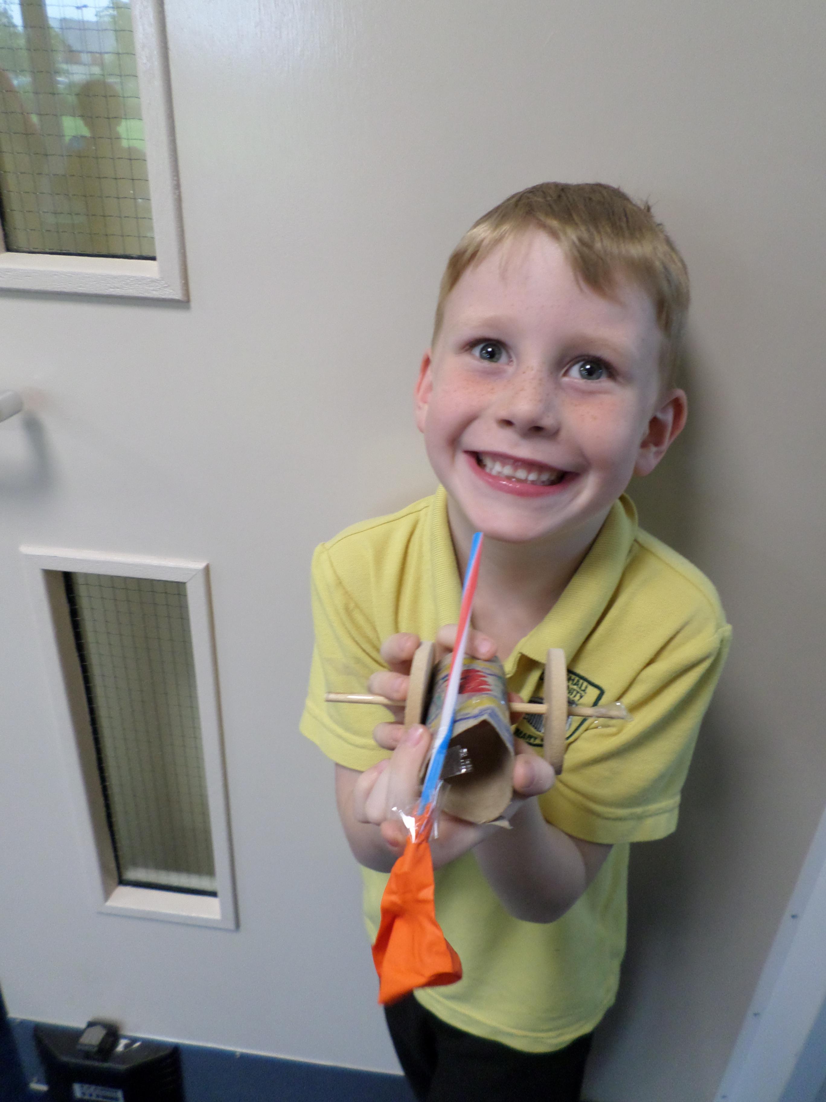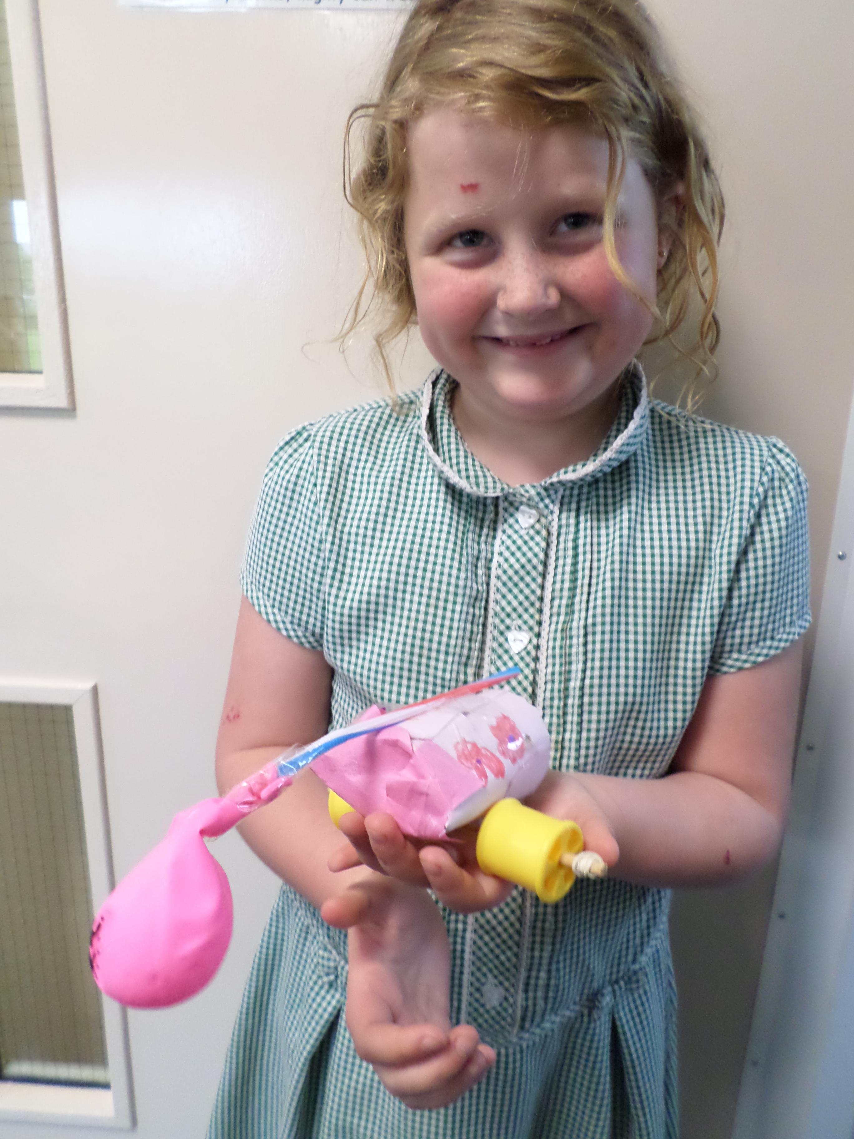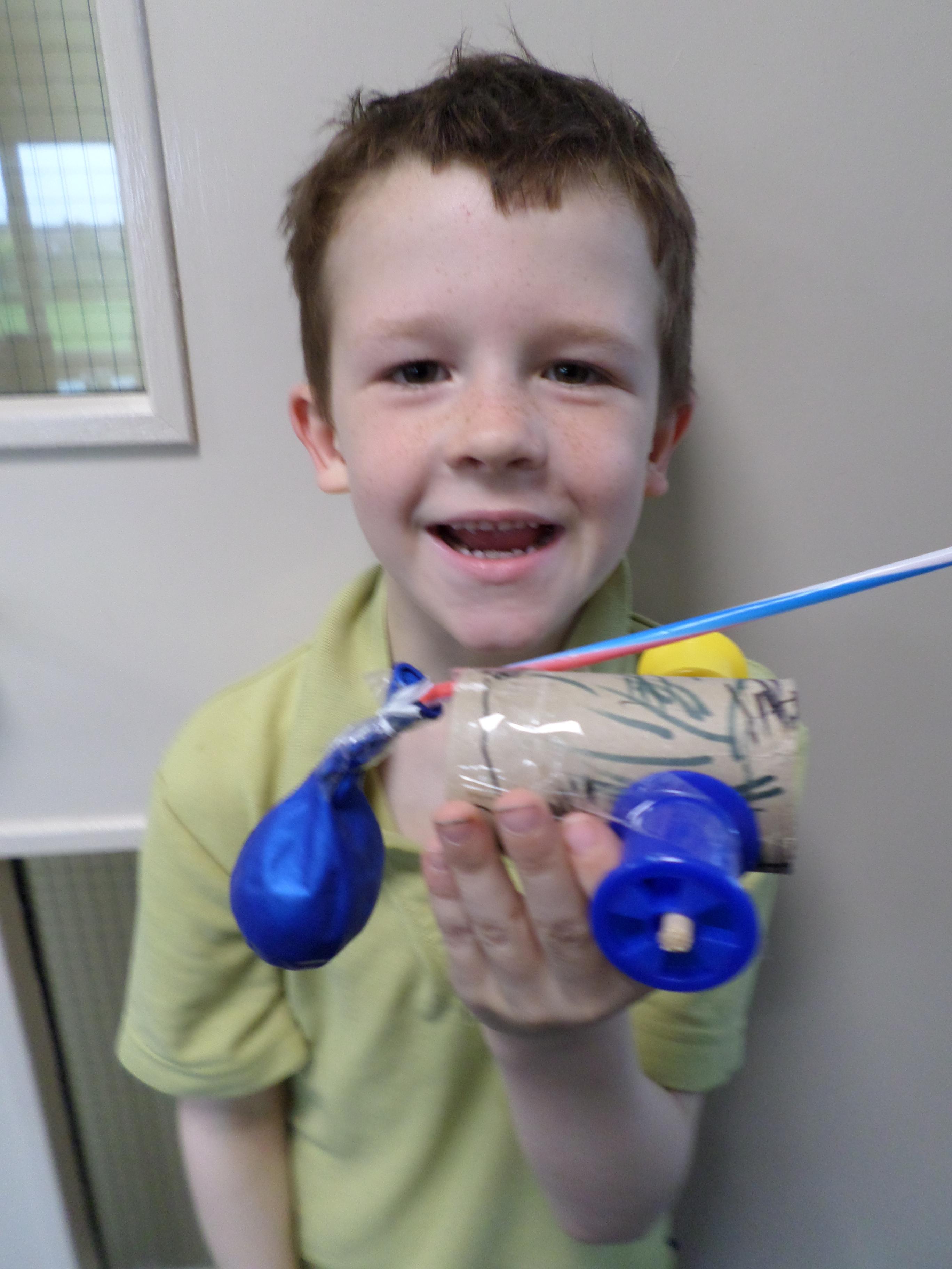 We followed instructions to build balloon cars and then investigated how to adapt and adjust them to make them work better. It was a challenge!! We tried different wheels, different axles, with nose cones, without nose cones, making the chassis parallel with weights inside and many more ways too. We only had limited success but it was fun making them. The children then took them home where some of them have continued to make design adjustments and then bring them back in. So far 4 straws works the best!