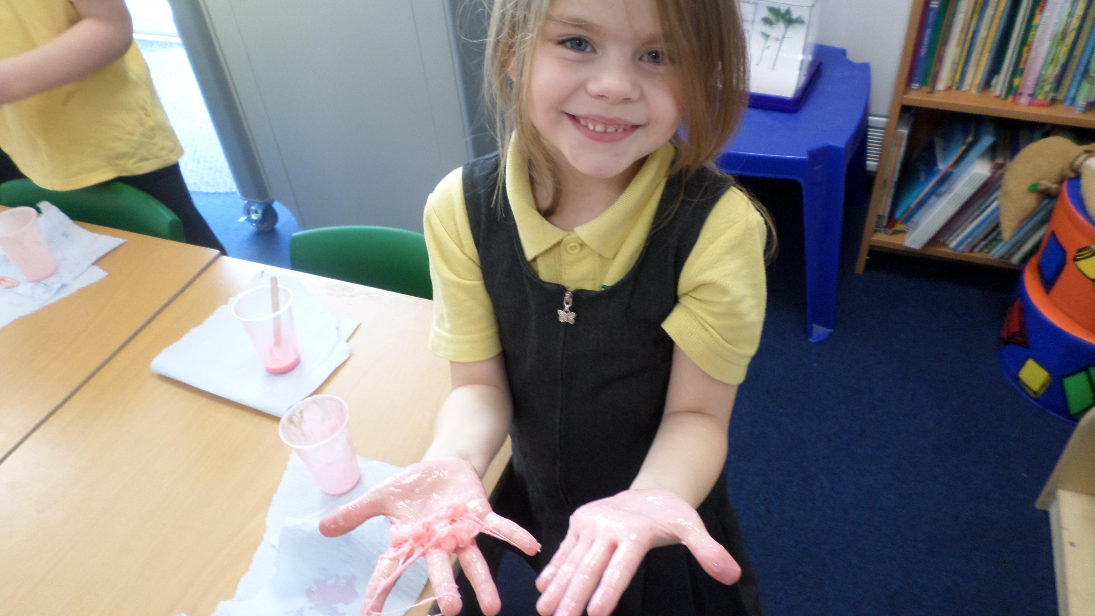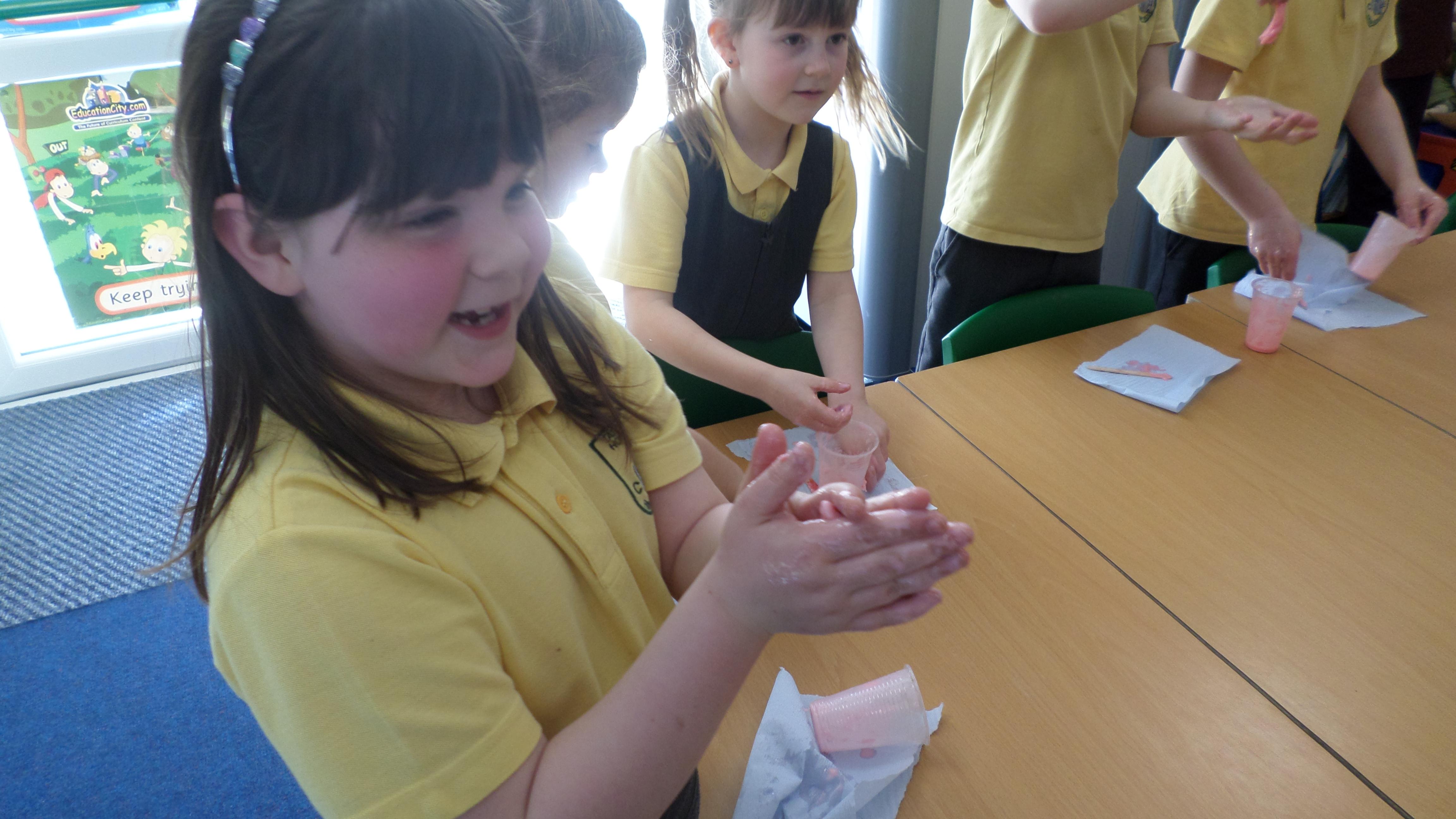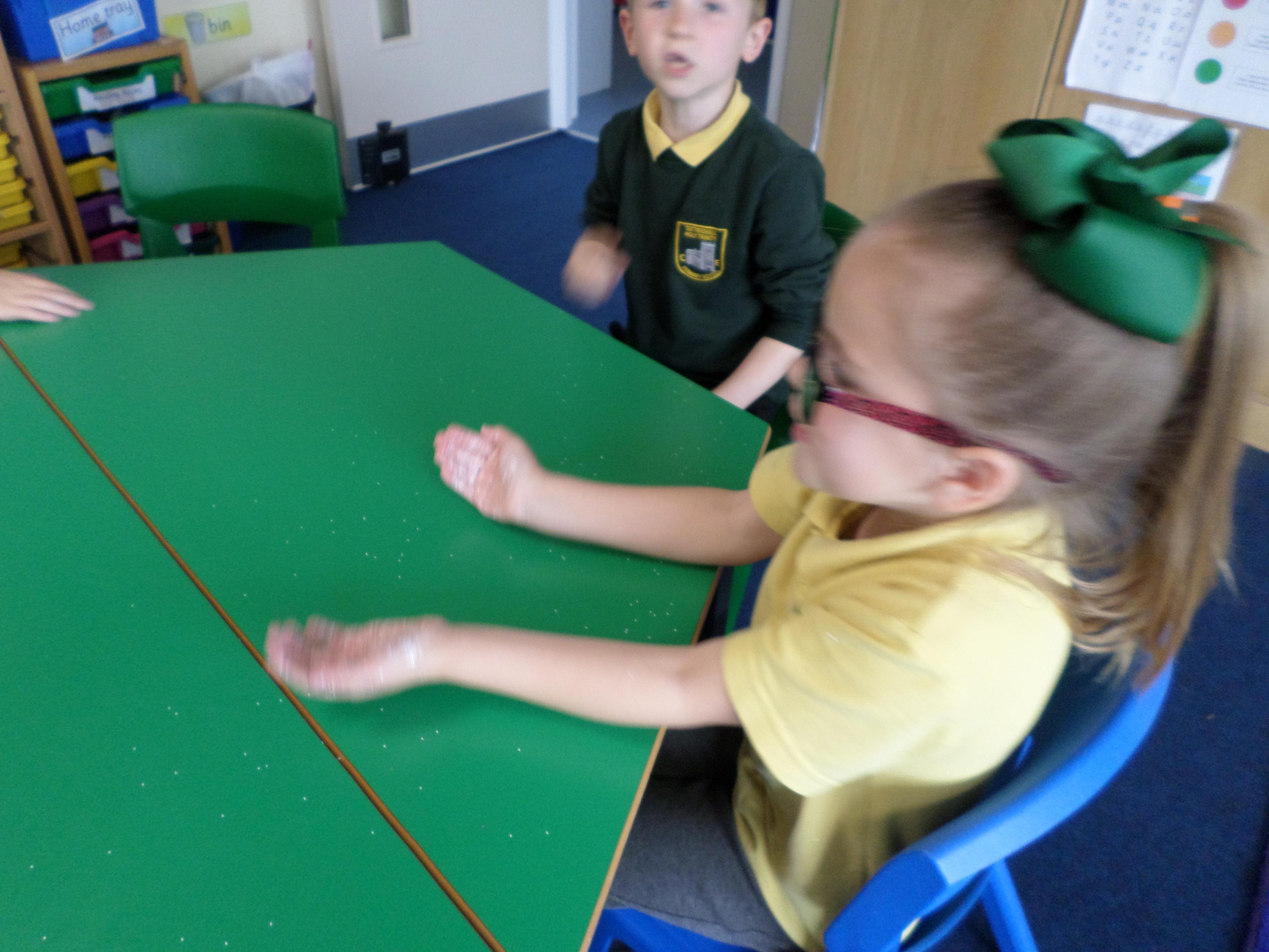 Following a hygiene discussion about the different ways in which germs can be spread, the Year 2 investigated how germs are spread by touch. We used glitter to represent the germs and then carried on with some normal activities such as sorting cards, colouring and using maths equipment. After we observed where and how far the glitter had spread. It was everywhere! Not only on the equipment they used but also on the chairs and tables, on their clothes, in their hair and even on their trays and learning packs. We then washed our hands and realised how hard it is to get rid of germs unless we wash properly with lots of soap and water. A very enlightening afternoon!