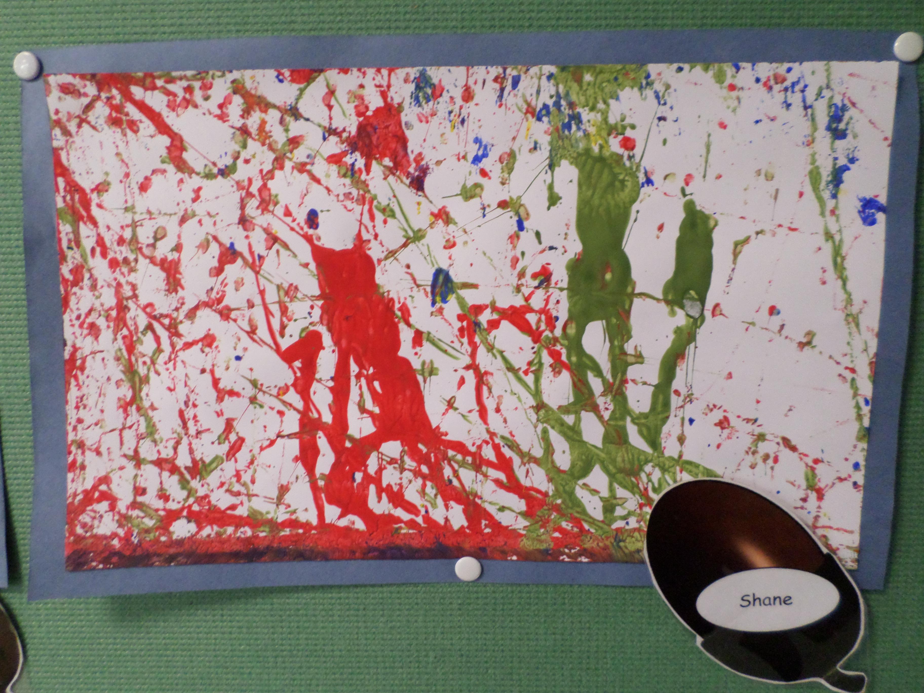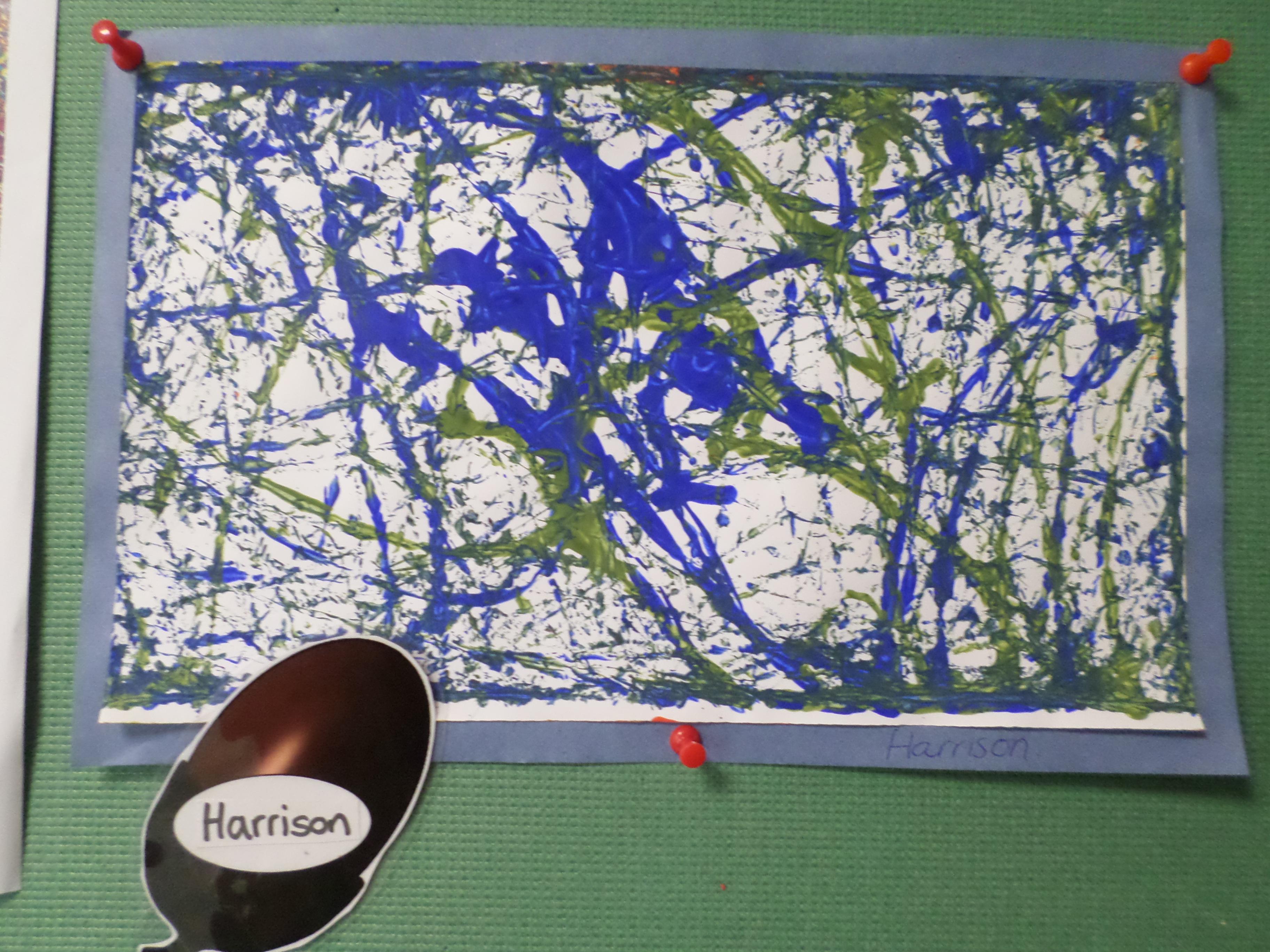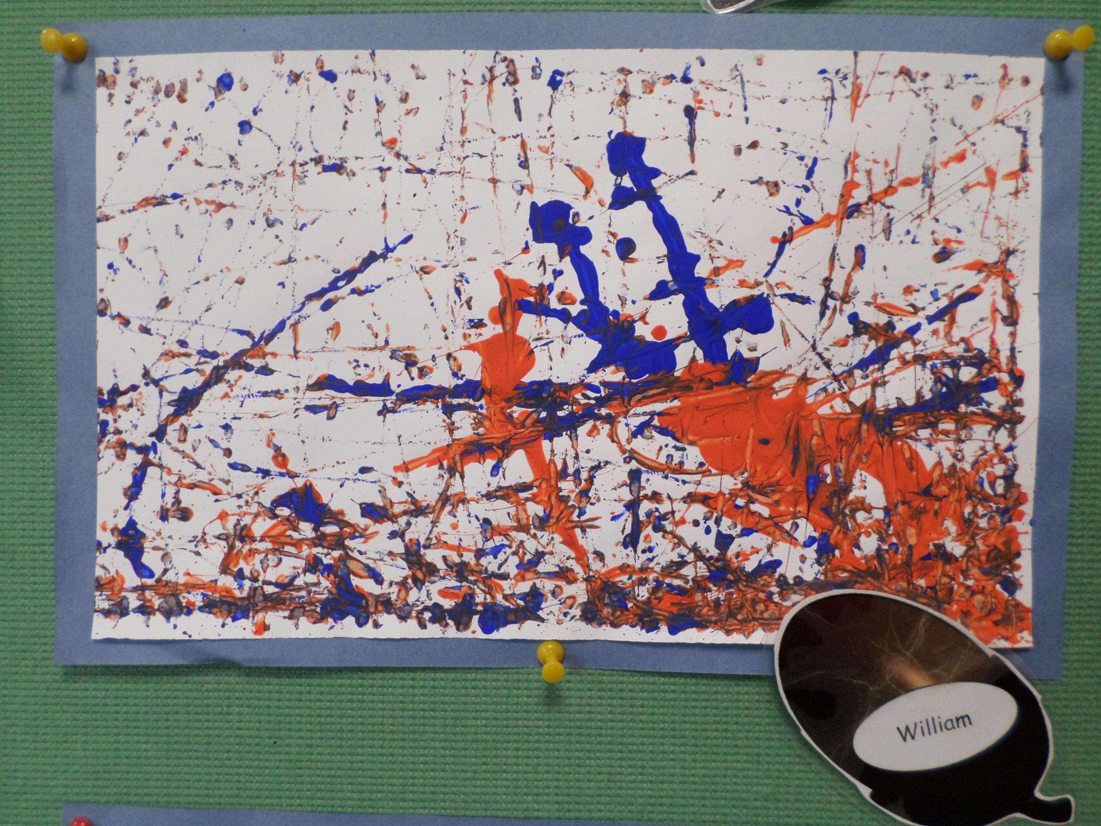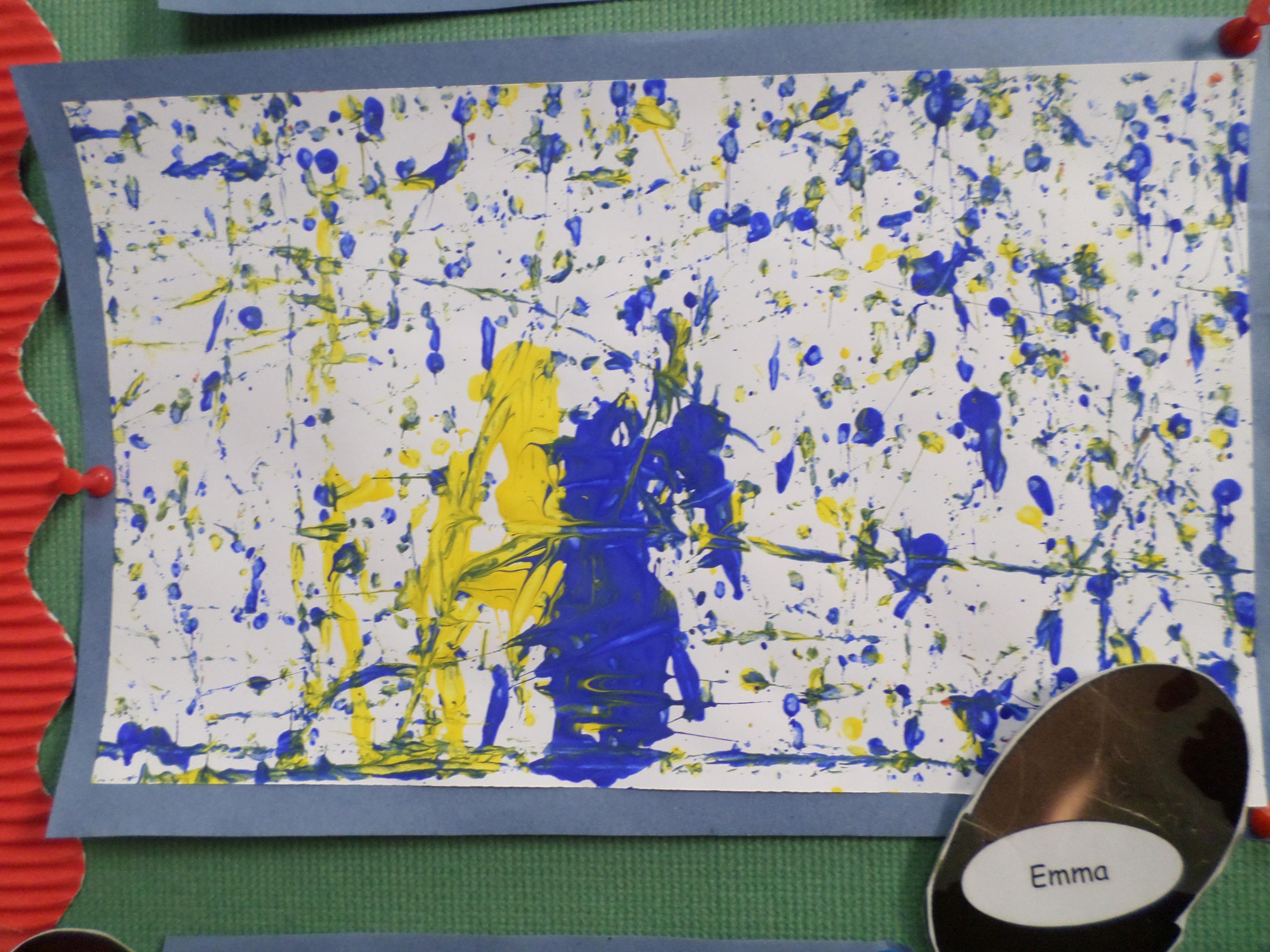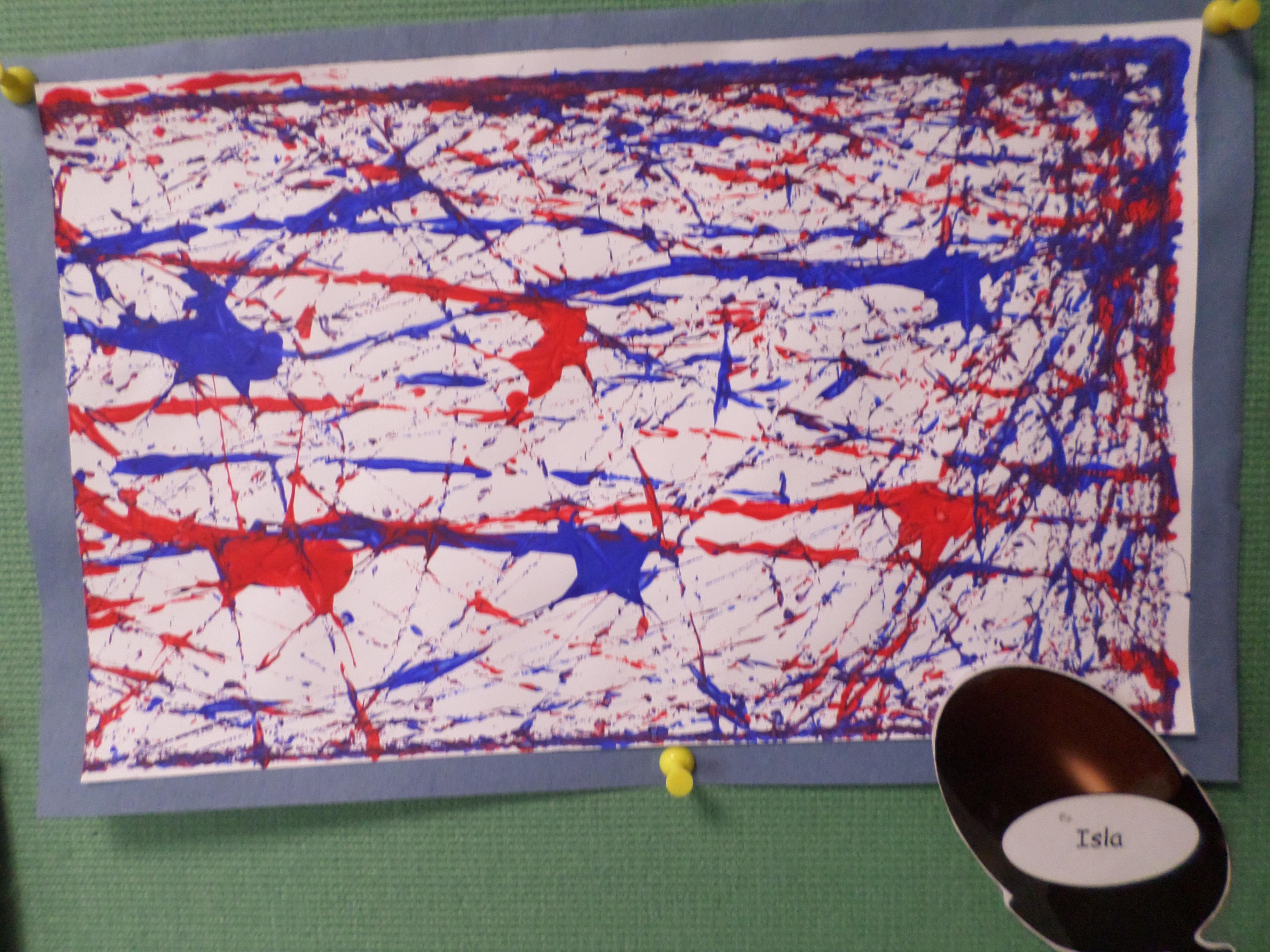 We put painted marbles in shoe boxes and shook them to make them bounce about inside. This created a piece of art work inspired by the work of artist Jackson Pollock. We only chose two or three colours so that the mixing action created further colours.
