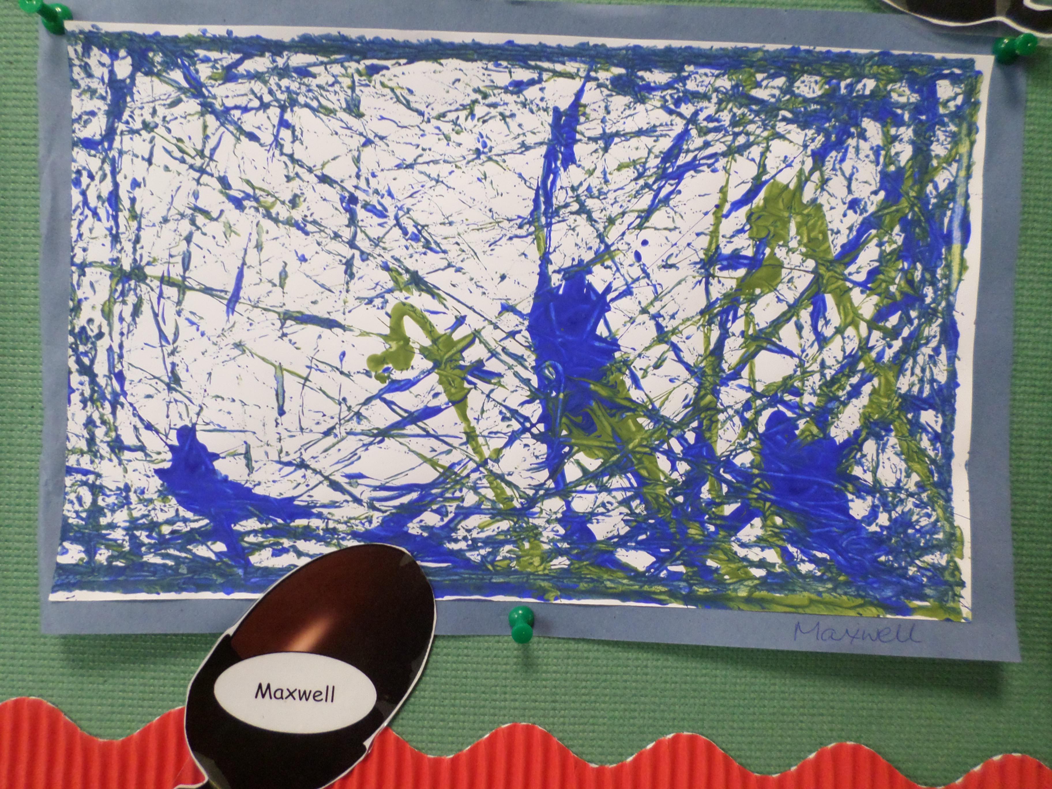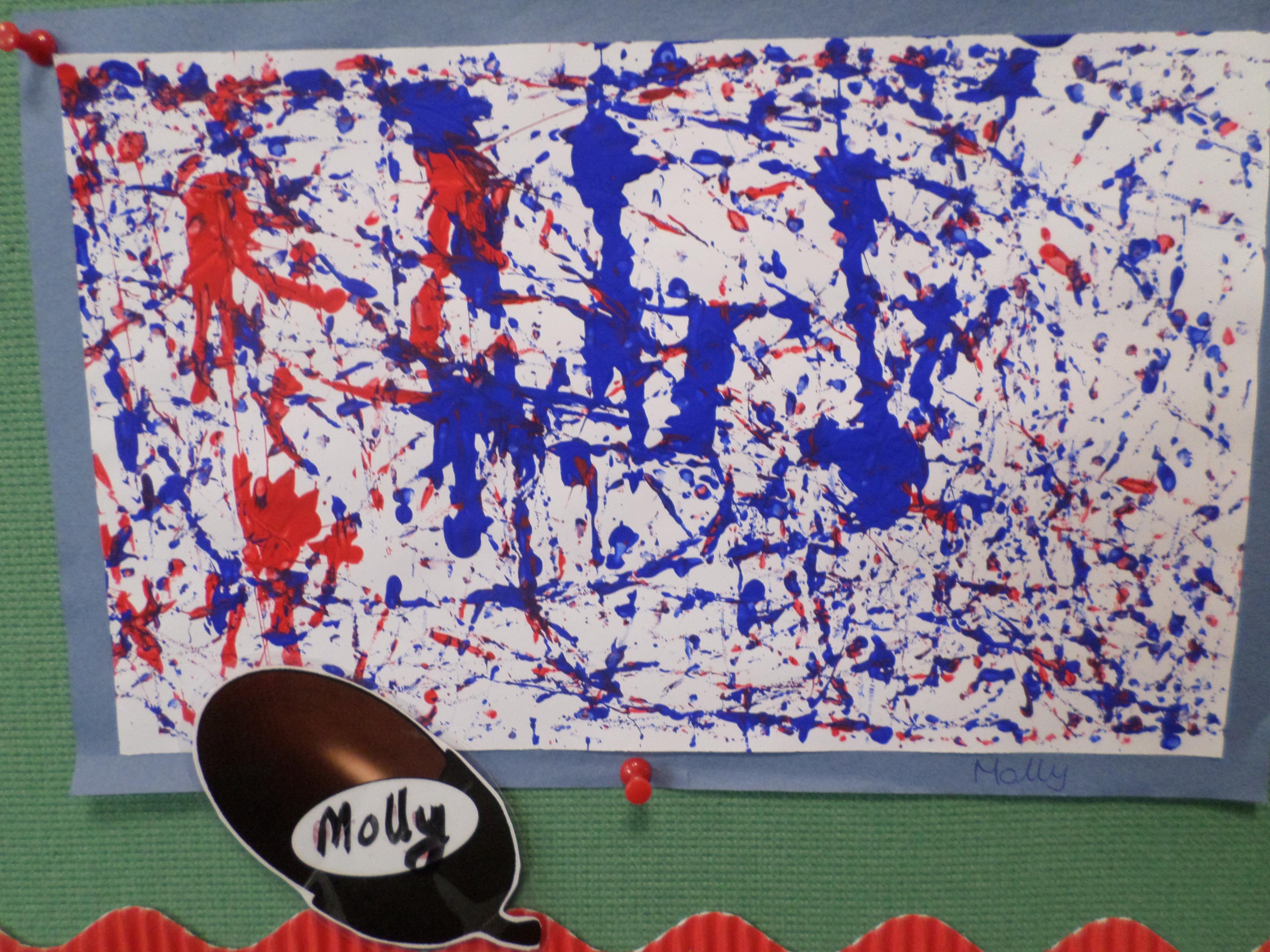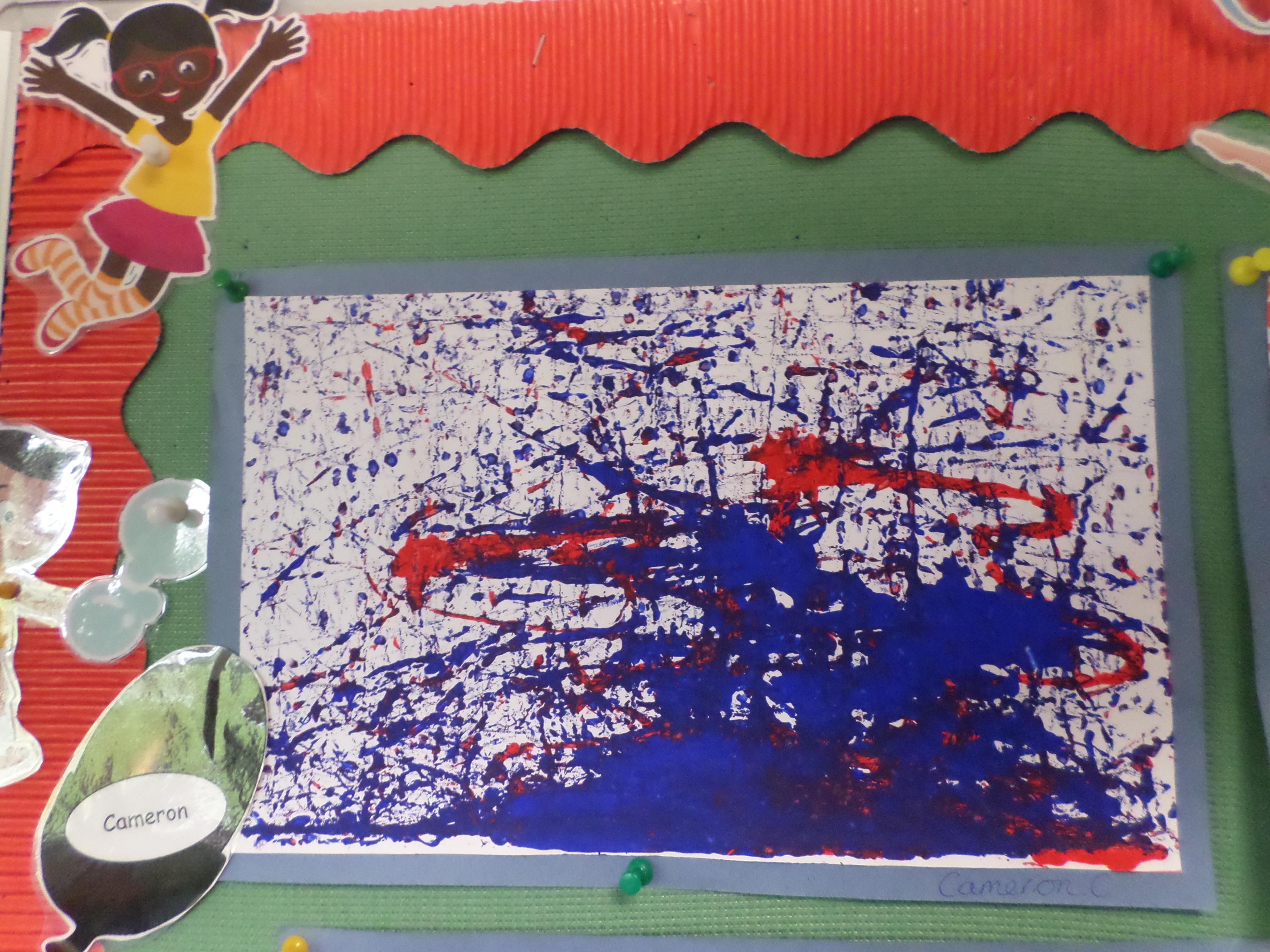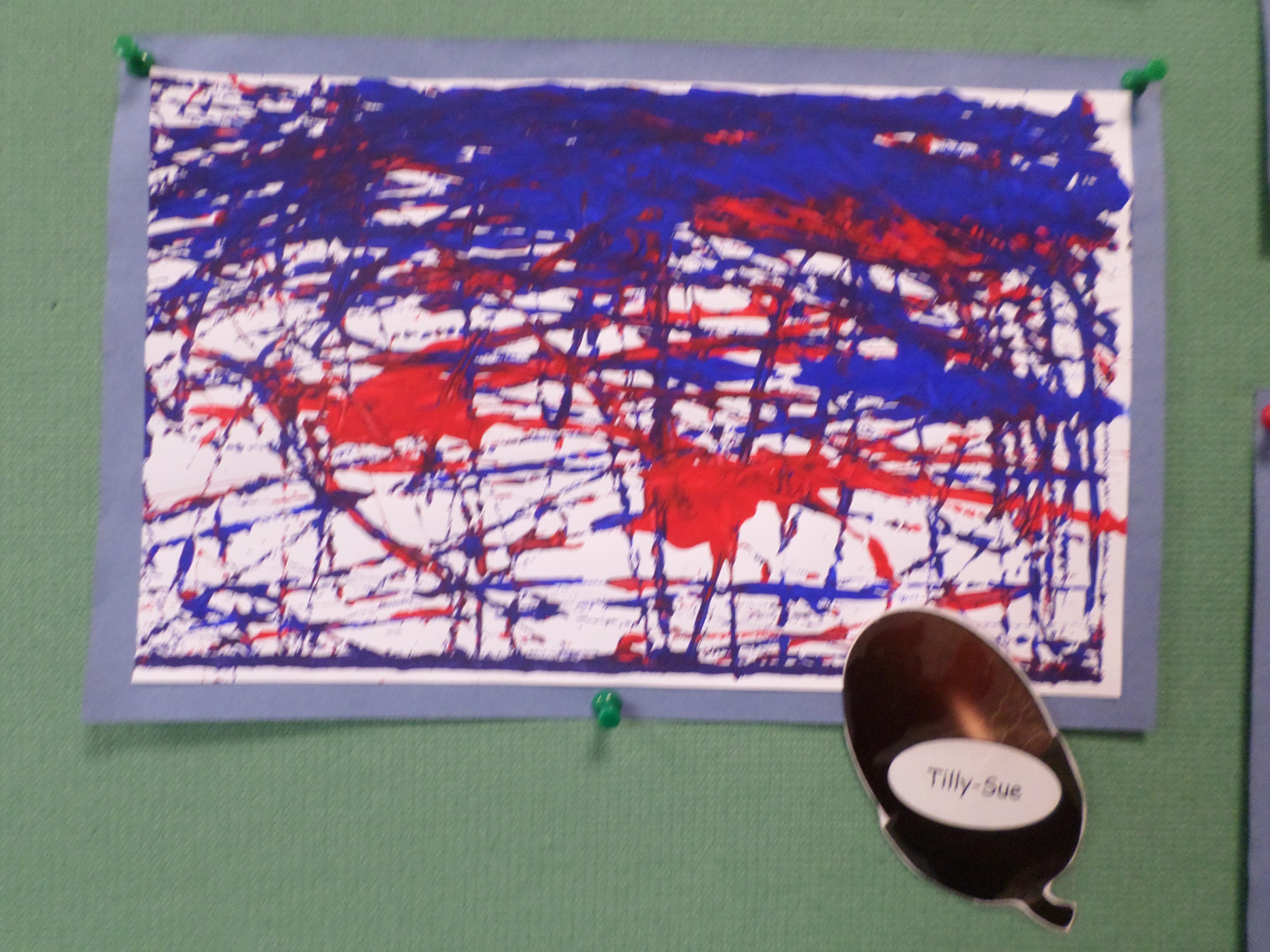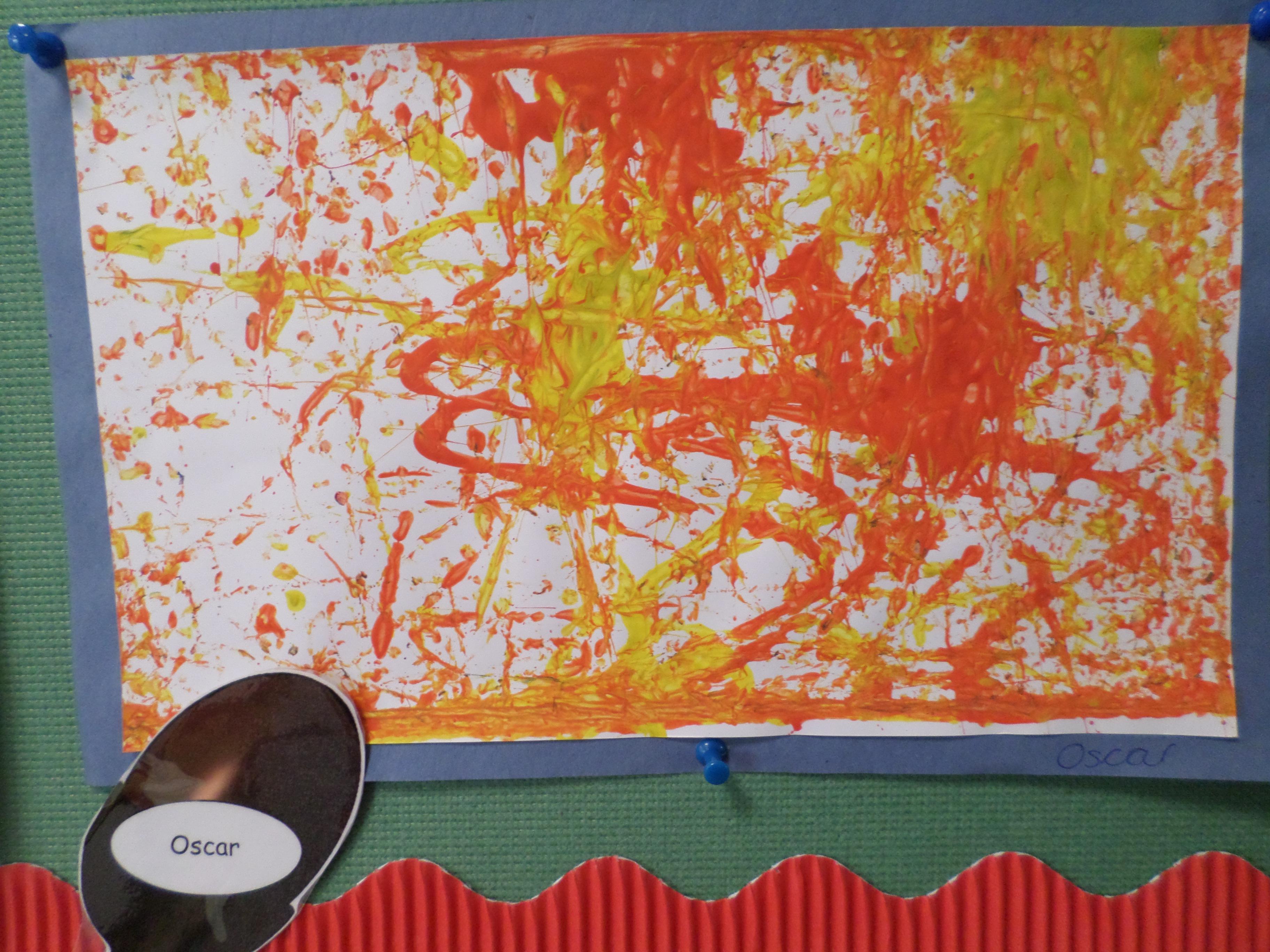 We put painted marbles in shoe boxes and shook them to make them bounce about inside. This created a piece of art work inspired by the work of artist Jackson Pollock. We only chose two or three colours so that the mixing action created further colours.