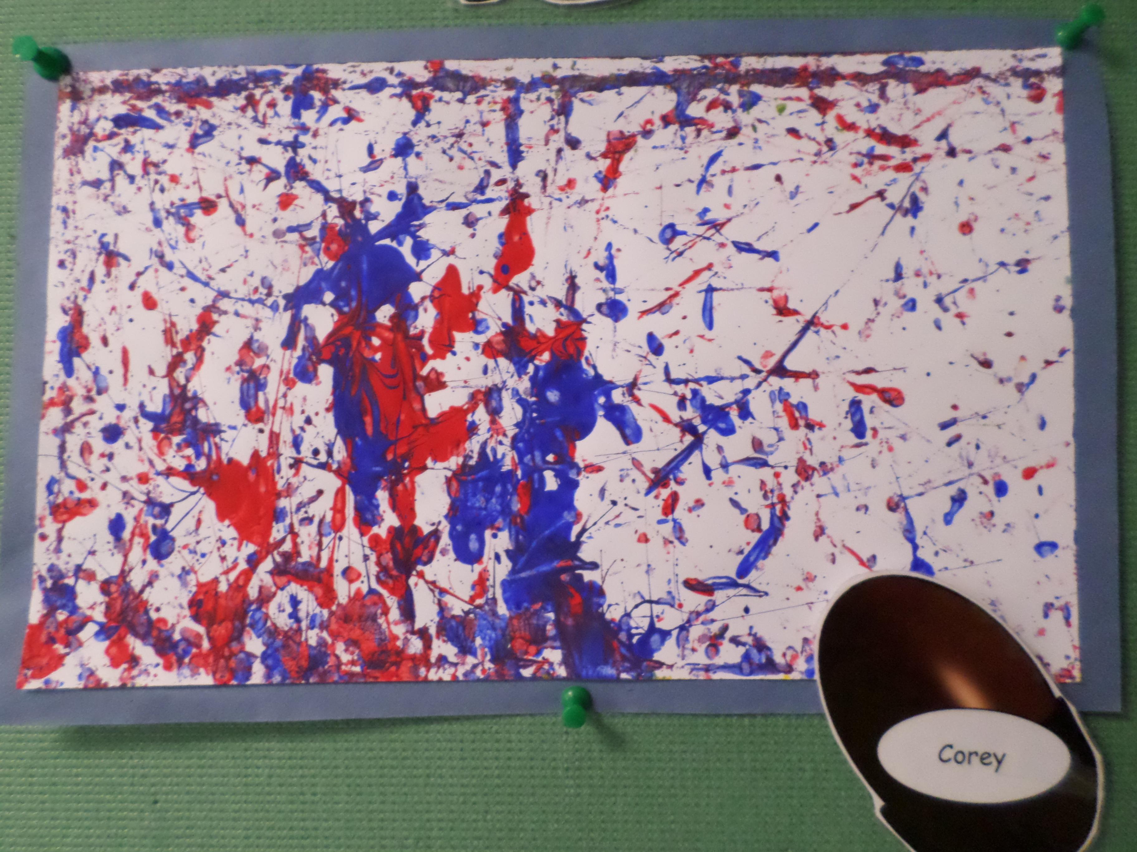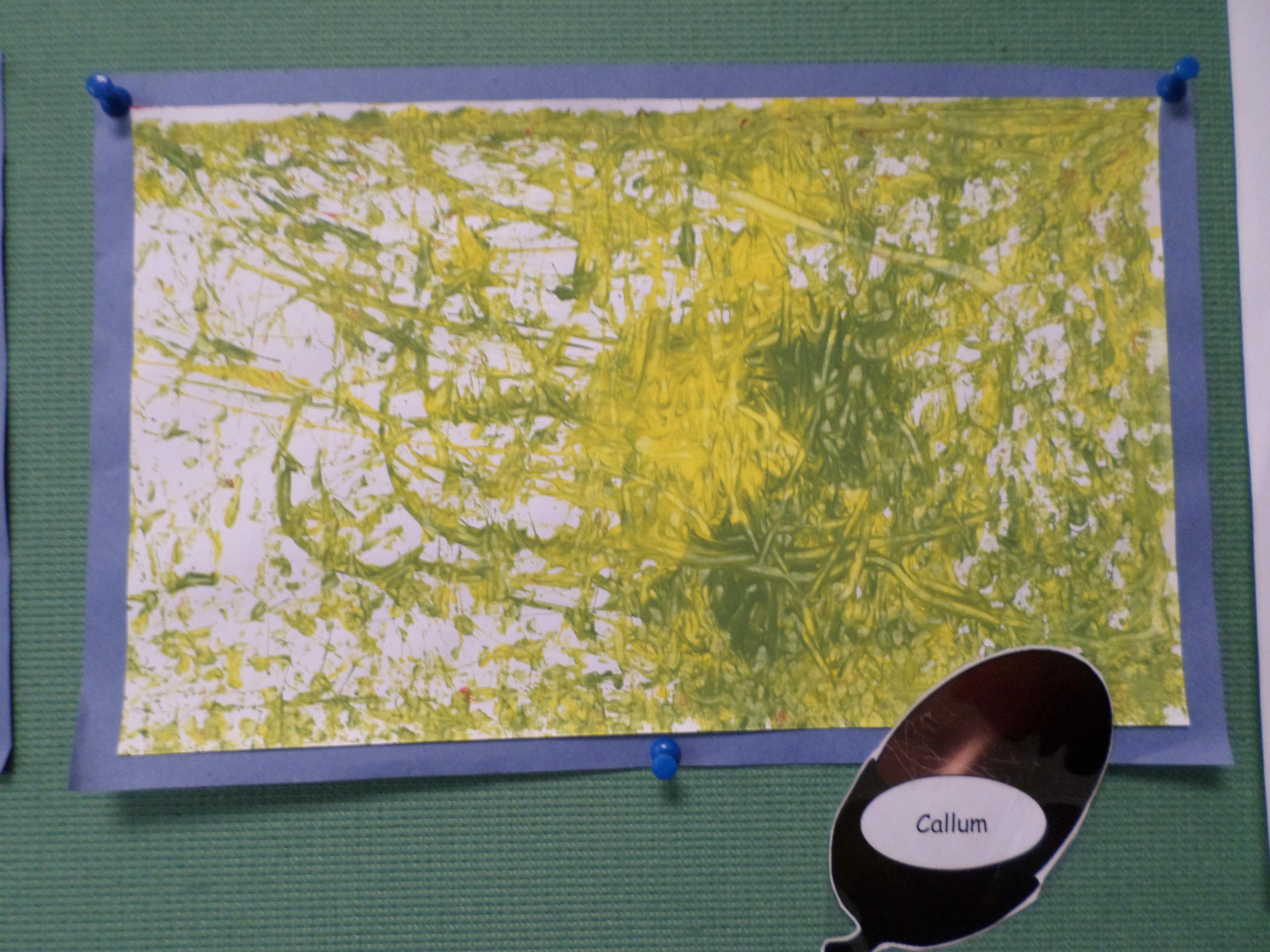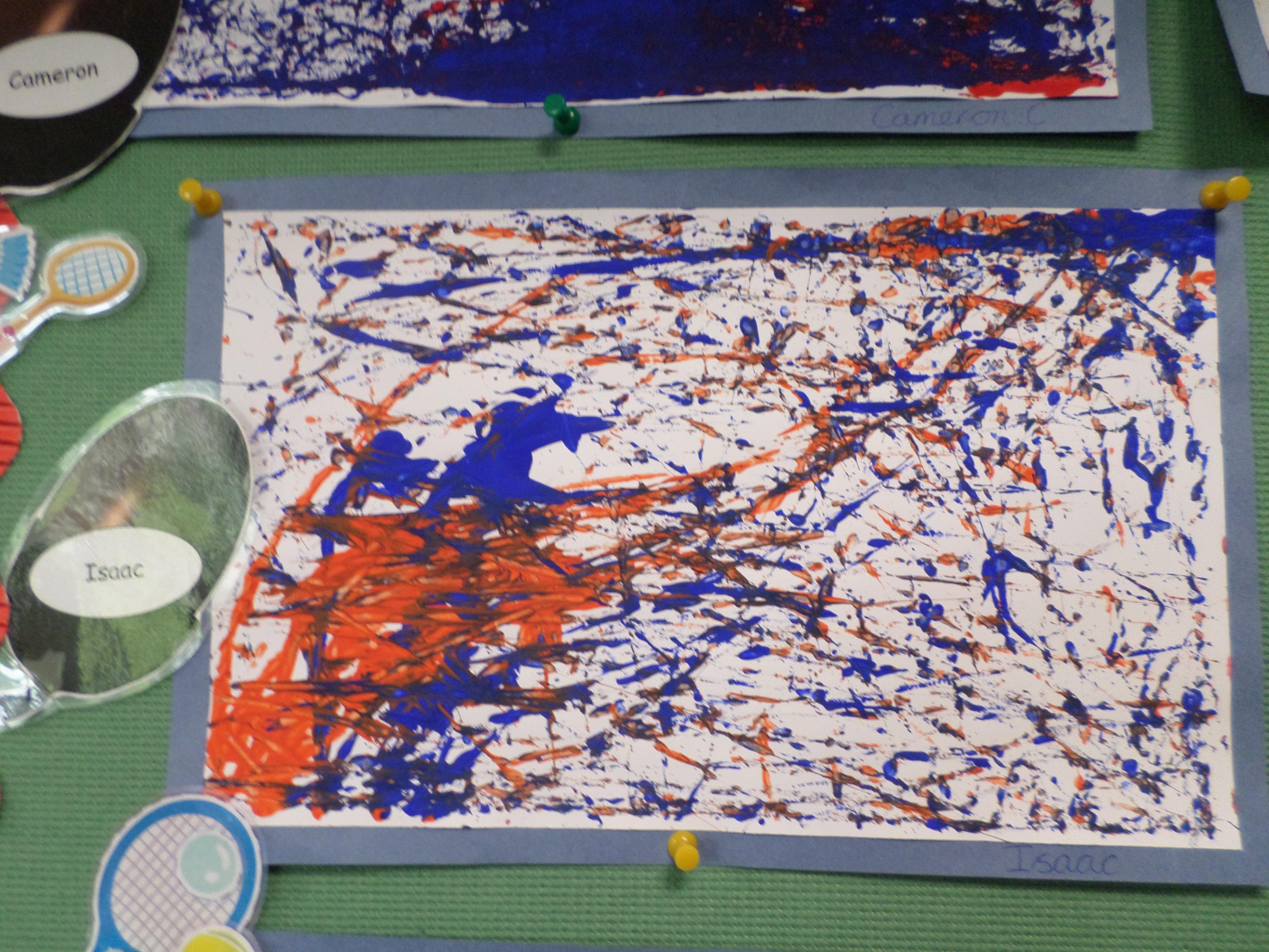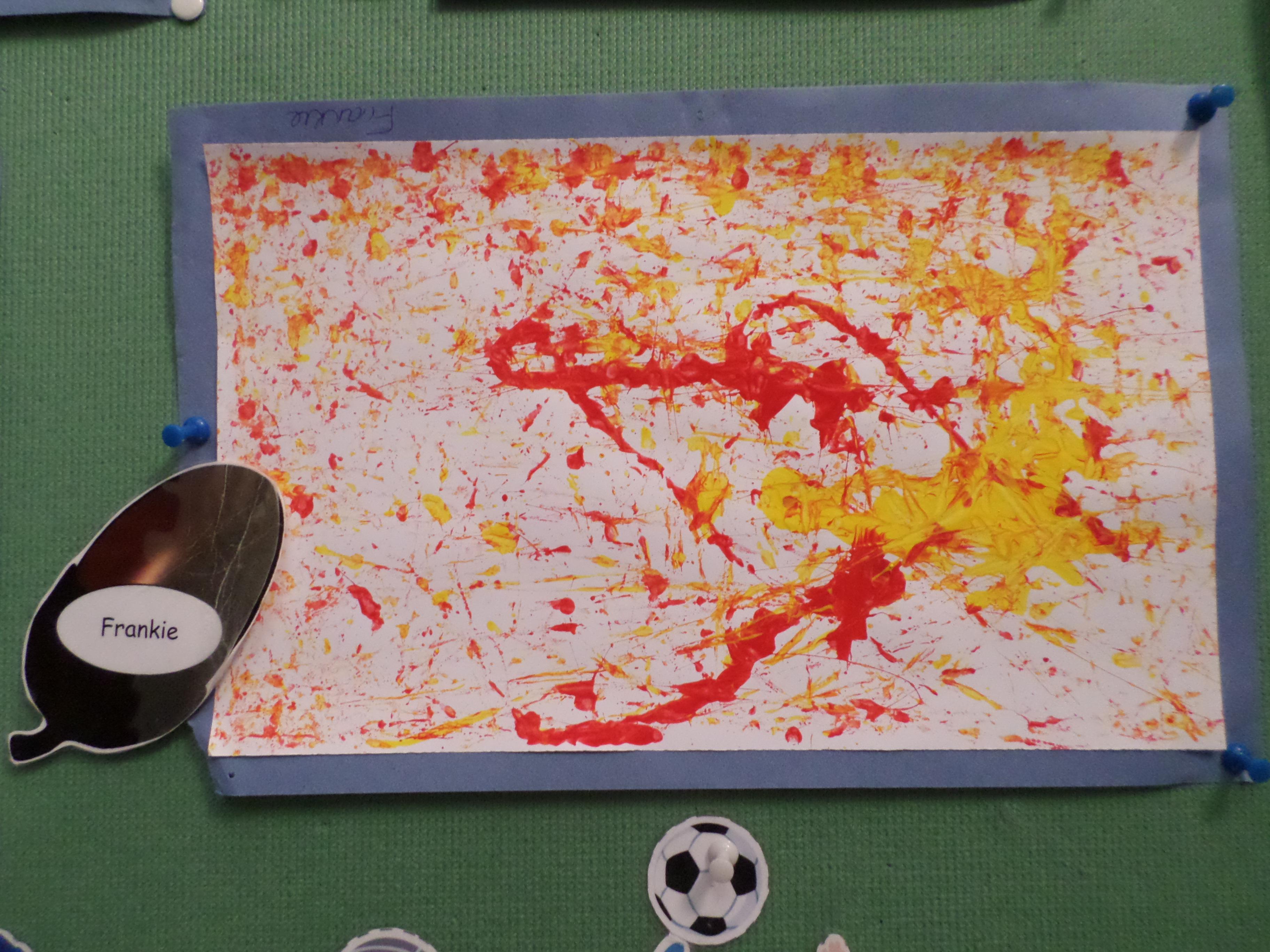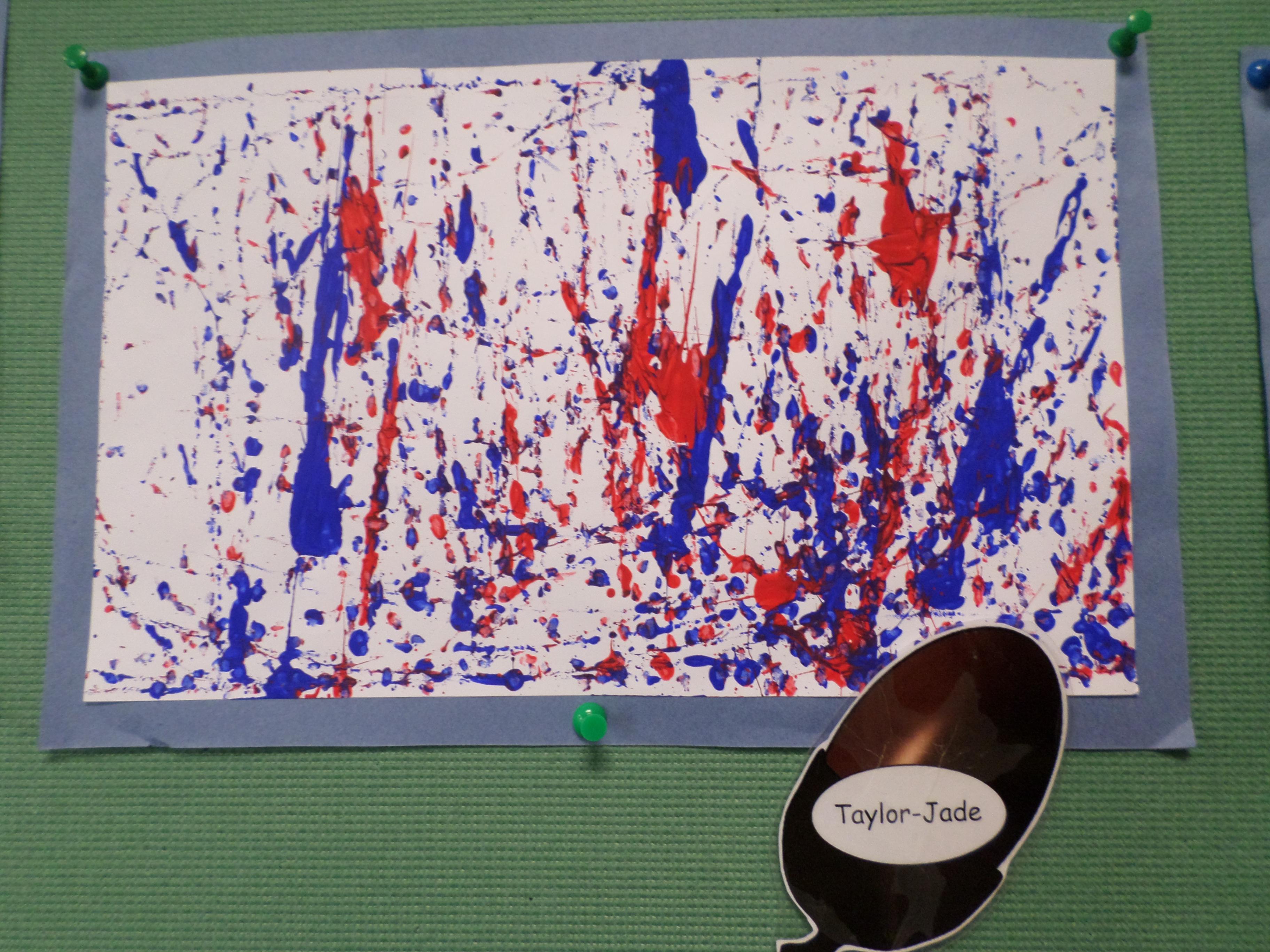 We put painted marbles in shoe boxes and shook them to make them bounce about inside. This created a piece of art work inspired by the work of artist Jackson Pollock. We only chose two or three colours so that the mixing action created further colours.