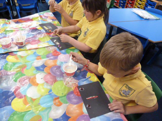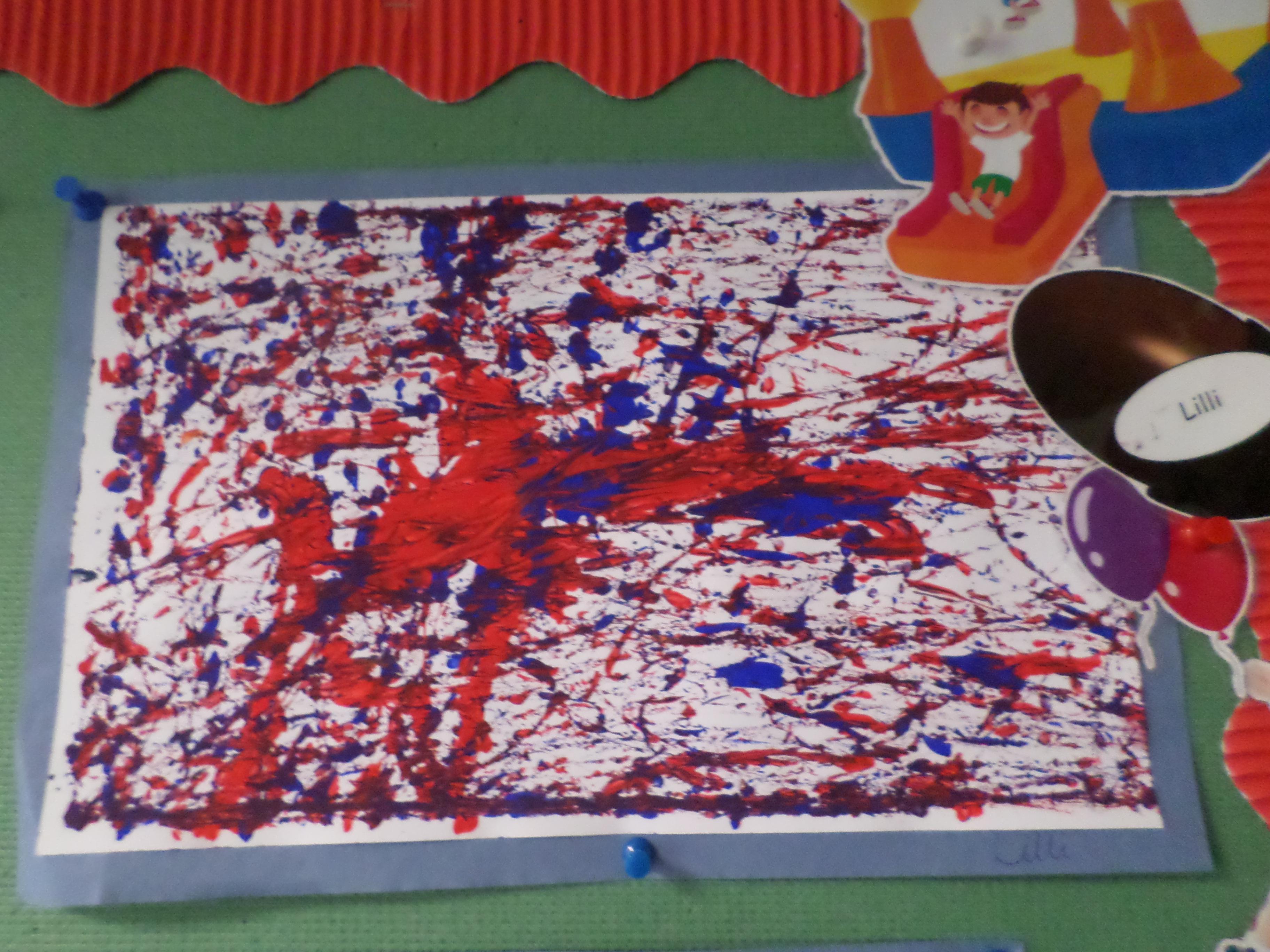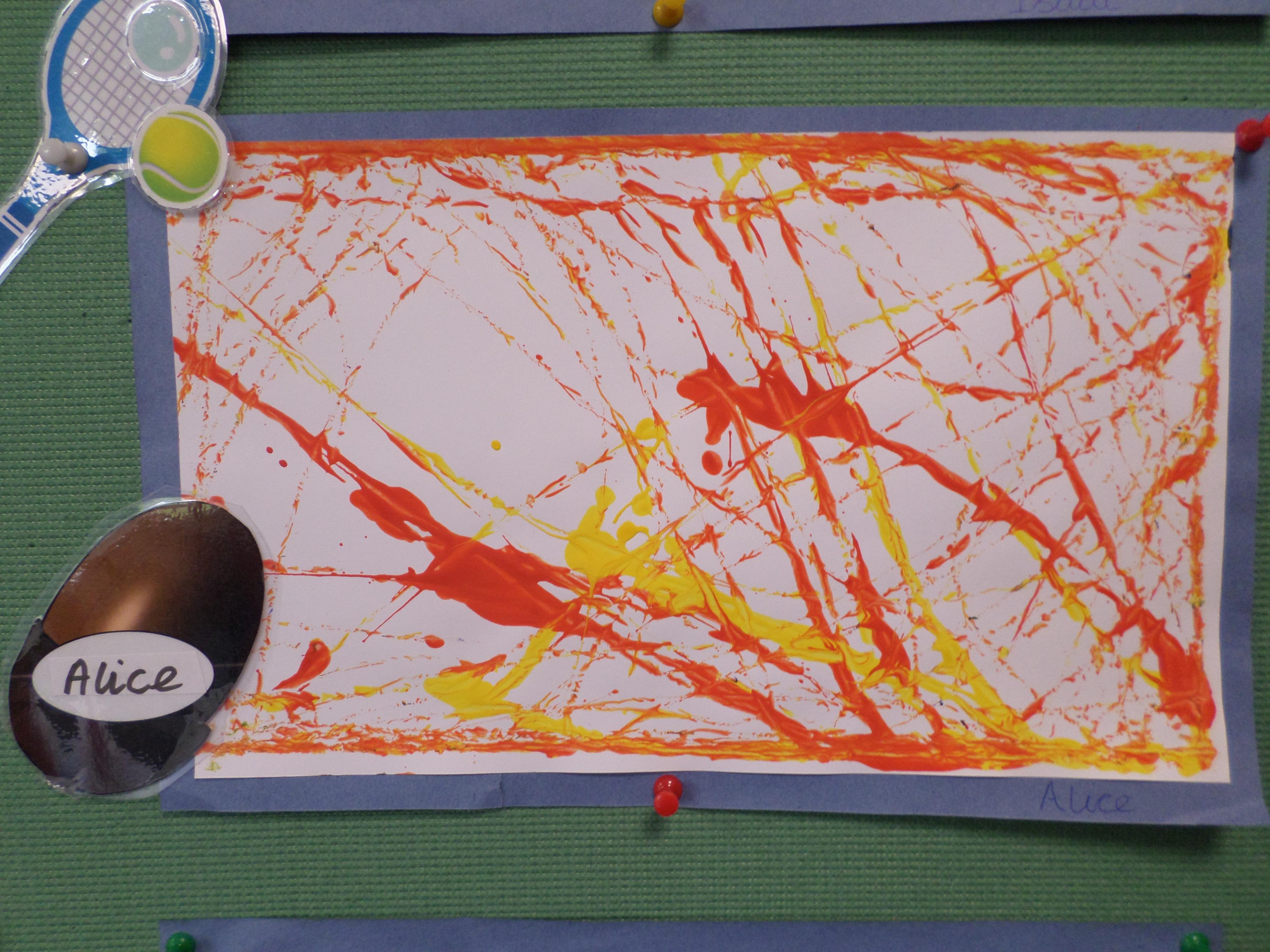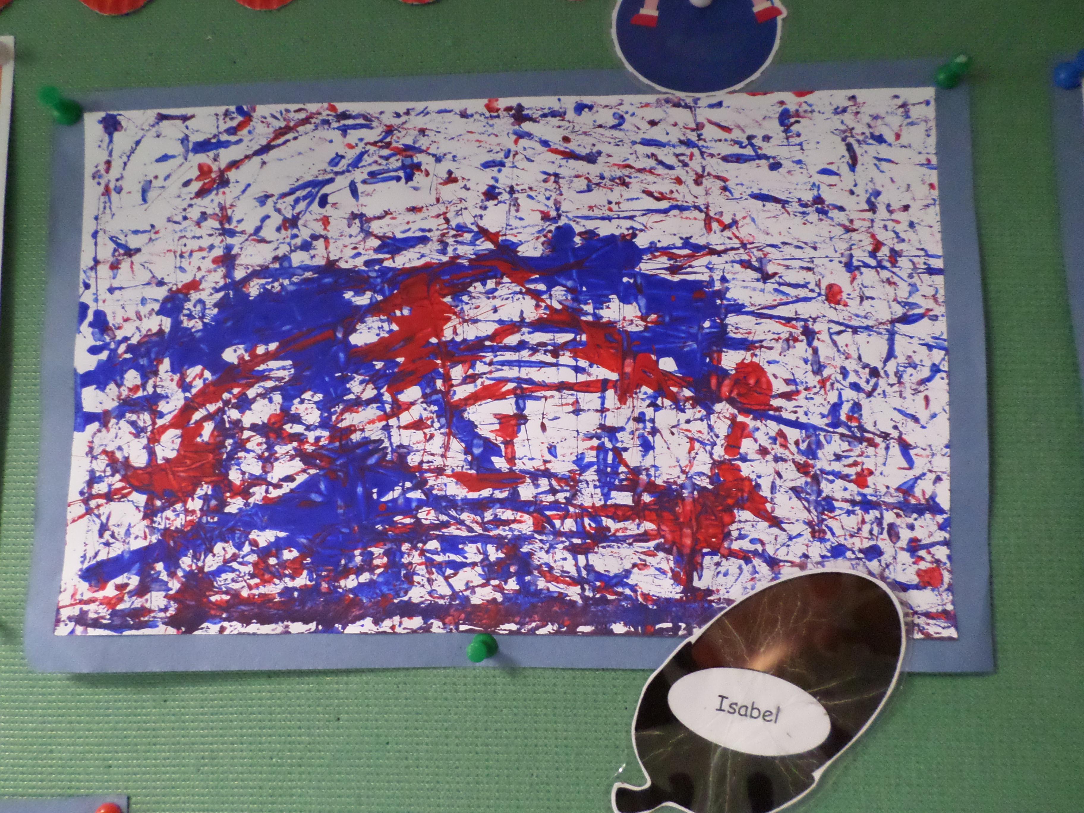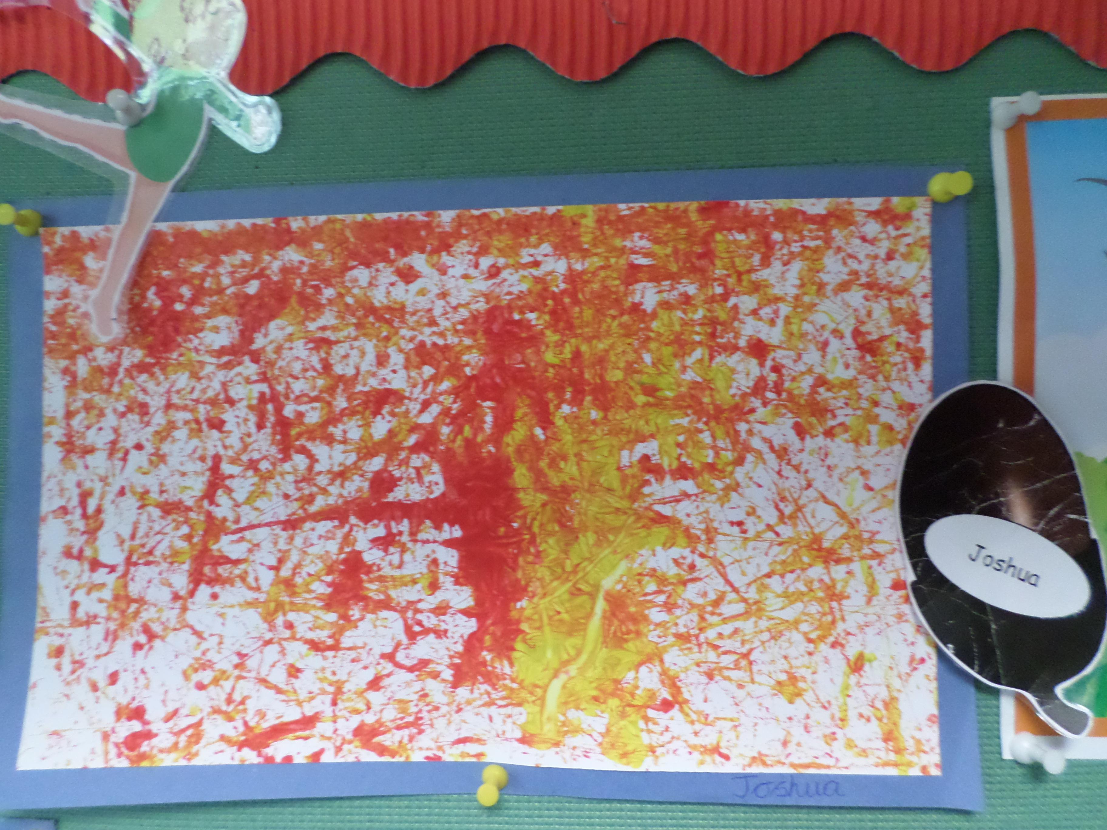 We put painted marbles in shoe boxes and shook them to make them bounce about inside. This created a piece of art work inspired by the work of artist Jackson Pollock. We only chose two or three colours so that the mixing action created further colours.