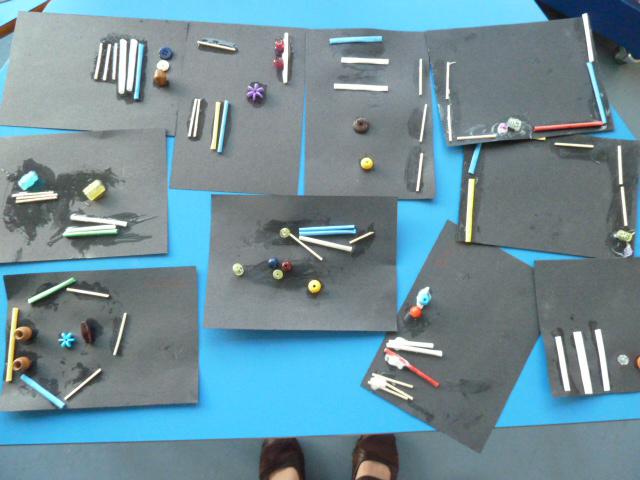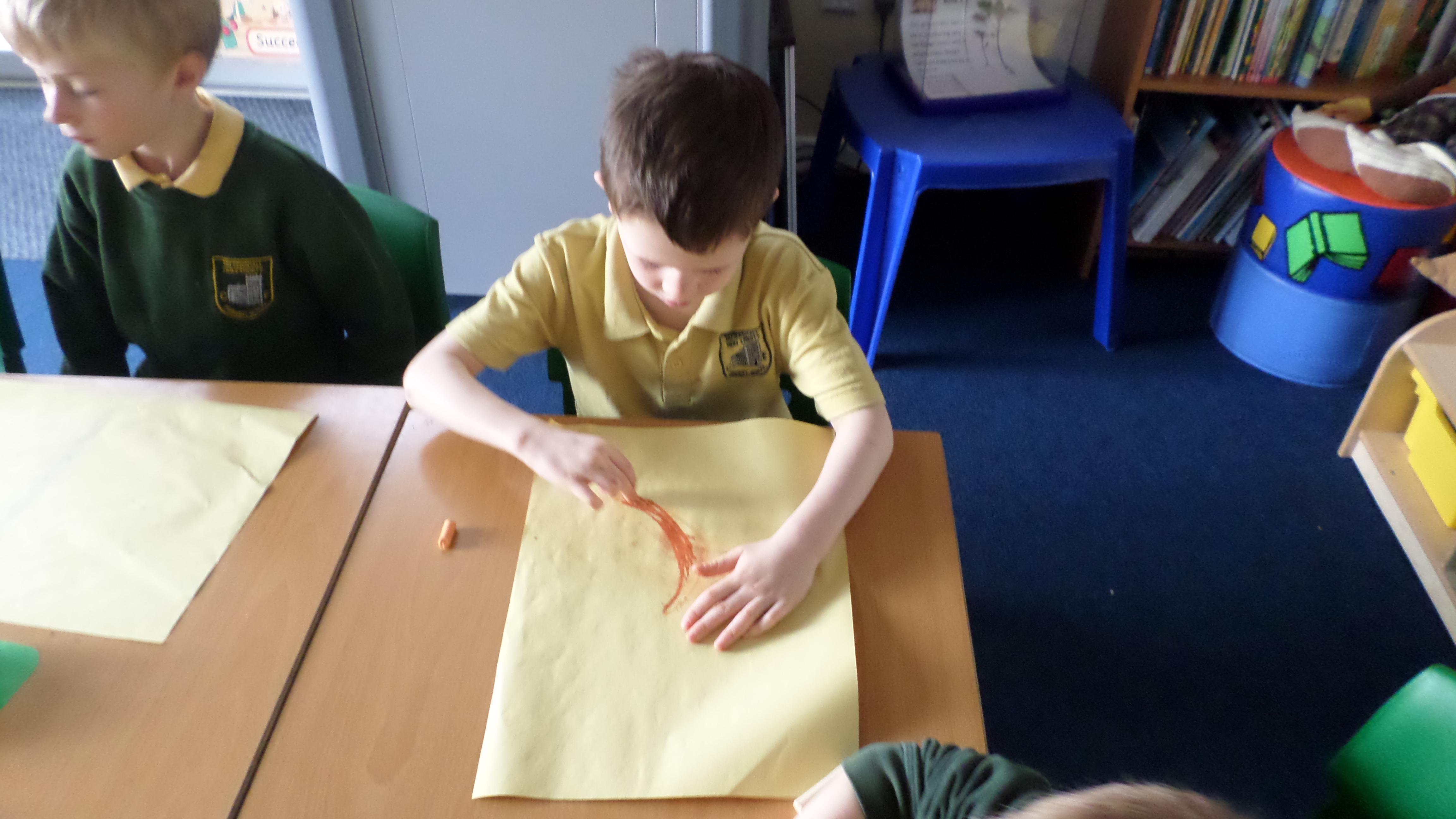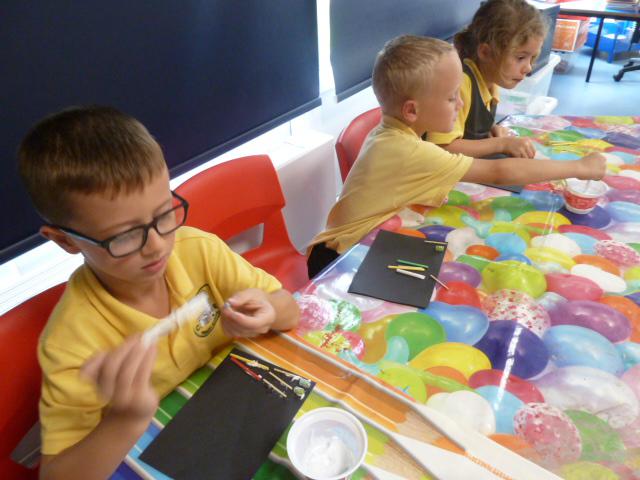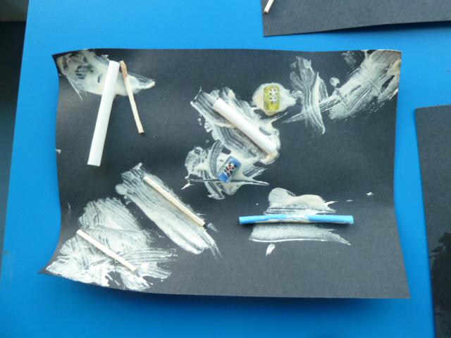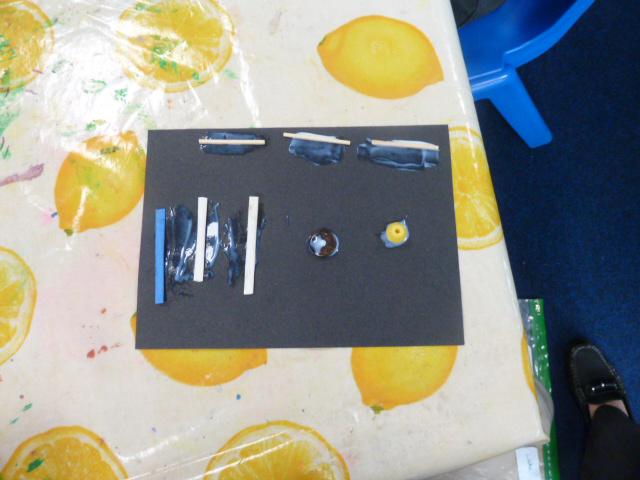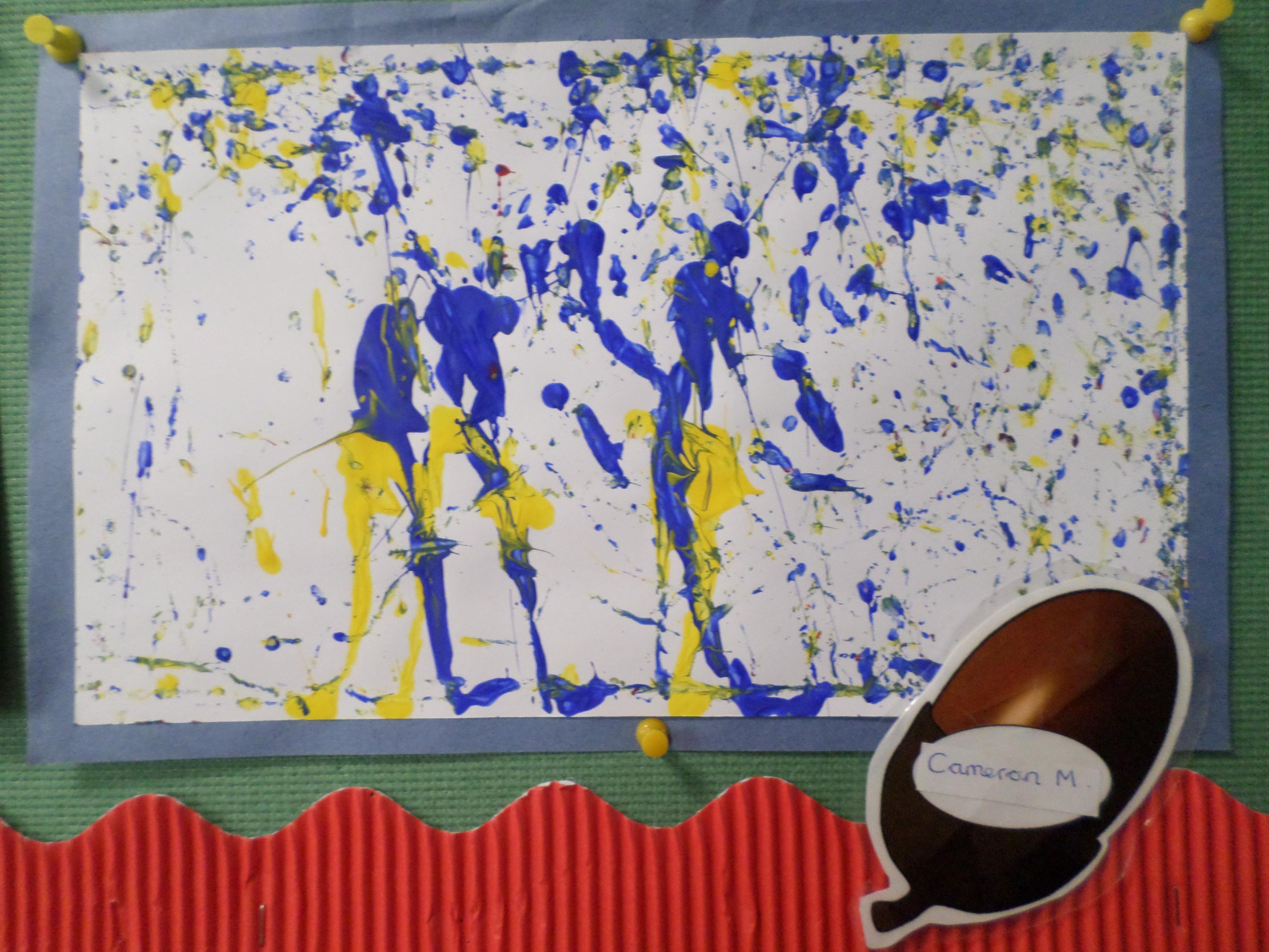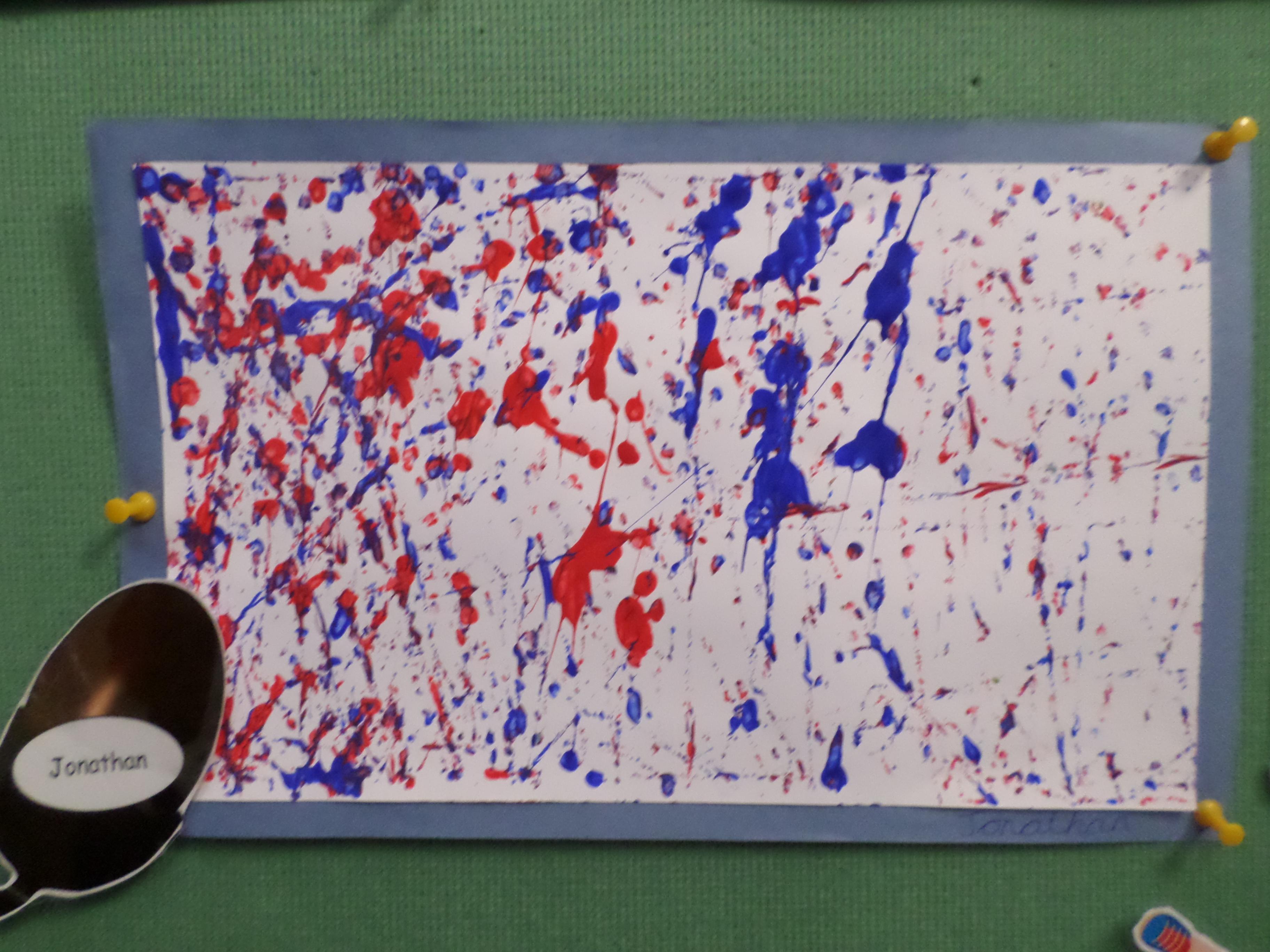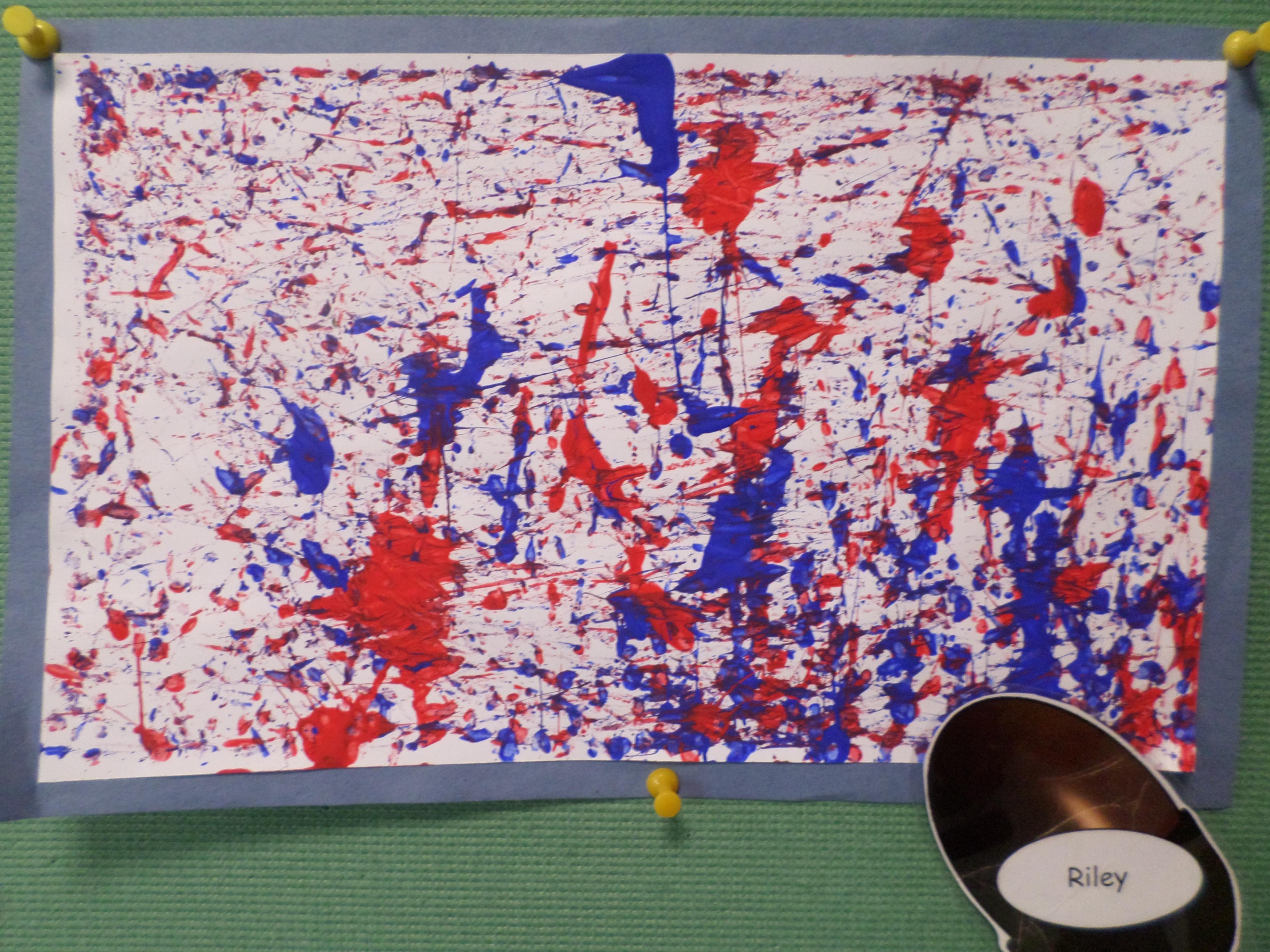 We put painted marbles in shoe boxes and shook them to make them bounce about inside. This created a piece of art work inspired by the work of artist Jackson Pollock. We only chose two or three colours so that the mixing action created further colours.