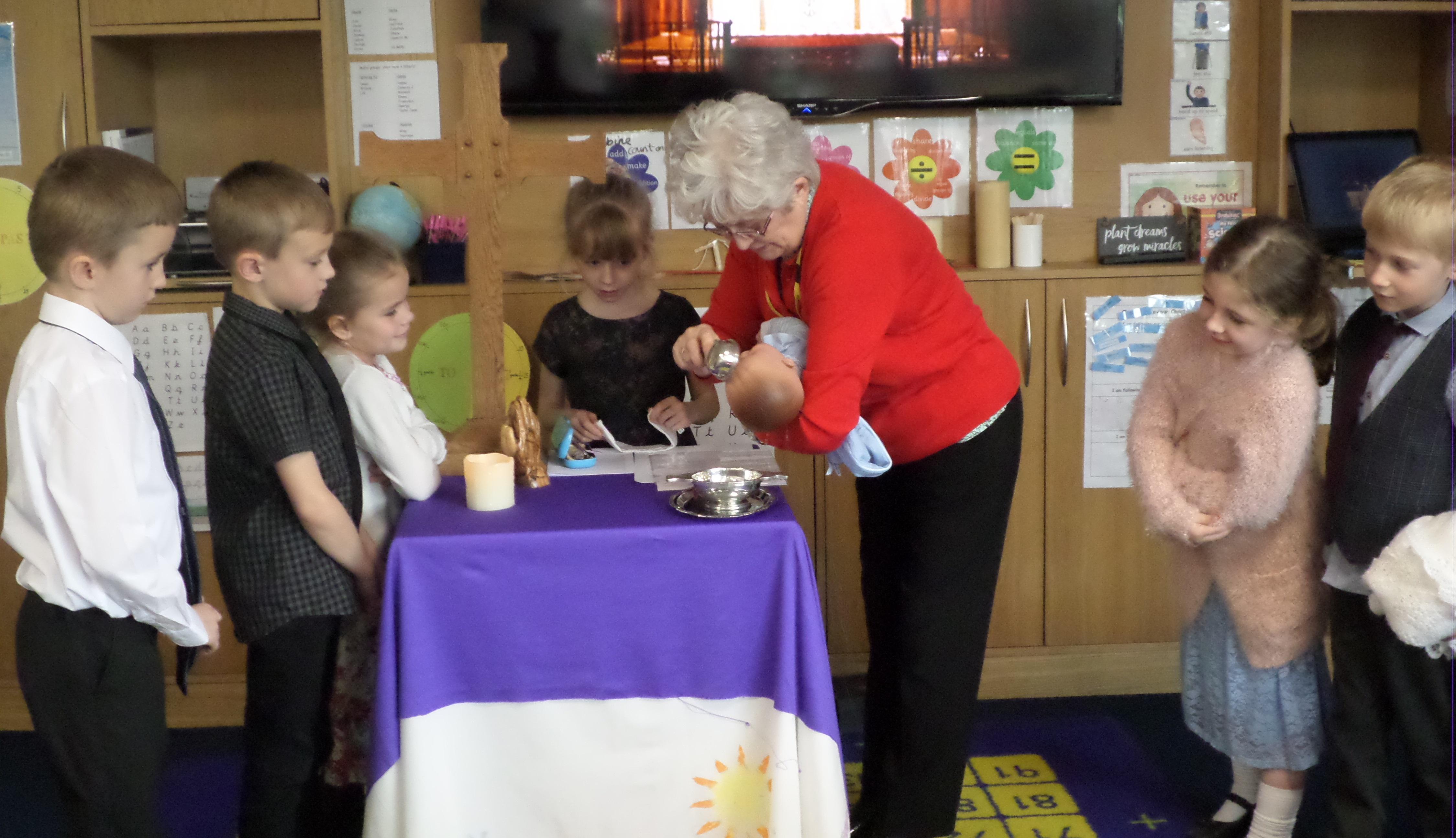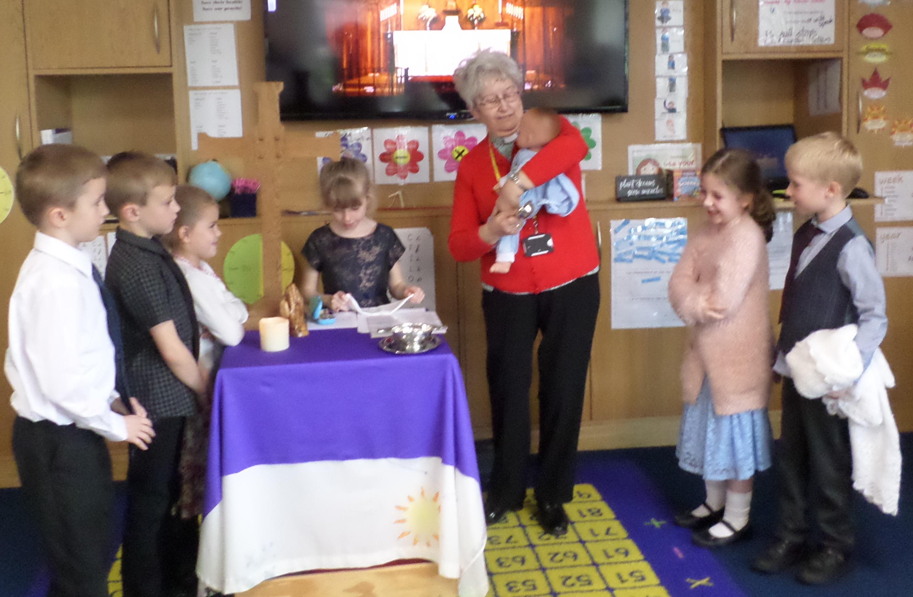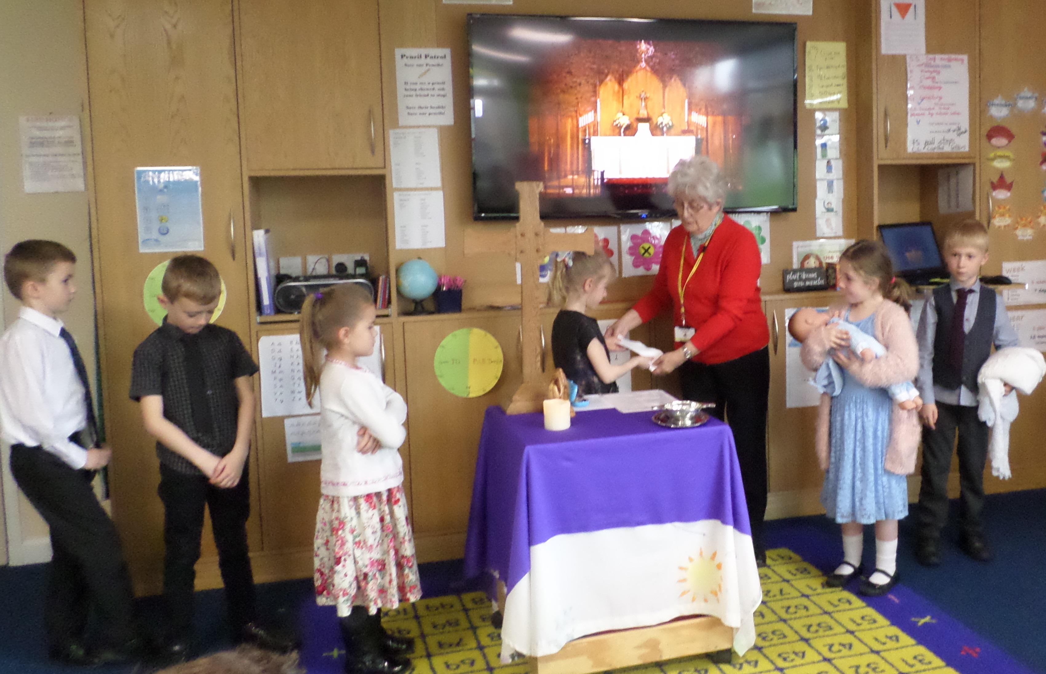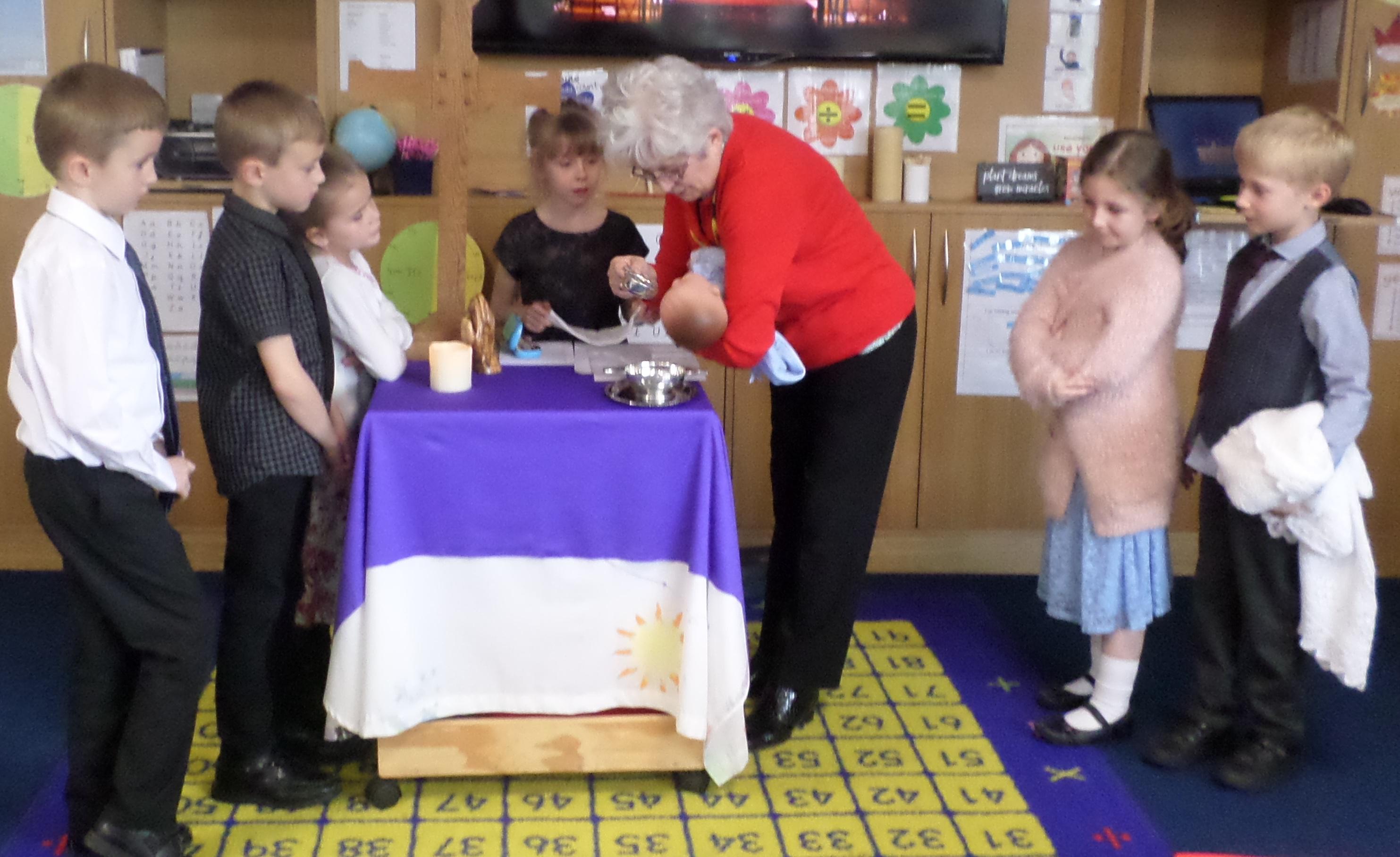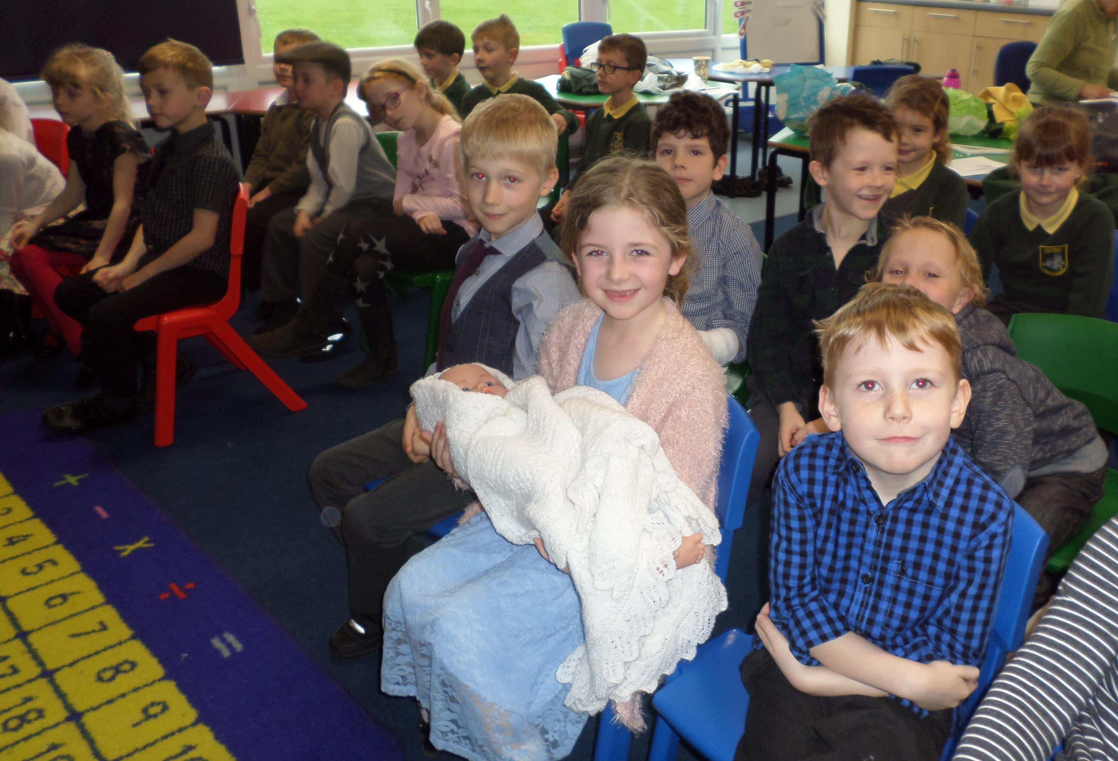 As part of our RE topic of Belonging Oak Class held a mock christening. We were supposed to go to church but, because of the weather, Reverend Margaret very kindly came to us. We dressed up in our best clothes and had parents, god parents and family for the baby, who we called Luke. The service was just like a real one with readings, making promises, the water was blessed, the actual baptism of Luke (who was very well behaved and didn't cry!), lighting the candle and then prayers. The parents were very proud! A huge thank you to Reverend Margaret for making it such a fantastic event.