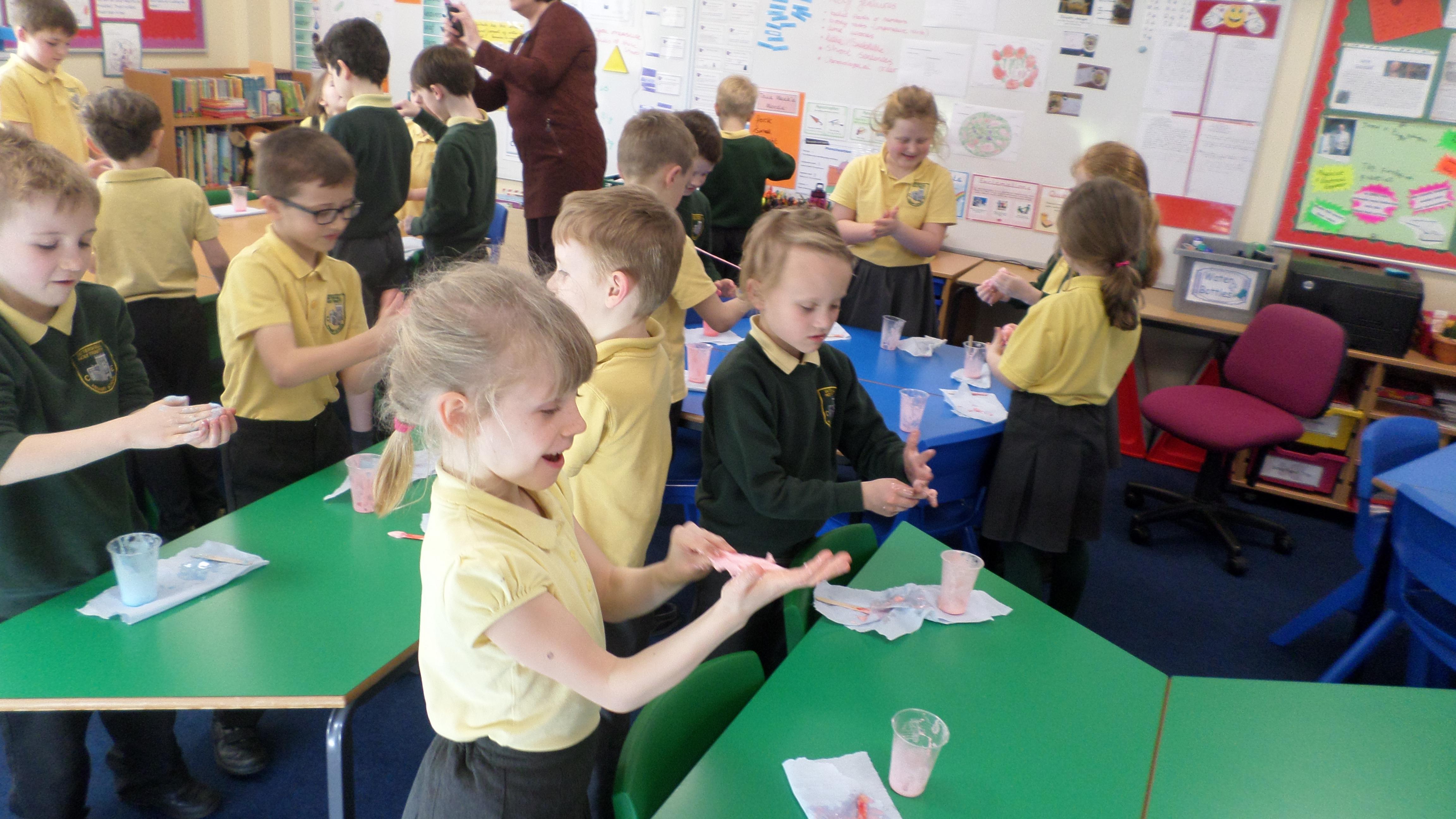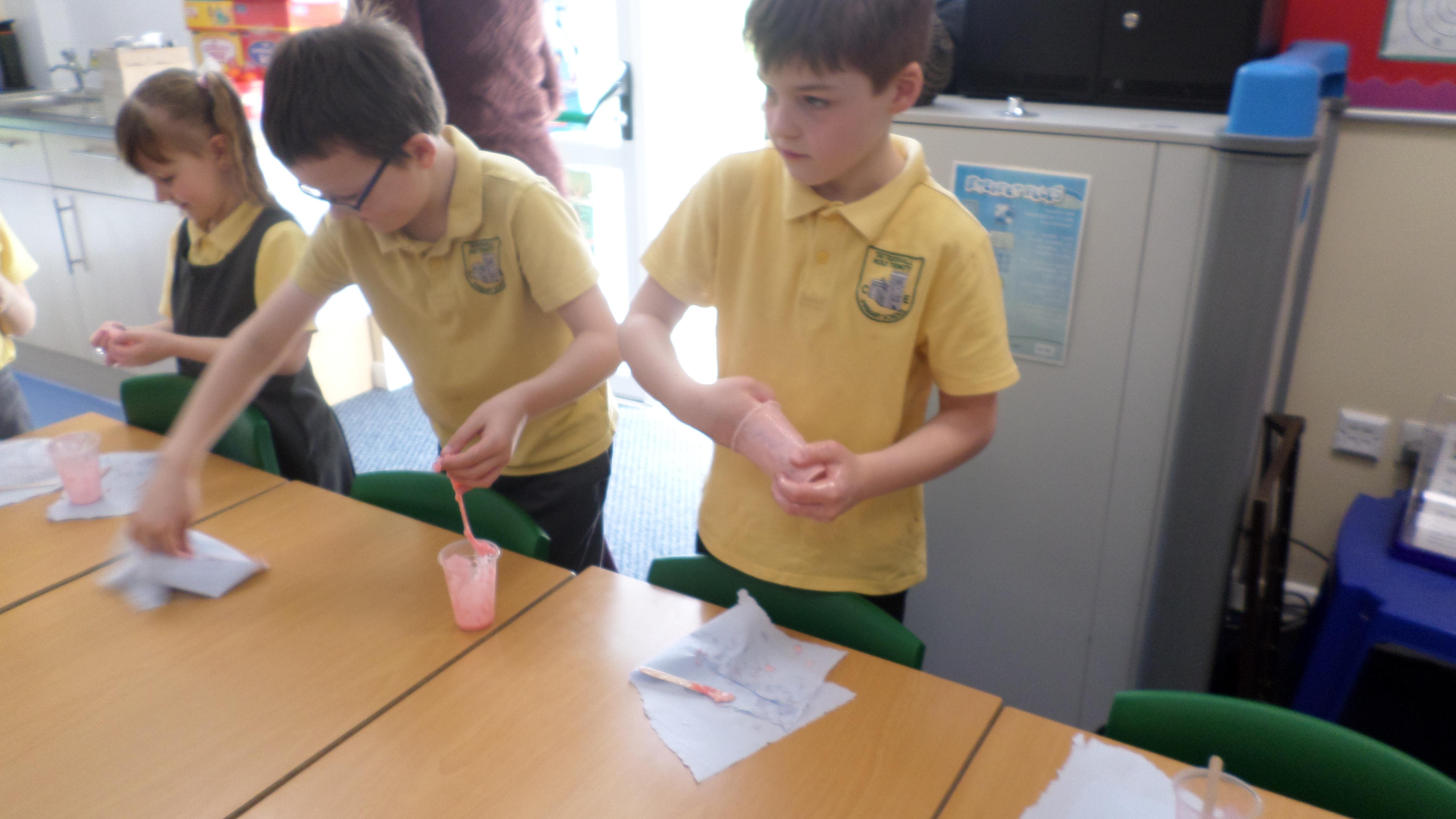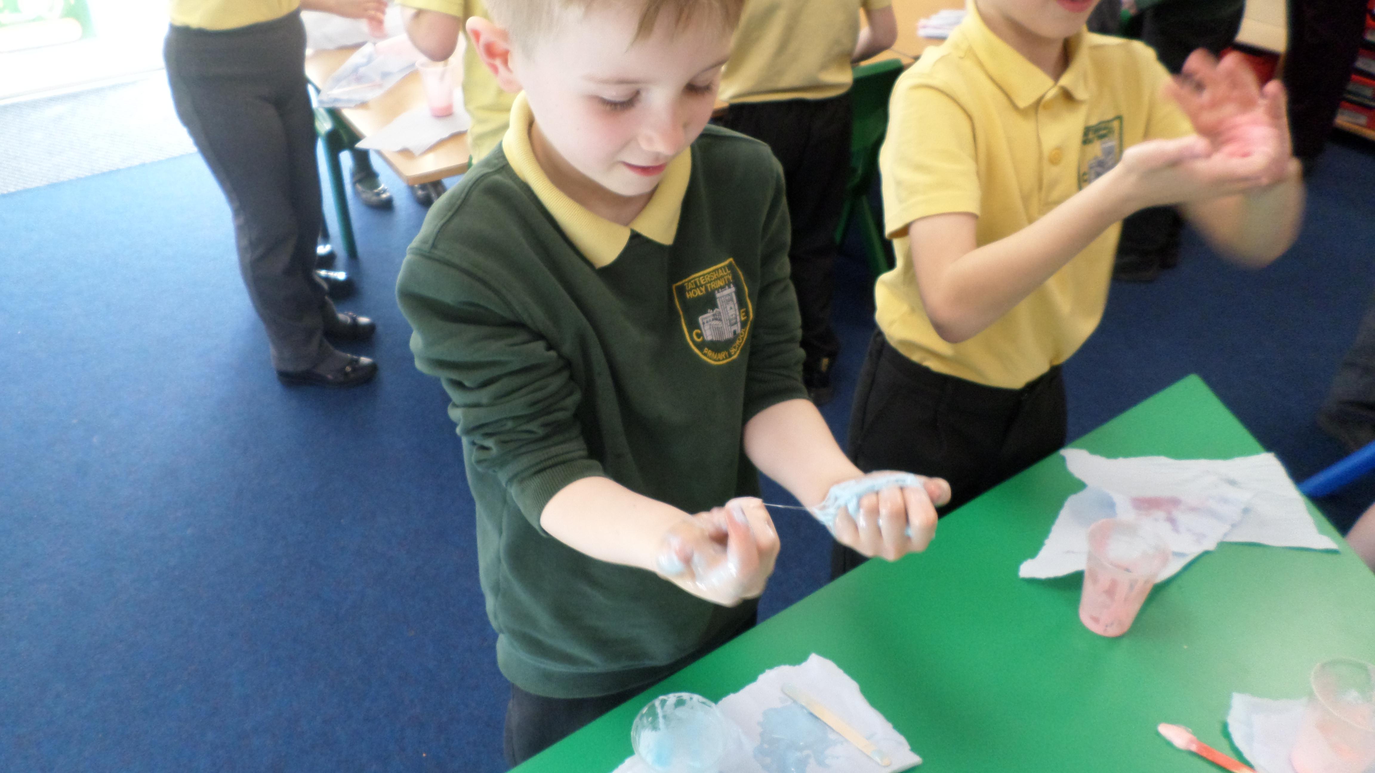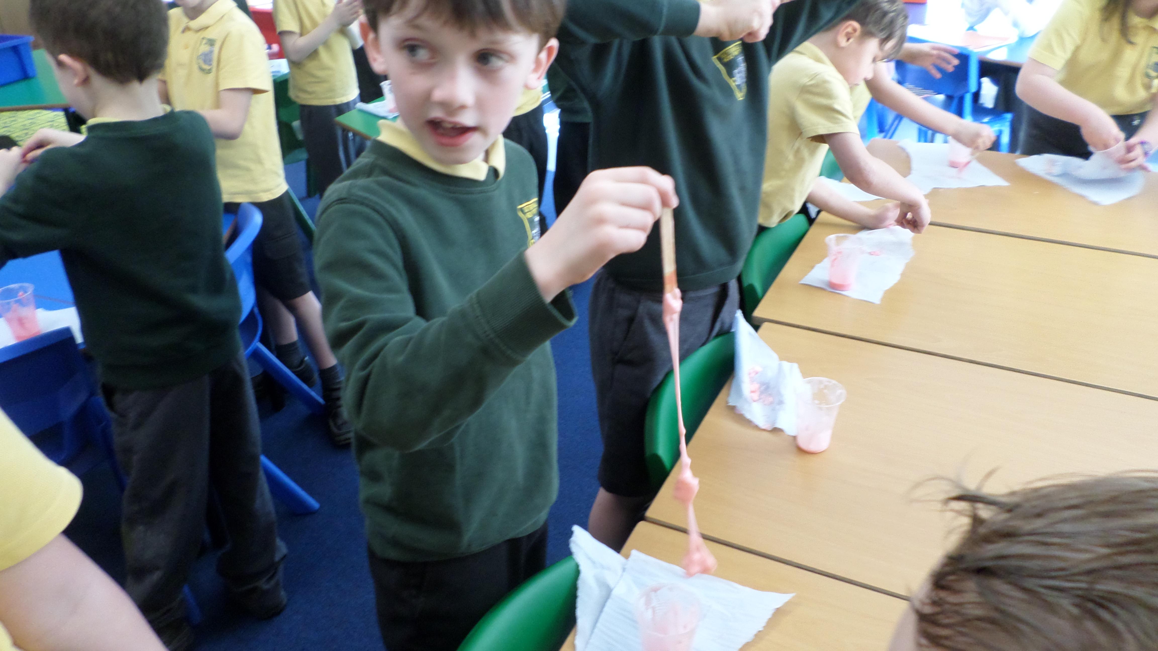 The year 3 pupils in Oak took part in an investigation this week to determine whether custard was a liquid. They started by watching a film of a man walking on custard - honestly! This really made them keen to find out what custard is like. After making a bowl of custard, they put in through a number of tests and compared it to water. The tests were very messy, but very interesting. The most exciting one was handling the custard. They discovered that if you keep it rolling in your hand, it behaved like a solid, however the second you stopped it moving, it became runny like a liquid. This makes custard a colloid - another new word for their science dictionaries!