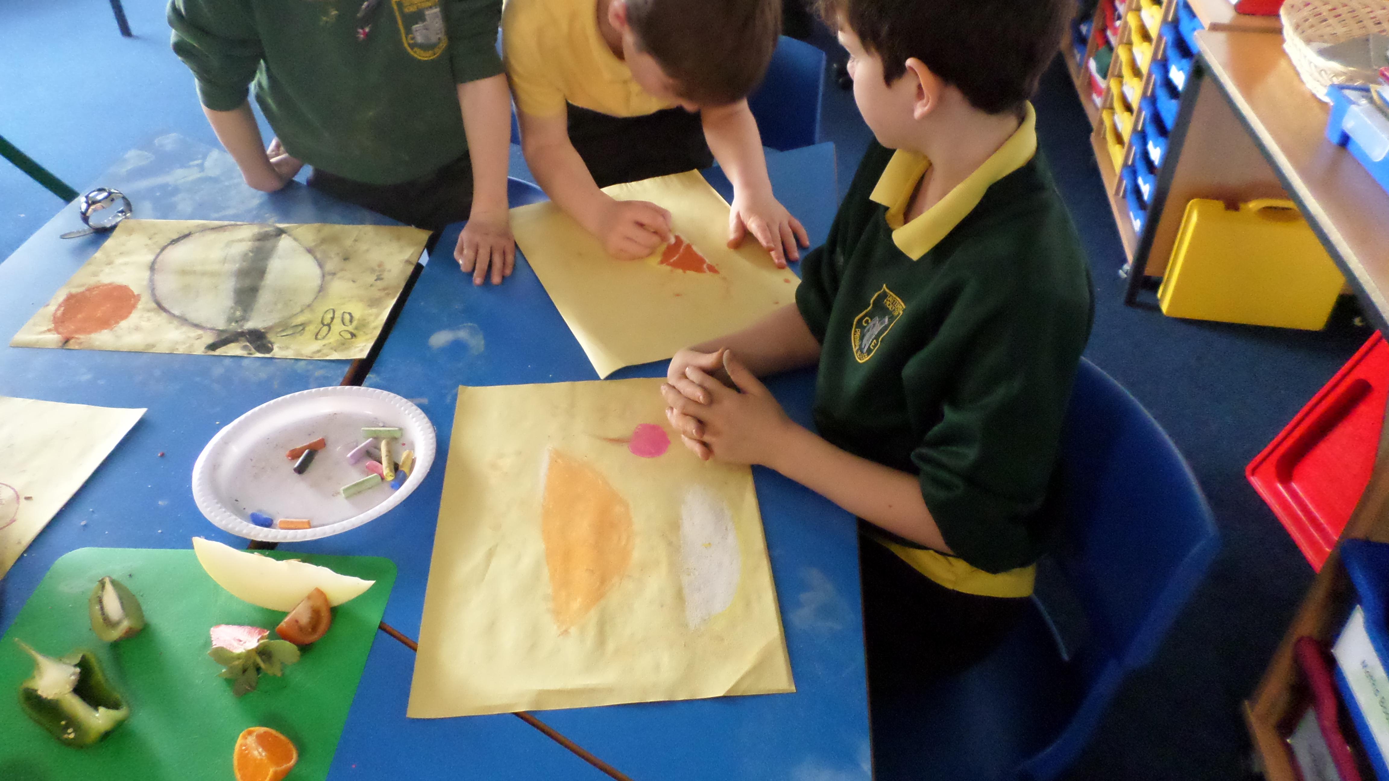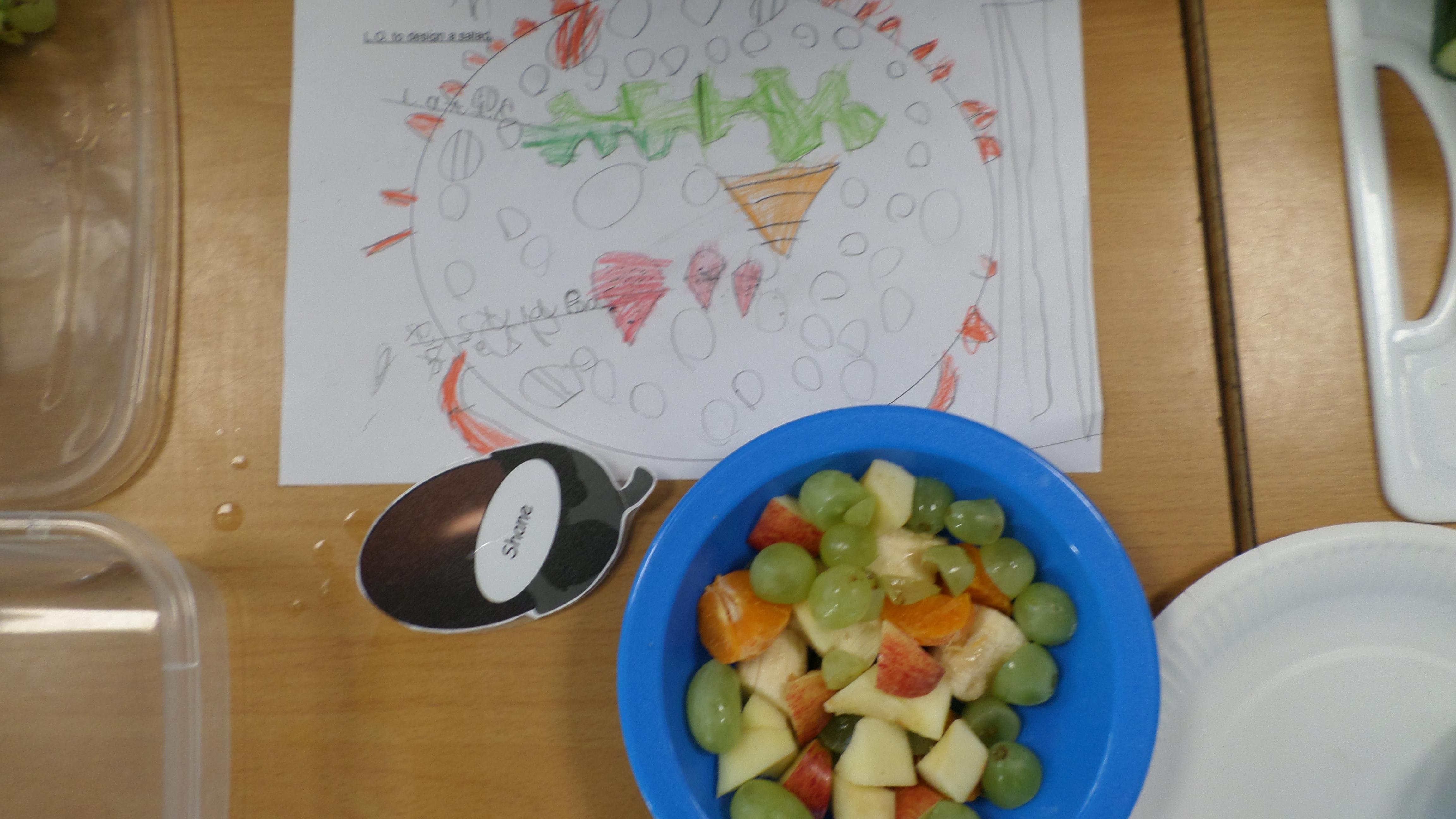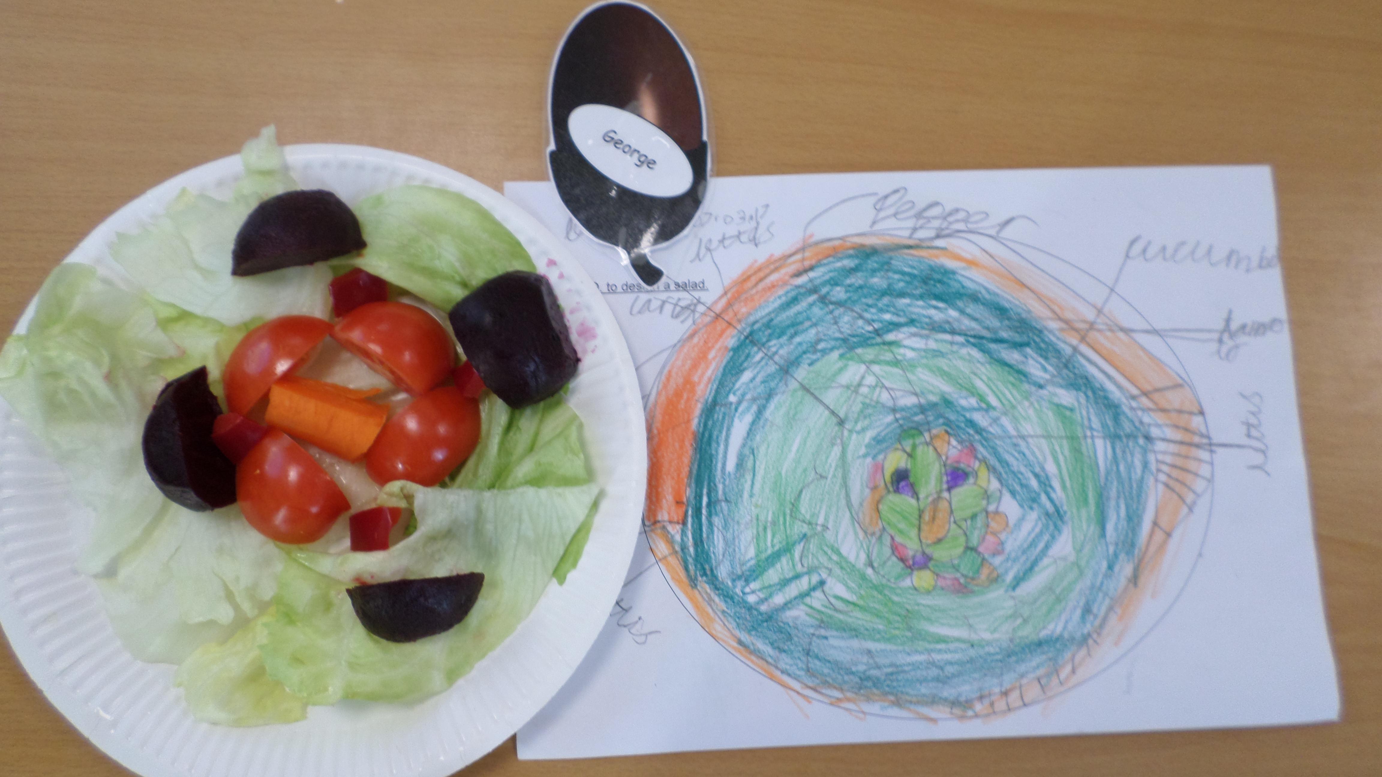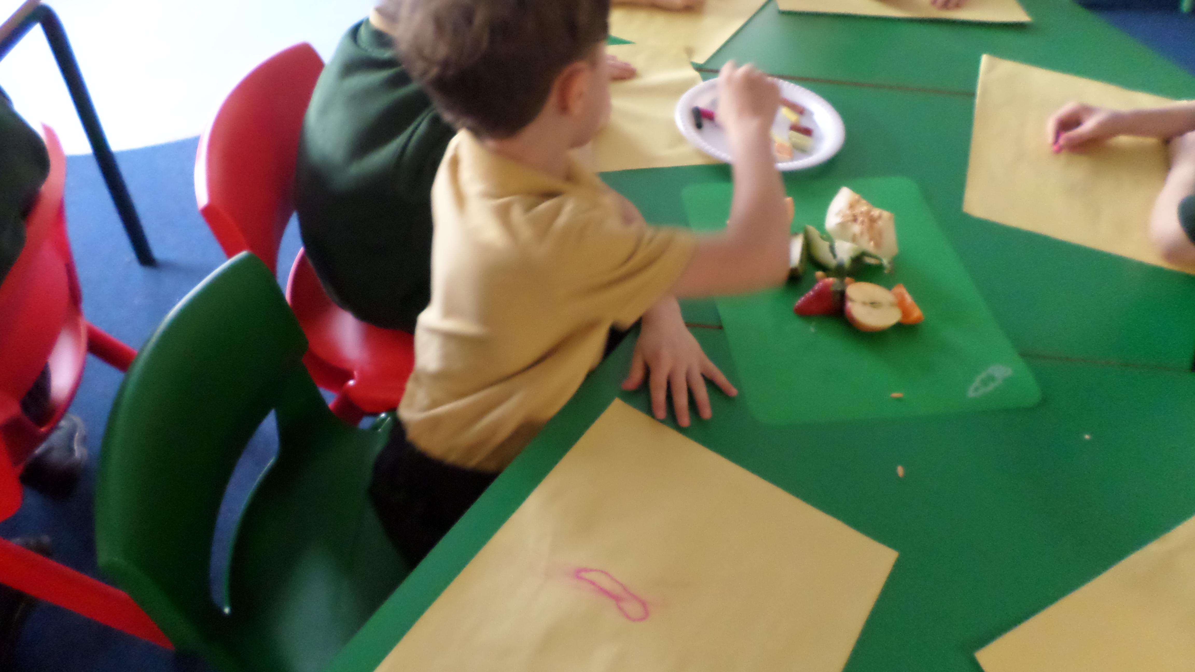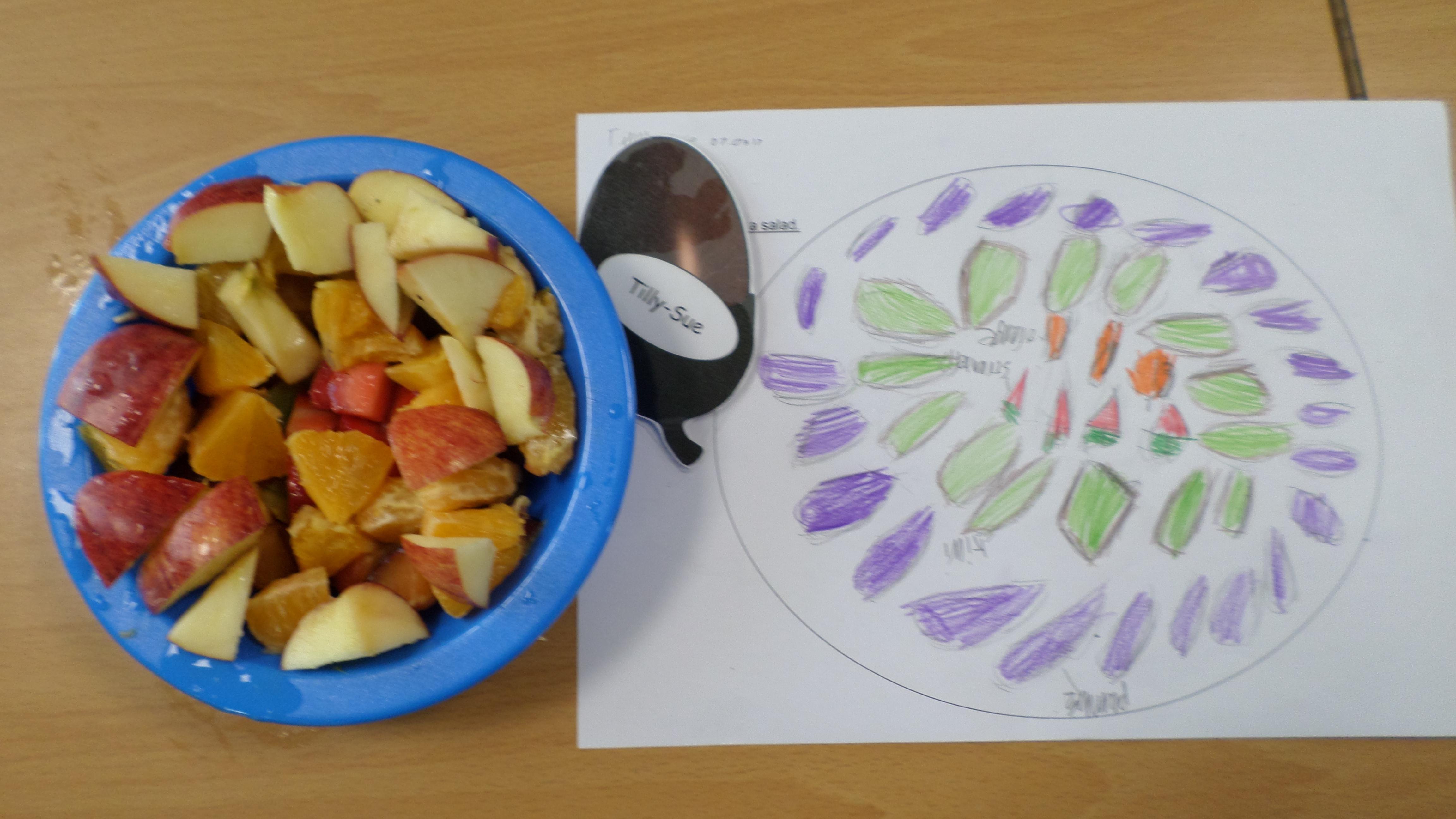 As part of our preparation for making a salad the children used pastels to create 'fruit and veg' art. The different varieties of fruit and vegetables were cut up in interesting ways so the children could study the different seed patterns, colours and textures and then create a pastel picture to show what they observed. Very messy, but some fantastic work too!