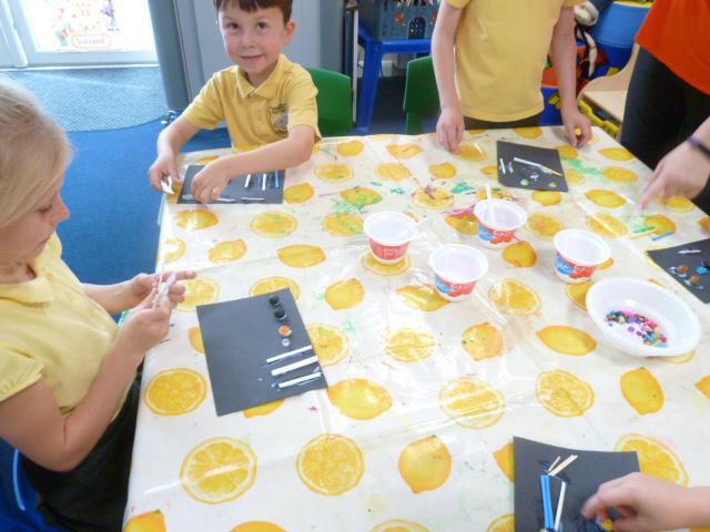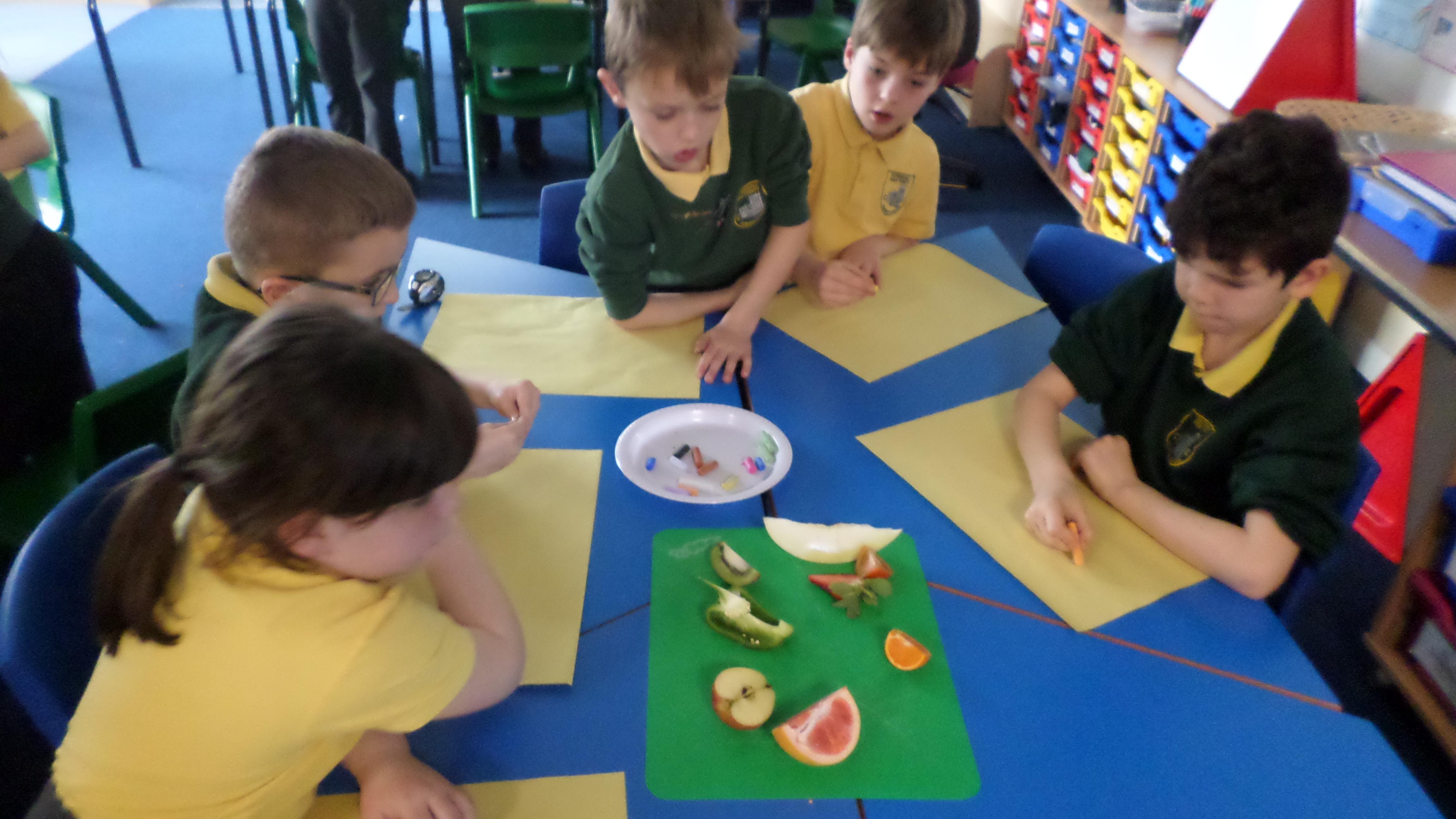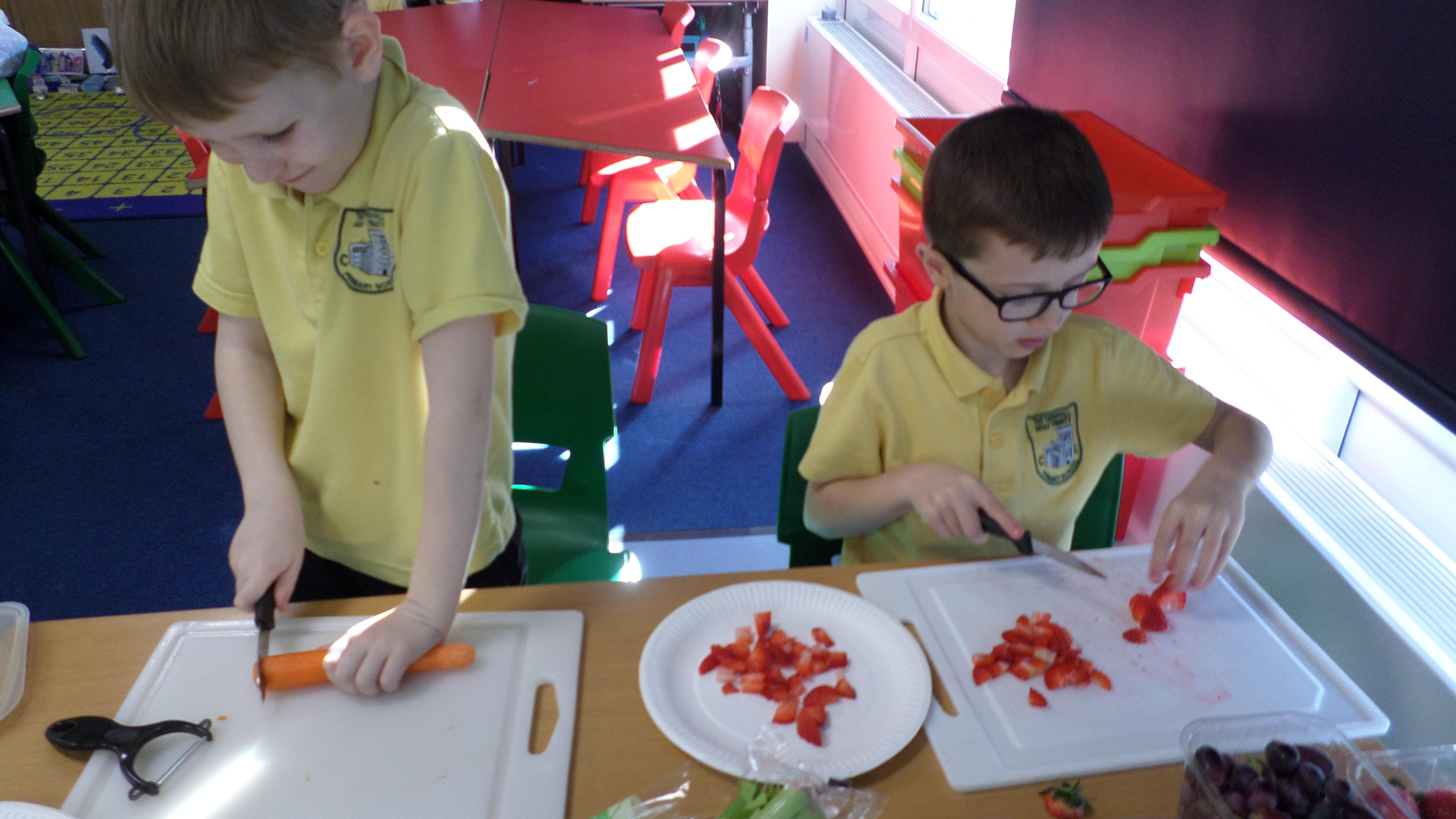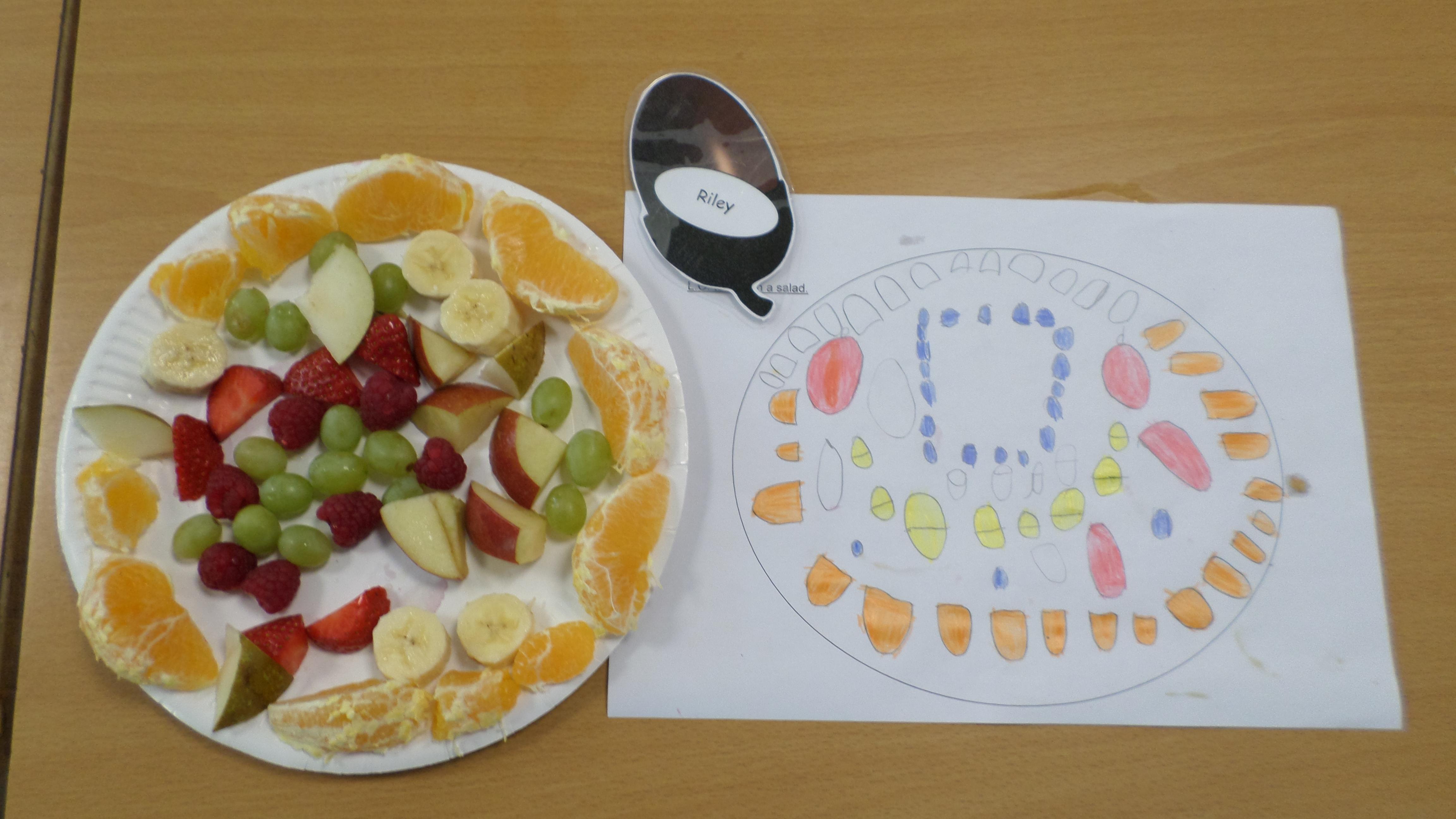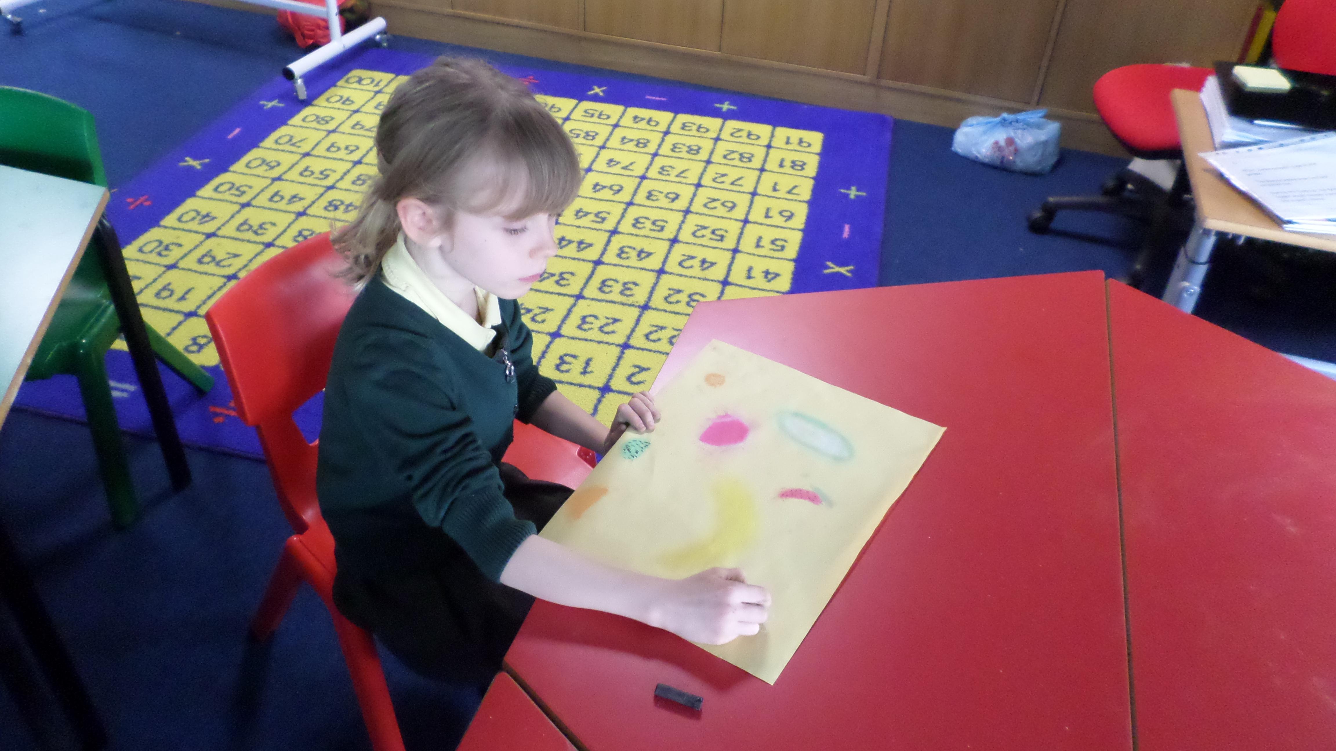 As part of our preparation for making a salad the children used pastels to create 'fruit and veg' art. The different varieties of fruit and vegetables were cut up in interesting ways so the children could study the different seed patterns, colours and textures and then create a pastel picture to show what they observed. Very messy, but some fantastic work too!