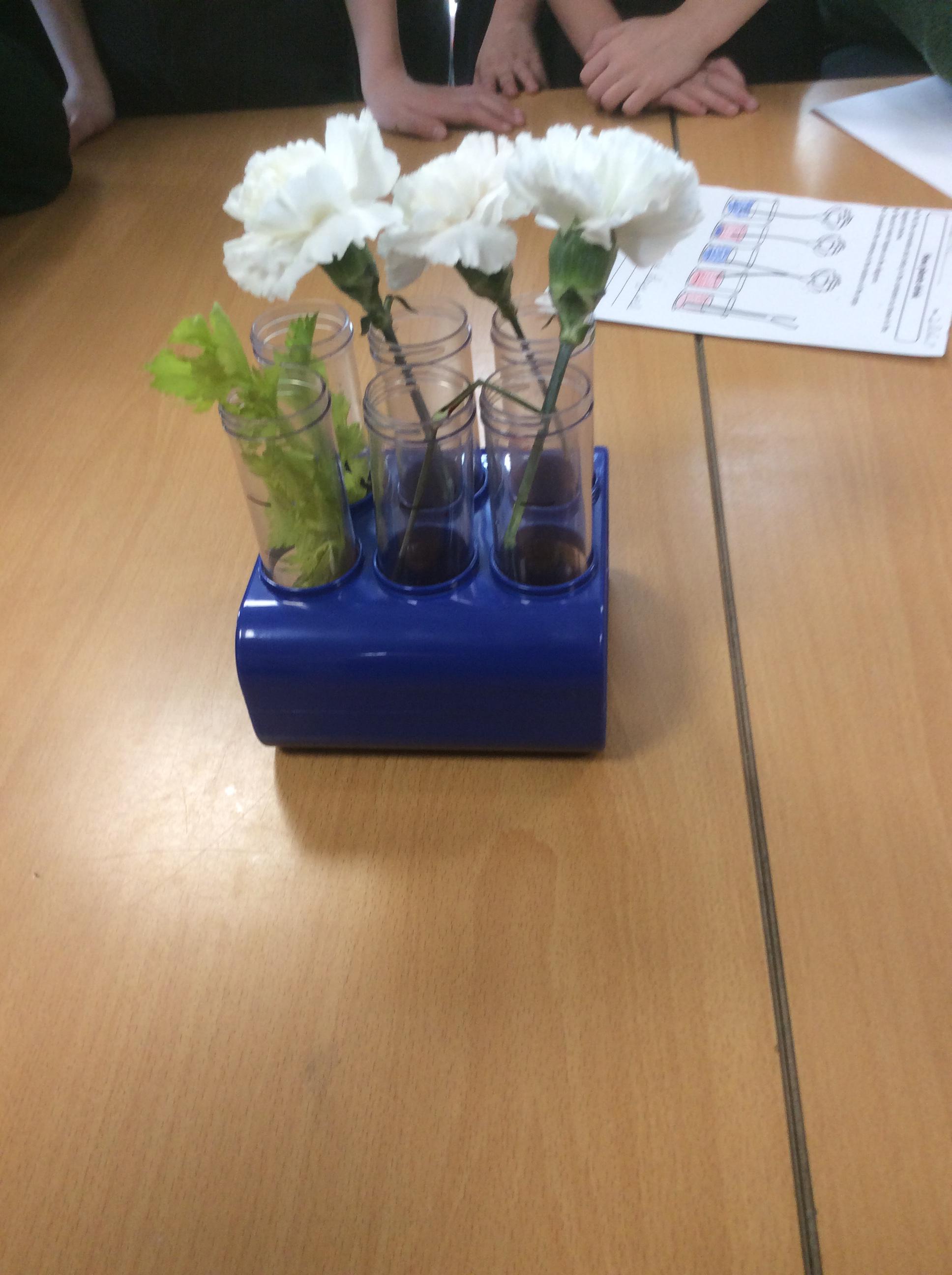 This was the question Oak Class tried to answer this week. To find out we used food colouring in water and white carnations. We observed closely and after a couple of days the petals of the white carnation had turned pink. The coloured water from the test tube had travelled all the way up the stem to the petals. Amazing! However, the blue food colouring did not work in the same way and the petals remained white. We are wondering why this has happened?