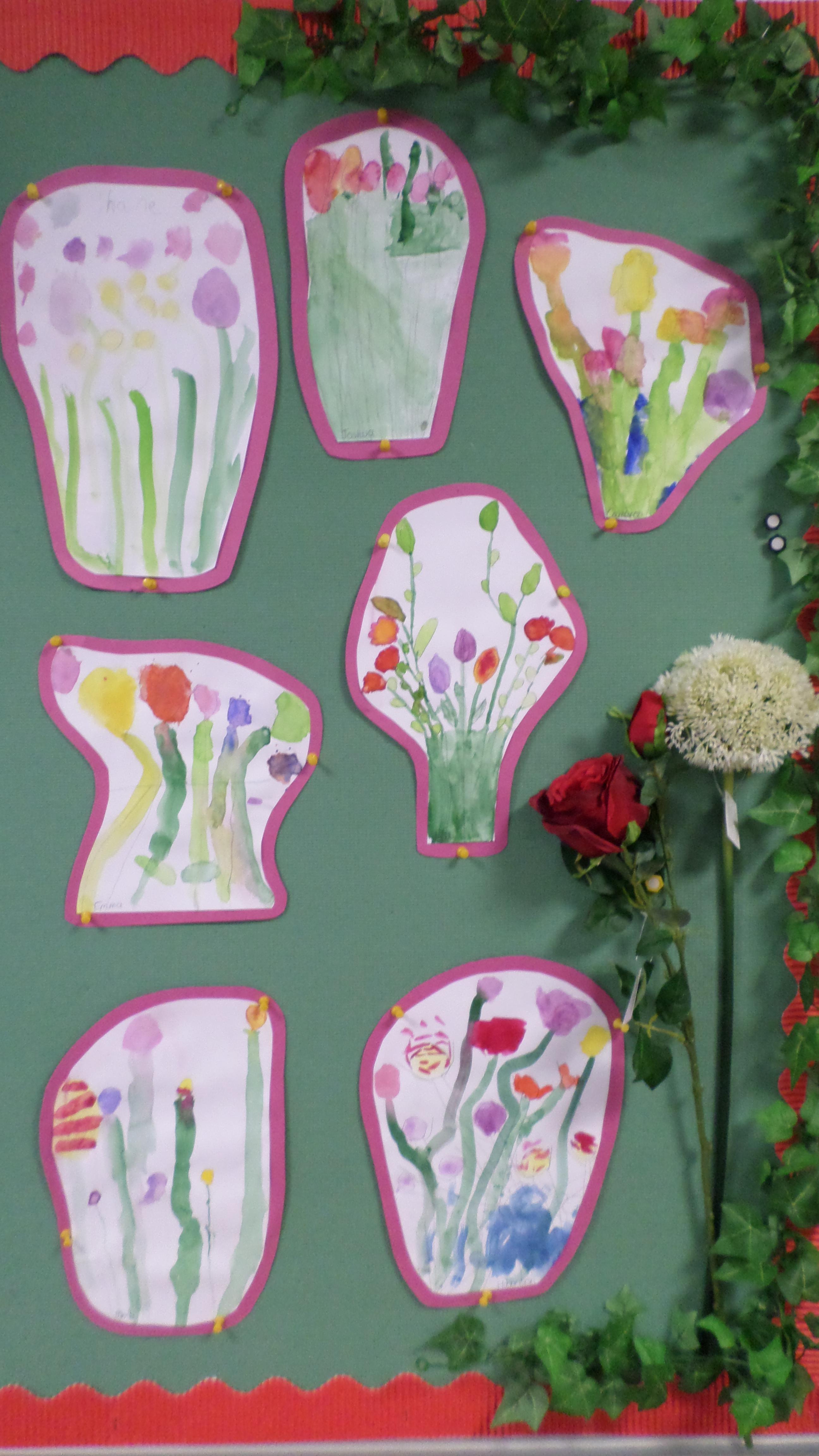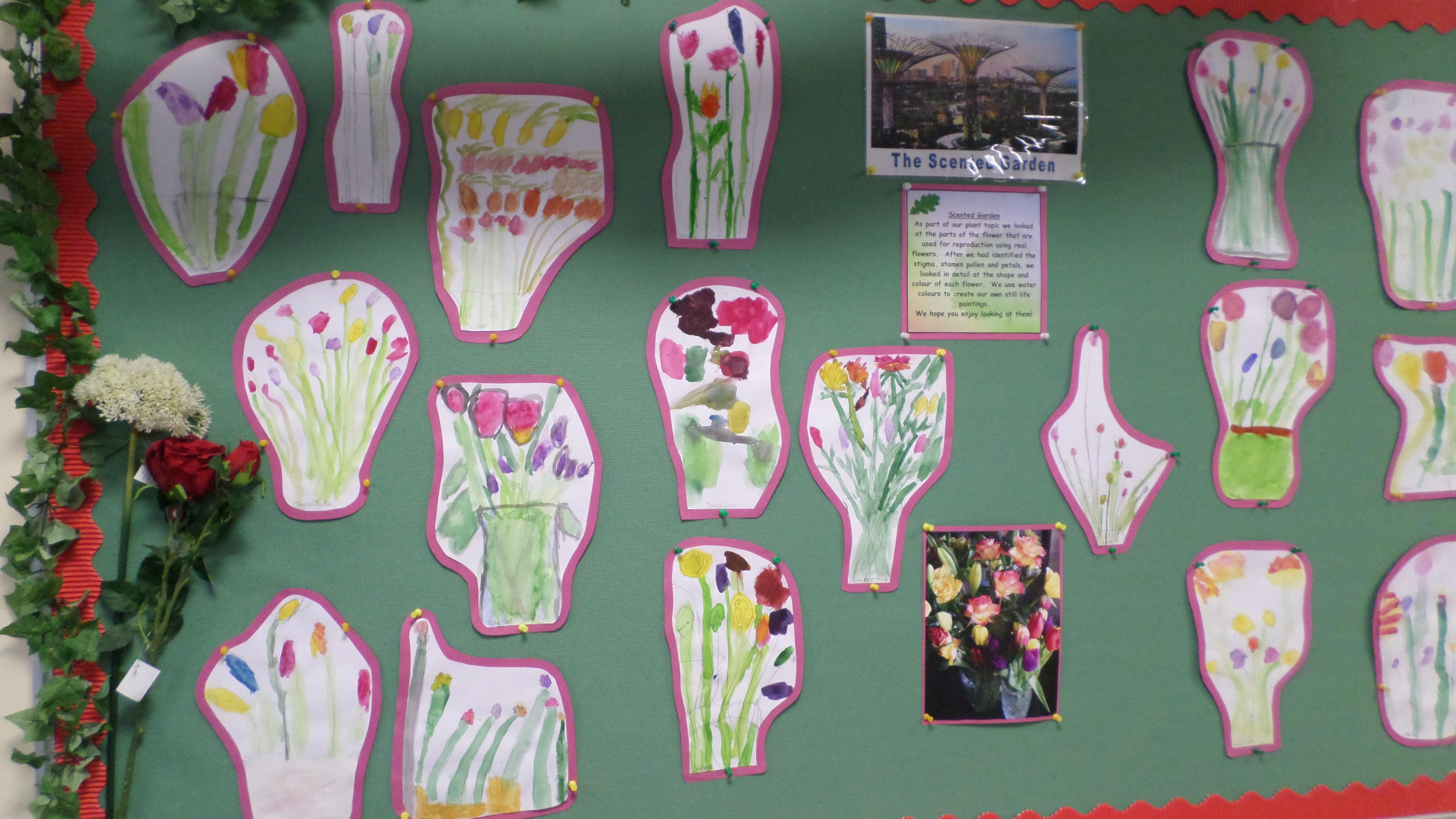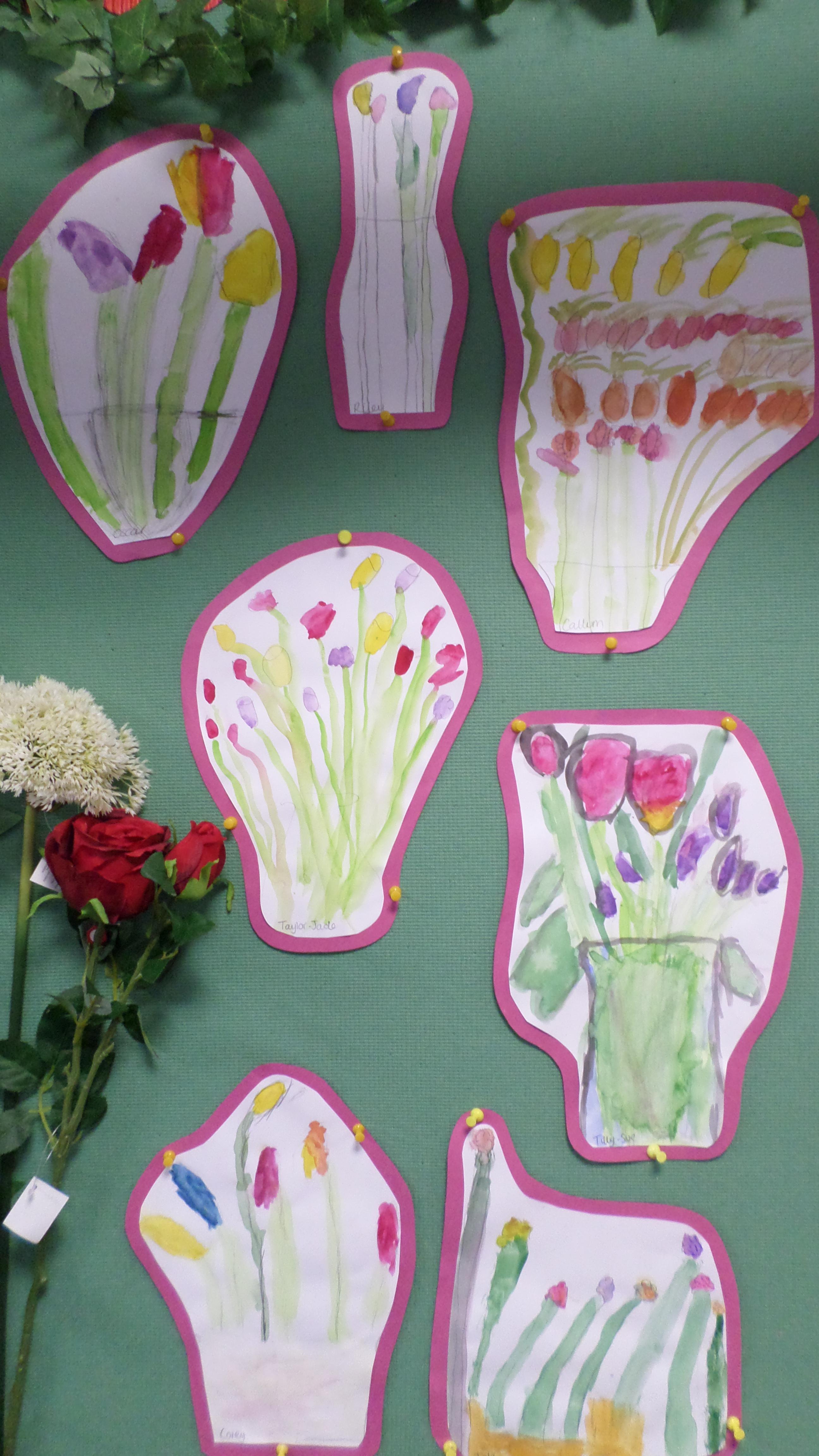 Following our science investigation into the parts of a flower, we painted our own still life flower water colours. First we sketched rough outlines, then we mixed and painted the colours we could see in the real bunch of flowers. Take a look at our fantastic art display!