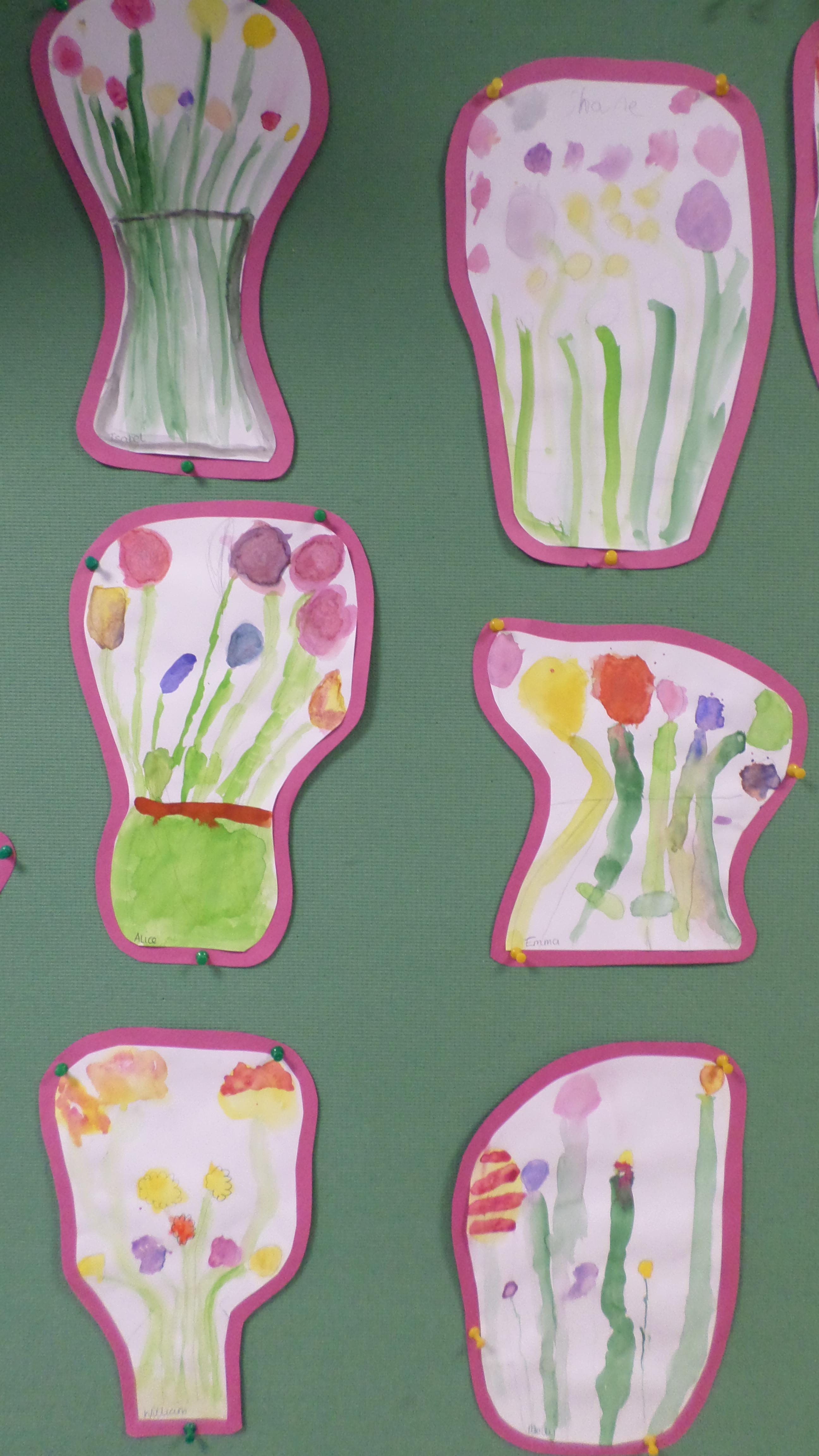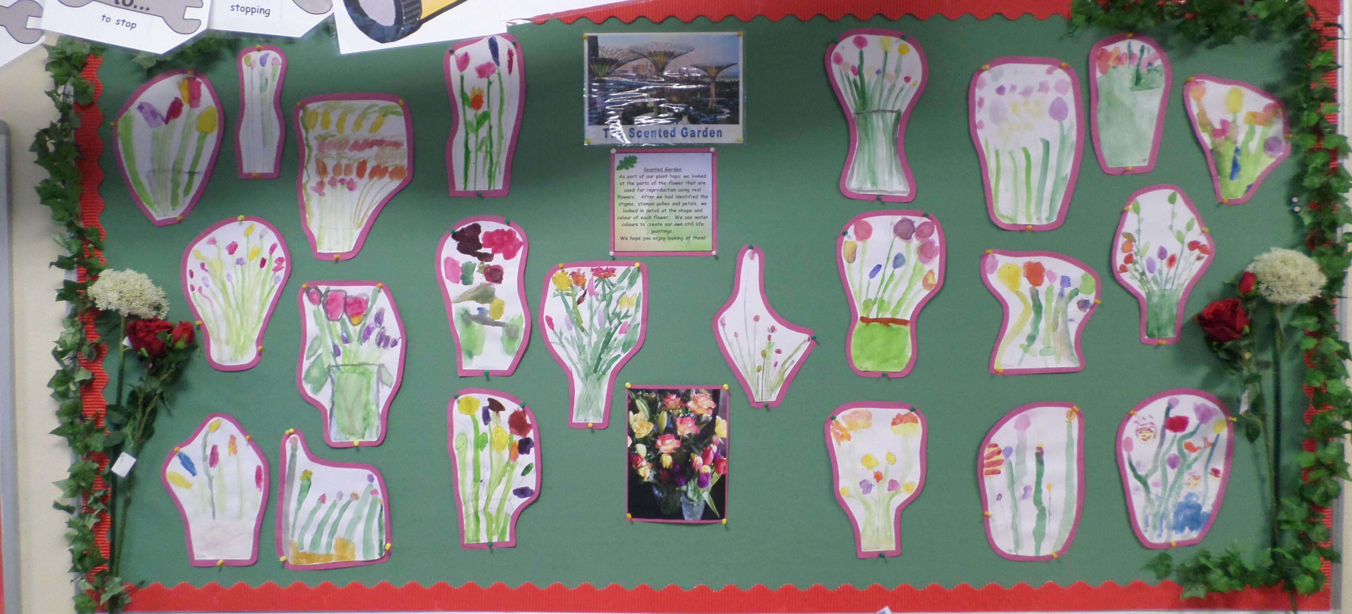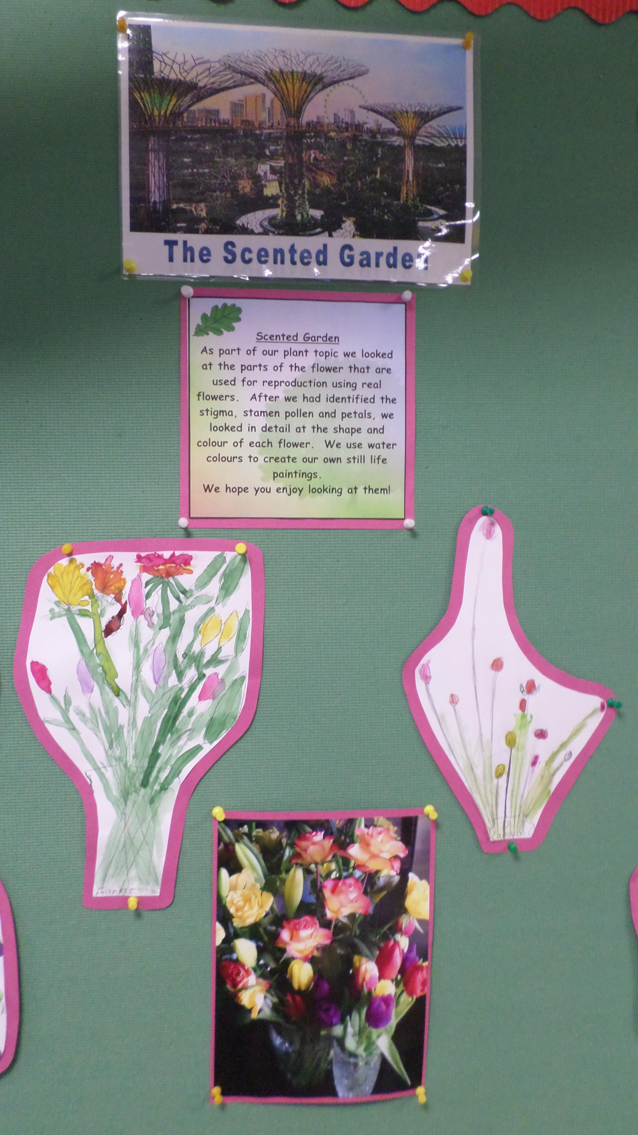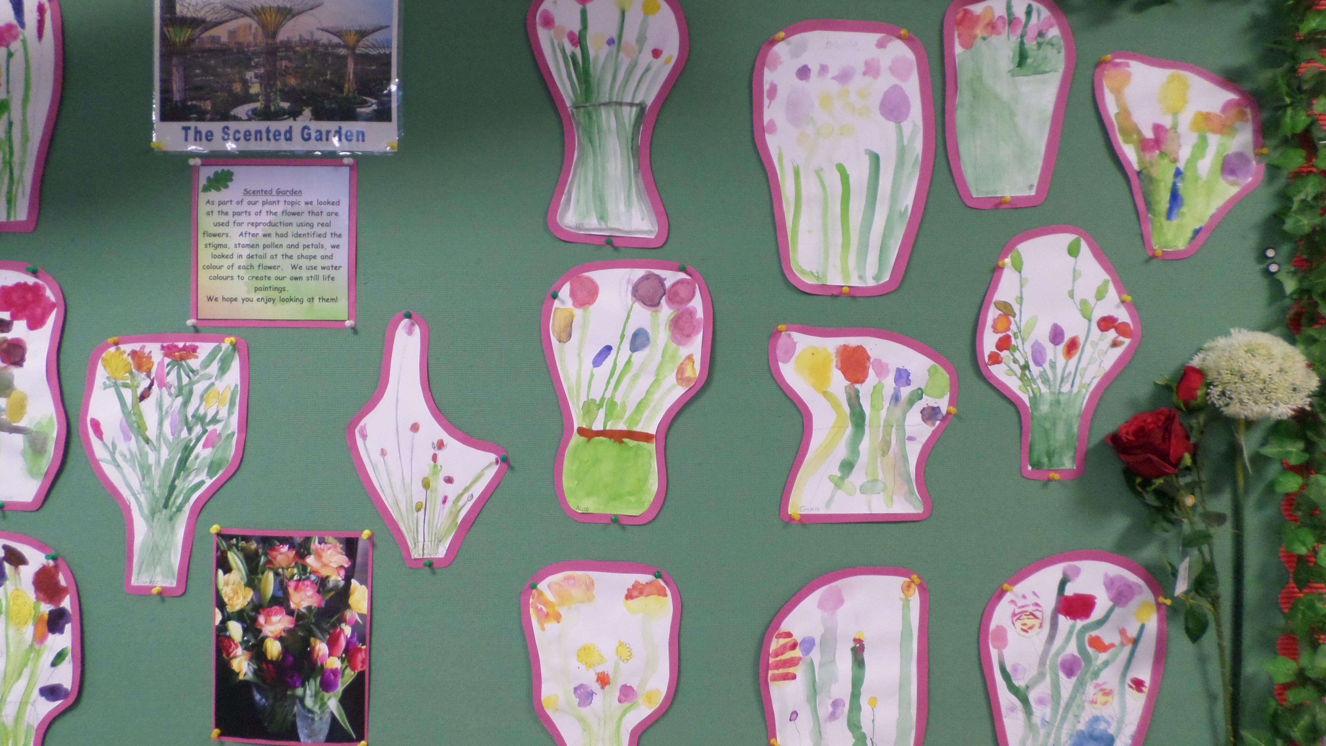 Following our science investigation into the parts of a flower, we painted our own still life flower water colours. First we sketched rough outlines, then we mixed and painted the colours we could see in the real bunch of flowers. Take a look at our fantastic art display!