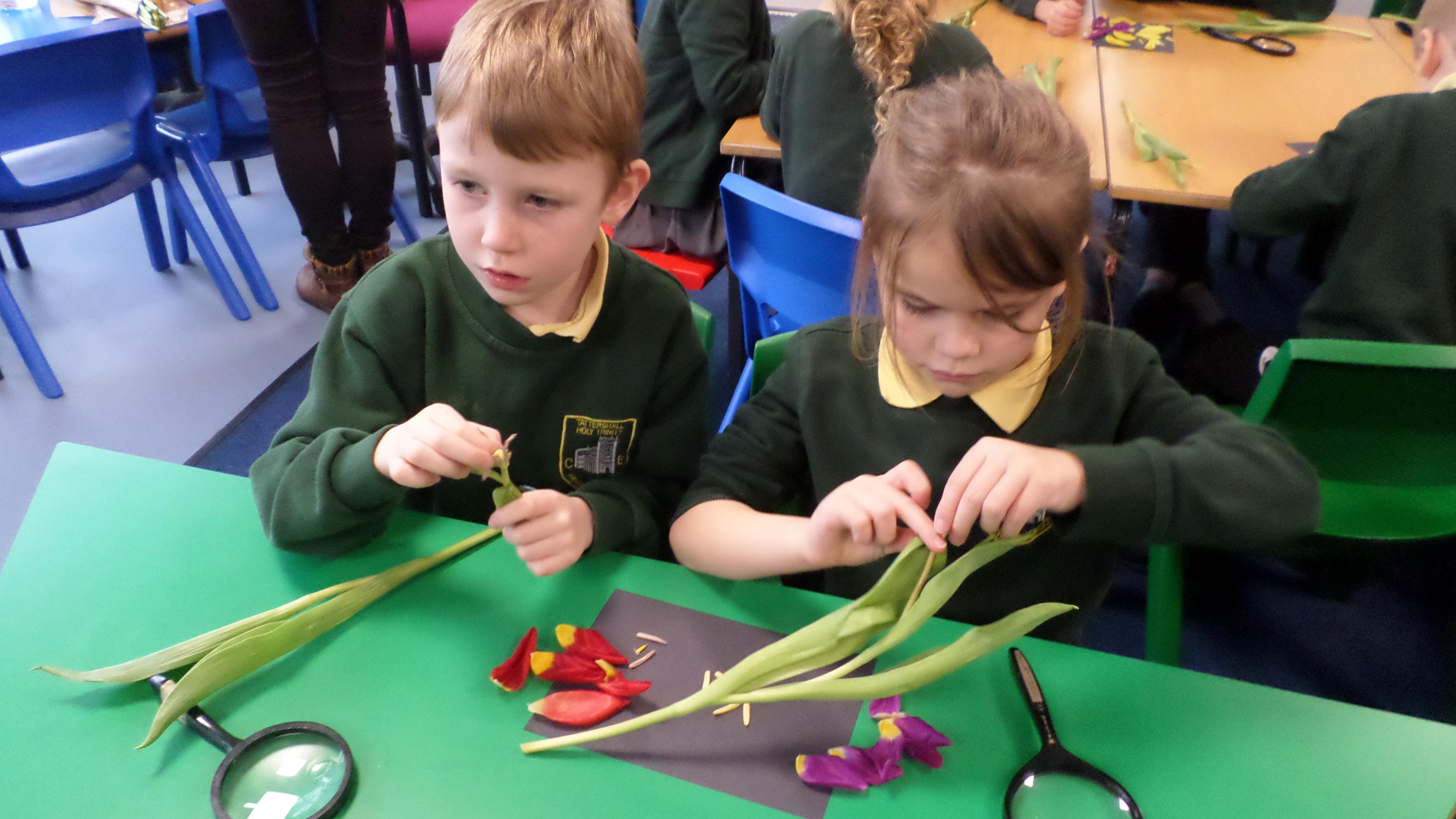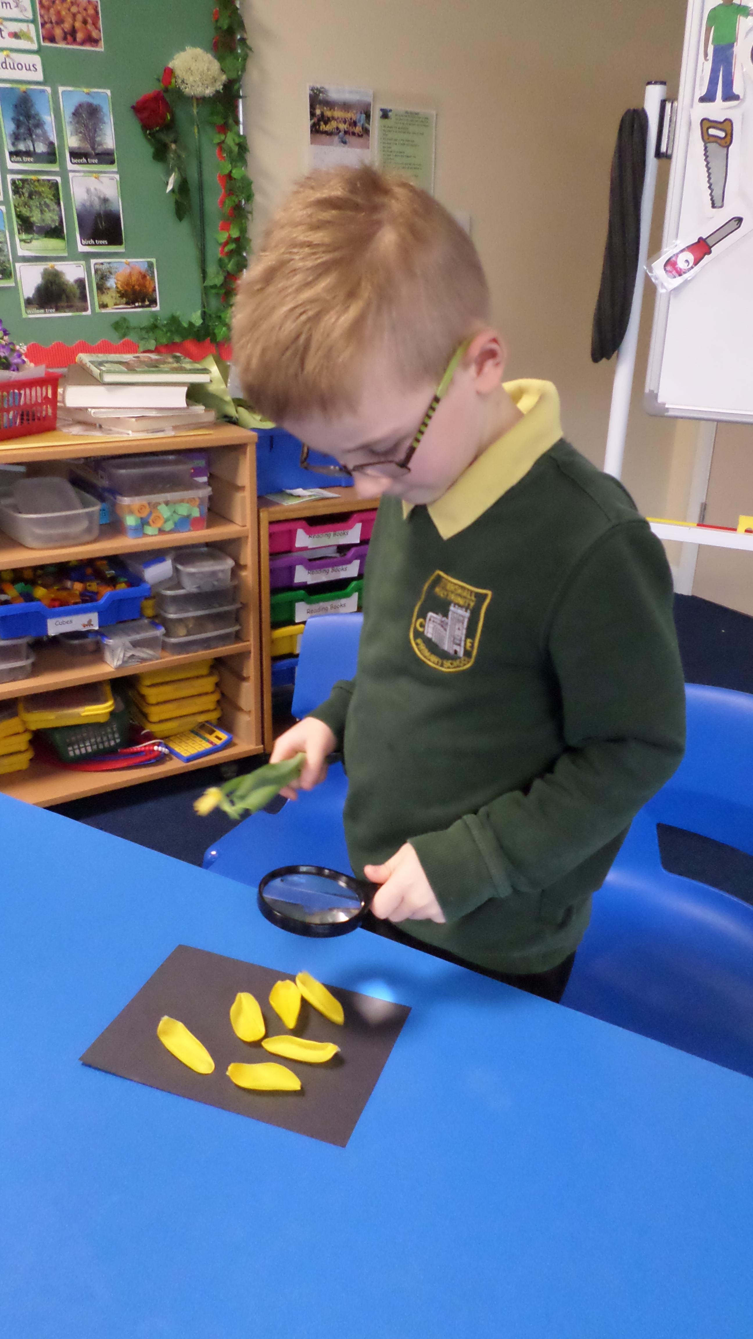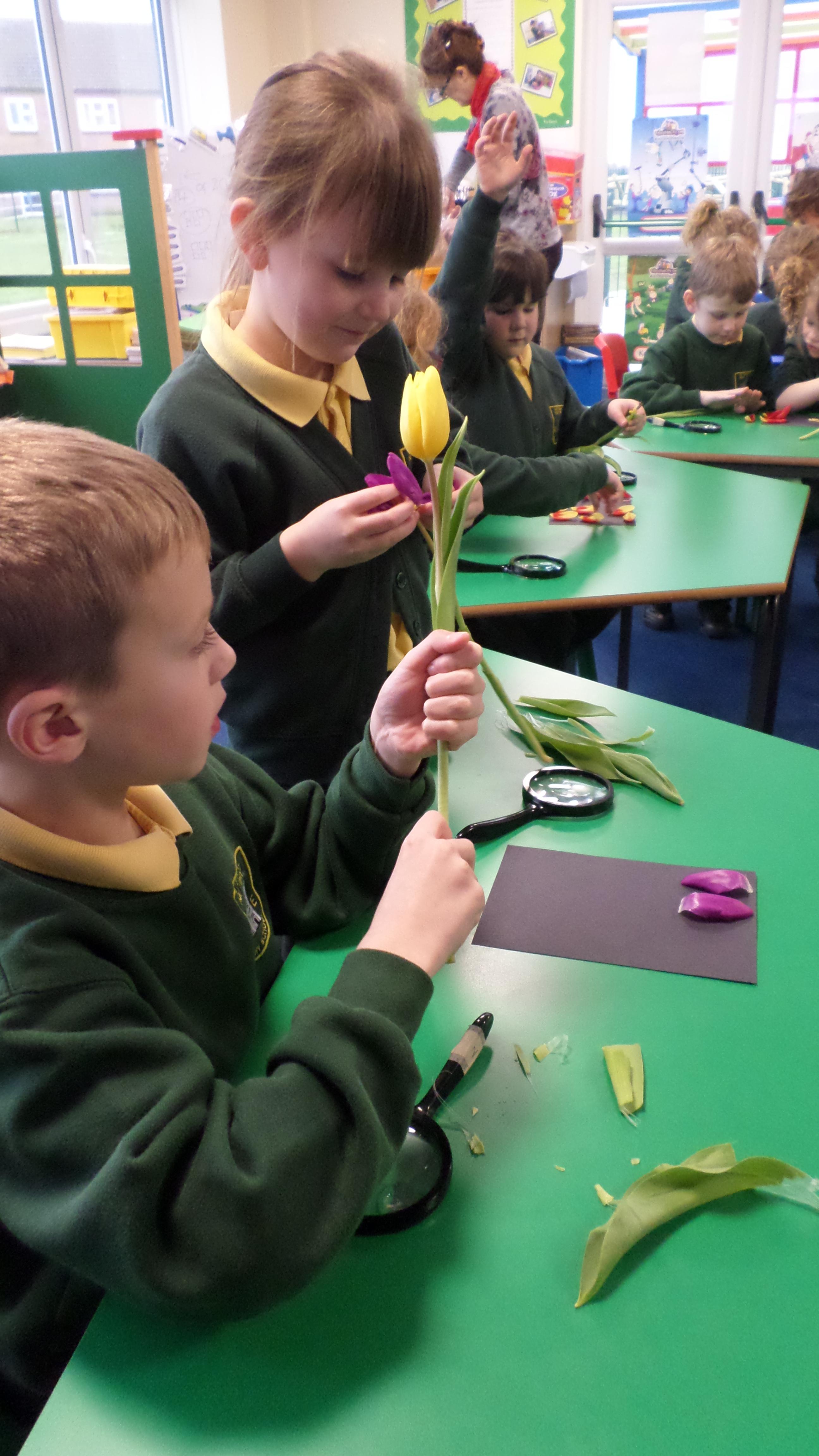As part of our science topic about plants we investigated the parts of the plant used for reproduction. We used tulips to find and identify the stigma, stamen and pollen. We used magnifying glasses and a microscope to look up close.