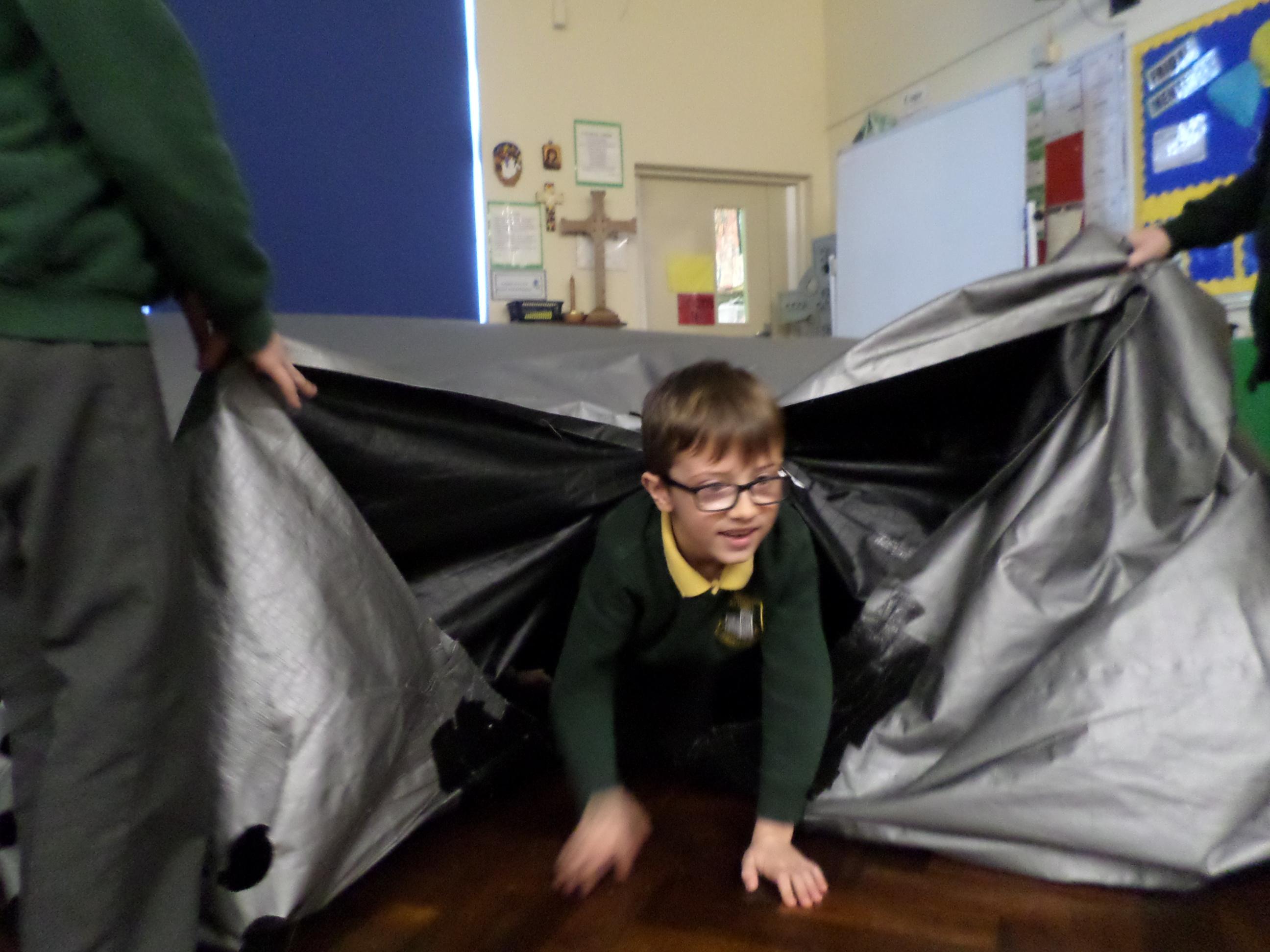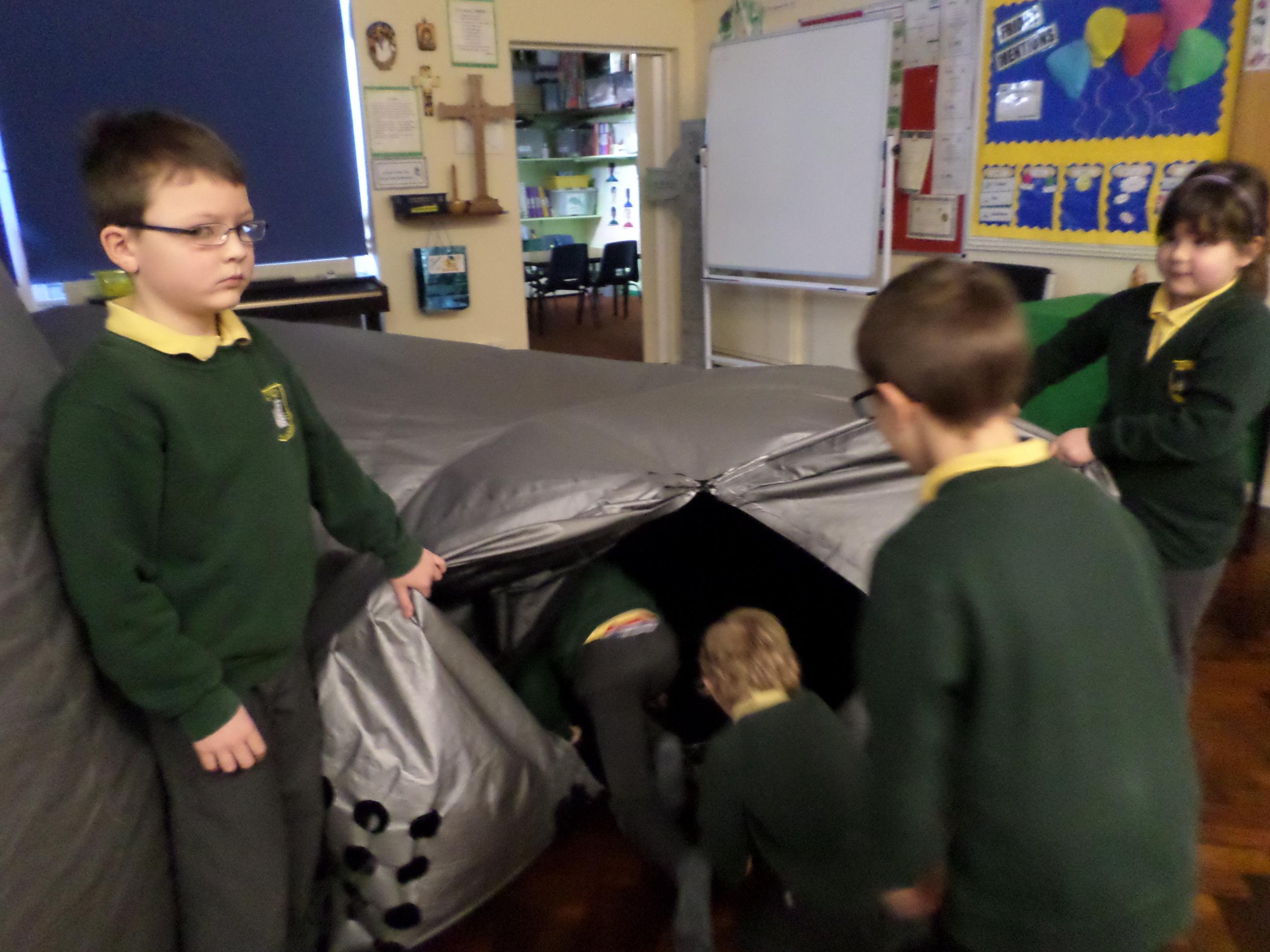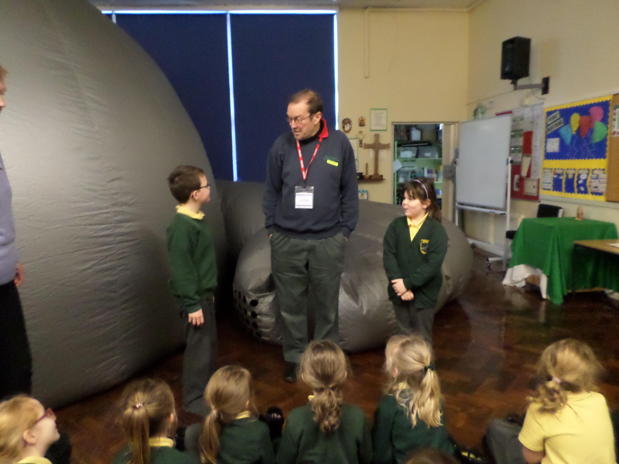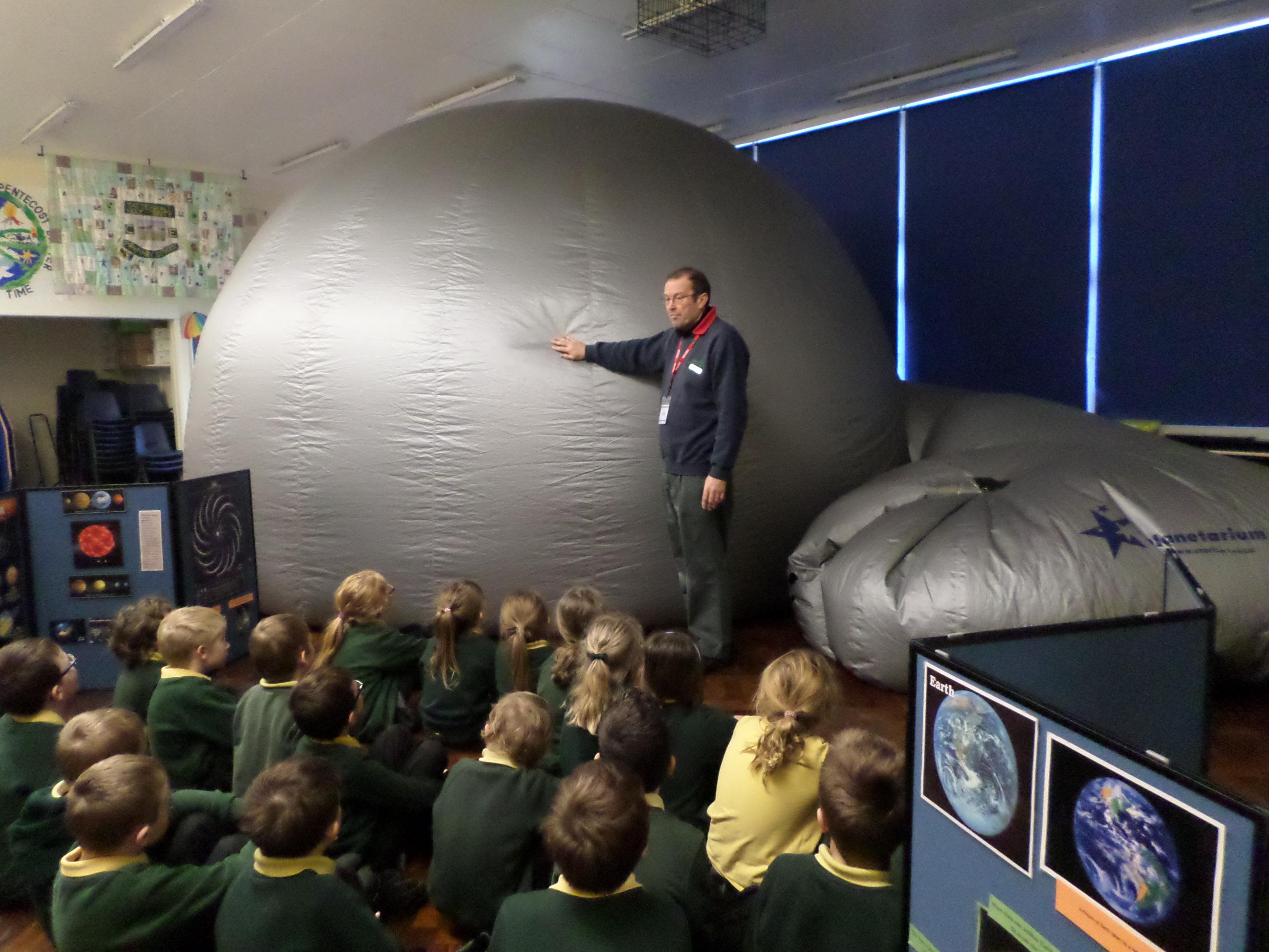 We had great fun in the planetarium this week. First we had to get inside and Joshua and Alice had the important role of door openers / closers so the air did not get out. Inside we sat on the floor around the huge dome and looked at the fantastic night time view. It was very dark! We learned all about why the earth has day and night and also about nocturnal animals. We watched the night sky move across the dome and learned how the position of key stars, planets and constellations change position as the night progresses. It was amazing! Thank you to Starlincs for an informative and interesting time and to the Edina Trust for funding the visit.