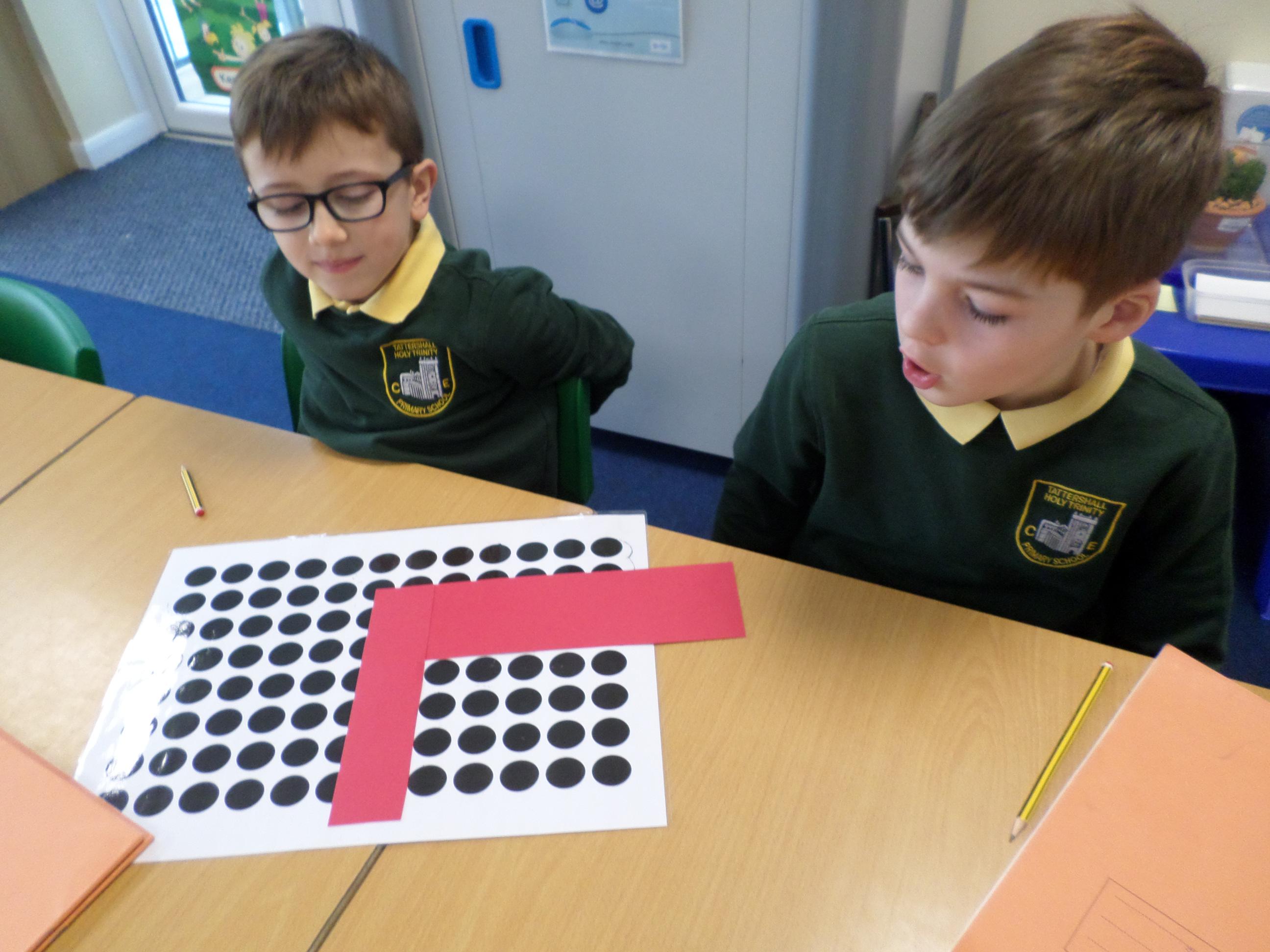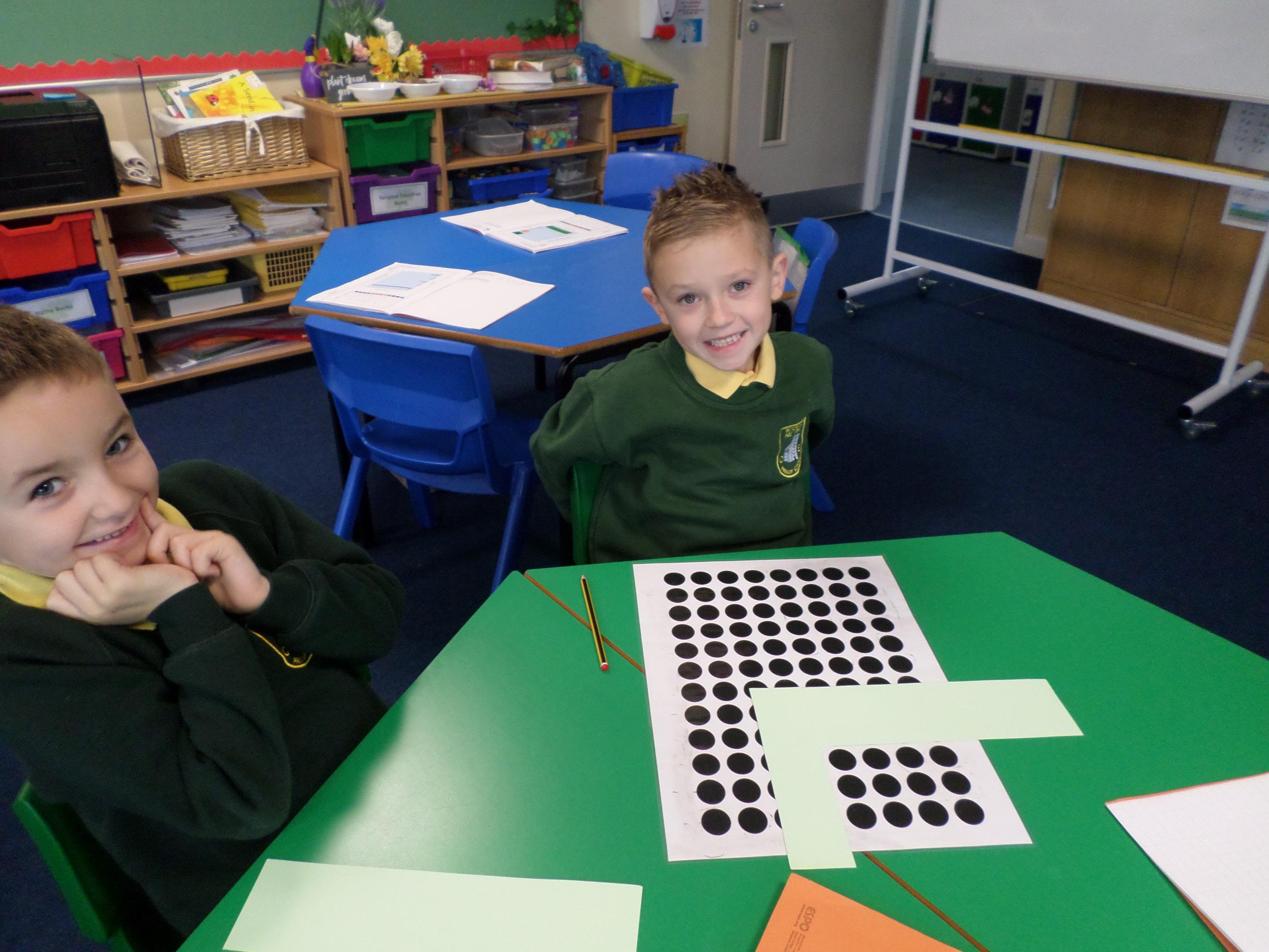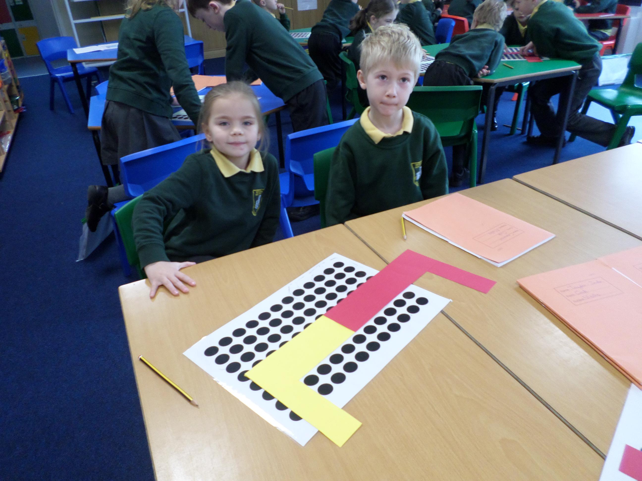 In maths this week we have been making arrays and writing the multiplication and division facts that correspond to the array. It has been tricky to remember which number shows the amount in a group and which shows the number of groups. We have learned that some amounts can be shown using different arrays. The photos show us investigating different ways to make an amount using arrays.