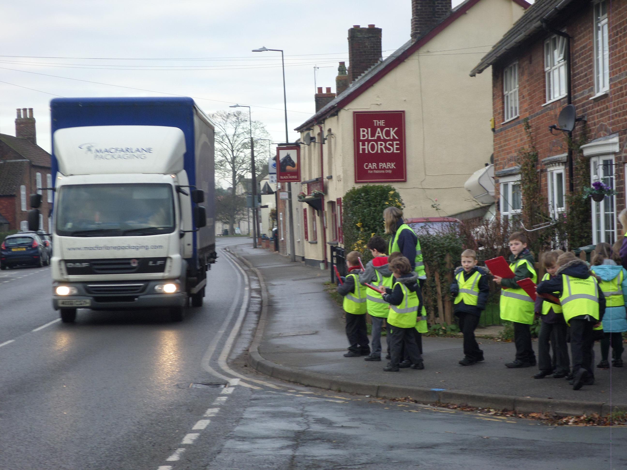 As part of our local topic called Street Detectives we carried out a 10 minute traffic survey by counting the vehicles that were travelling on the main road through Tattershall, just at the end of the school road. We were amazed at how many cars came passed - so many it was really difficult to count, even when doing a tally. Over 92 cars passed, one motorbike, lots of other vehicles like vans and over 20 heavy lorries. We were shocked at how busy it was! We will put the data into graphs using computers and make comparisons next.
