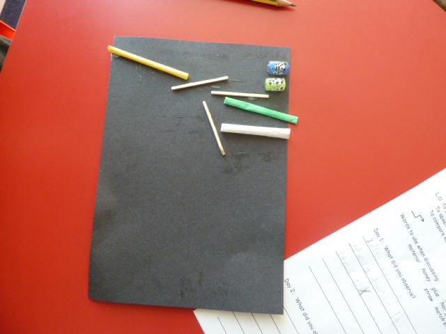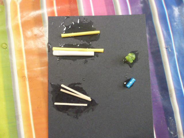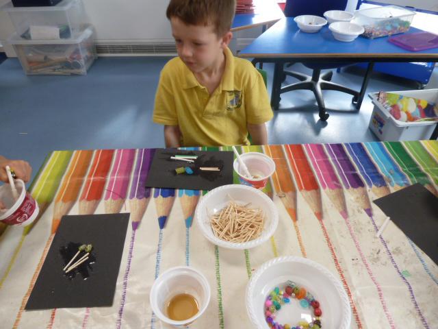 As part of our materials topic, Oak class investigated how glue sticks to different materials. Then we decided to look at other 'sticky' materials. We stuck different craft objects made of plastic, wood and paper using different sticky substances: glue, hair putty, honey and flour mixed with water. We tested them by turning them upside down to see how well they stuck, then we tested again in the morning too. Most of the craft items stuck with most of the sticky stuff - even the honey! Only a couple of the heavier beads fell off and we decided this was because they were spherical. We also decided that honey was not the best glue because it stayed sticky even after 24 hours! We were all surprised how well the hair gel worked.