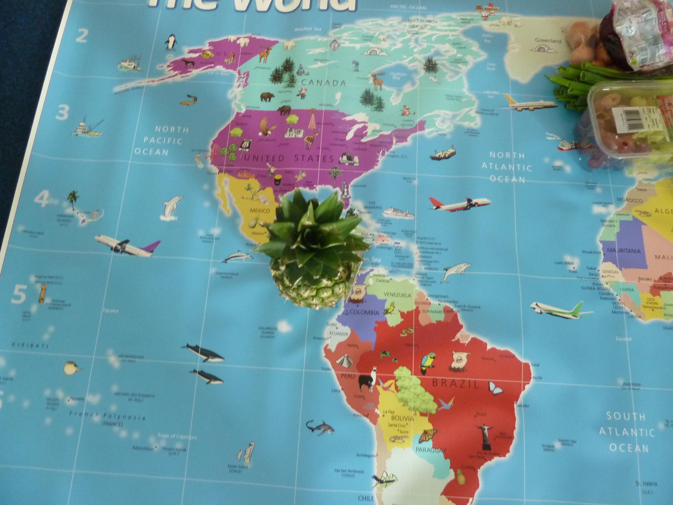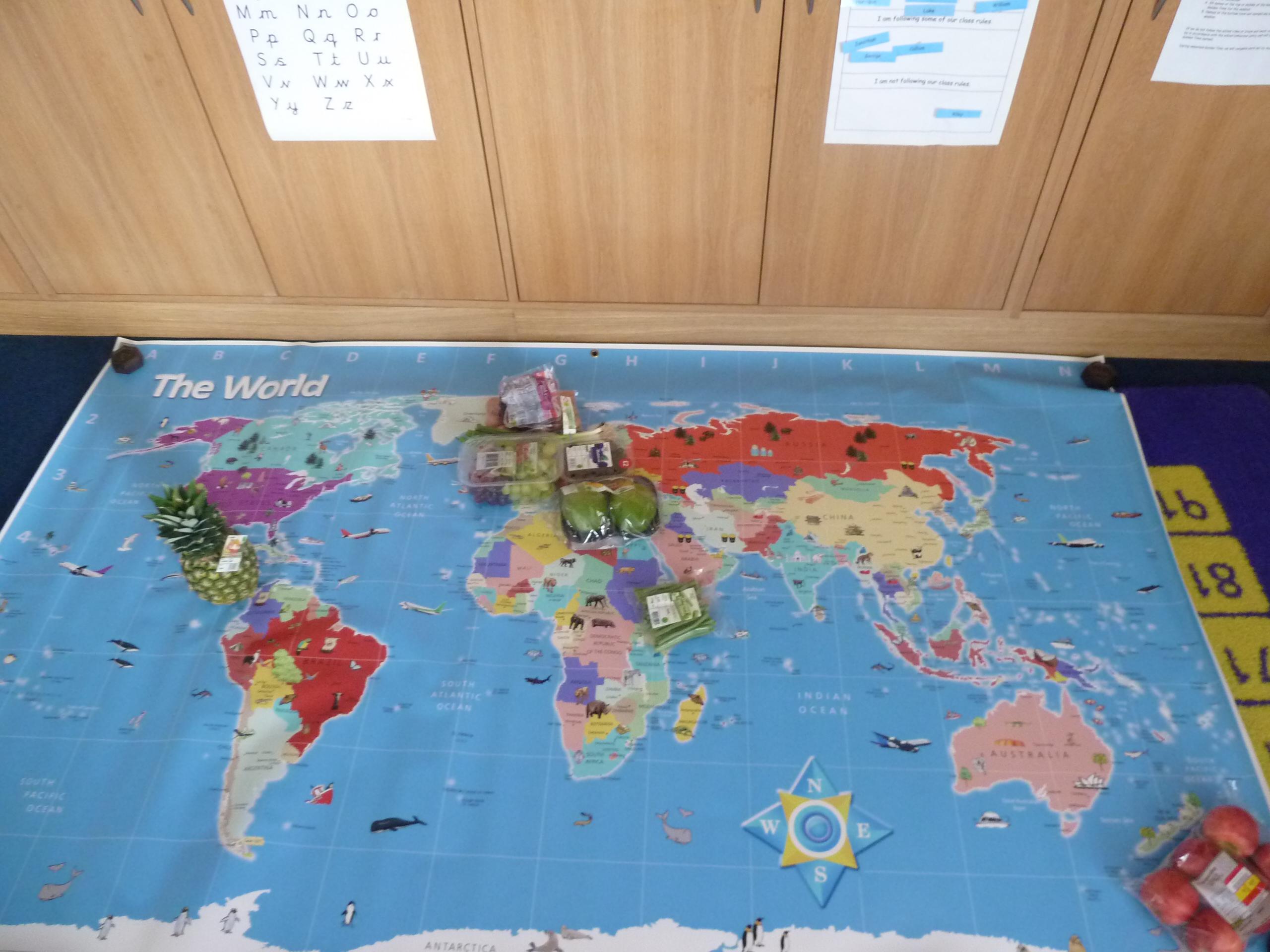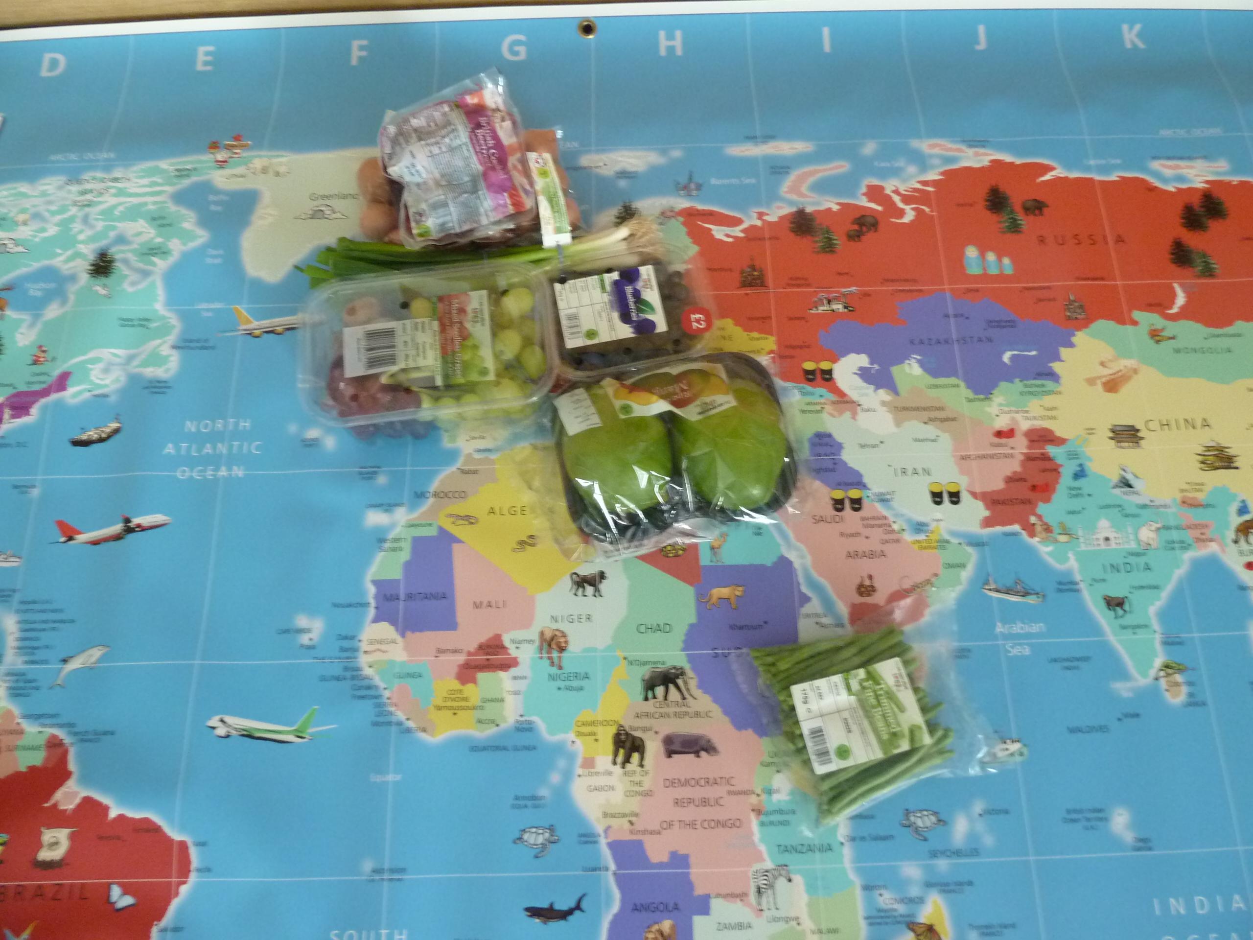 Today we carried on looking at the world map, but this time we found out where our food comes from. We have started our Harvest topic by learning that it is not just the UK that has a harvest, many countries around the world also produce the food we eat. We talked about how the food would travel to the UK and into our supermarkets. The food that travelled the furthest was from New Zealand. We thought it would have had to come on a plane from that distance. The continent which had produced the most food from our selection was Europe.