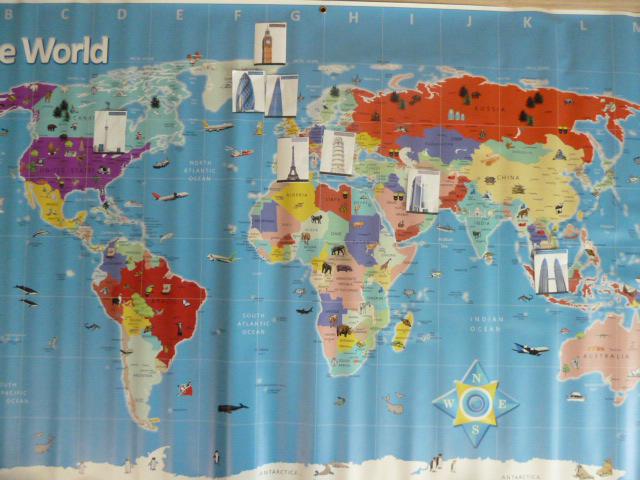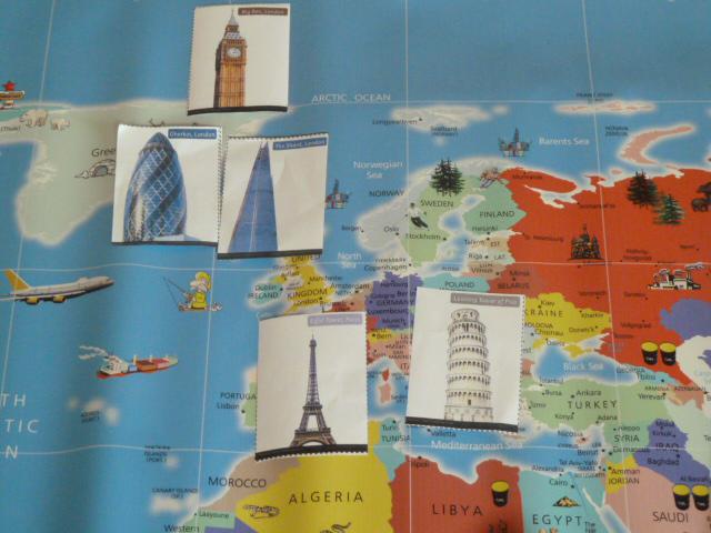 Today, as part of our Towers, Turrets and Tunnels topic we looked at some famous towers from around the world and used Atlases to find their locations. We had to find out where in the world they were, which country and which continent and then place them on our giant world map. We found three tall towers in London, one in Paris, Pisa, Dubai, Kuala Lumpur and Toronto.