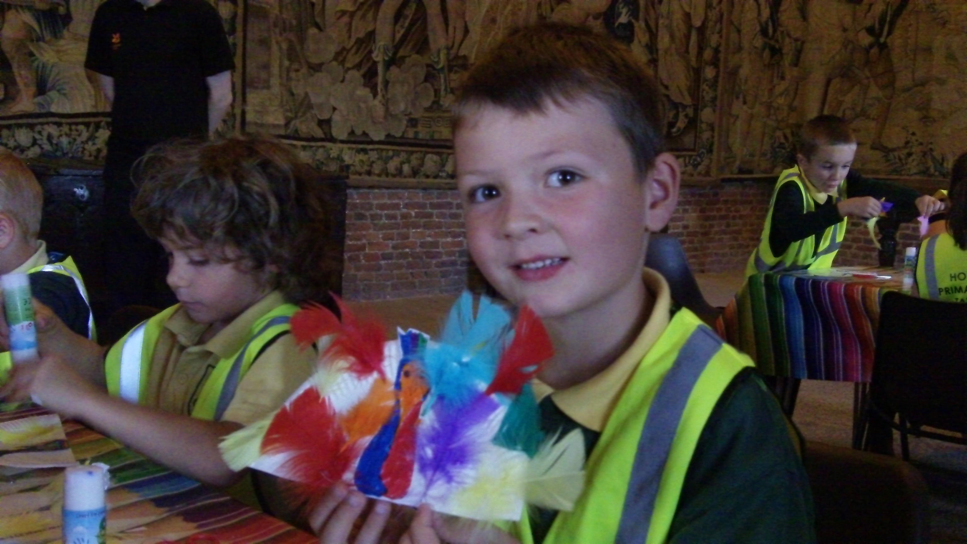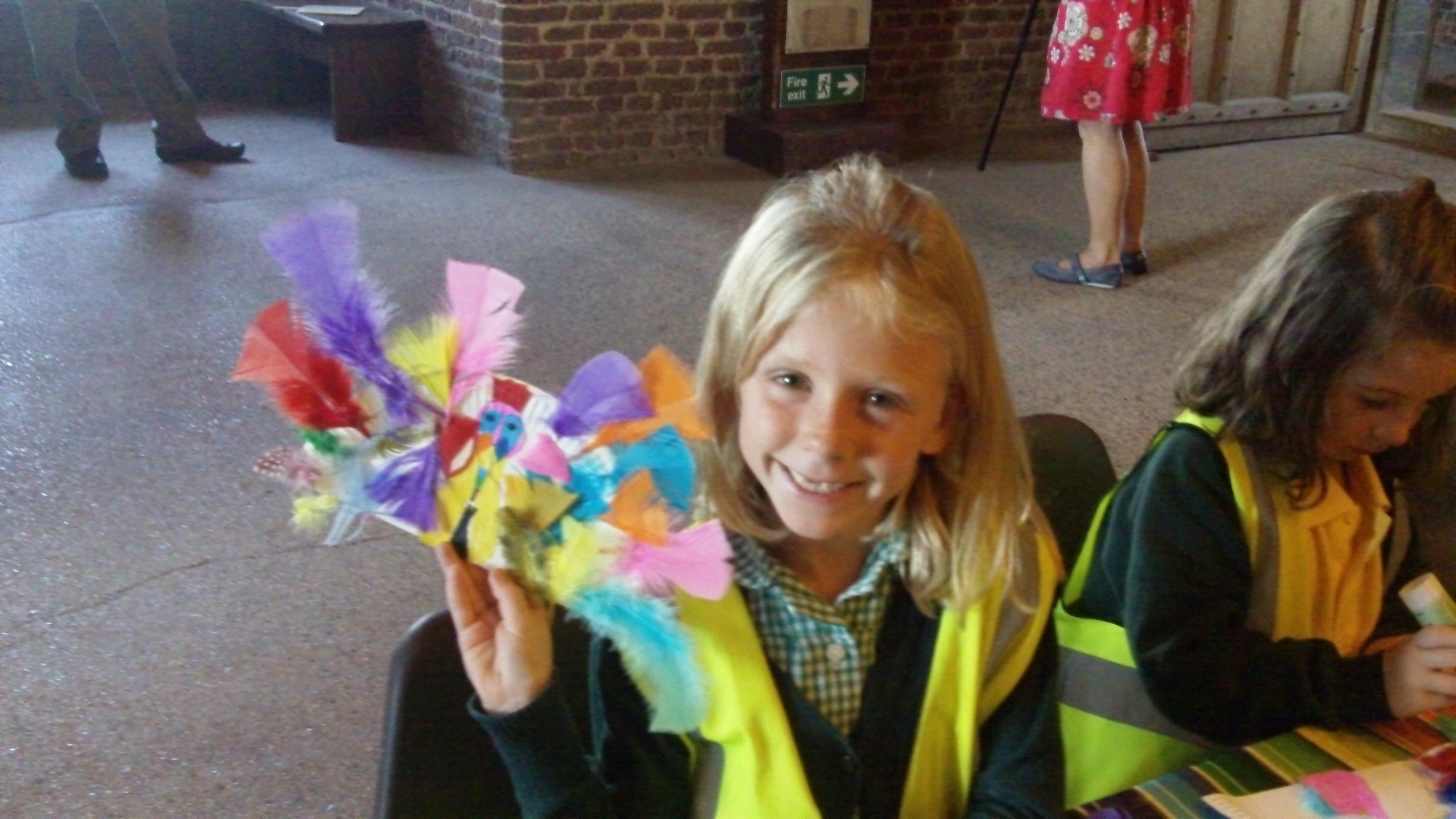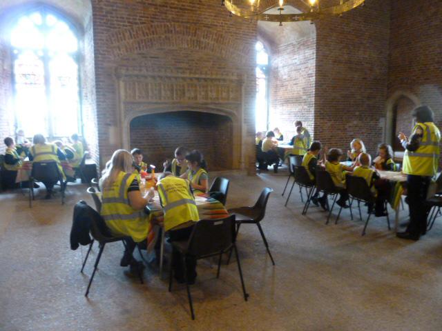After lunch, we had two craft sessions in the 'audience room' where Lord Cromwell and his aids would listen to and advise people. It was wonderful to make things in such amazing surroundings, there was enormous tapestries on the walls, a huge open fireplace, a table dated 1586 and a large candelabra. We made peacock centre pieces for Lord Cromwell's table and stained glass windows.