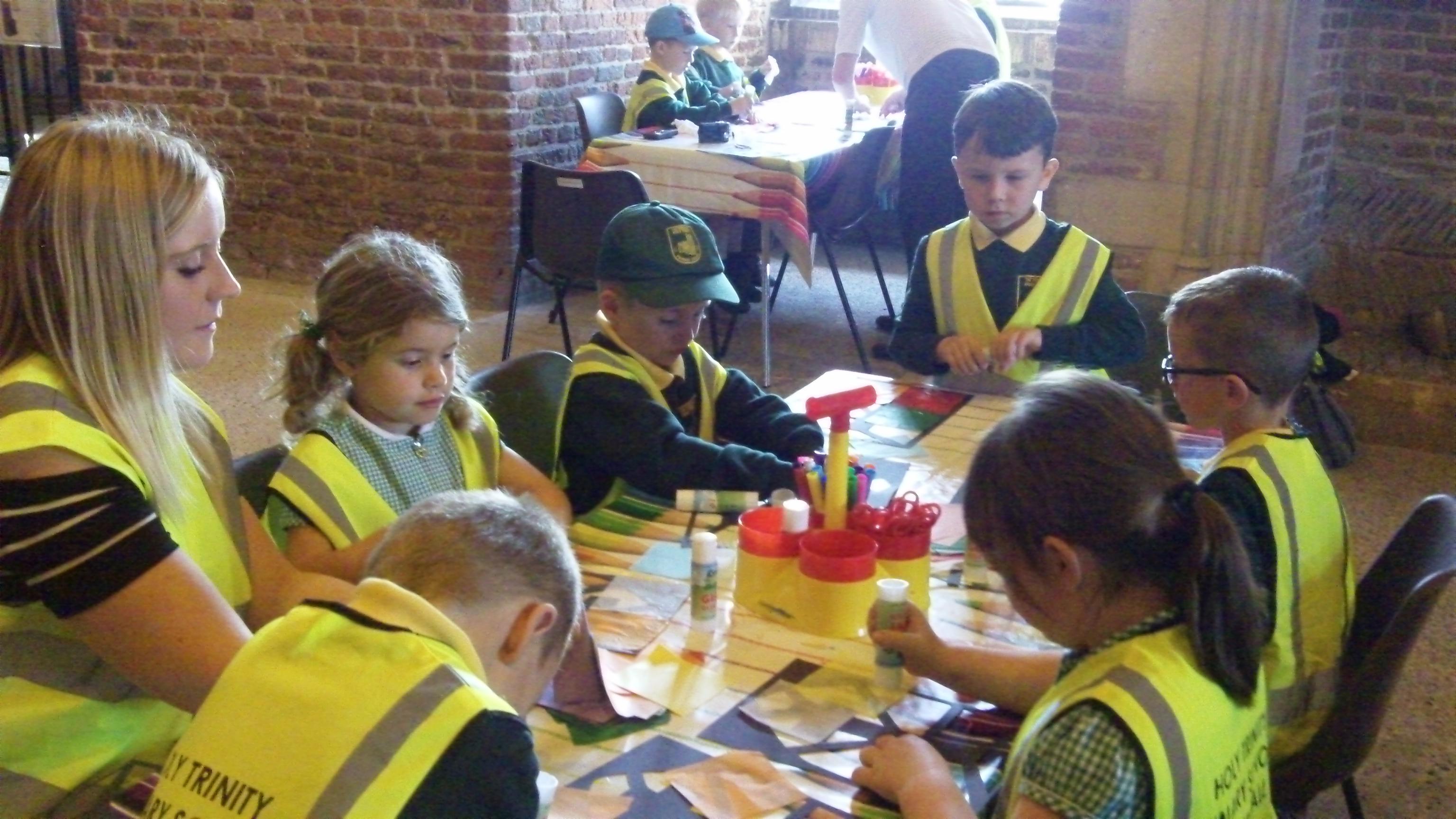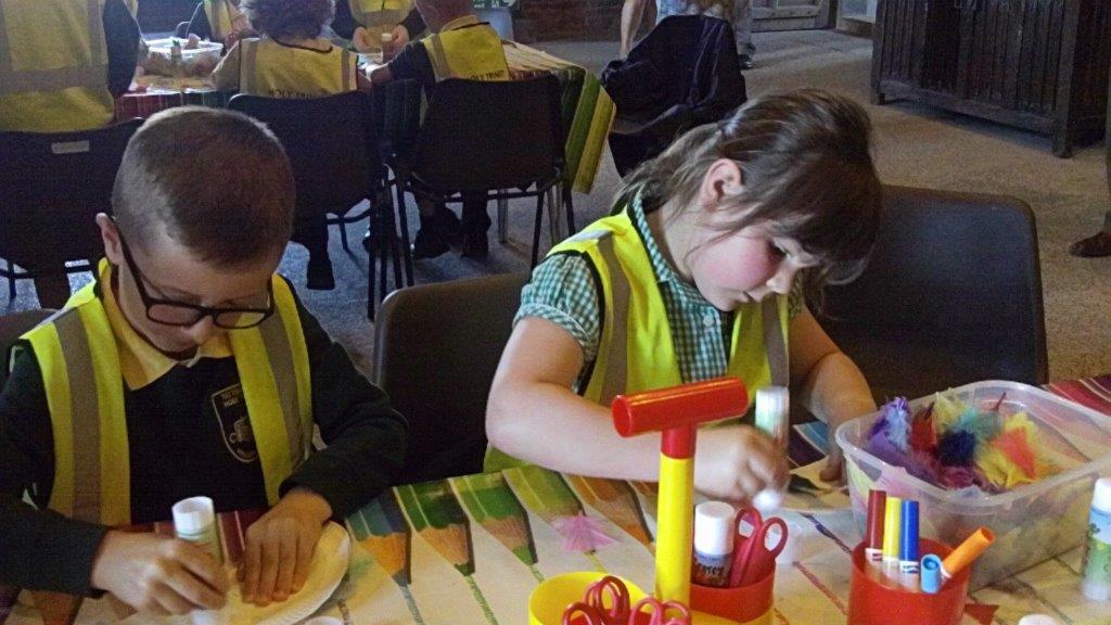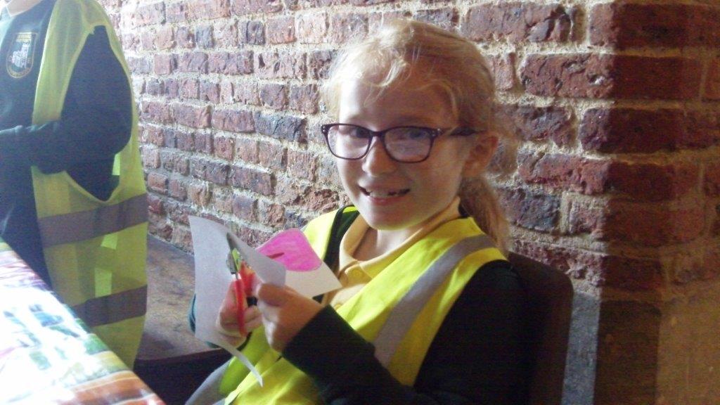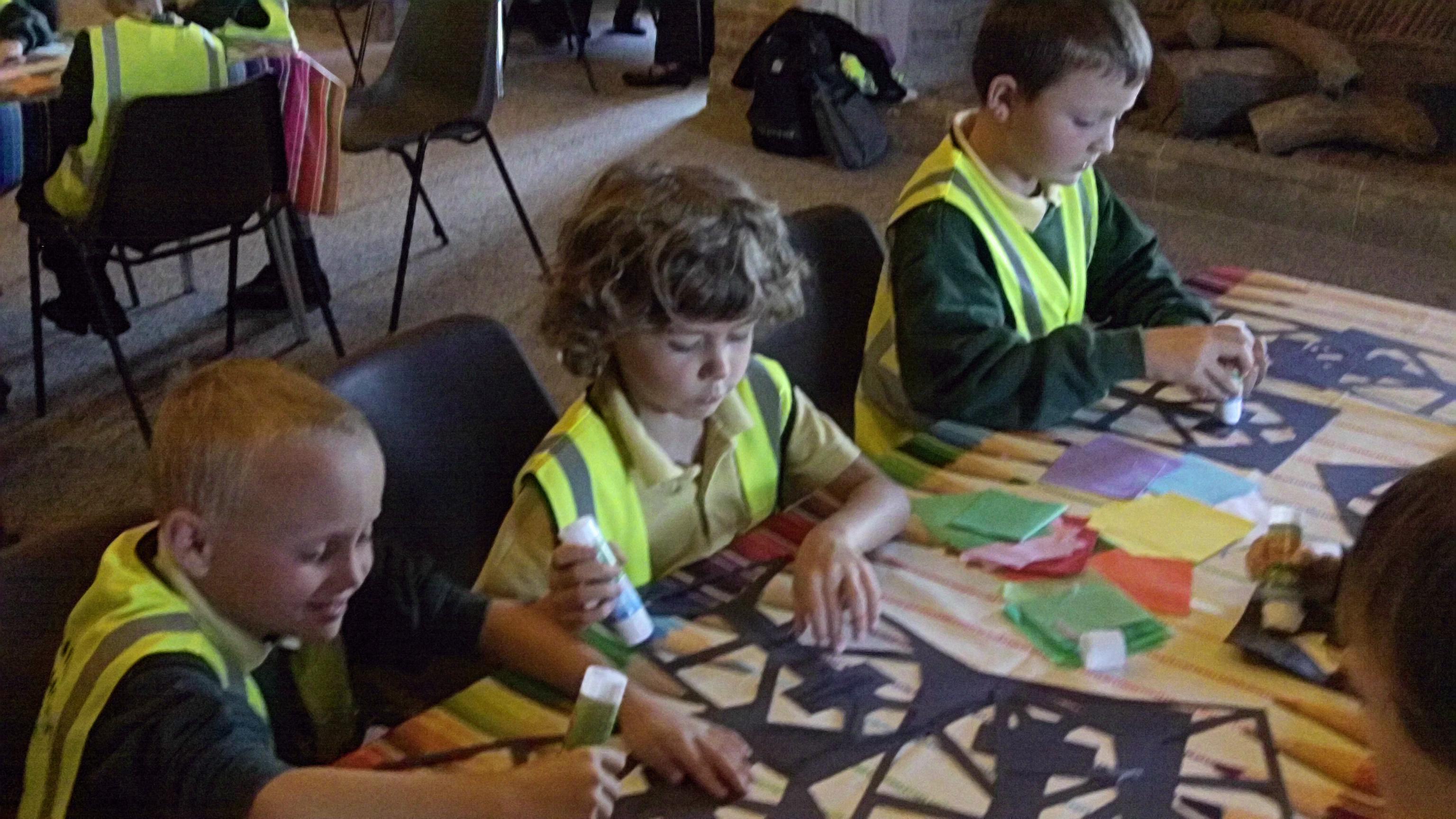 After lunch, we had two craft sessions in the 'audience room' where Lord Cromwell and his aids would listen to and advise people. It was wonderful to make things in such amazing surroundings, there was enormous tapestries on the walls, a huge open fireplace, a table dated 1586 and a large candelabra. We made peacock centre pieces for Lord Cromwell's table and stained glass windows.